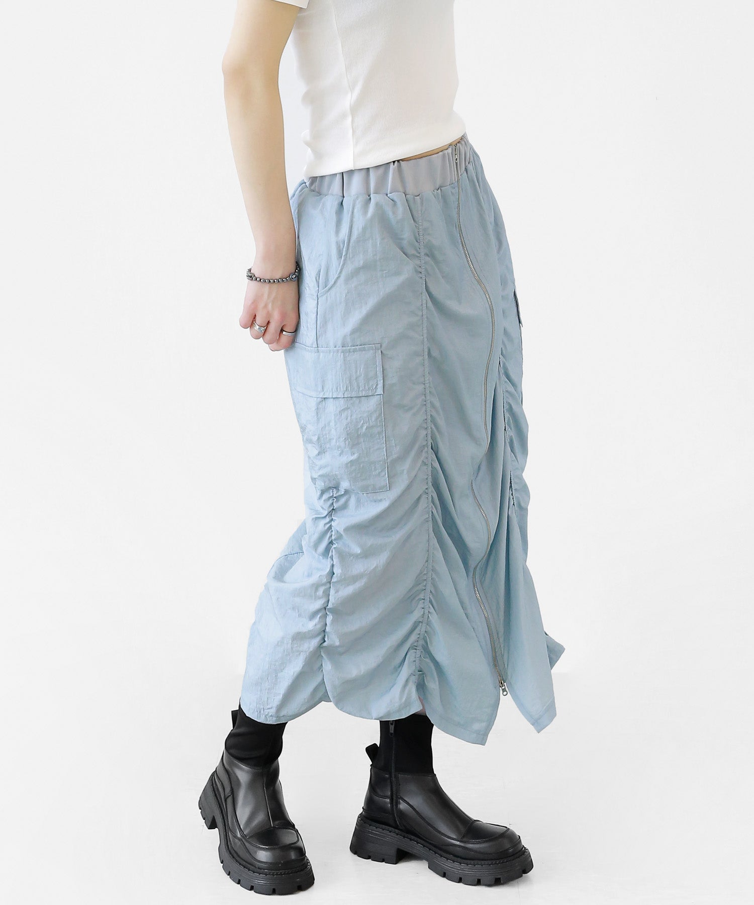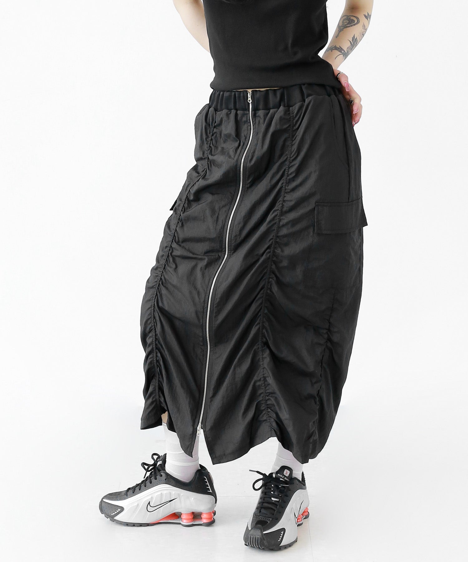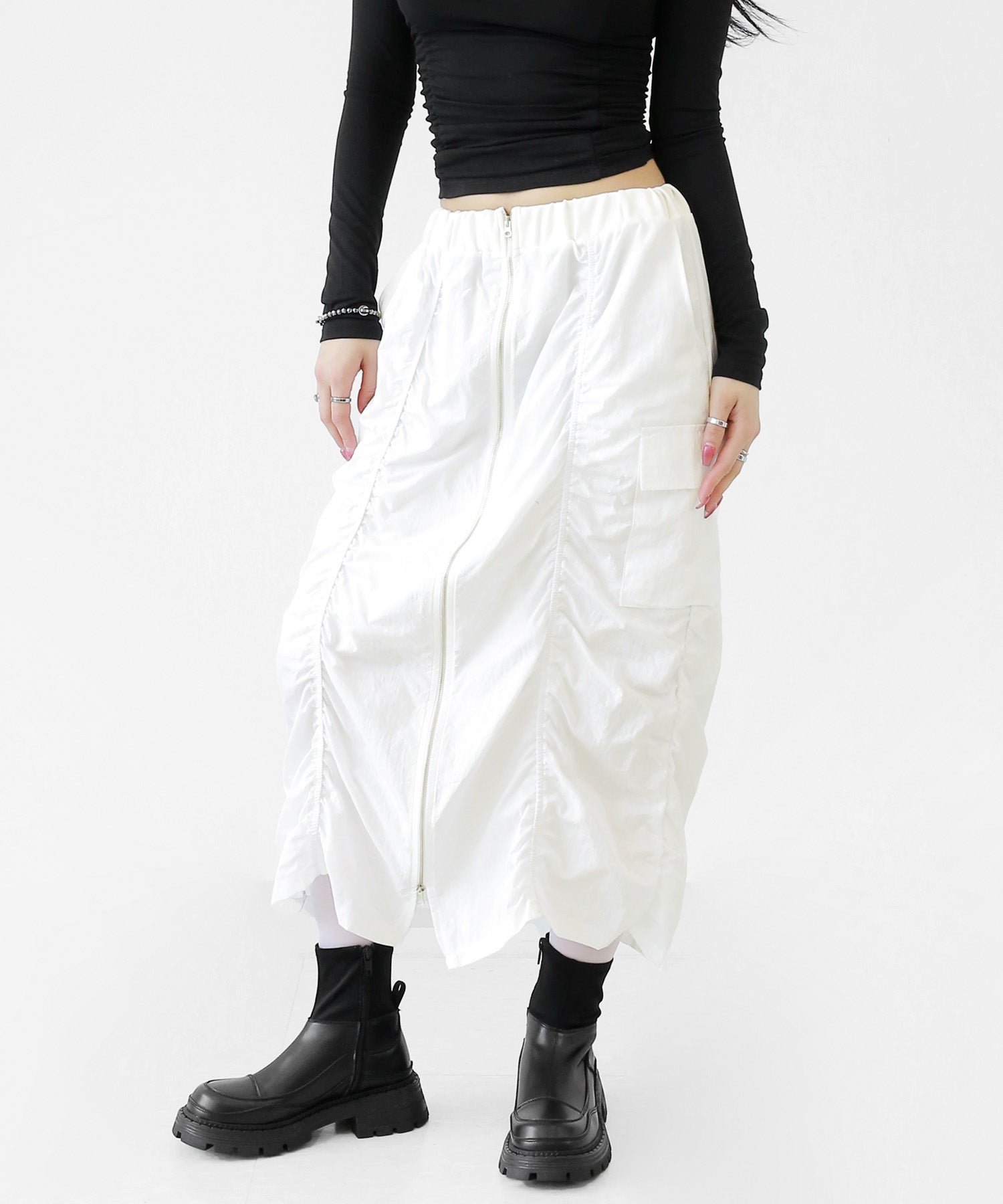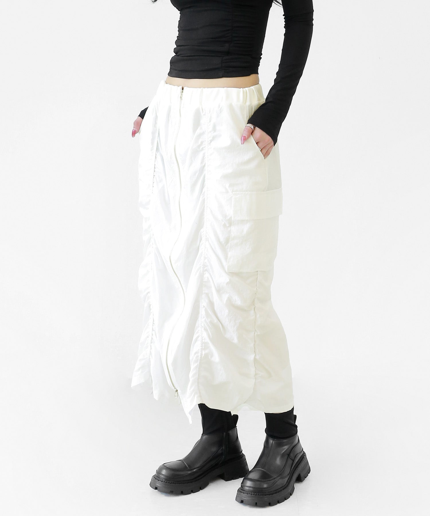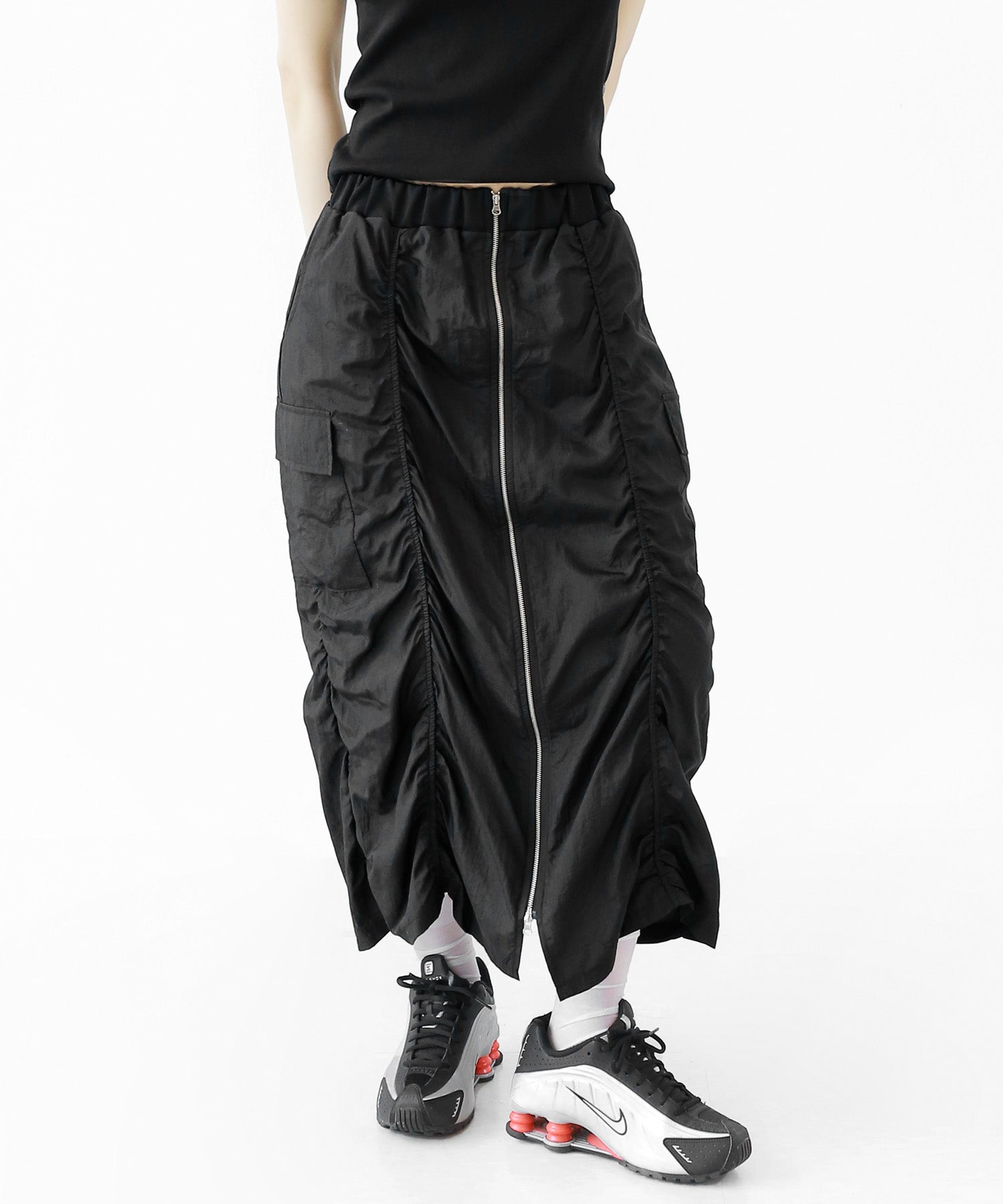 Crafted from ultra-light nylon, this 2WAY zip skirt fuses bold cargo elements with feminine flair. Adjustable front shirring and roomy side pockets give you style and function in one. A viral hit among fashion lovers in Korea and Japan!