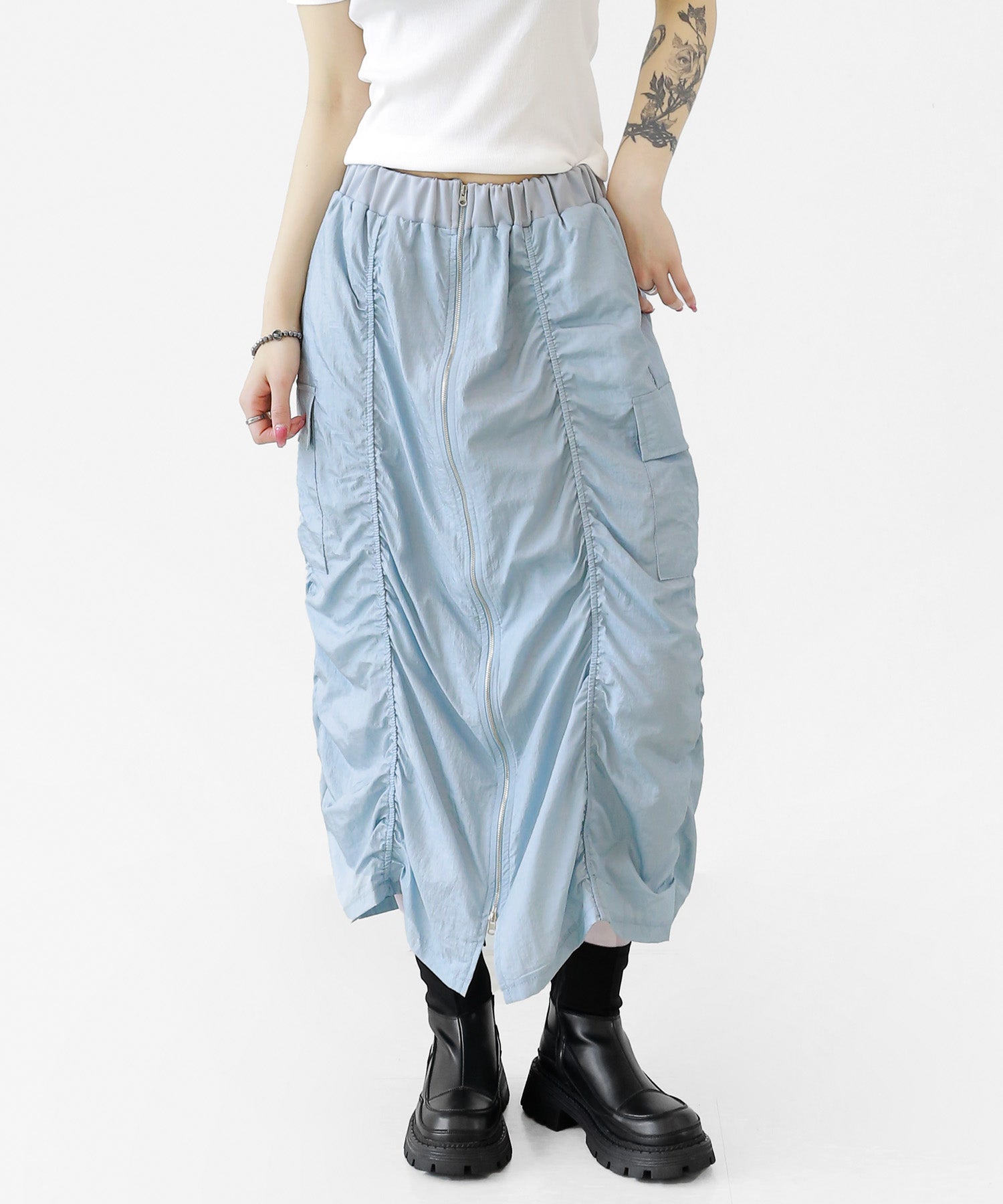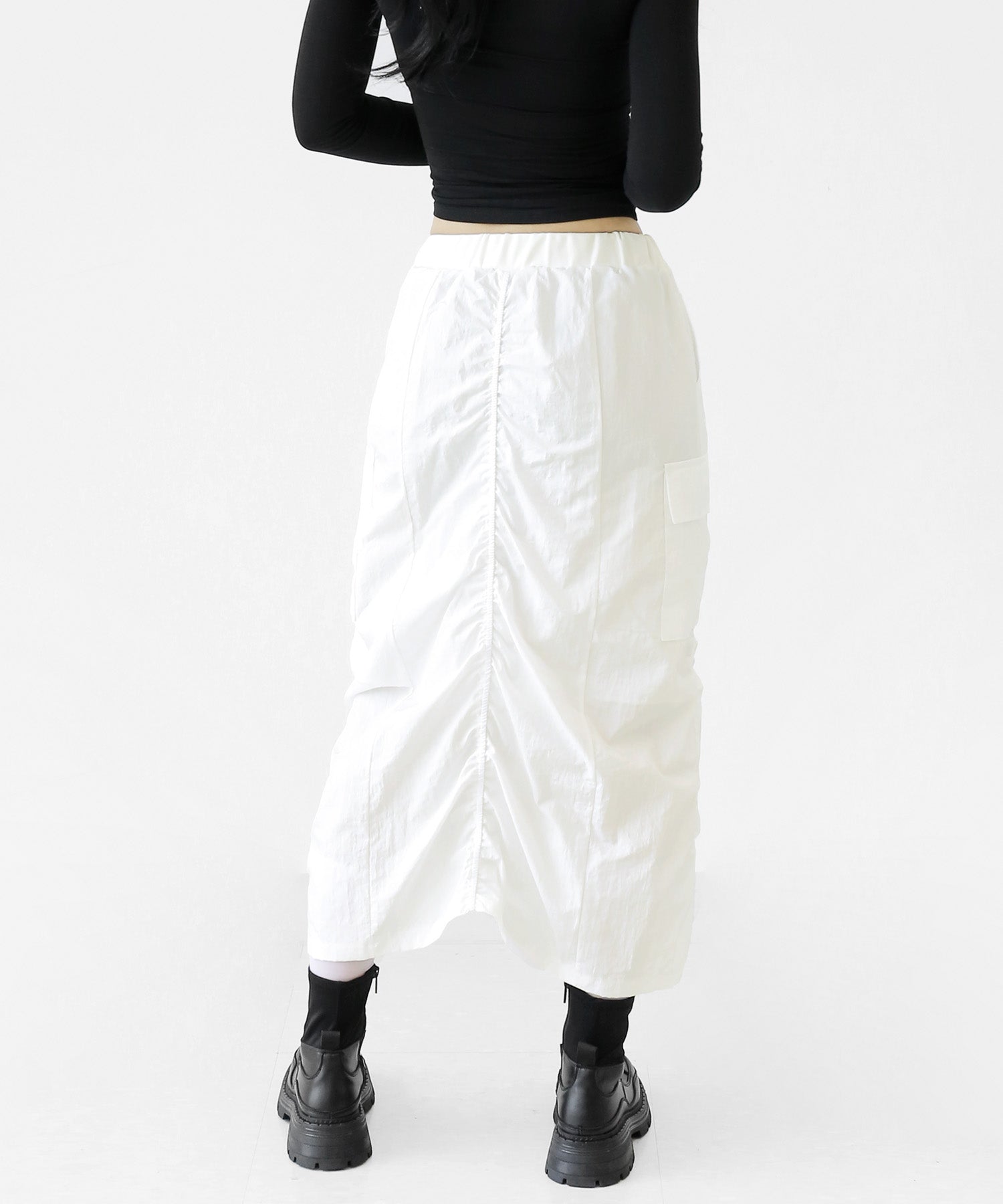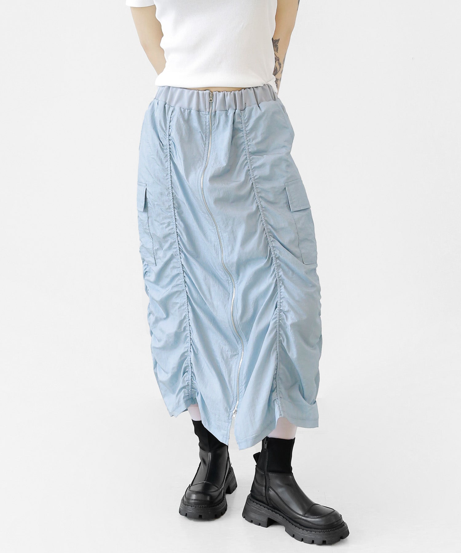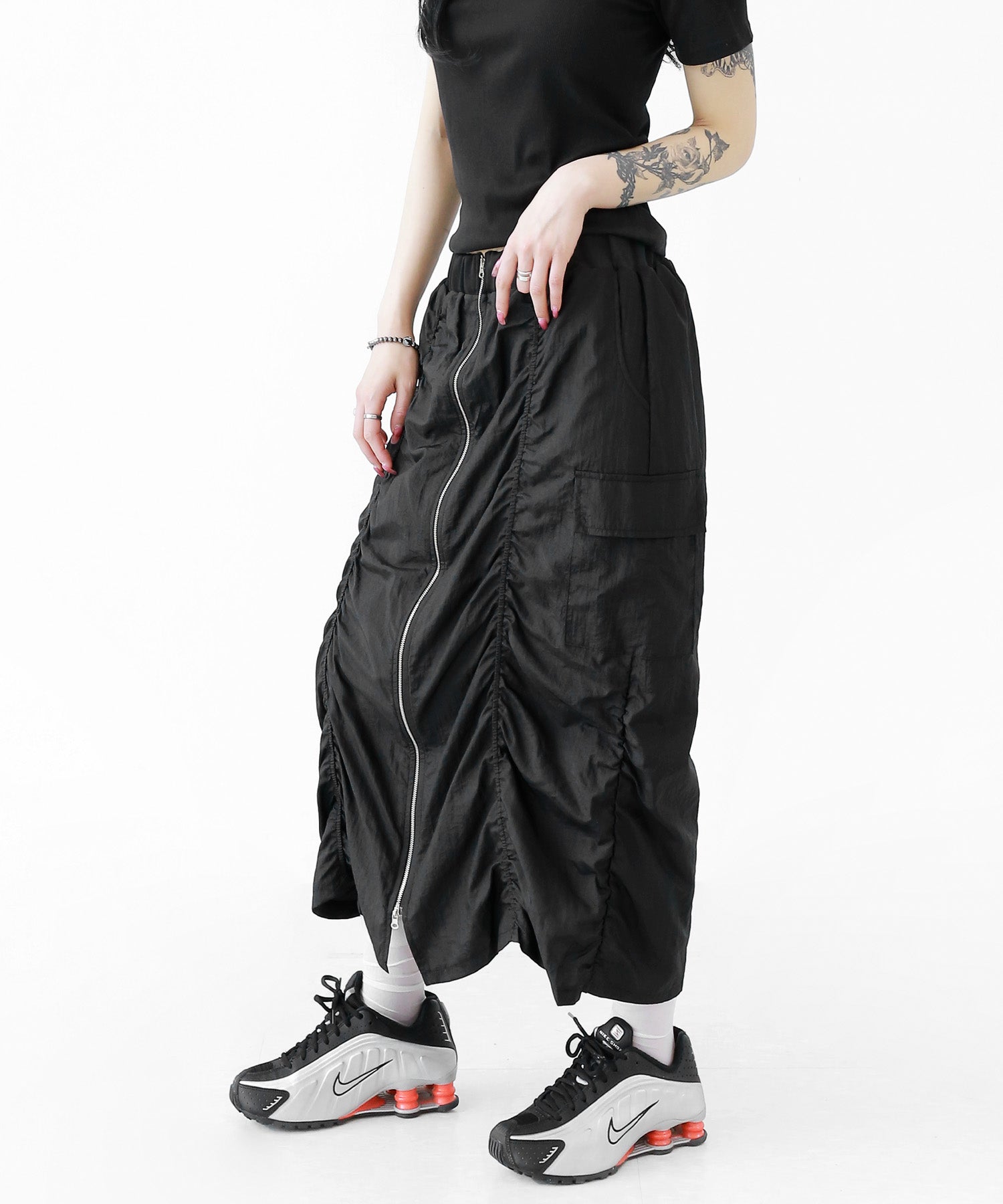 Crafted from ultra-light nylon, this 2WAY zip skirt fuses bold cargo elements with feminine flair. Adjustable front shirring and roomy side pockets give you style and function in one. A viral hit among fashion lovers in Korea and Japan!