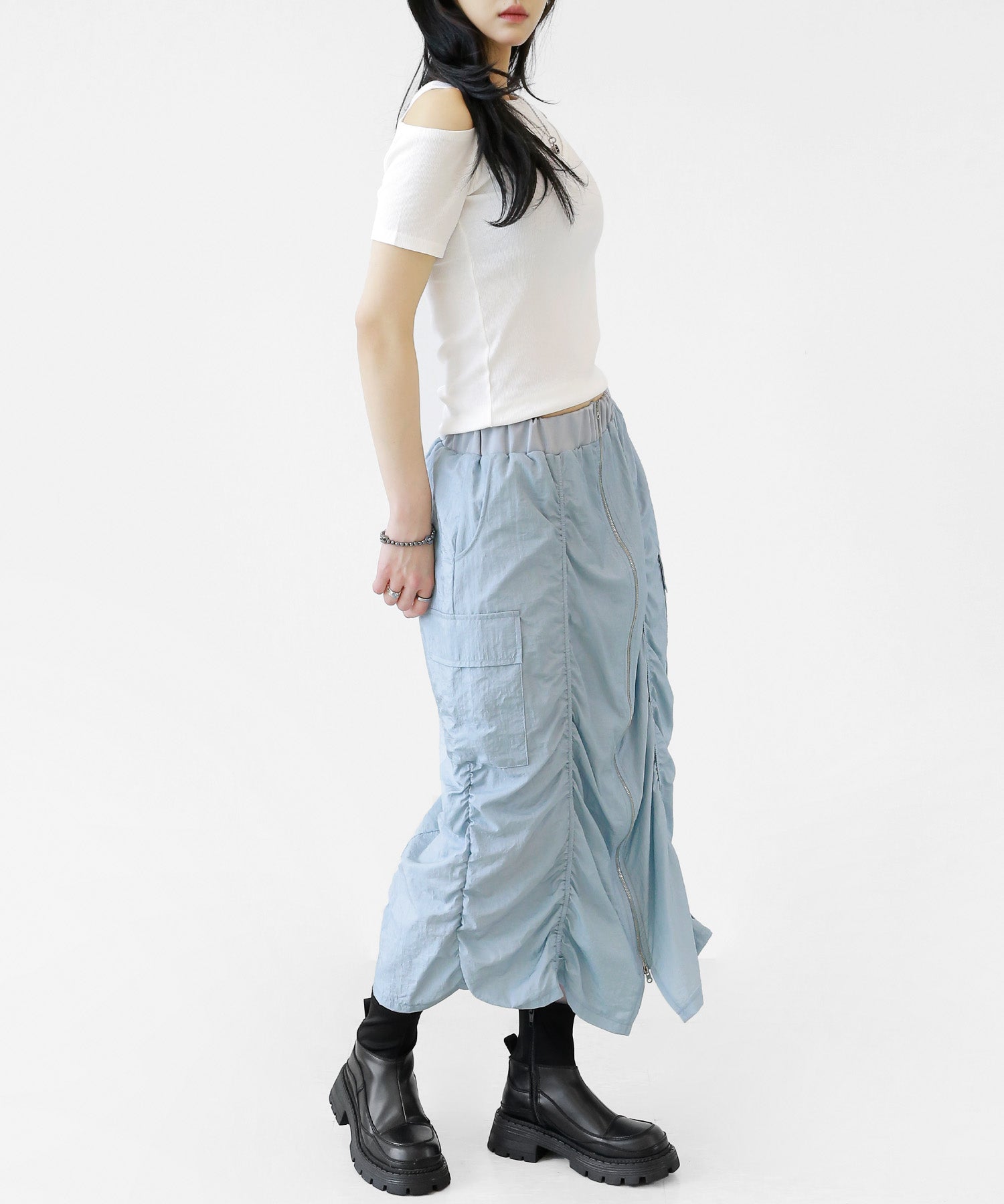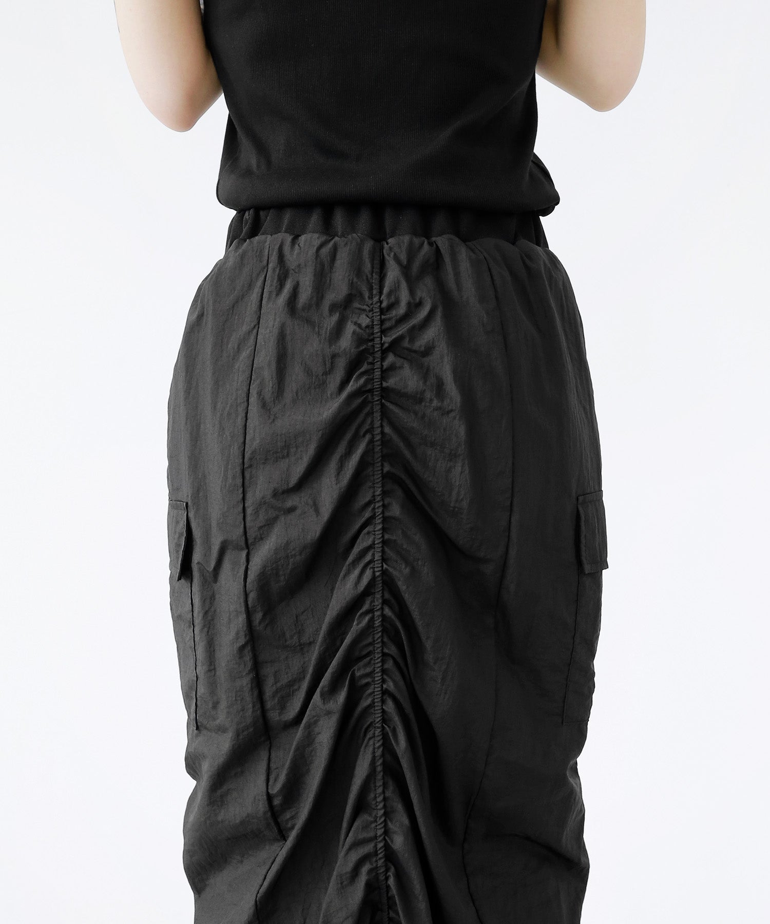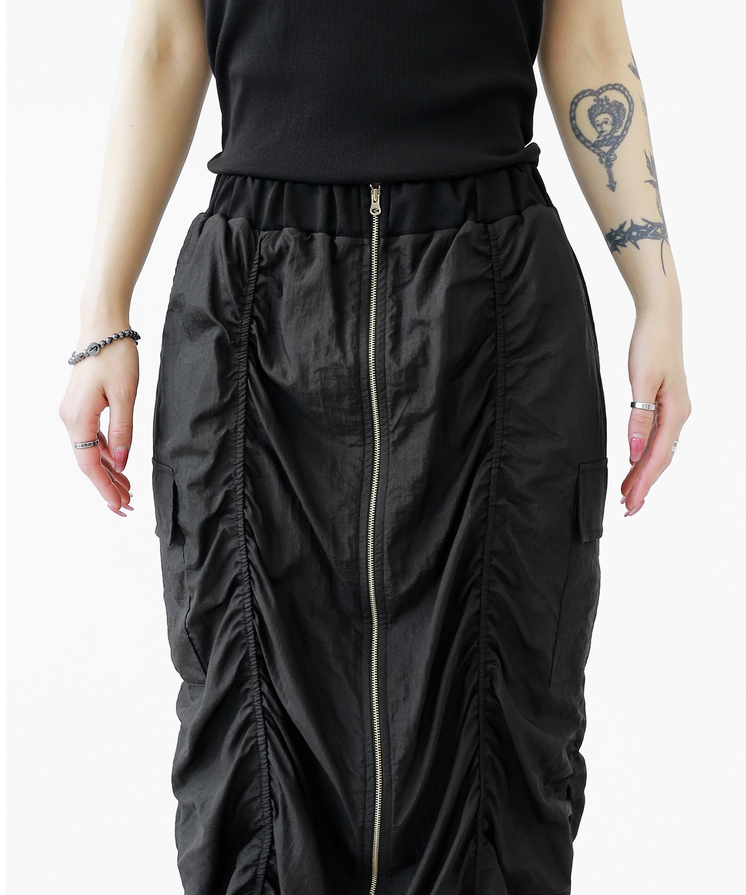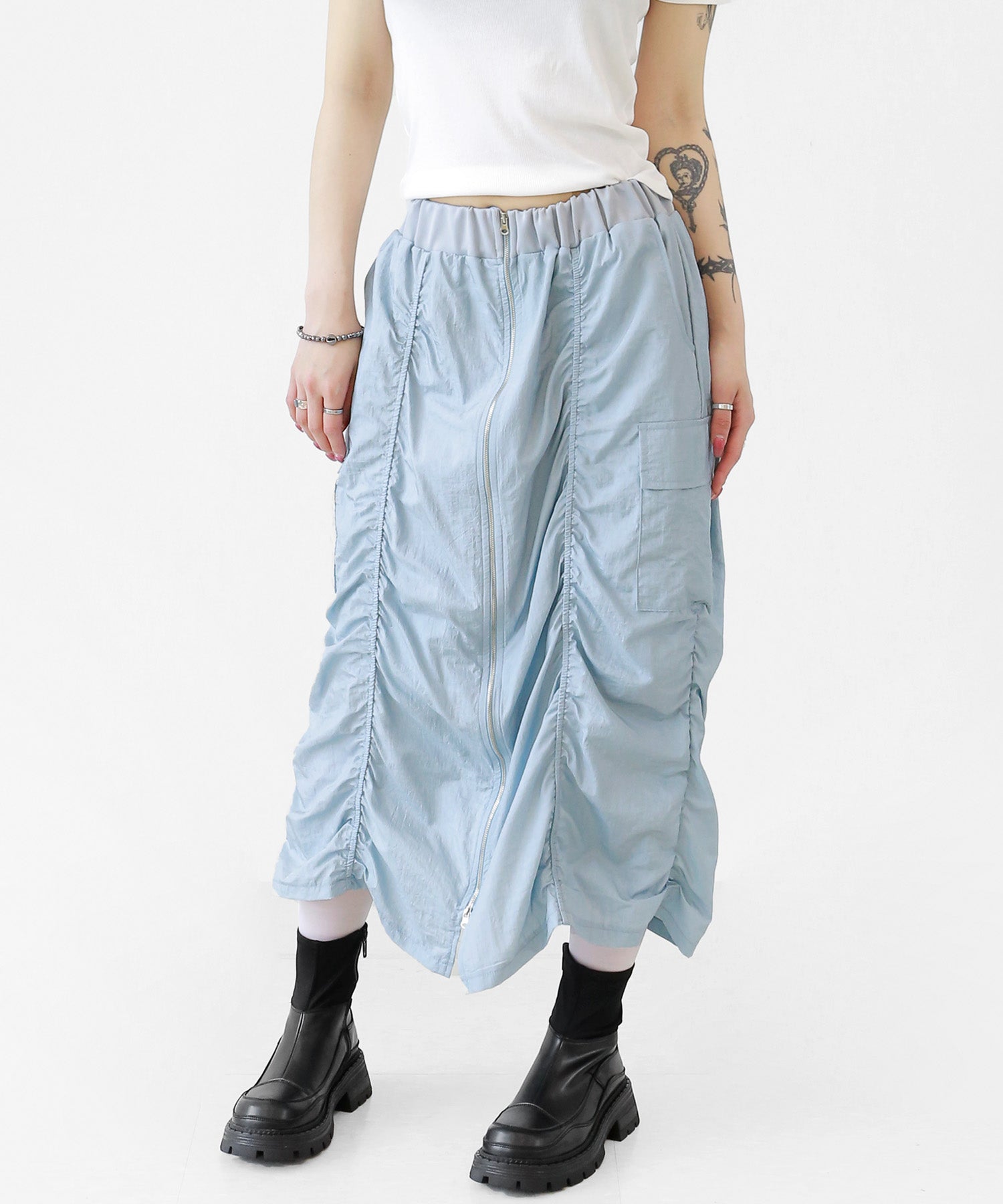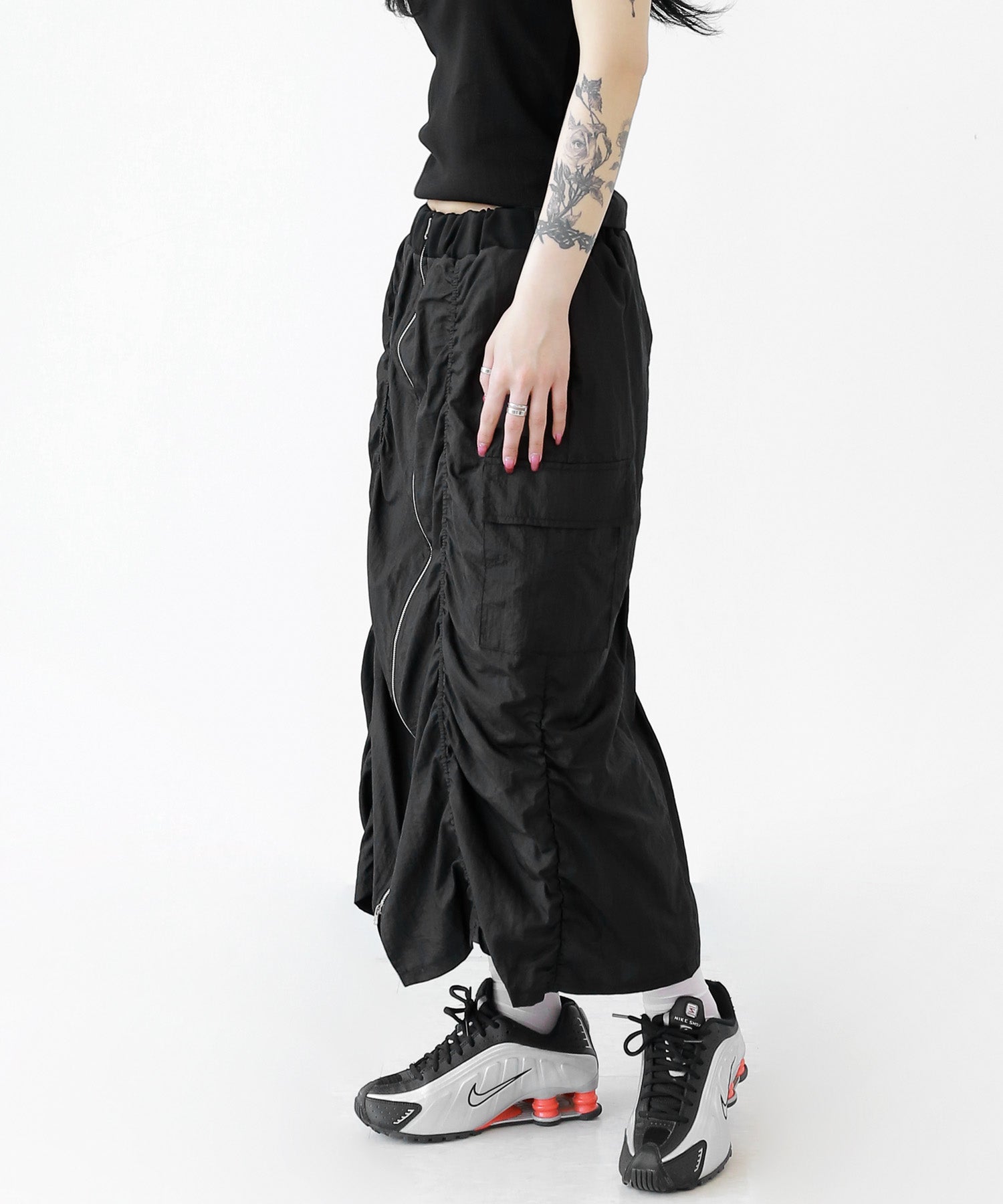 Crafted from ultra-light nylon, this 2WAY zip skirt fuses bold cargo elements with feminine flair. Adjustable front shirring and roomy side pockets give you style and function in one. A viral hit among fashion lovers in Korea and Japan!