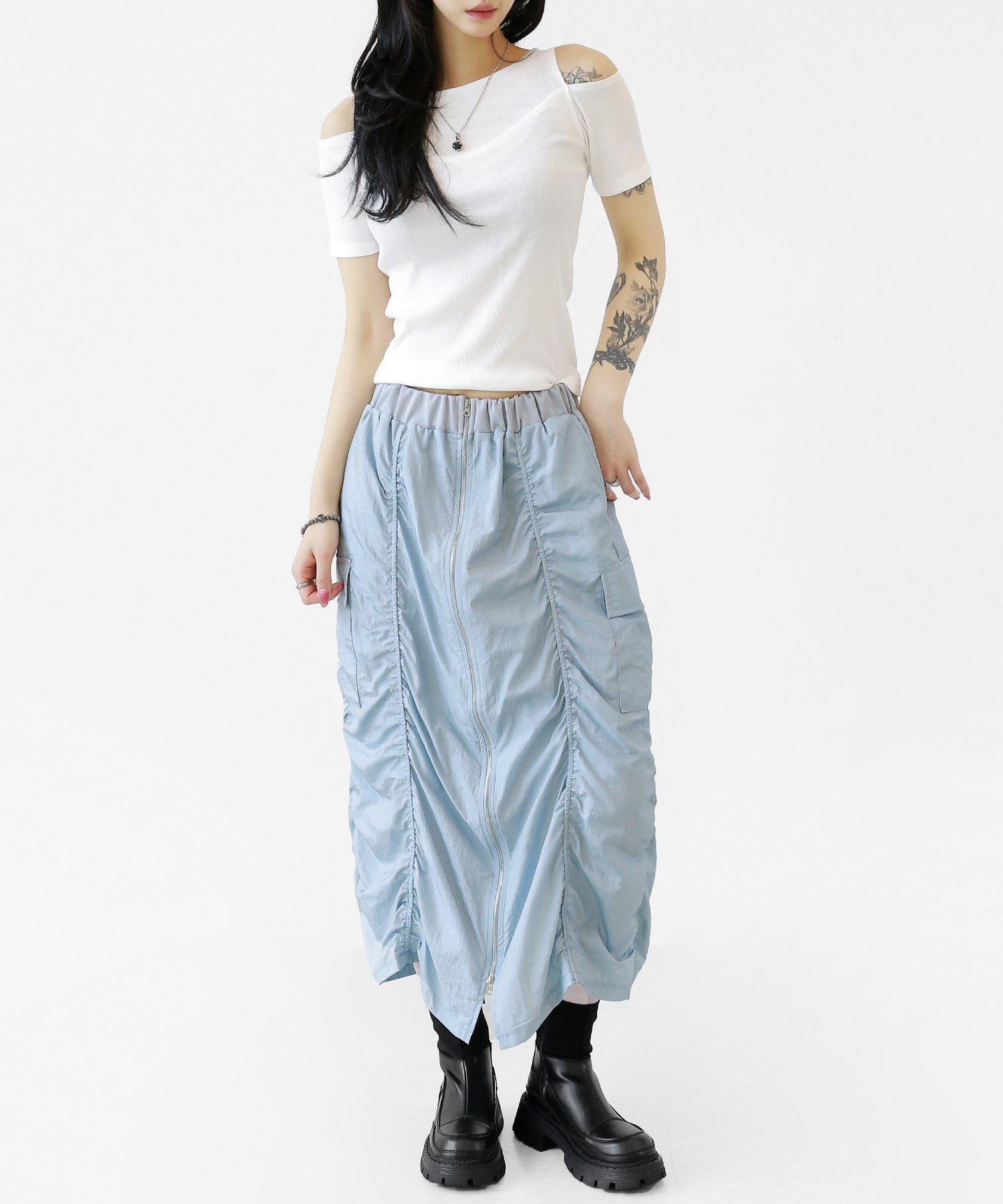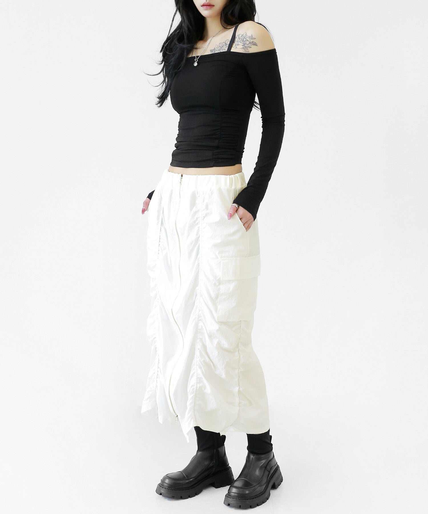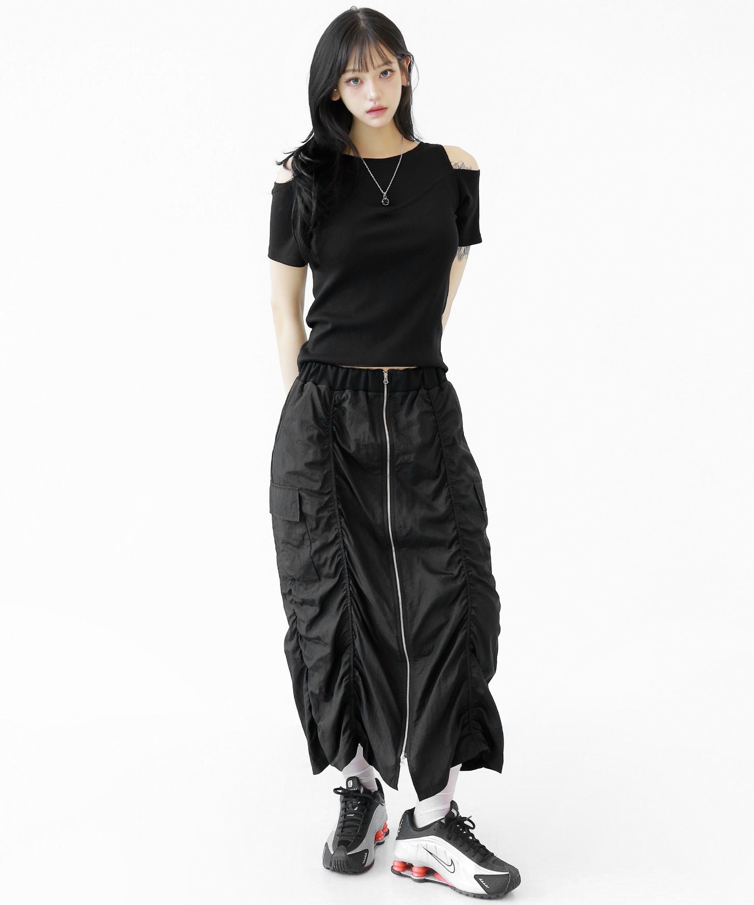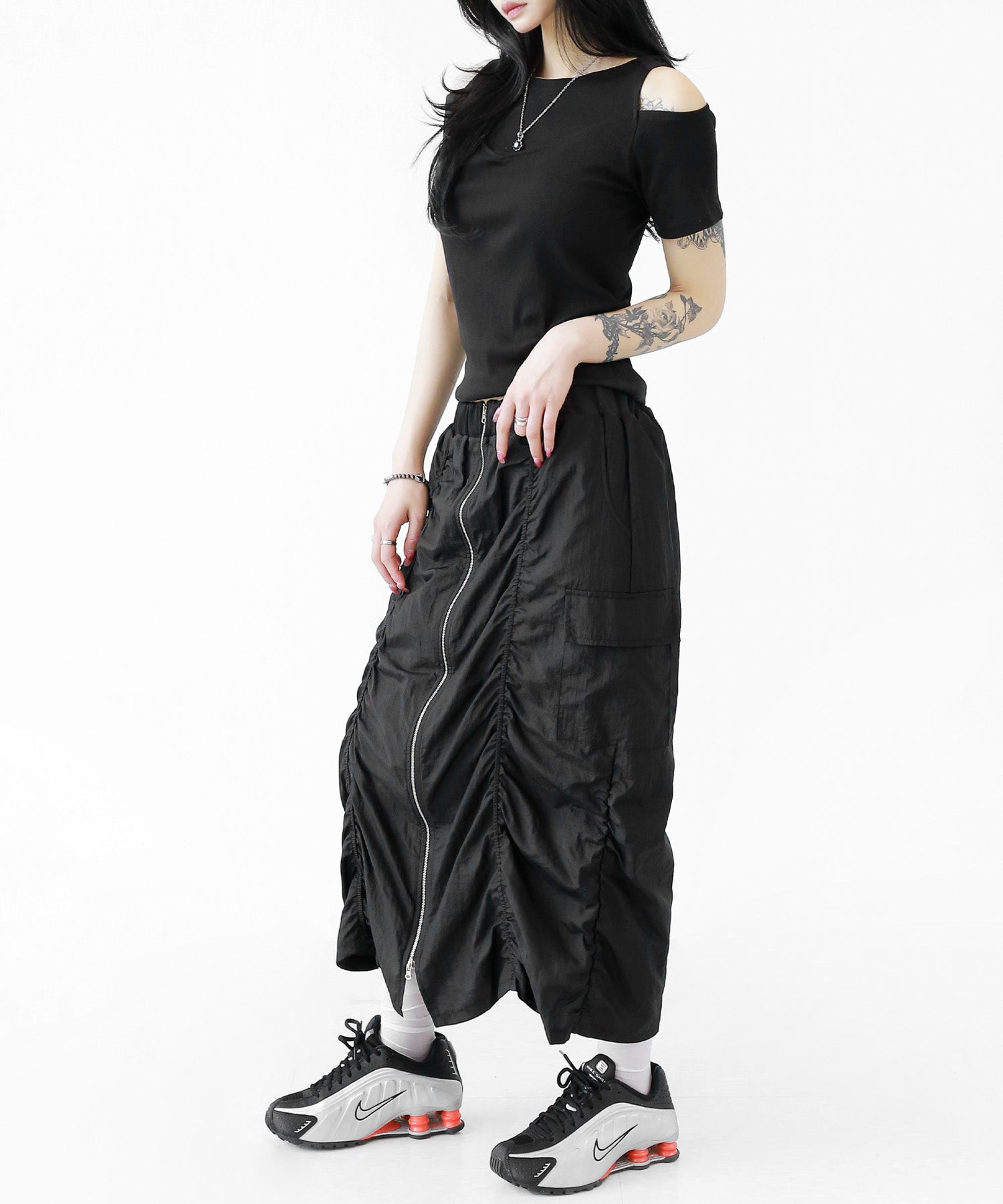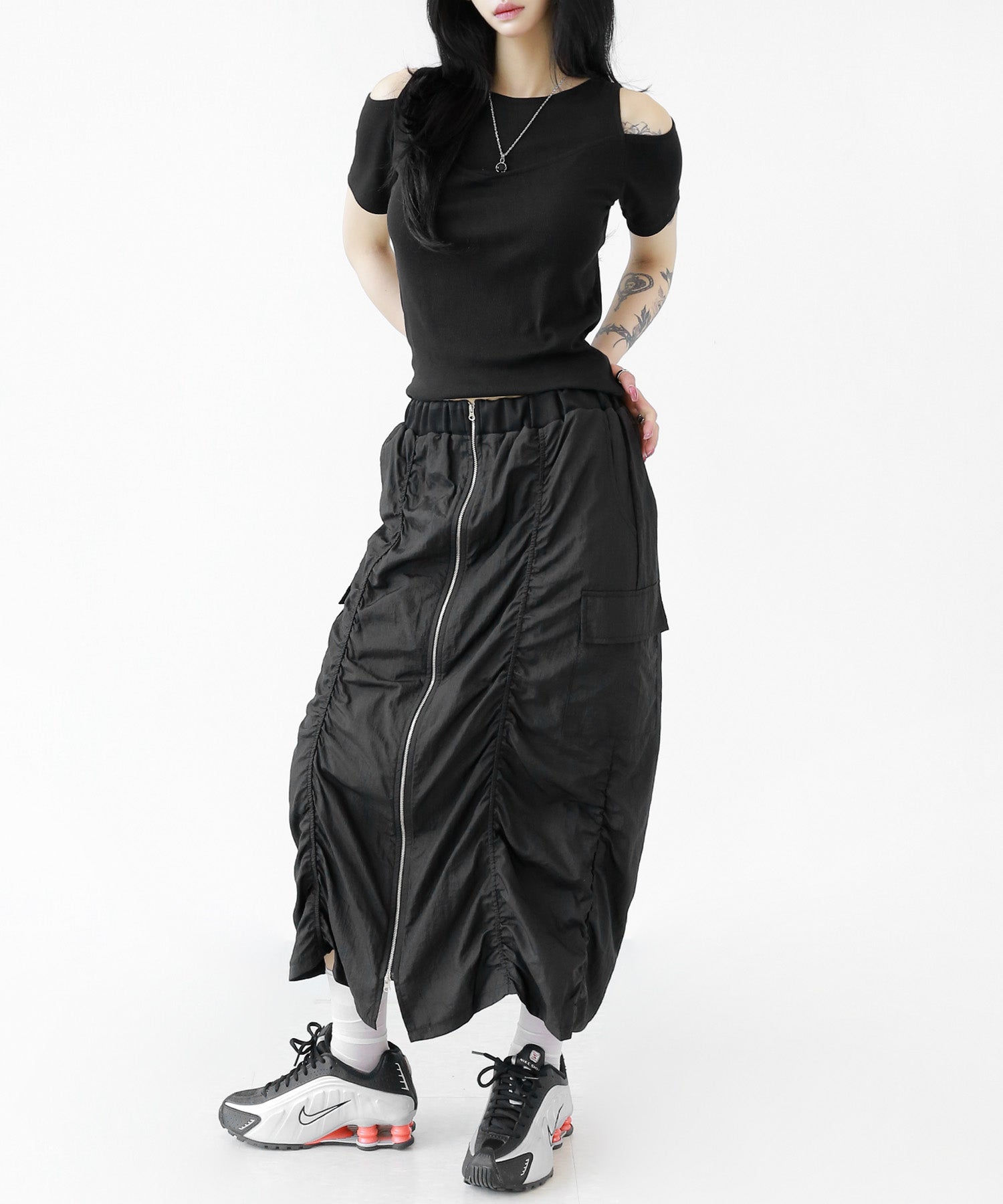 Crafted from ultra-light nylon, this 2WAY zip skirt fuses bold cargo elements with feminine flair. Adjustable front shirring and roomy side pockets give you style and function in one. A viral hit among fashion lovers in Korea and Japan!