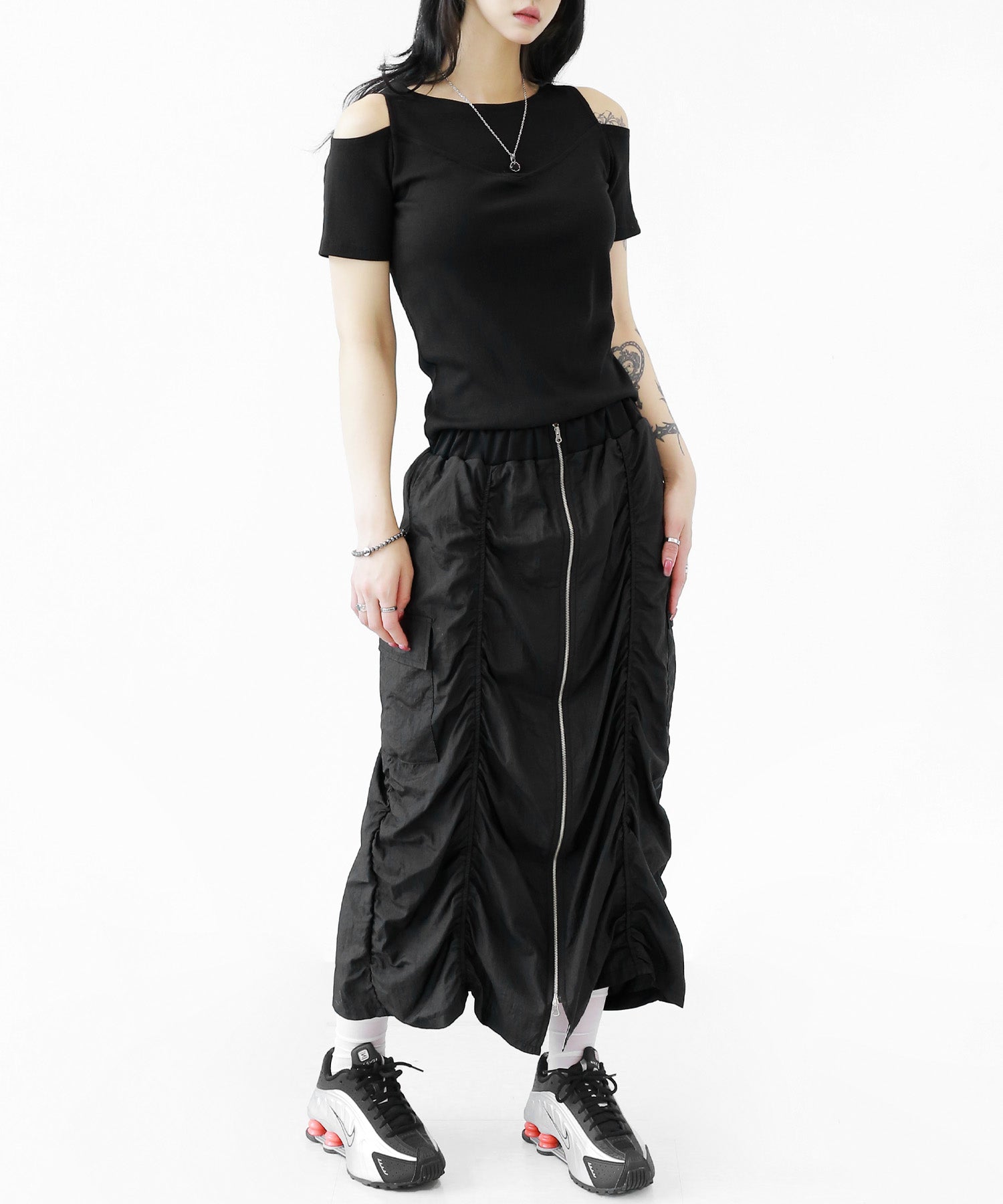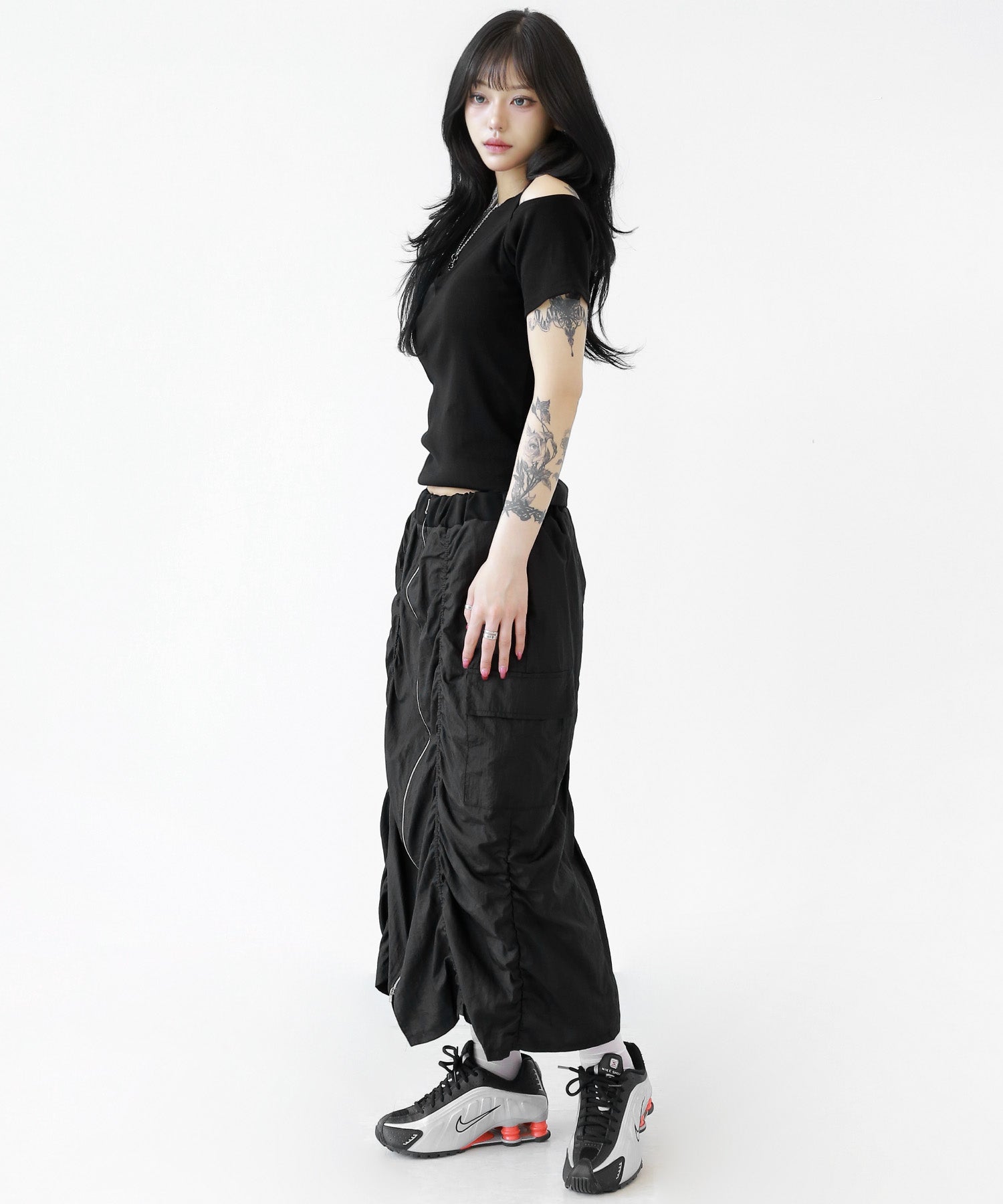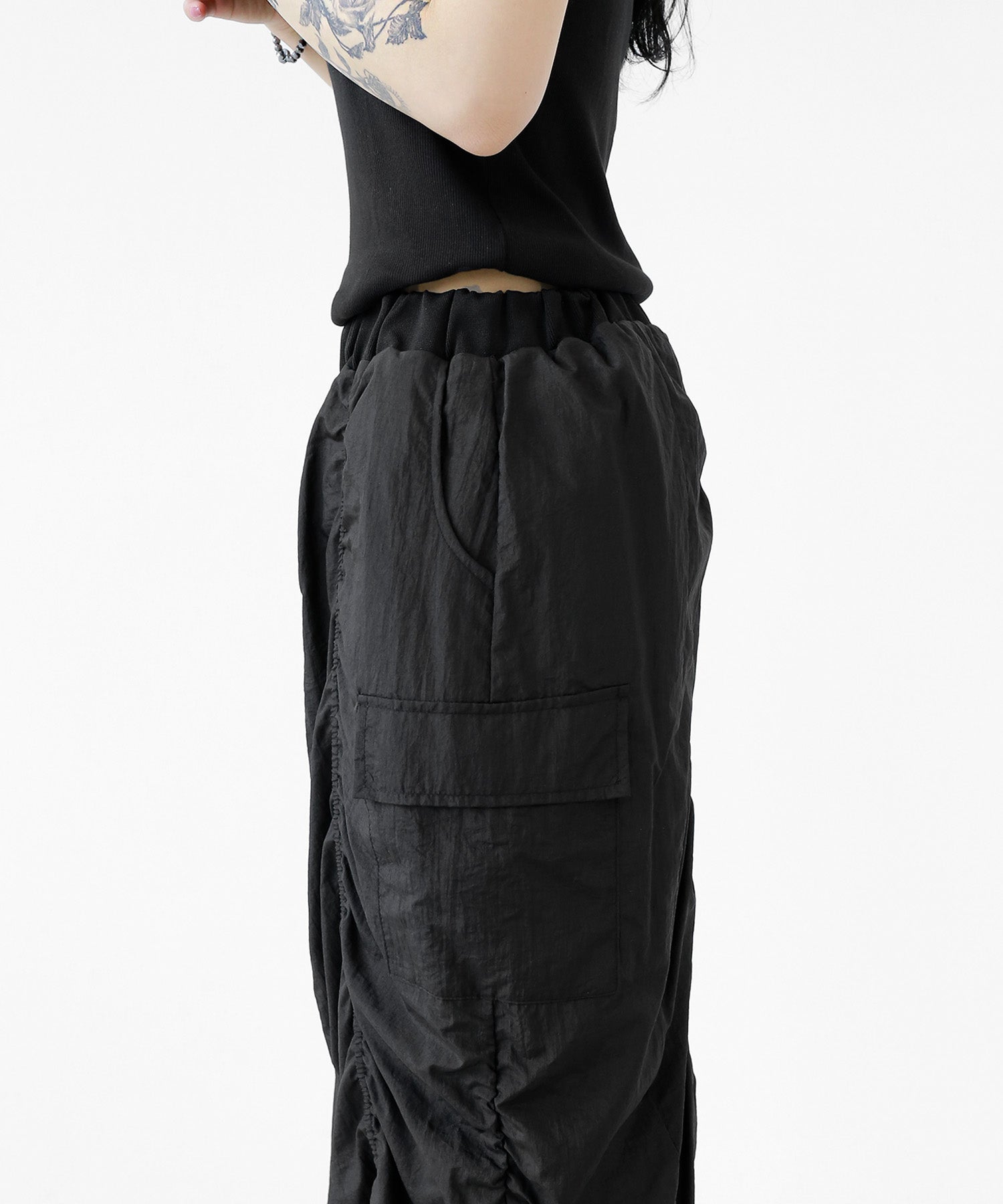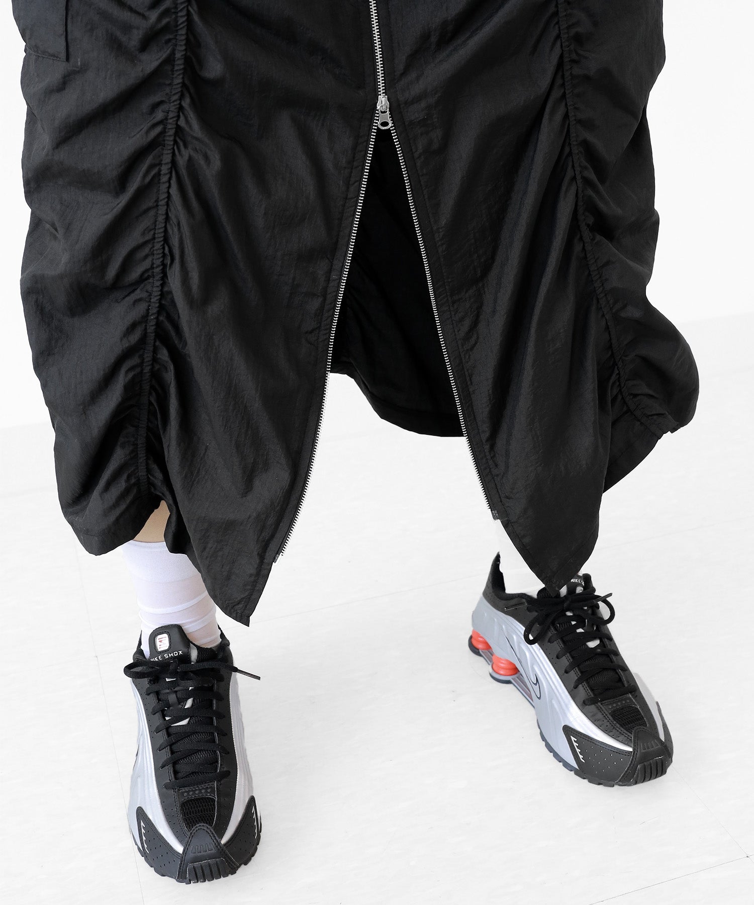 Crafted from ultra-light nylon, this 2WAY zip skirt fuses bold cargo elements with feminine flair. Adjustable front shirring and roomy side pockets give you style and function in one. A viral hit among fashion lovers in Korea and Japan!