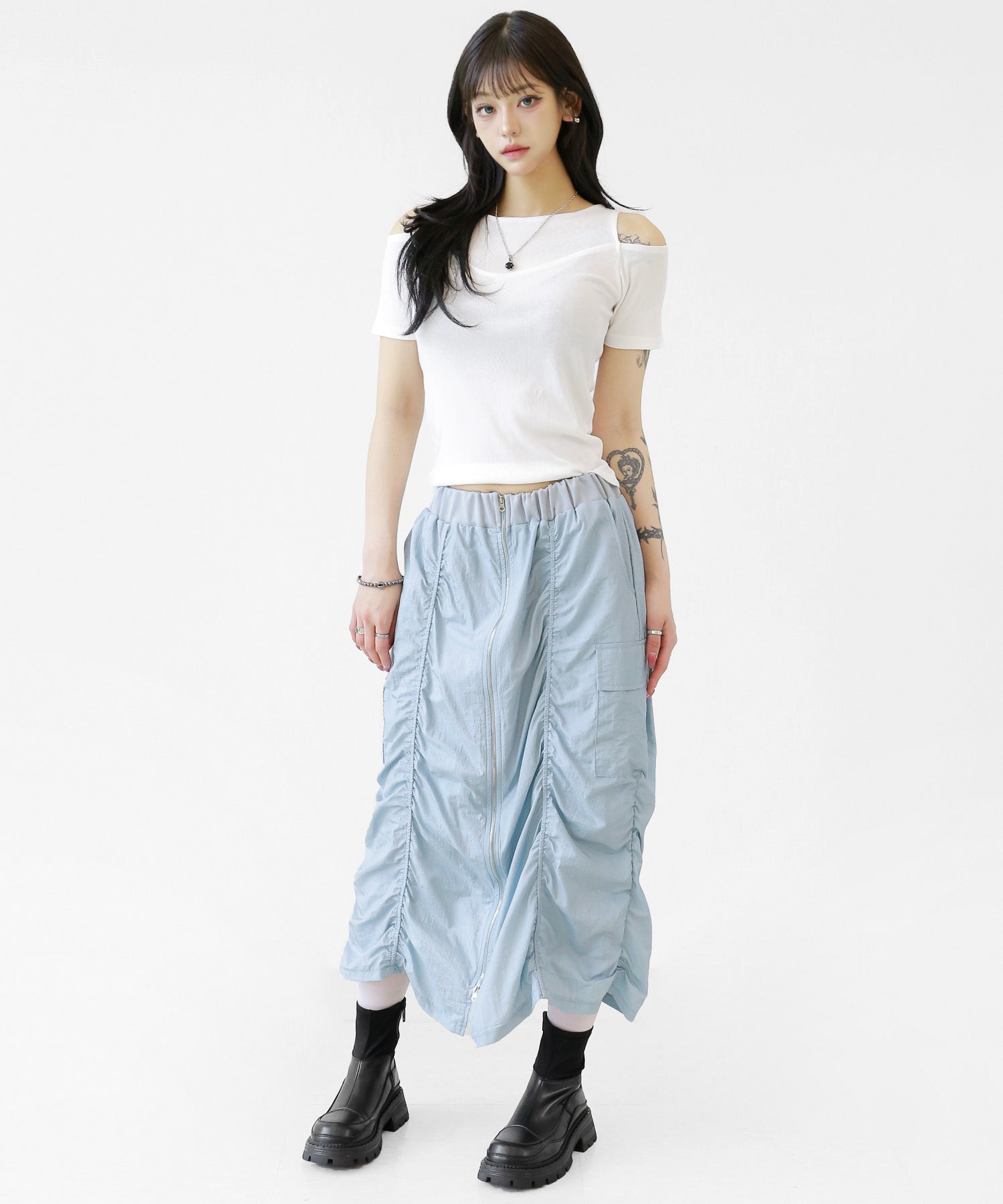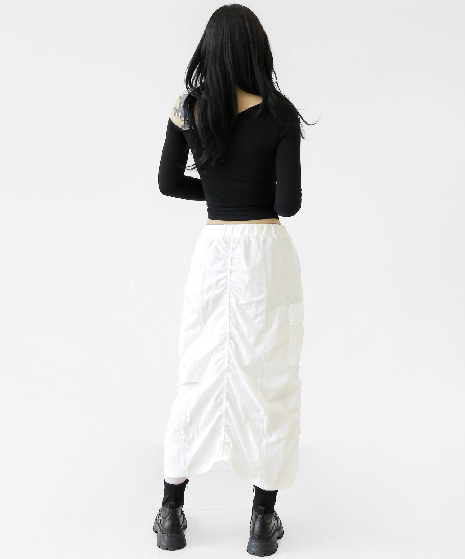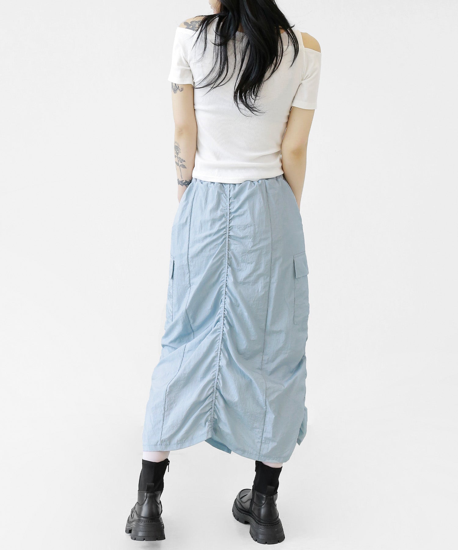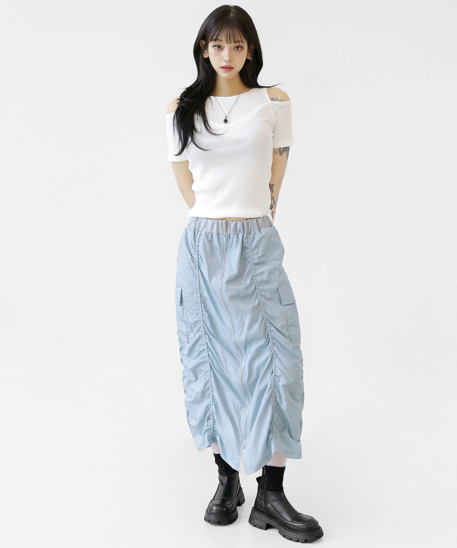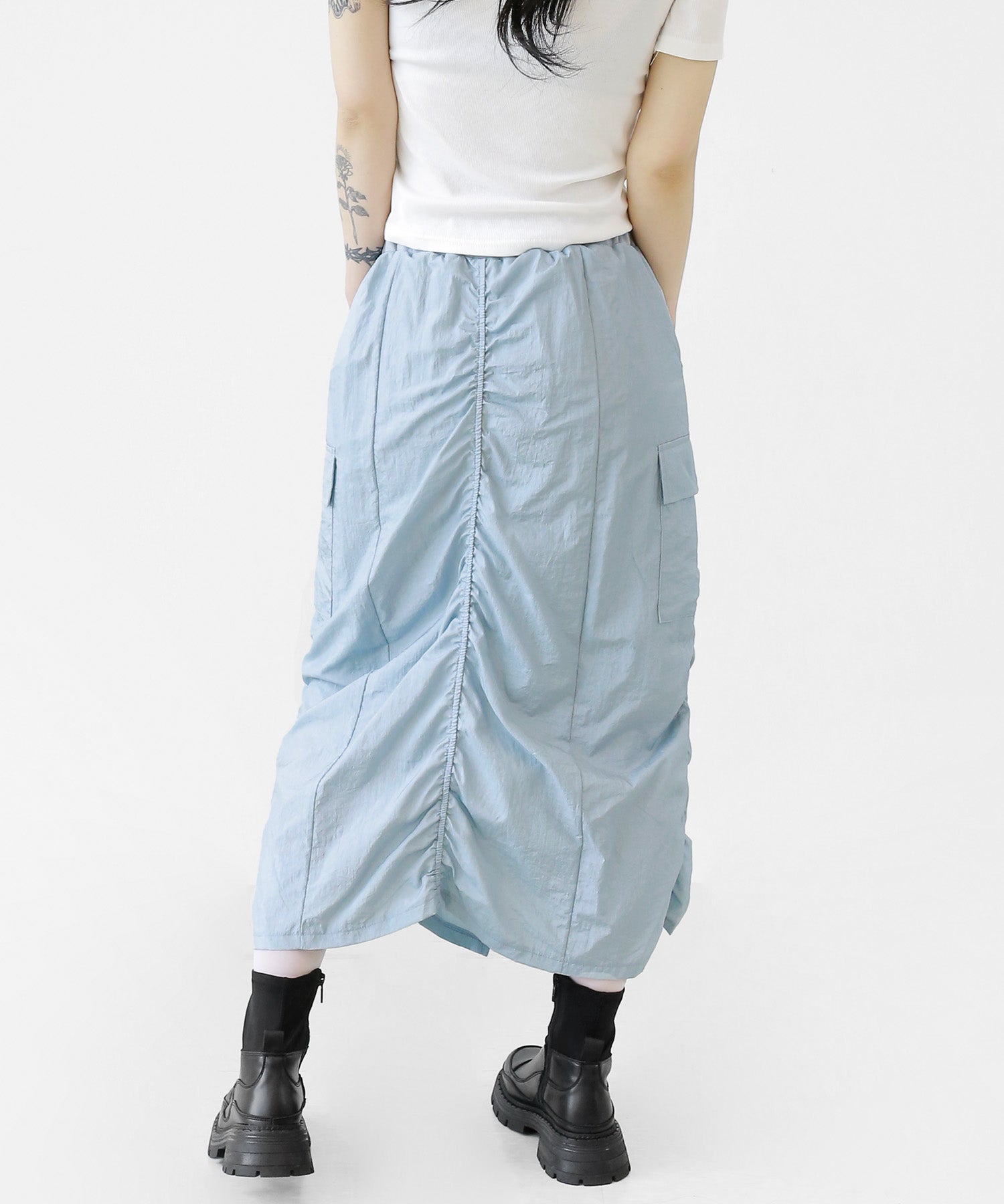 Crafted from ultra-light nylon, this 2WAY zip skirt fuses bold cargo elements with feminine flair. Adjustable front shirring and roomy side pockets give you style and function in one. A viral hit among fashion lovers in Korea and Japan!