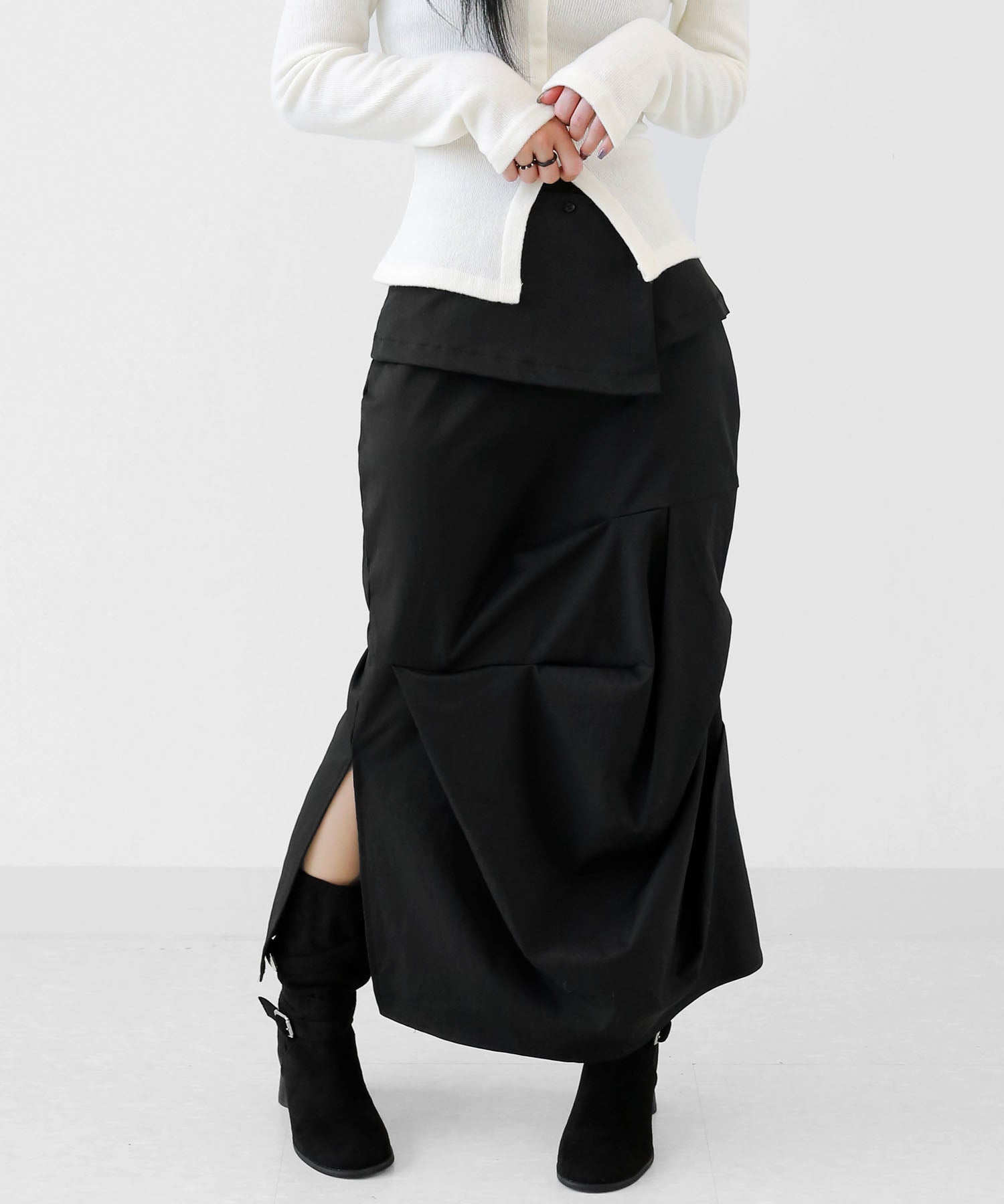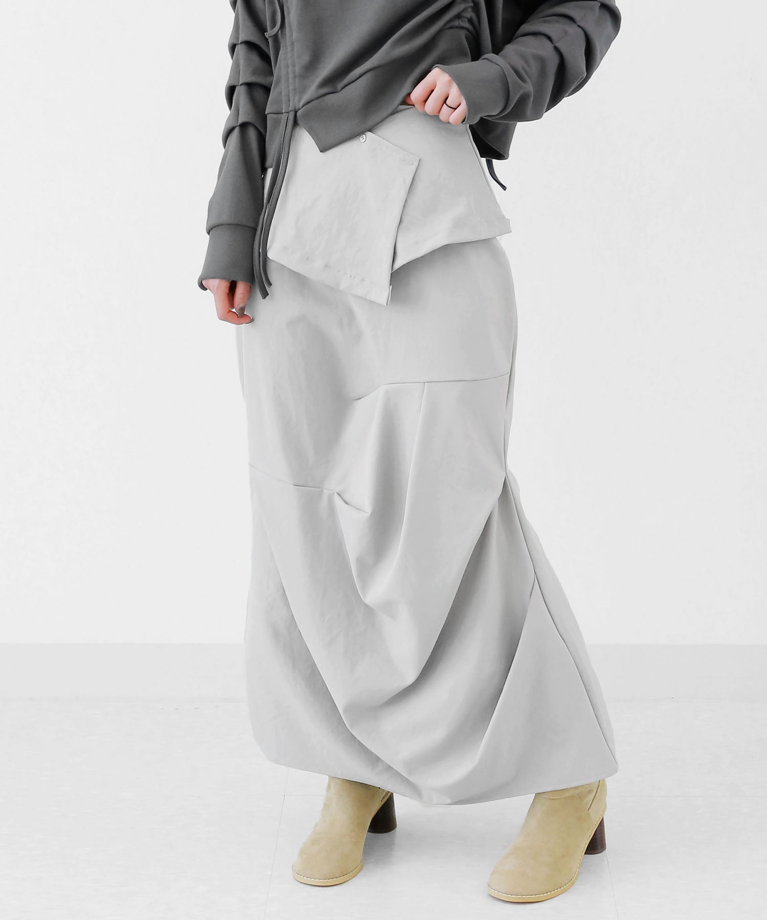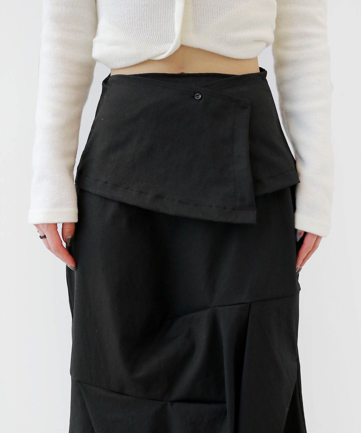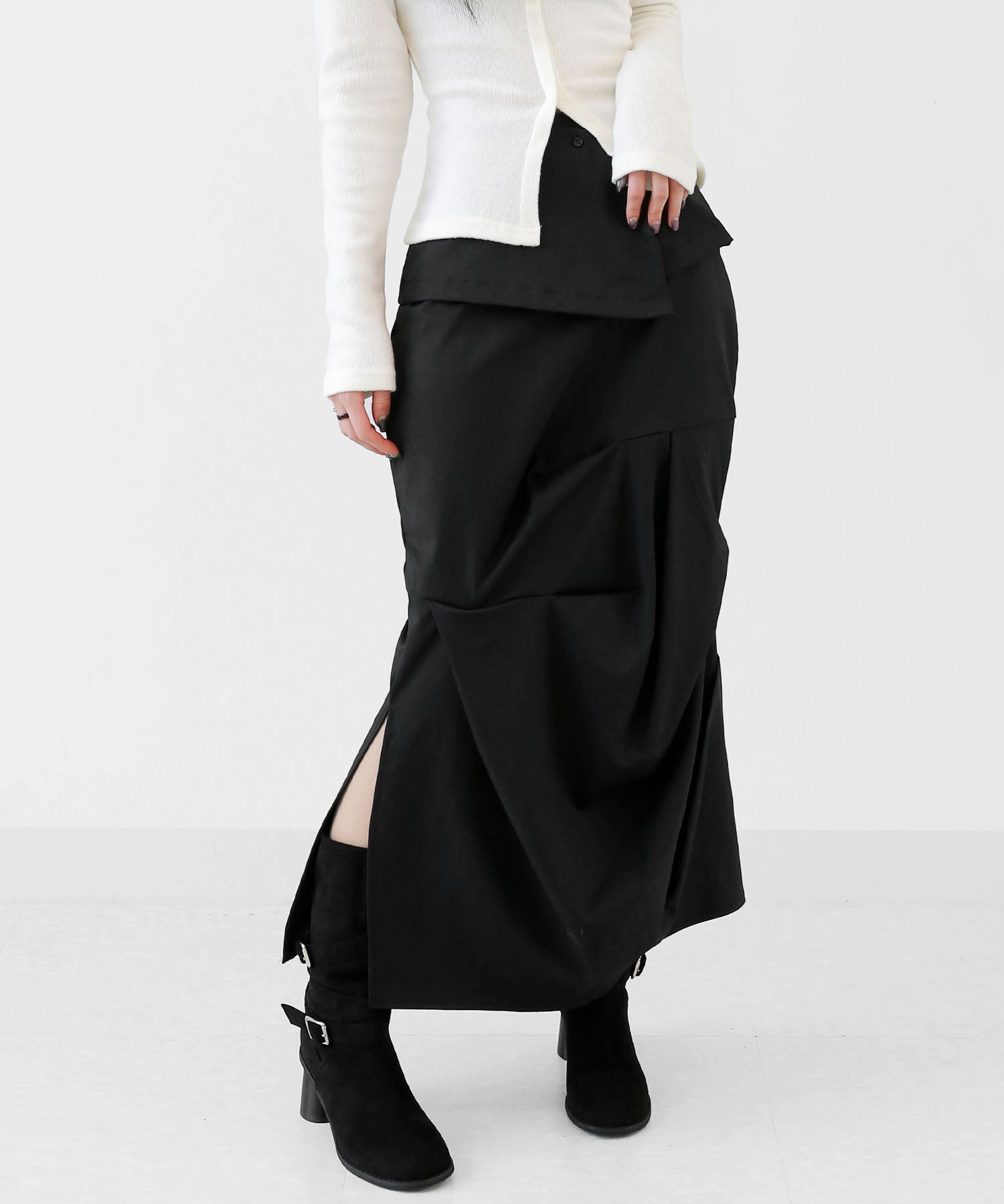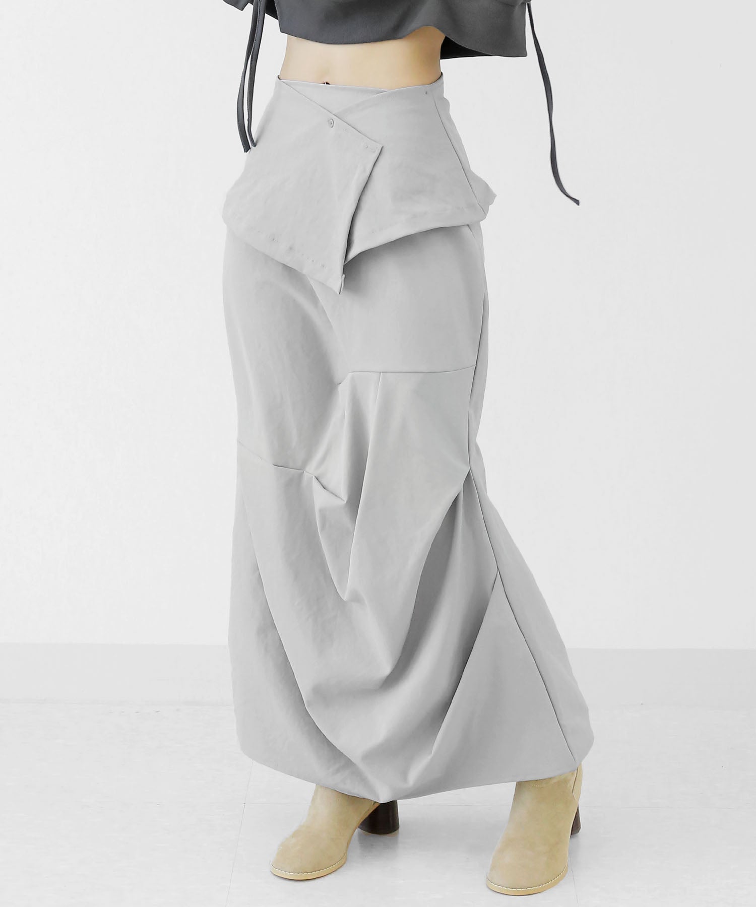 Turn heads with this 2WAY wrap maxi skirt featuring an asymmetric pin-tuck design and deep side slit.