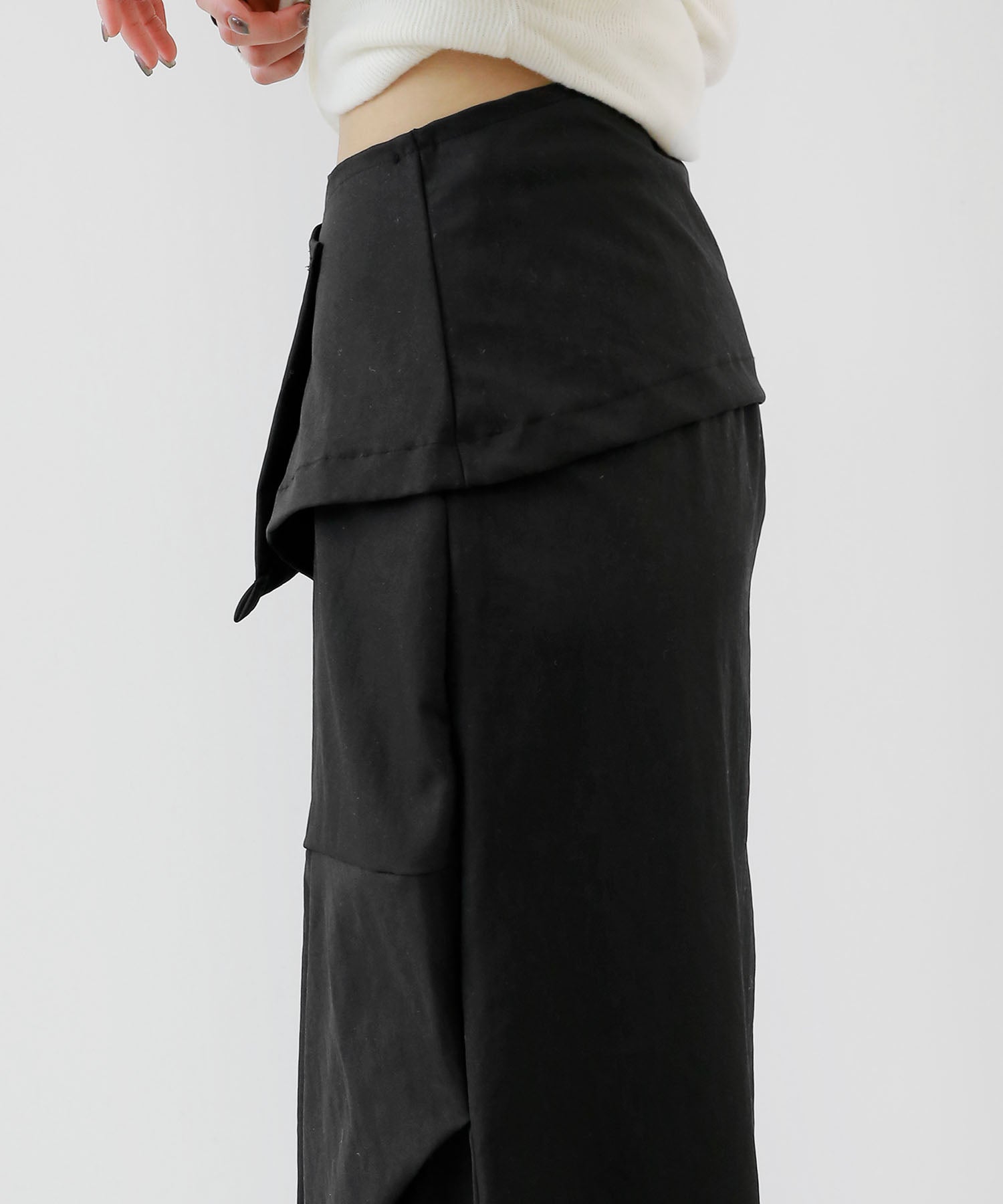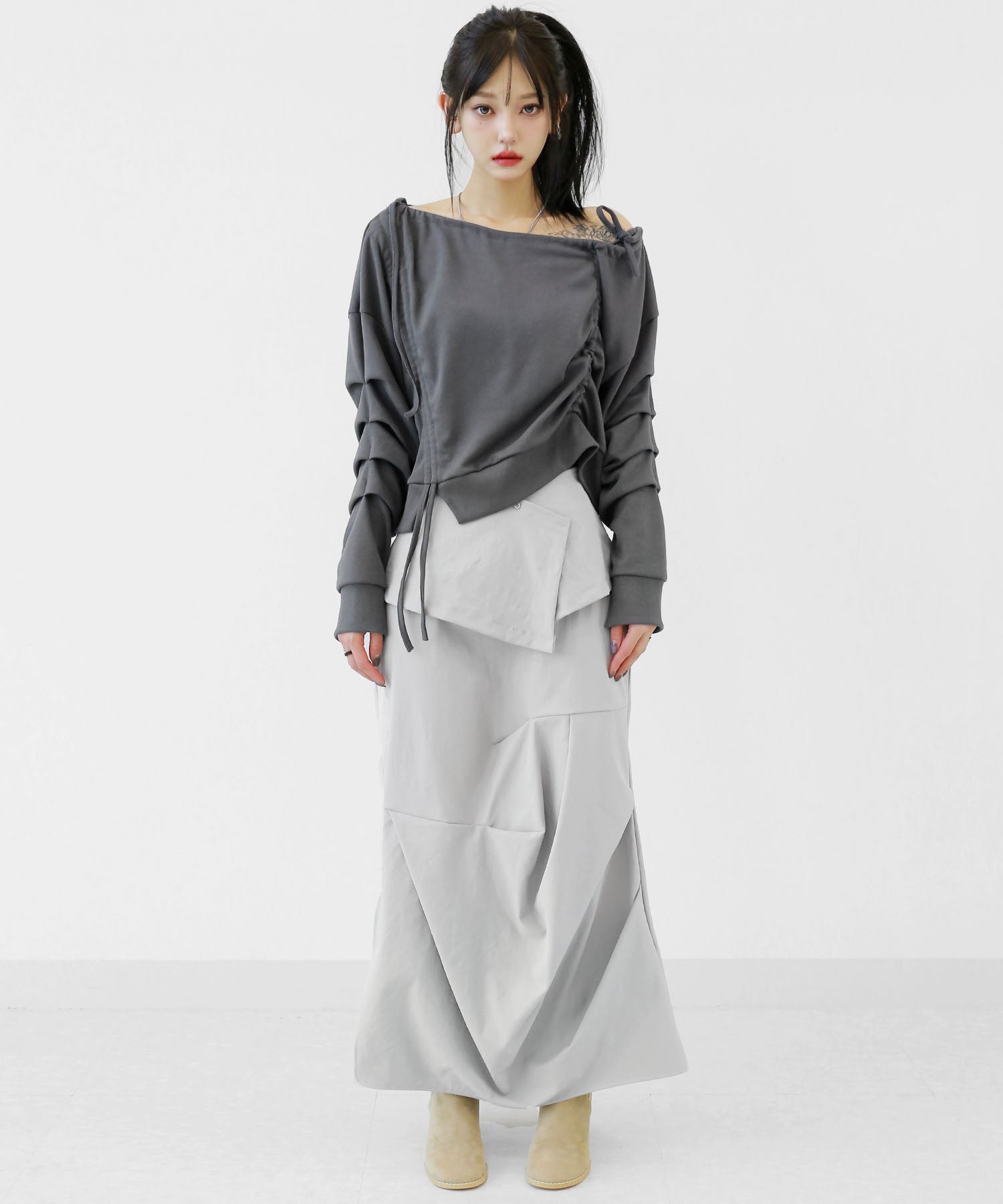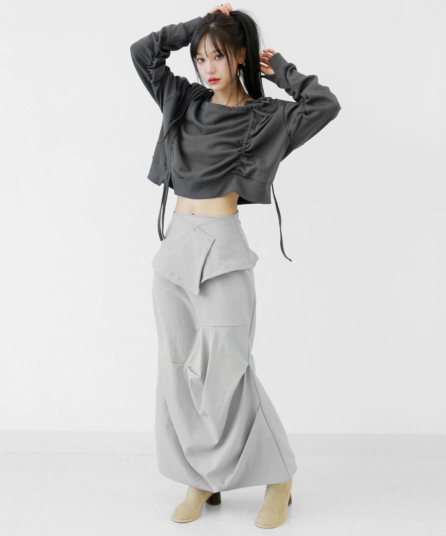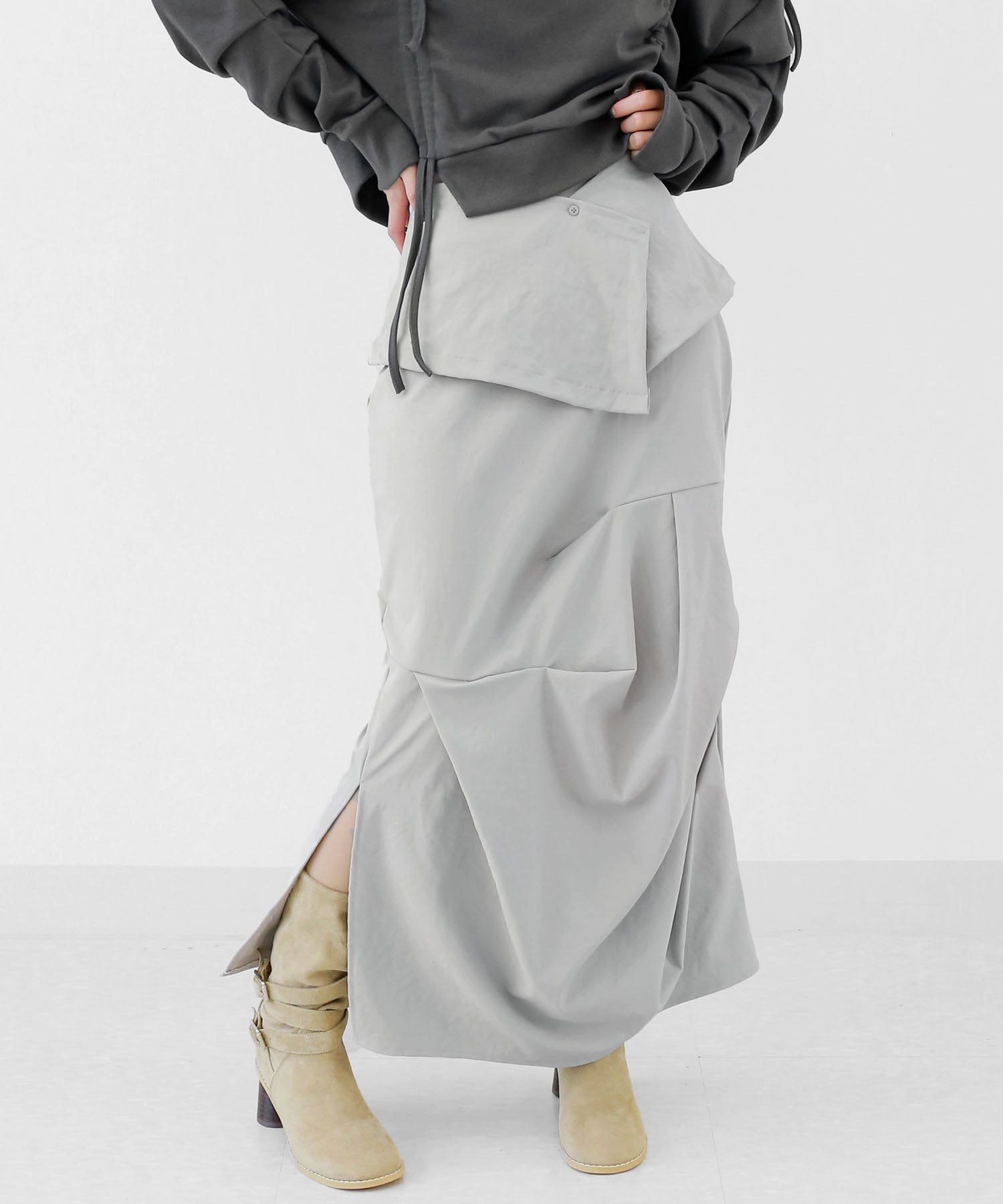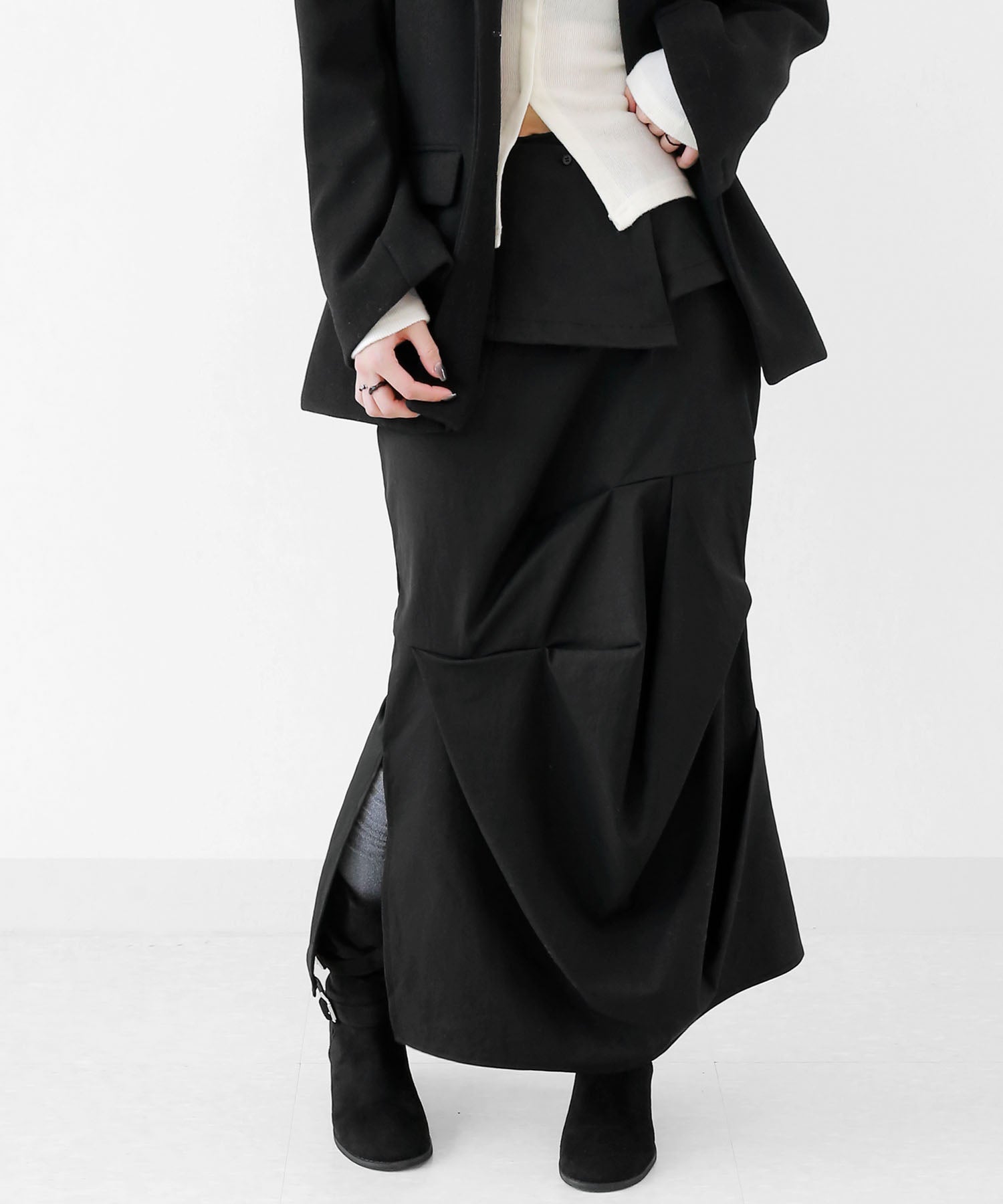 Turn heads with this 2WAY wrap maxi skirt featuring an asymmetric pin-tuck design and deep side slit.