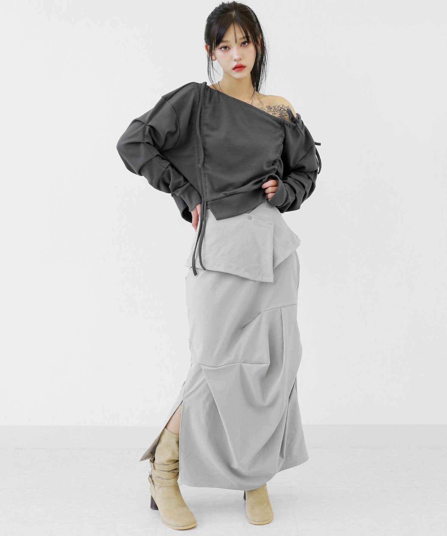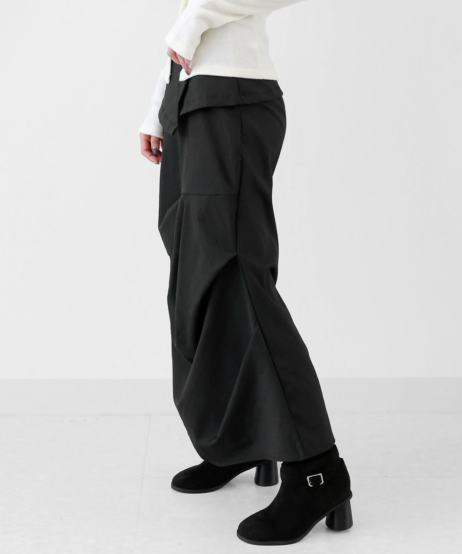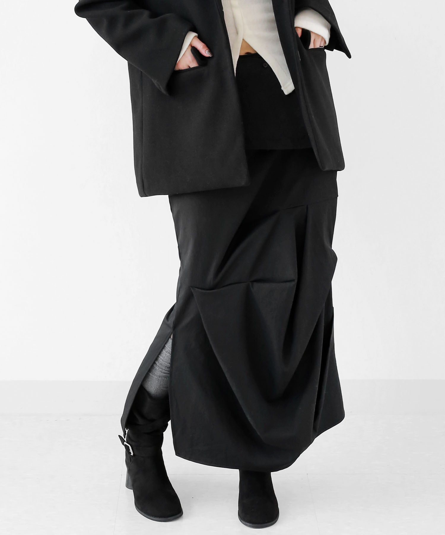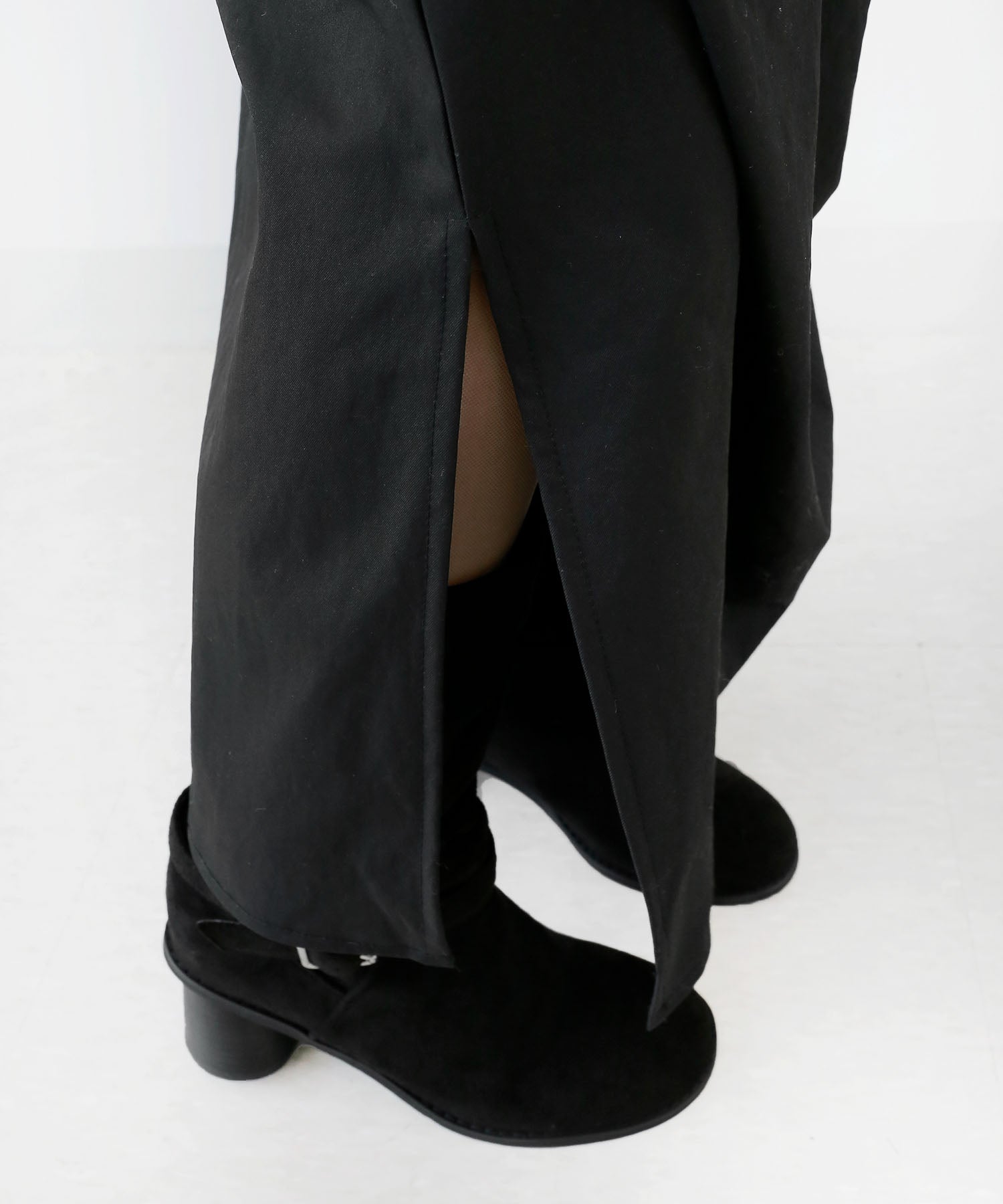 Turn heads with this 2WAY wrap maxi skirt featuring an asymmetric pin-tuck design and deep side slit.