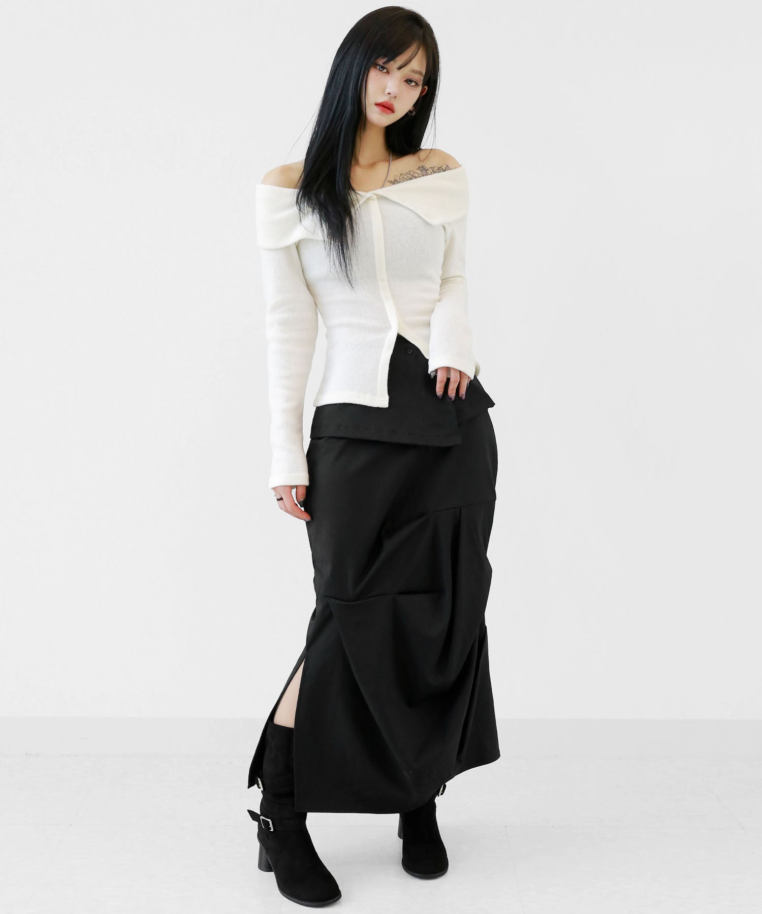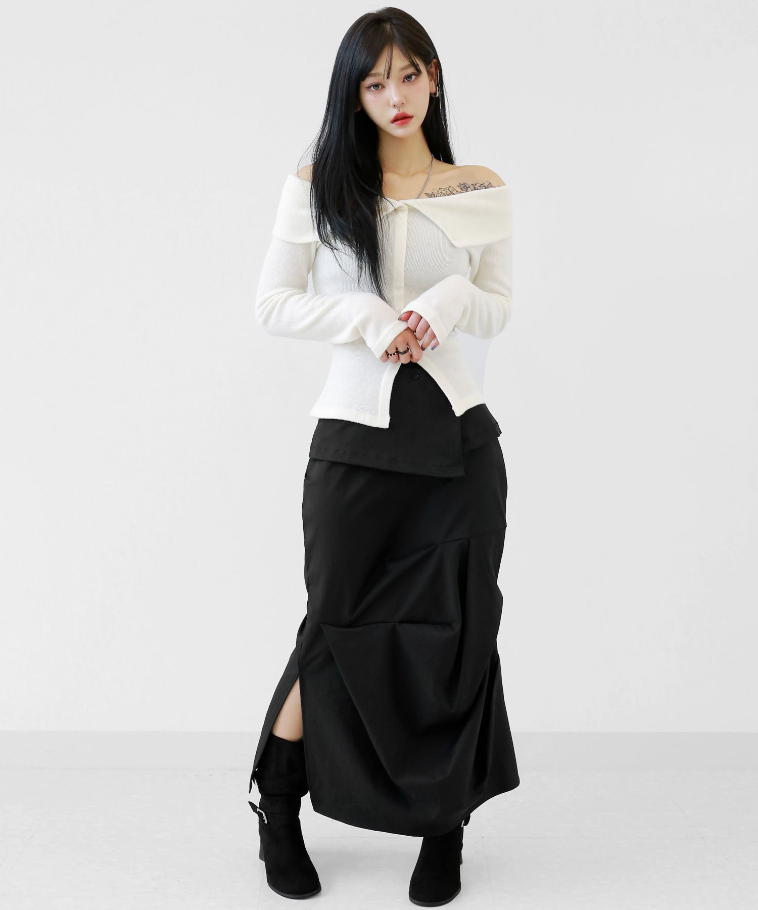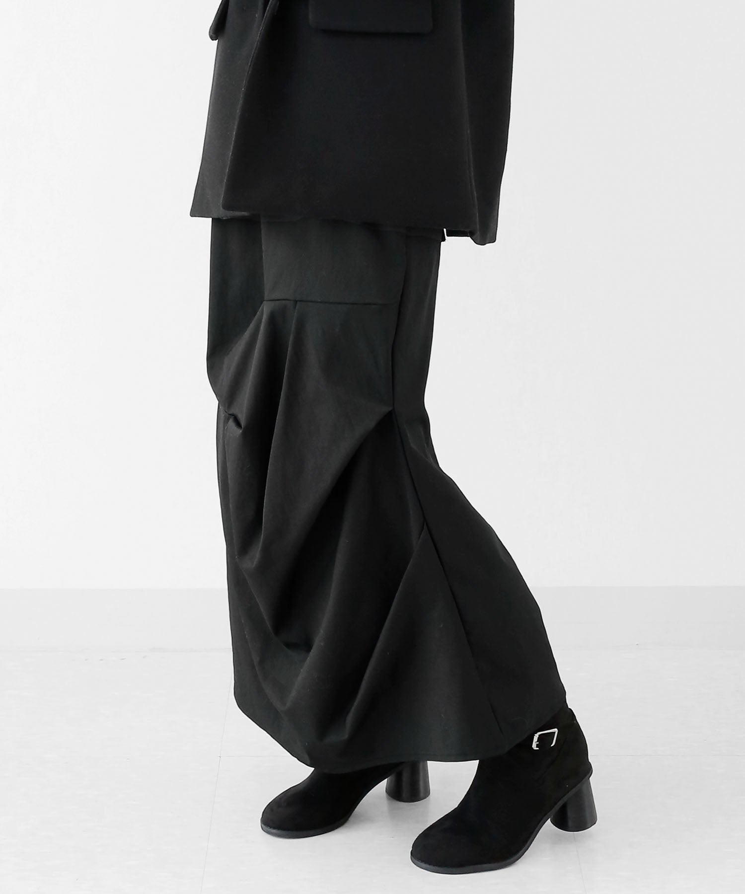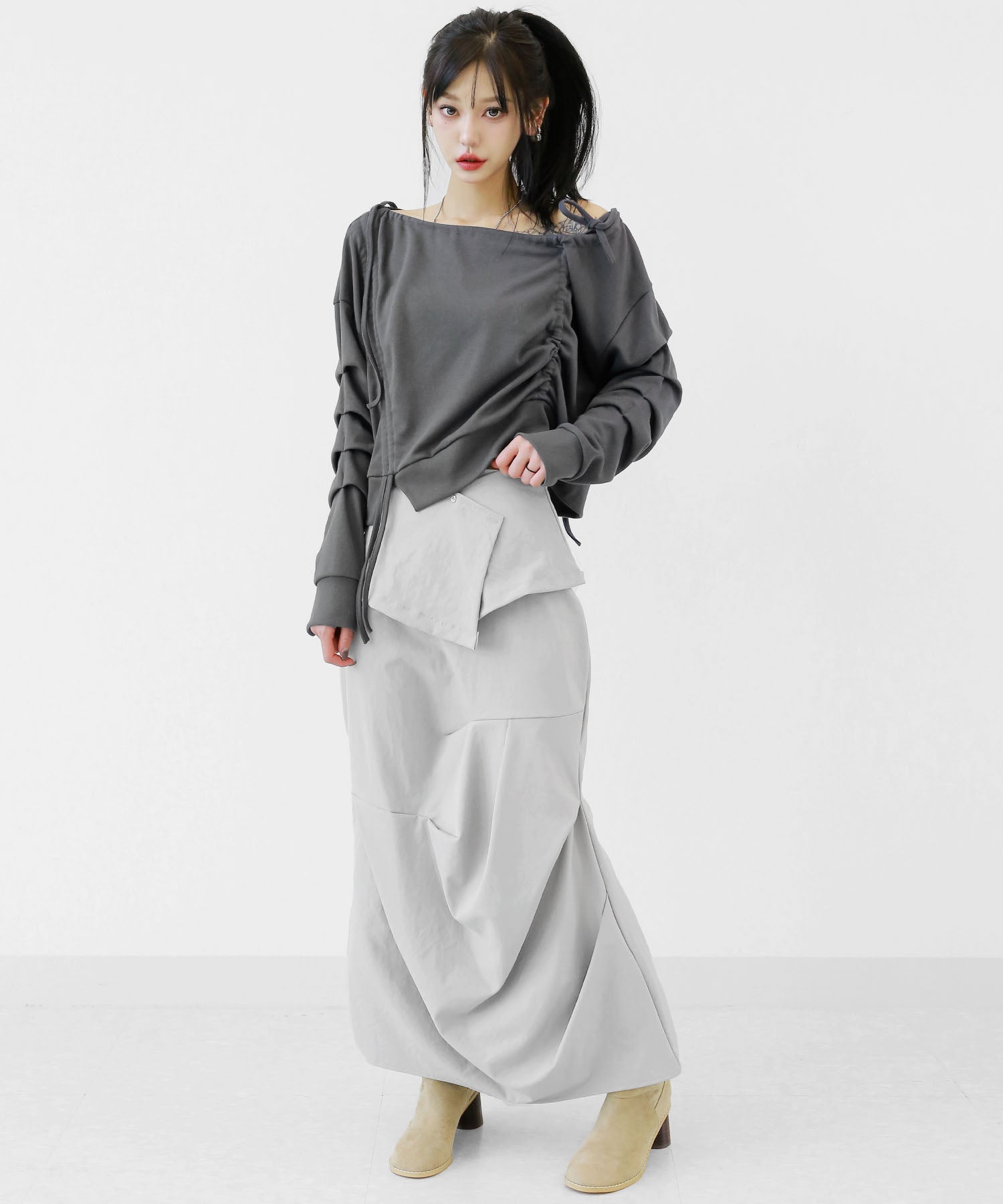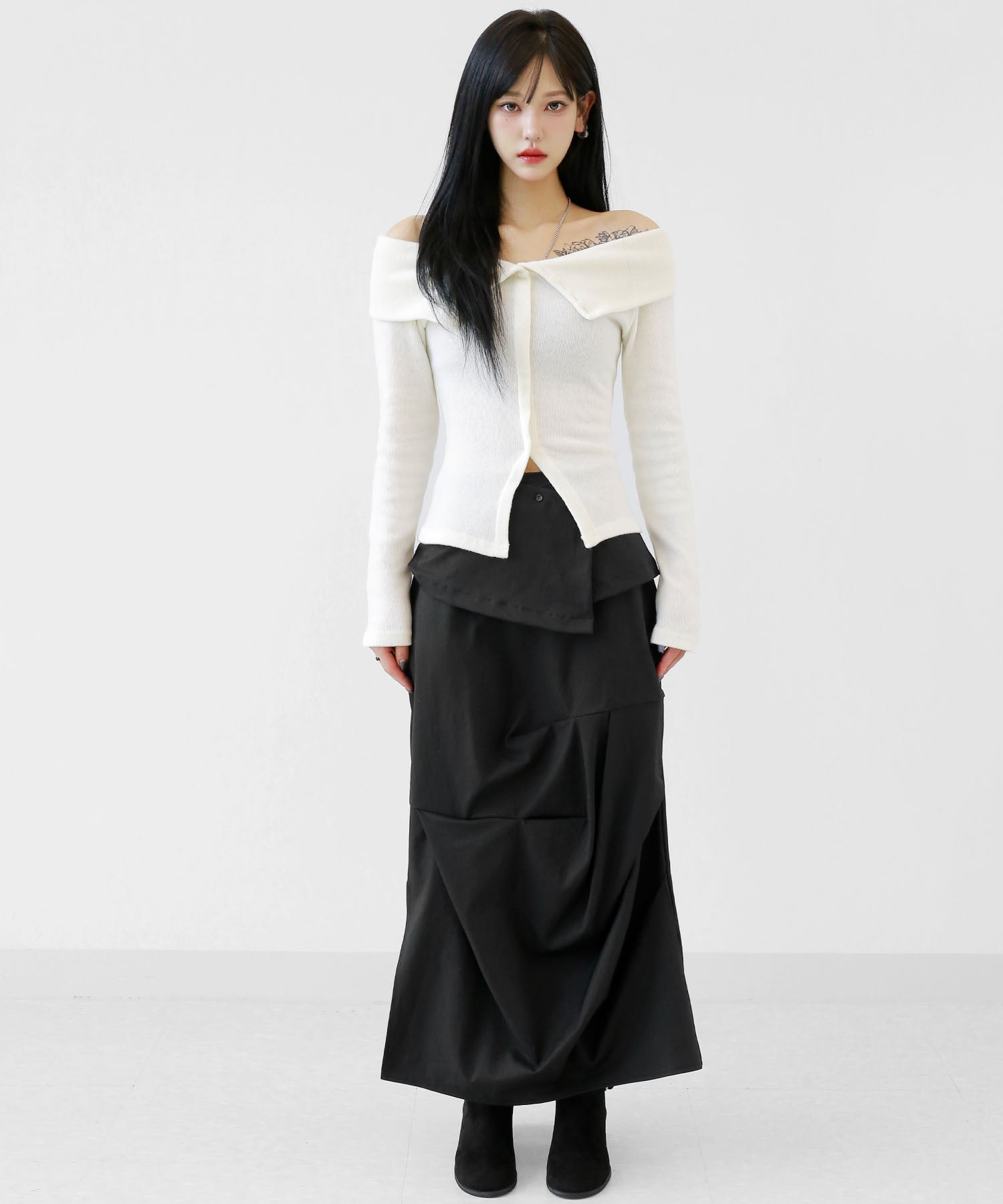 Turn heads with this 2WAY wrap maxi skirt featuring an asymmetric pin-tuck design and deep side slit.