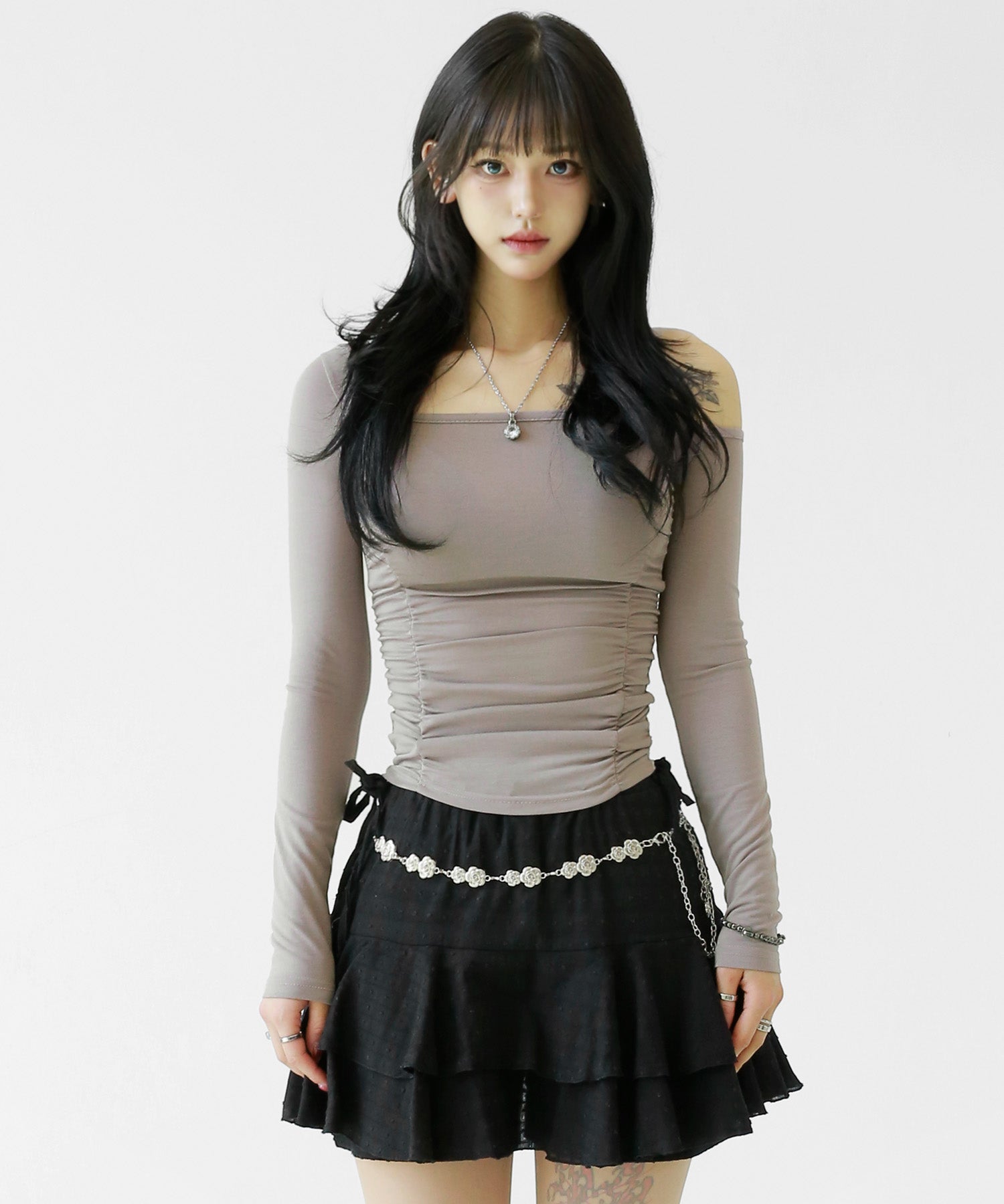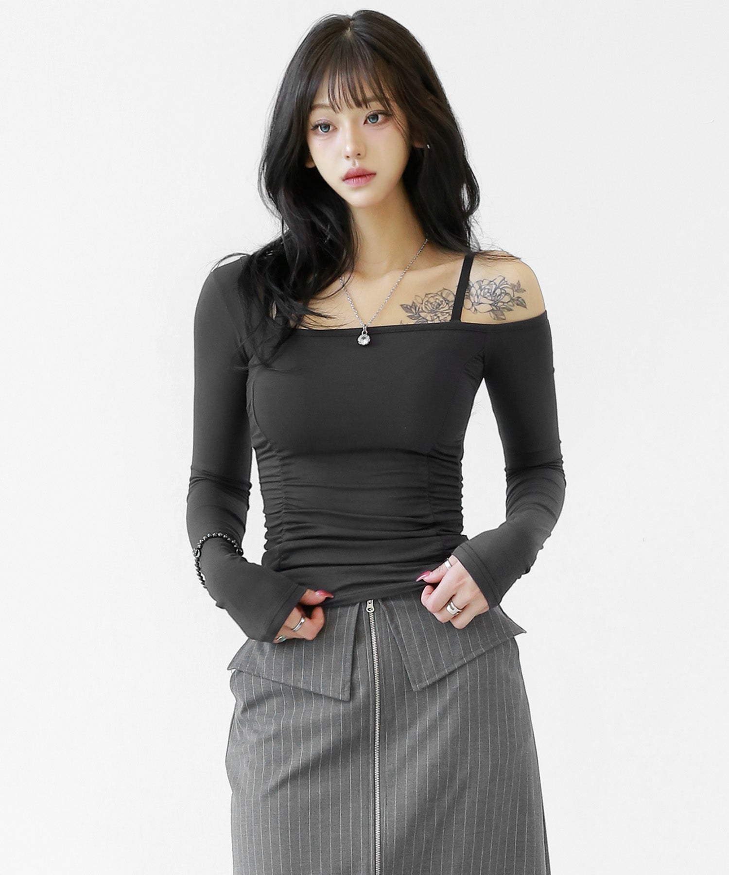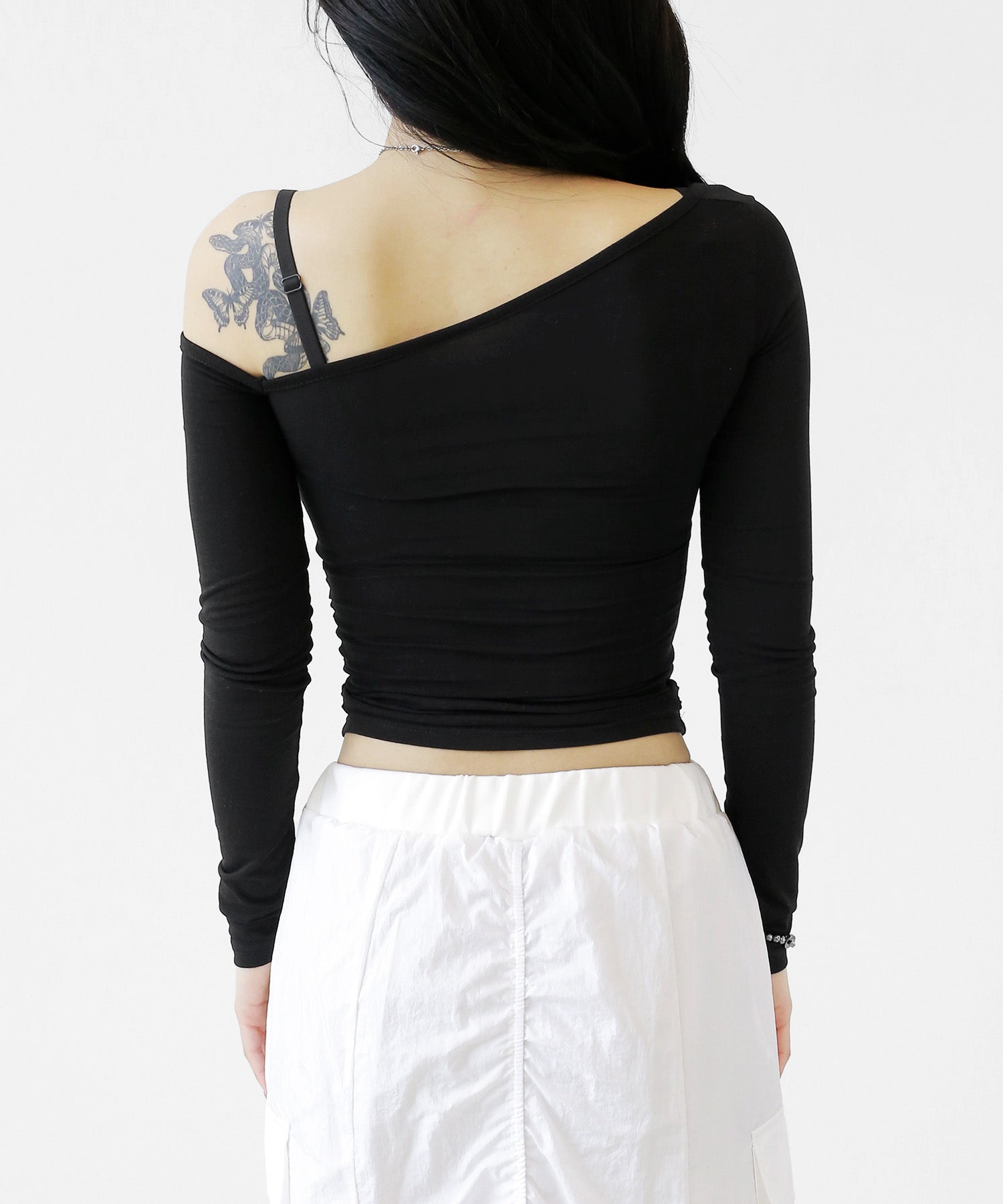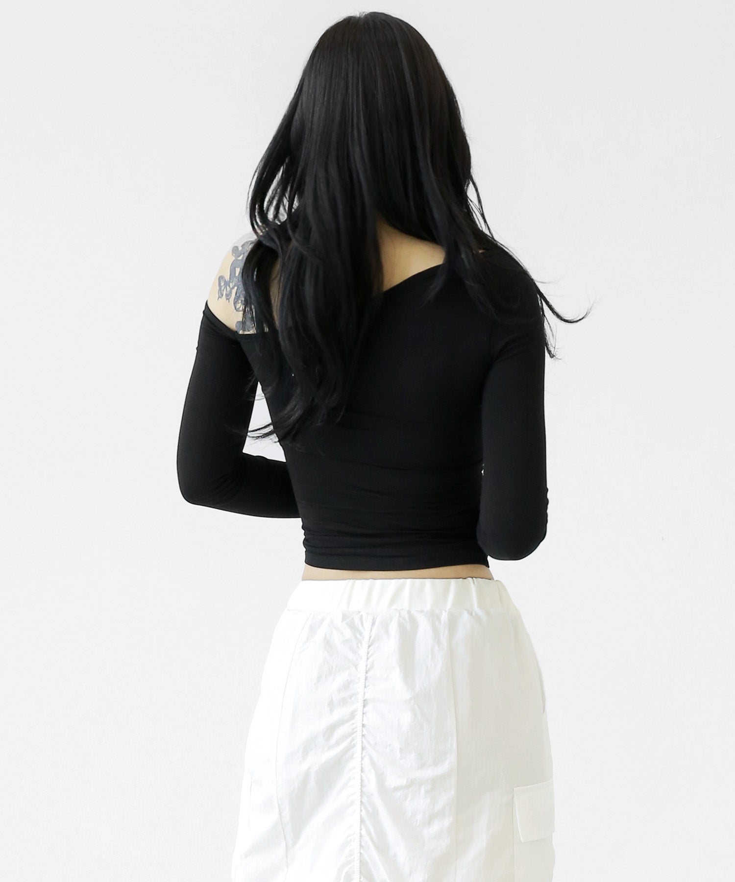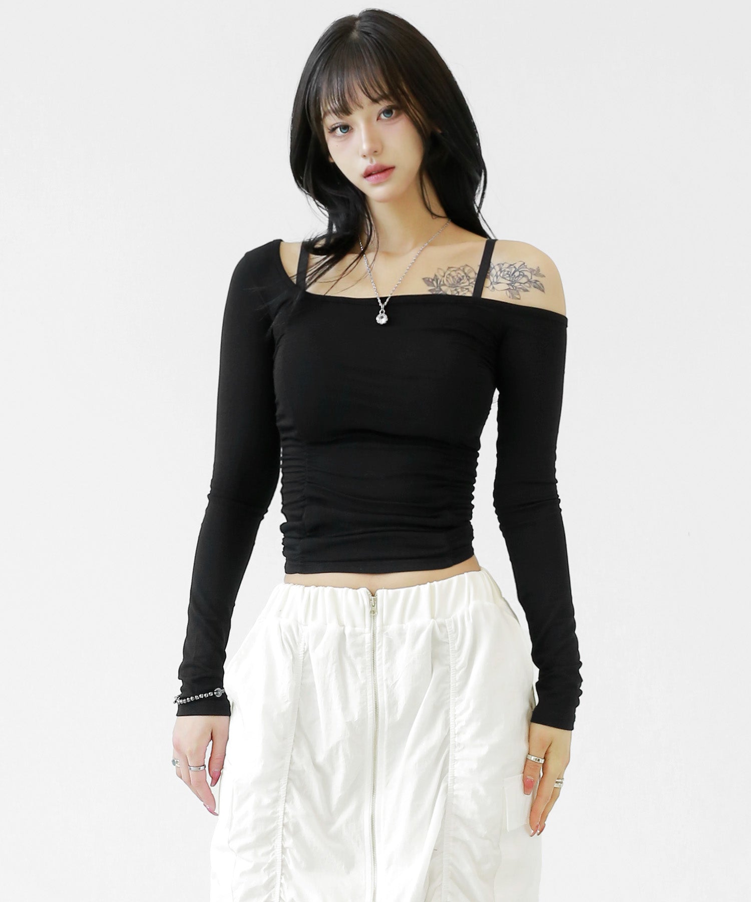 Turn heads with this statement one-shoulder crop top featuring flattering shirring and an unbalanced silhouette. Designed to enhance your shape with a slim fit and cropped cut, it brings that bold "K-Fashion" energy loved by trendsetters in Korea and Japan. Pairs perfectly with denim, cargo pants, or tailored slacks for a fashion-forward look