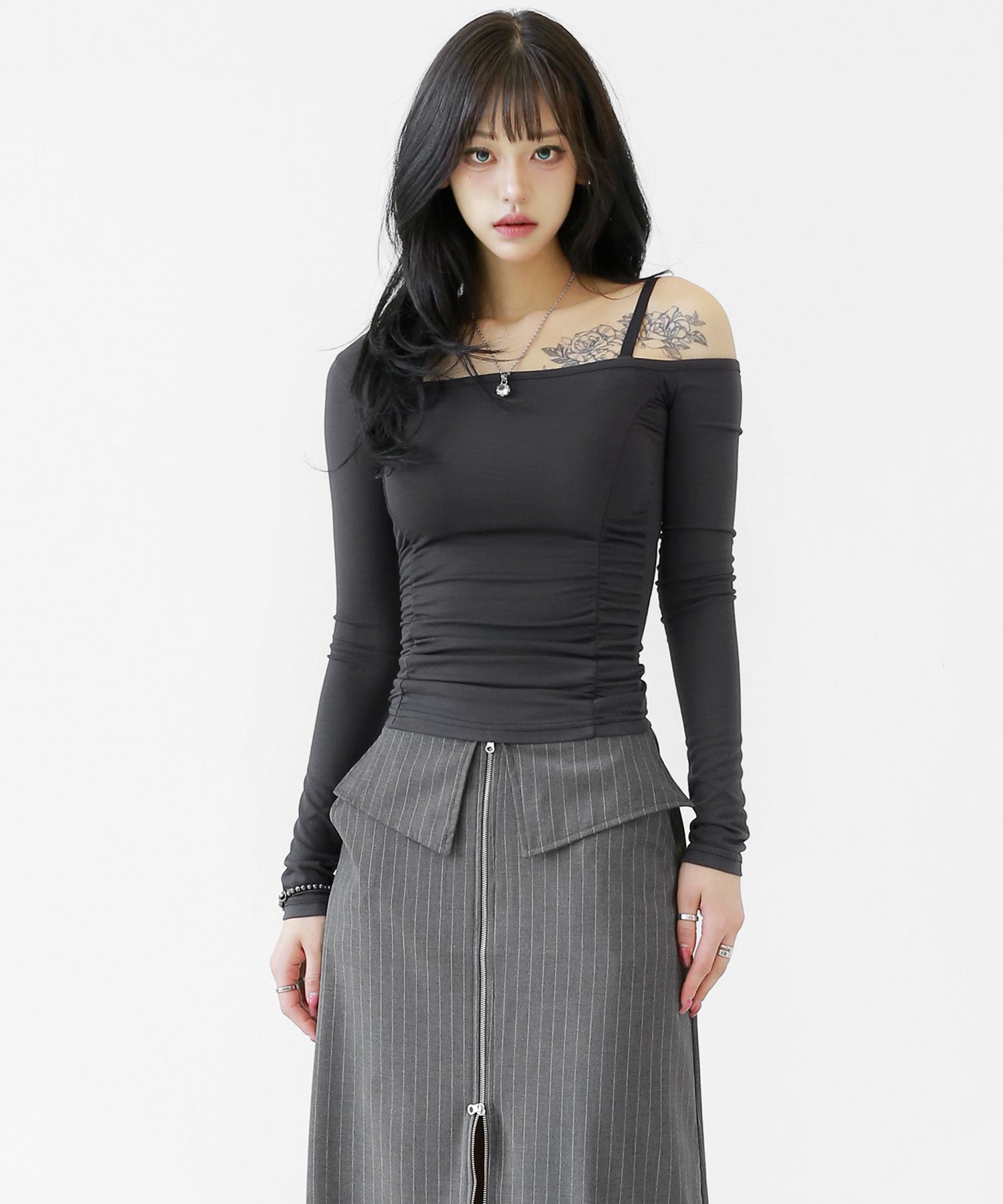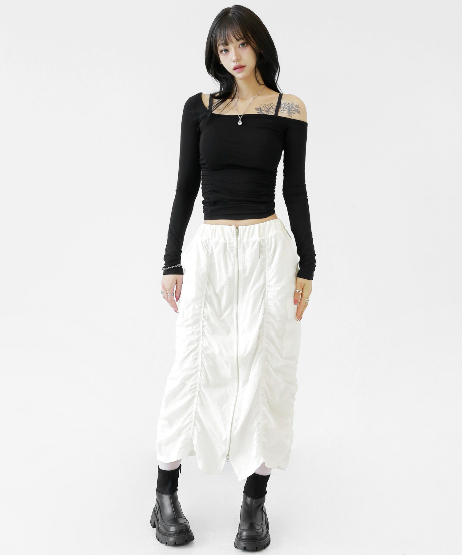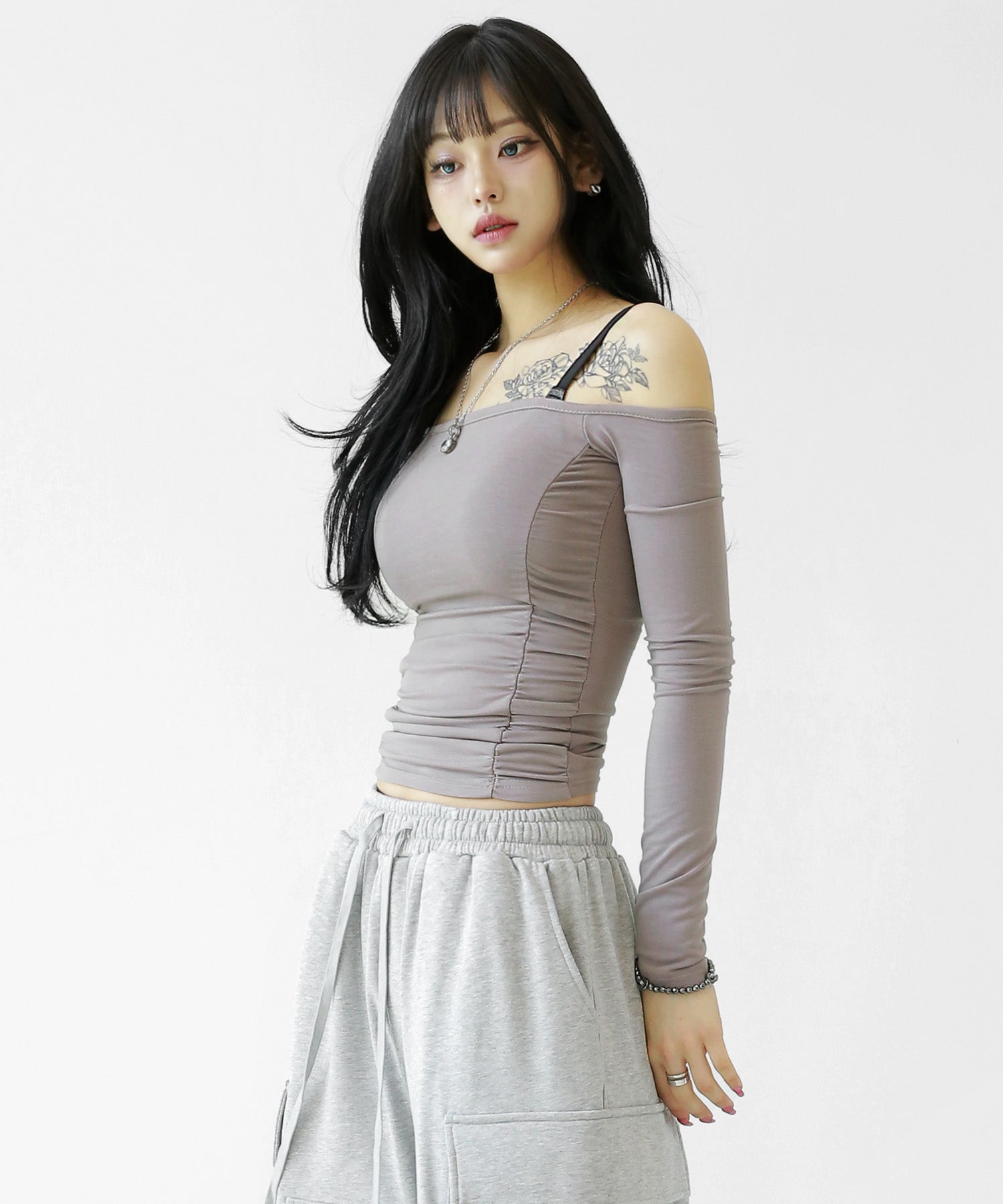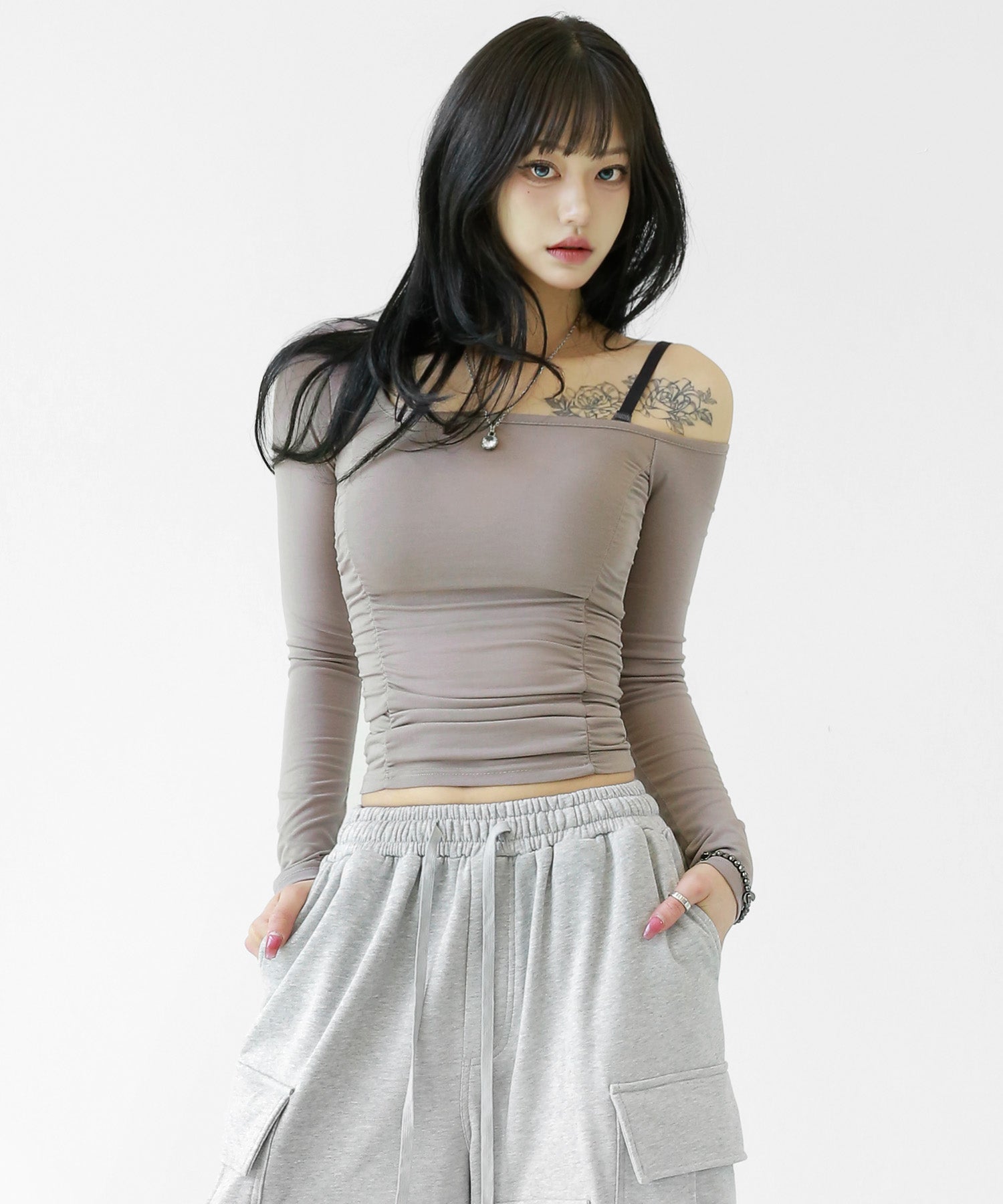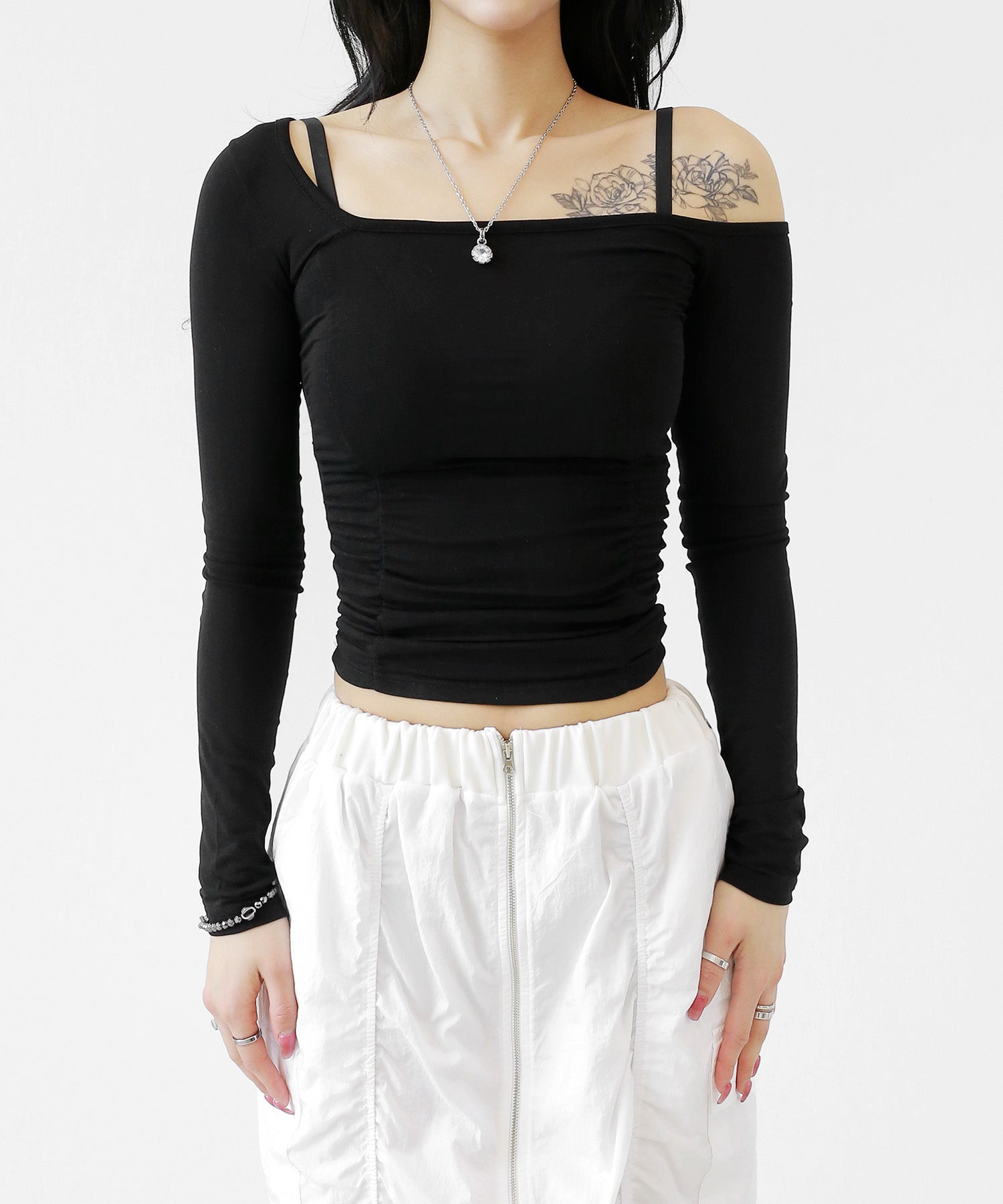 Turn heads with this statement one-shoulder crop top featuring flattering shirring and an unbalanced silhouette. Designed to enhance your shape with a slim fit and cropped cut, it brings that bold "K-Fashion" energy loved by trendsetters in Korea and Japan. Pairs perfectly with denim, cargo pants, or tailored slacks for a fashion-forward look