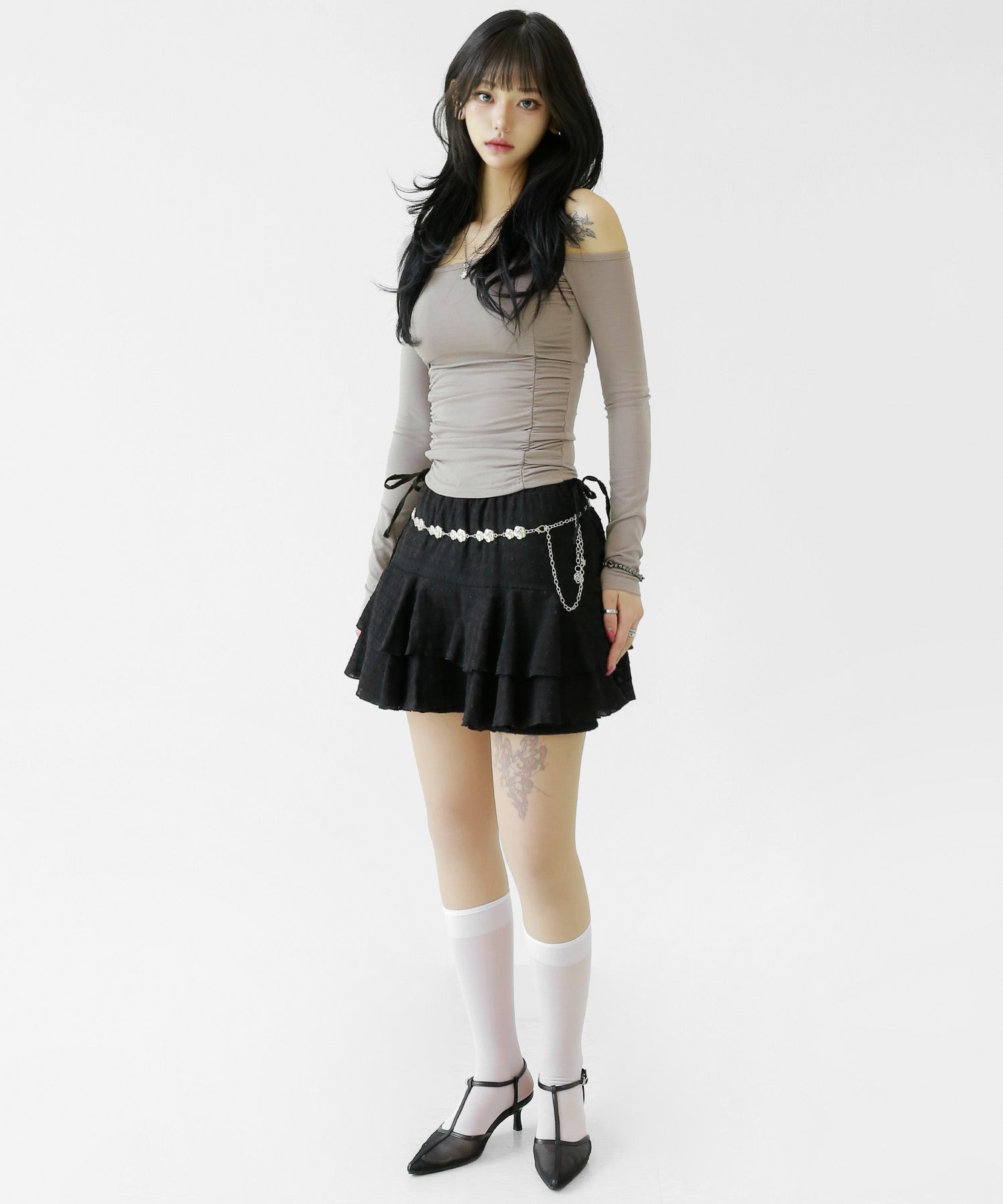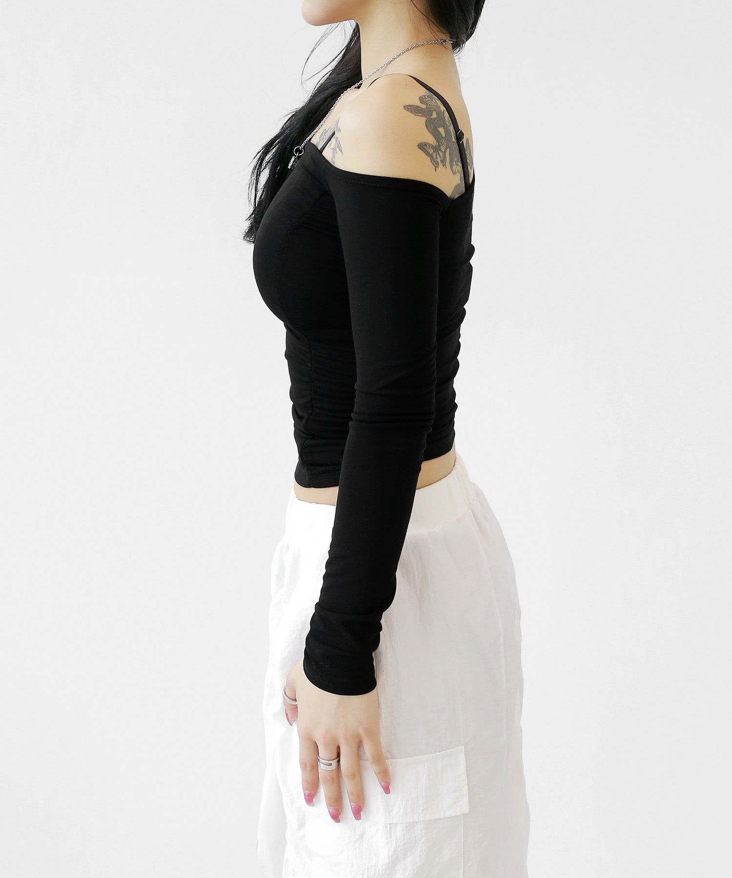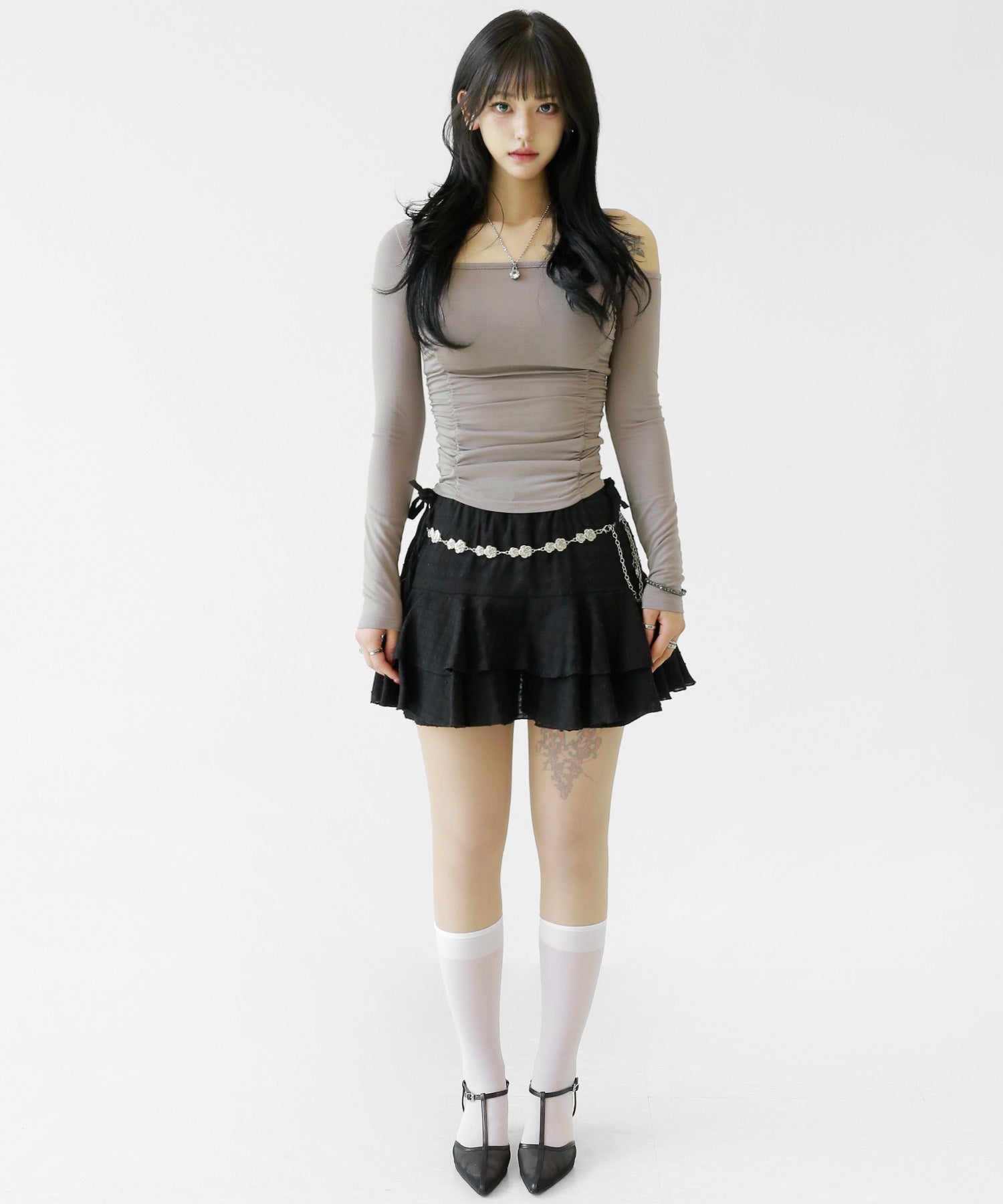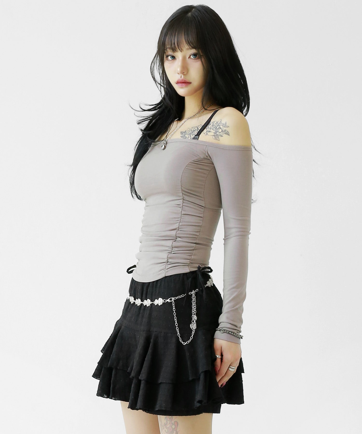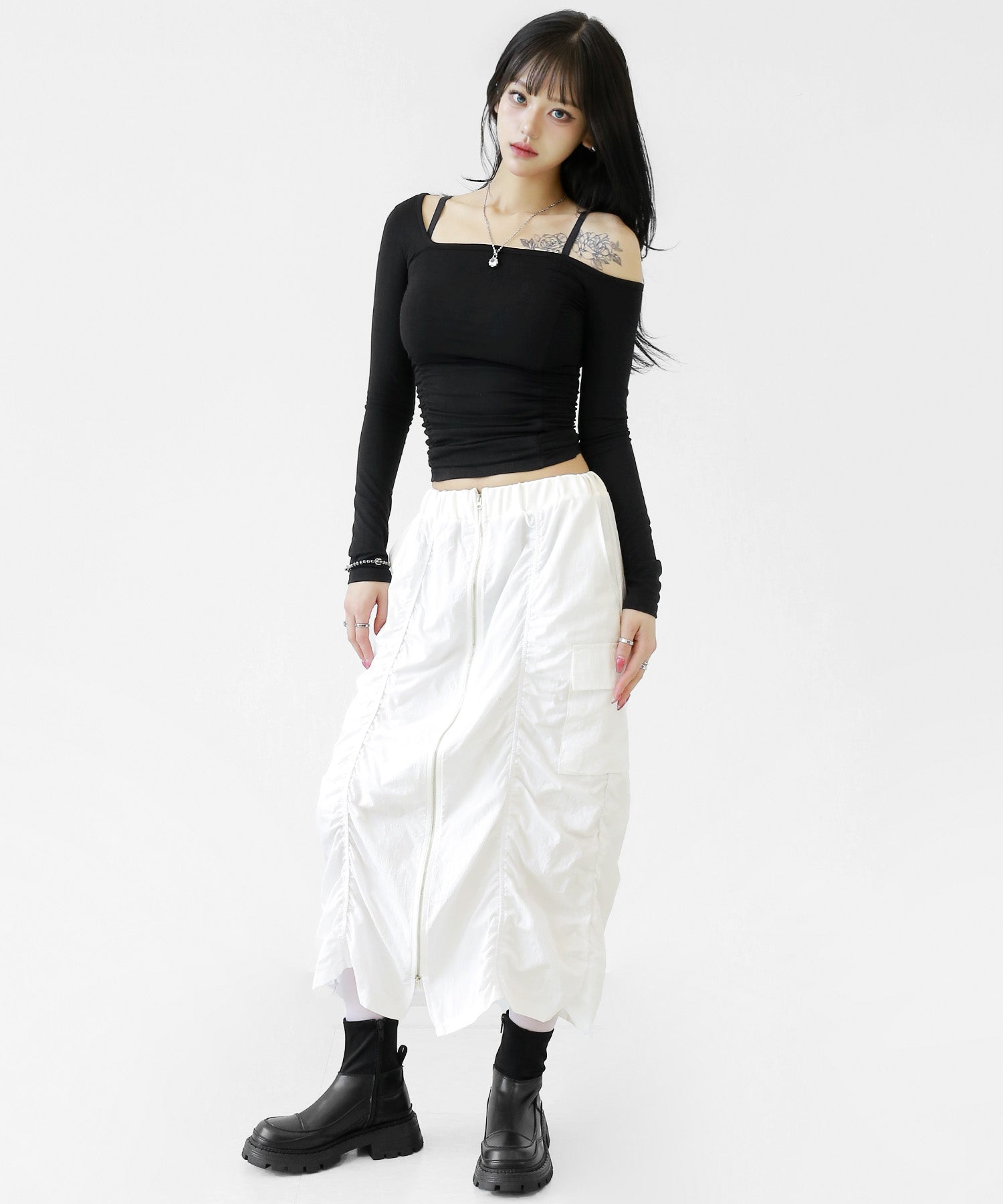 Turn heads with this statement one-shoulder crop top featuring flattering shirring and an unbalanced silhouette. Designed to enhance your shape with a slim fit and cropped cut, it brings that bold "K-Fashion" energy loved by trendsetters in Korea and Japan. Pairs perfectly with denim, cargo pants, or tailored slacks for a fashion-forward look