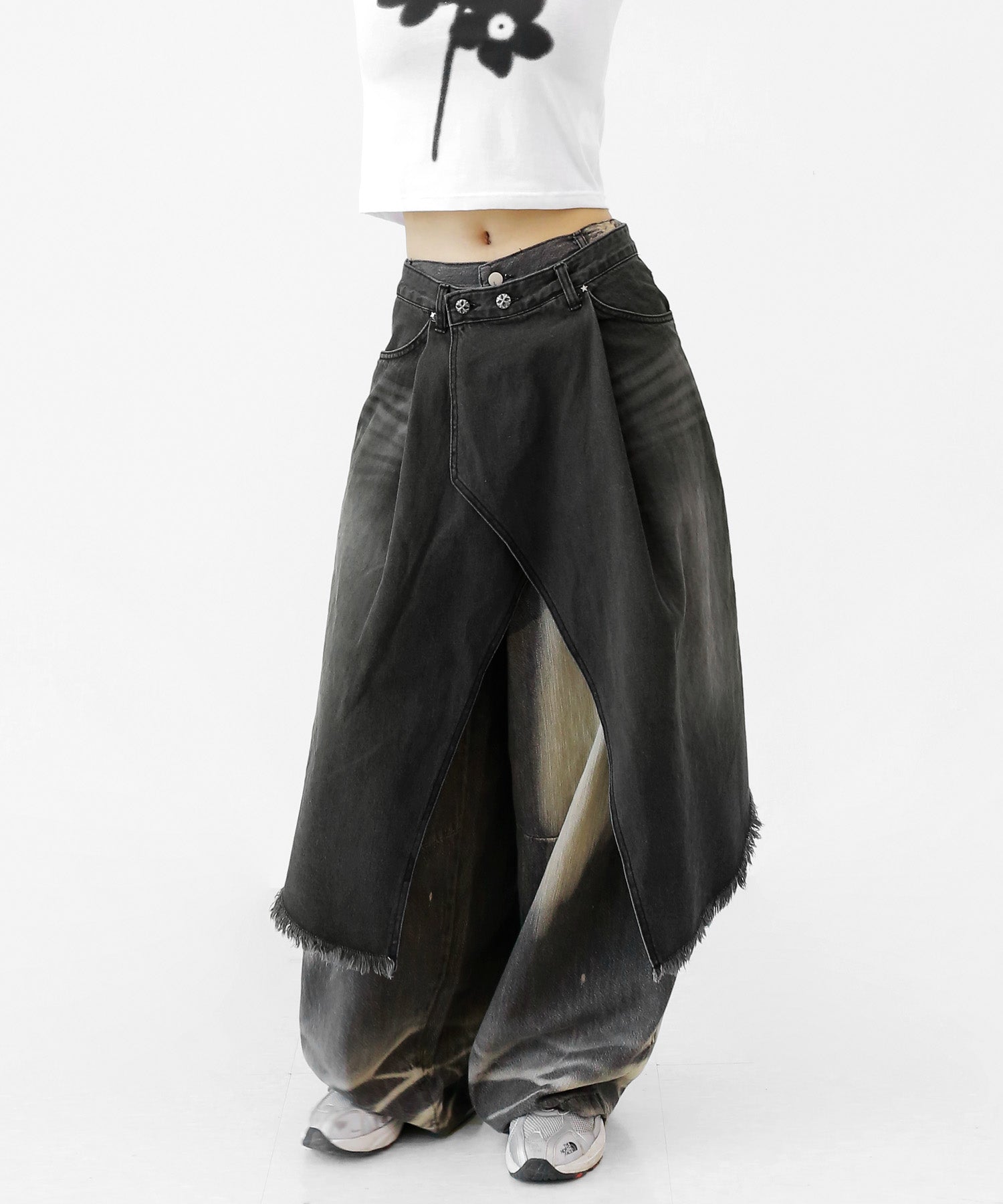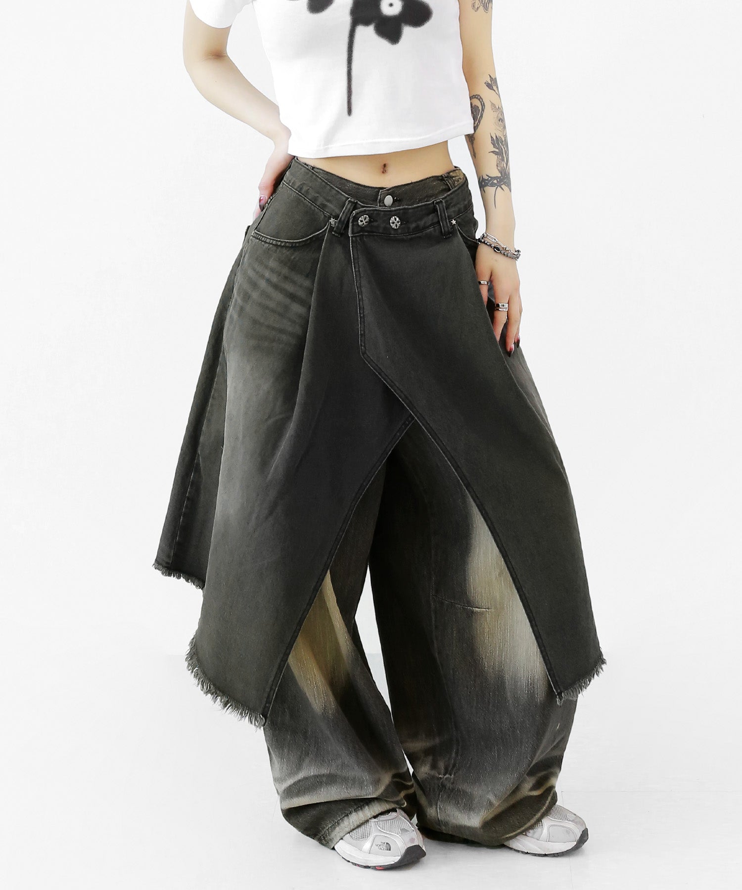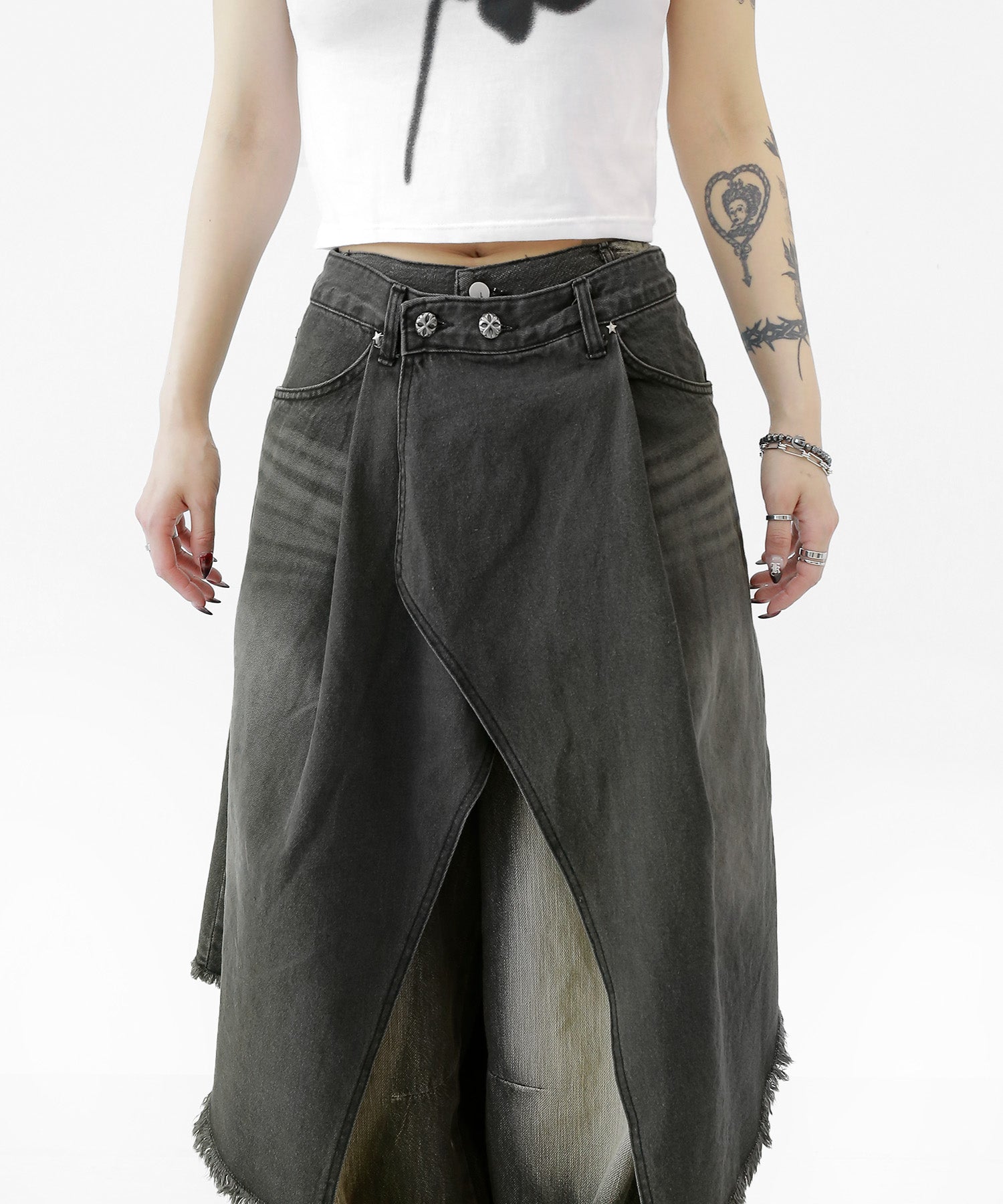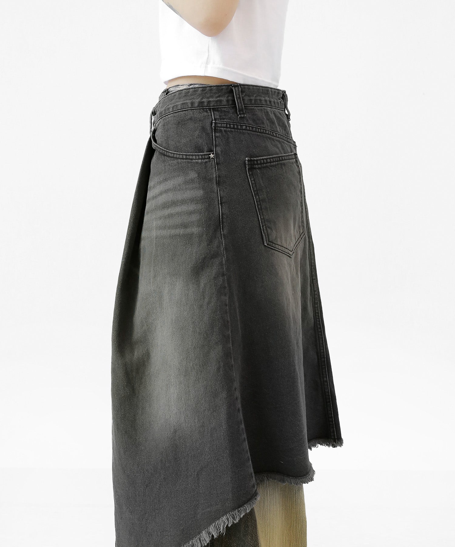 This asymmetrical wrap denim skirt brings a bold twist to a classic silhouette. With a 3-step adjustable waist and structured cotton denim, it’s designed for standout streetwear looks.