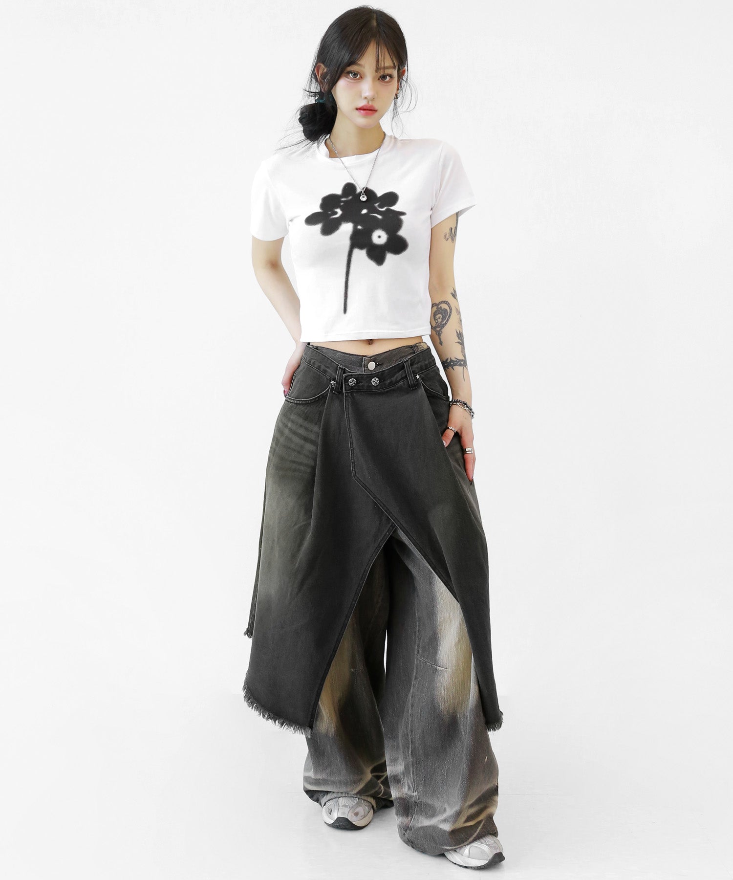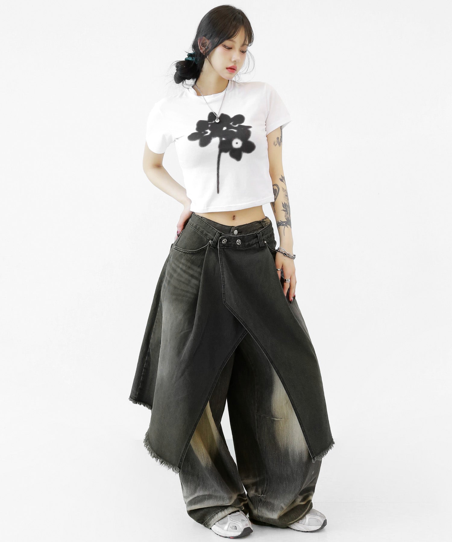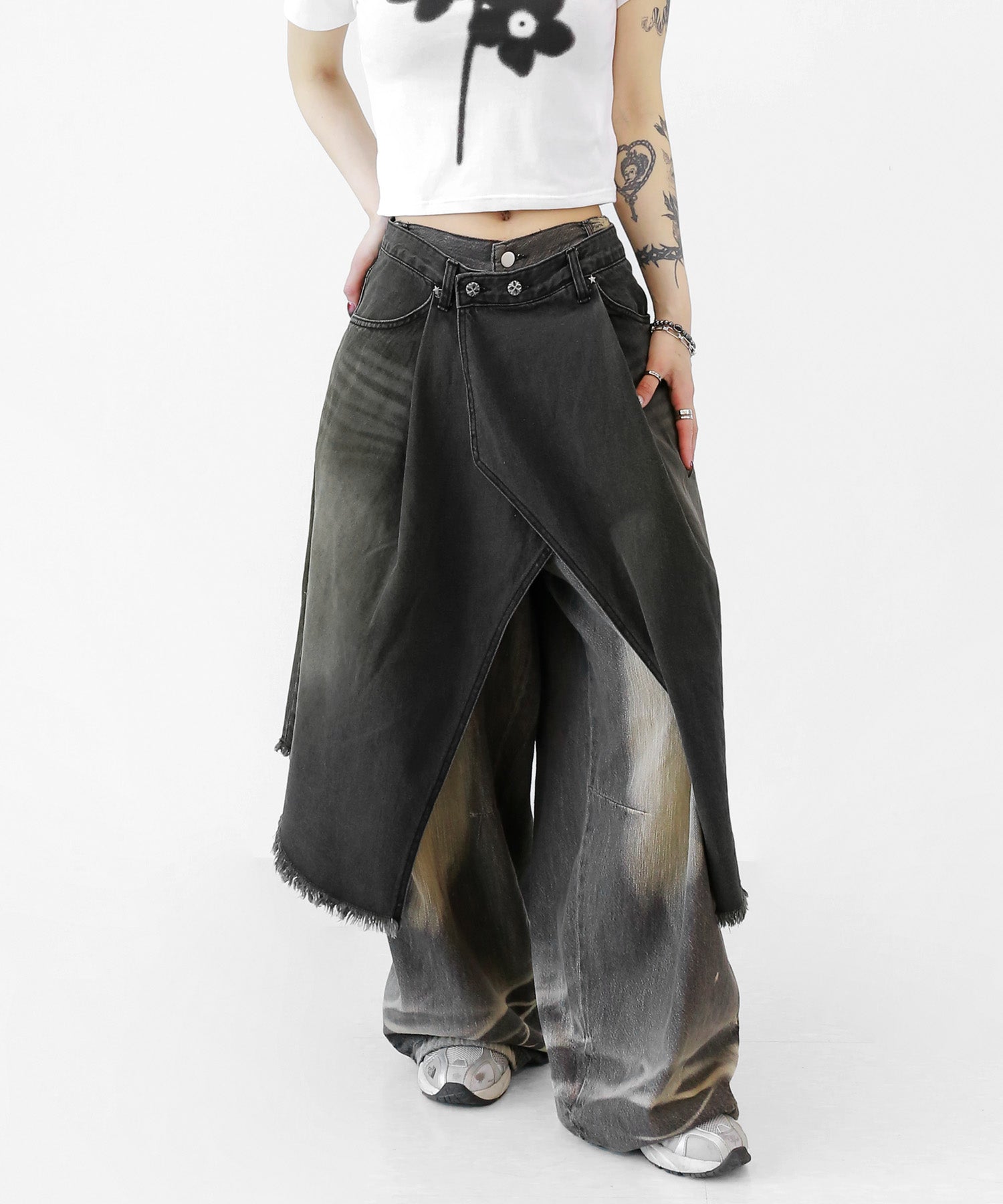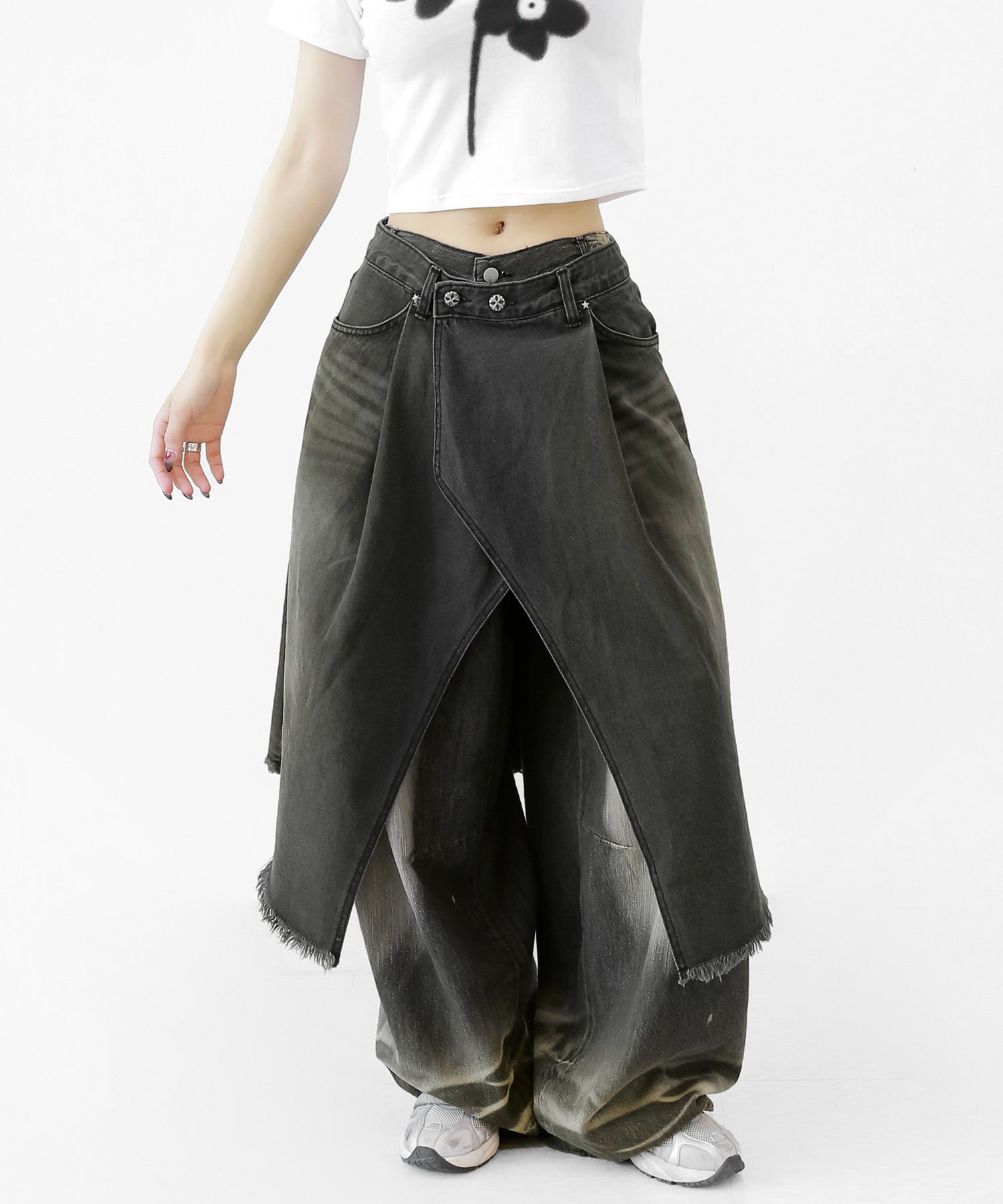 This asymmetrical wrap denim skirt brings a bold twist to a classic silhouette. With a 3-step adjustable waist and structured cotton denim, it’s designed for standout streetwear looks.