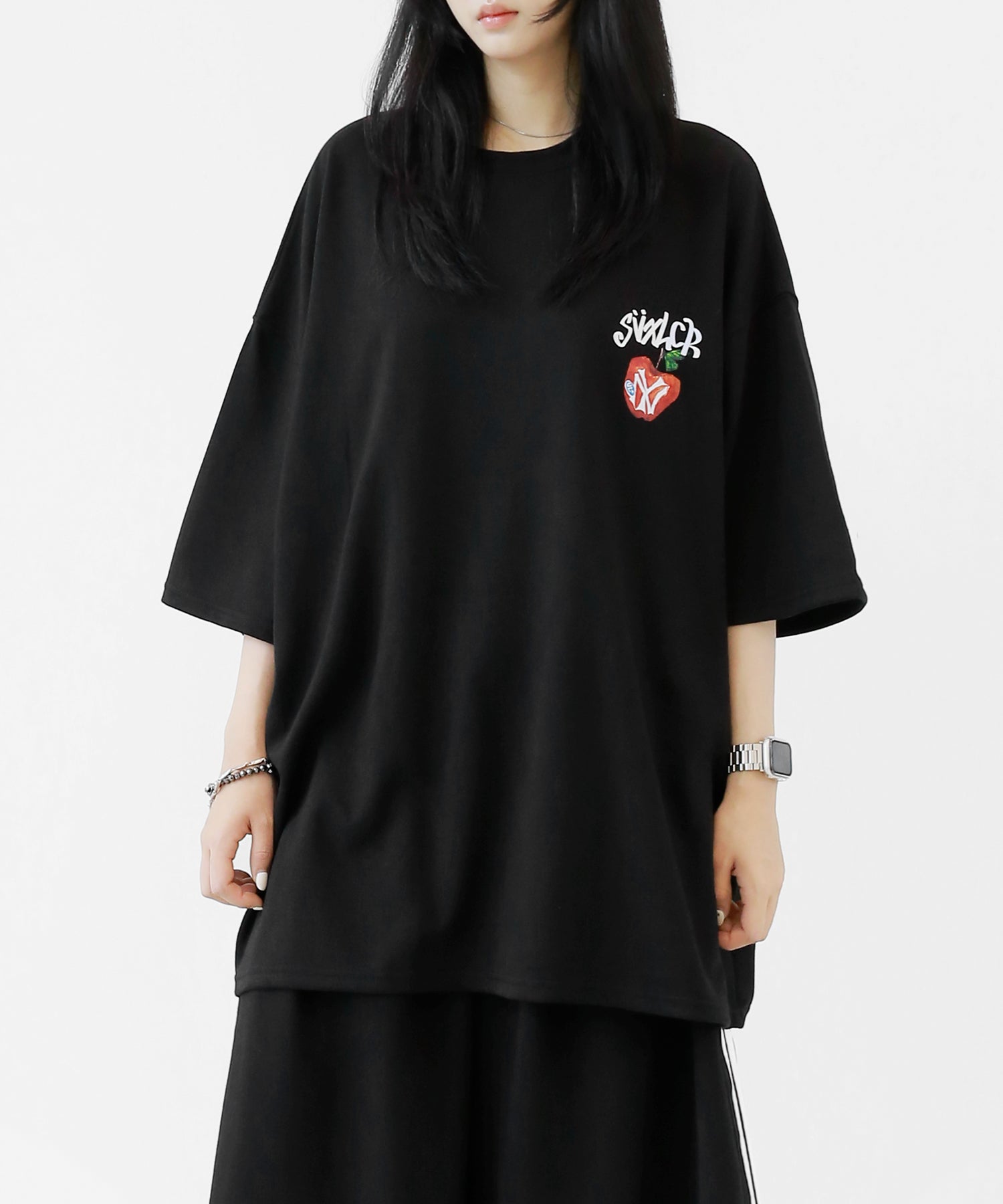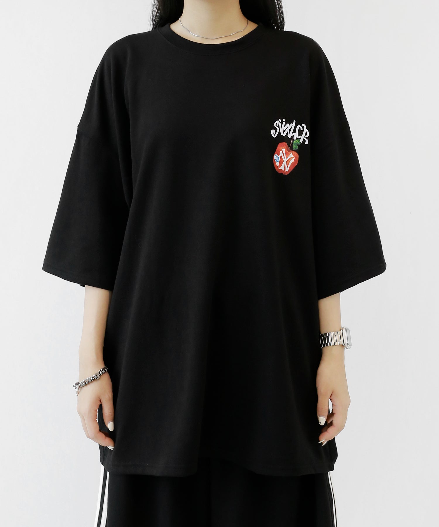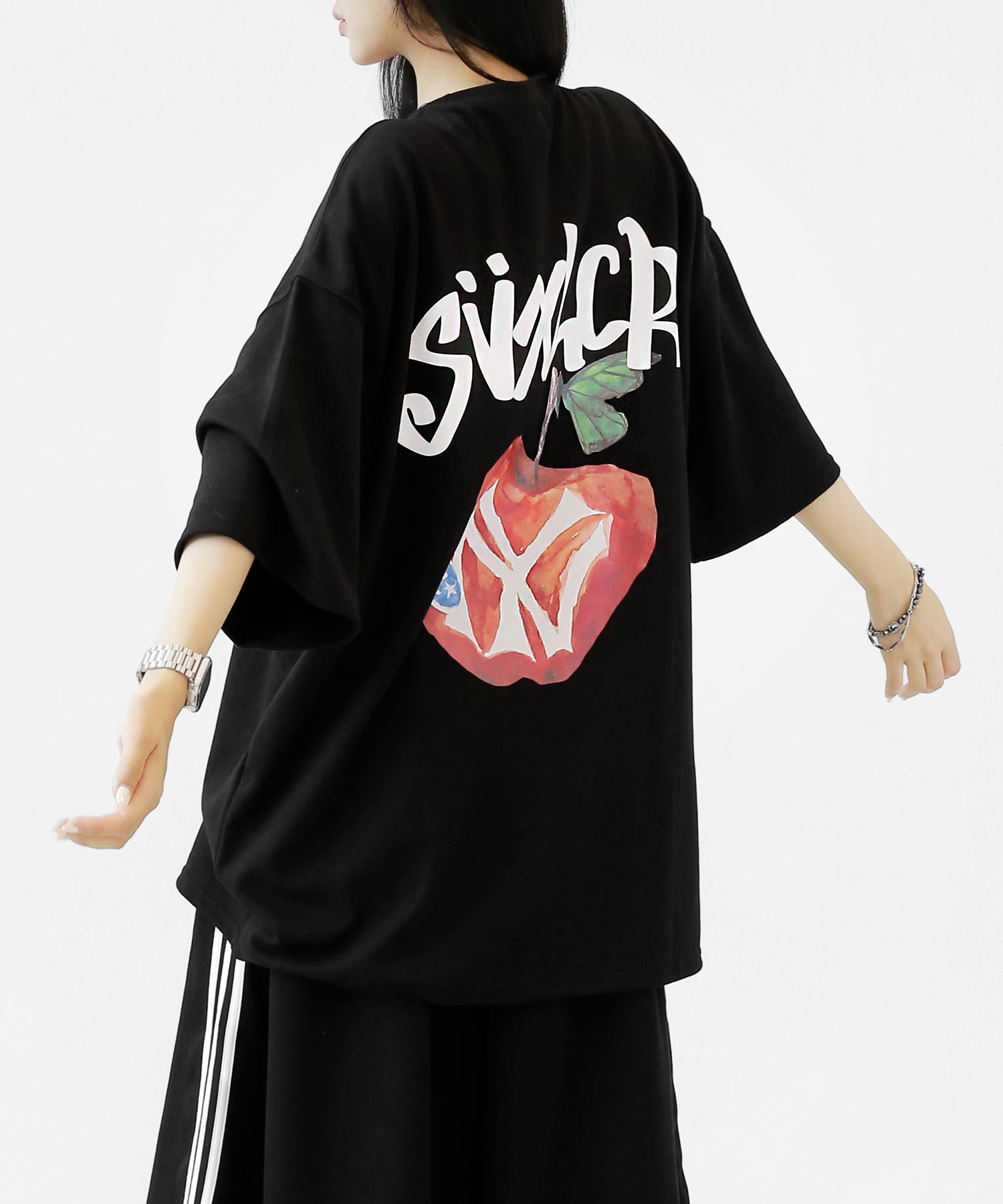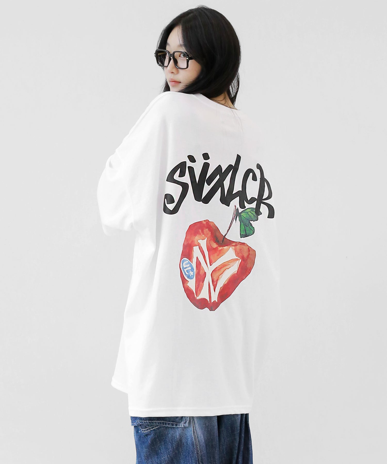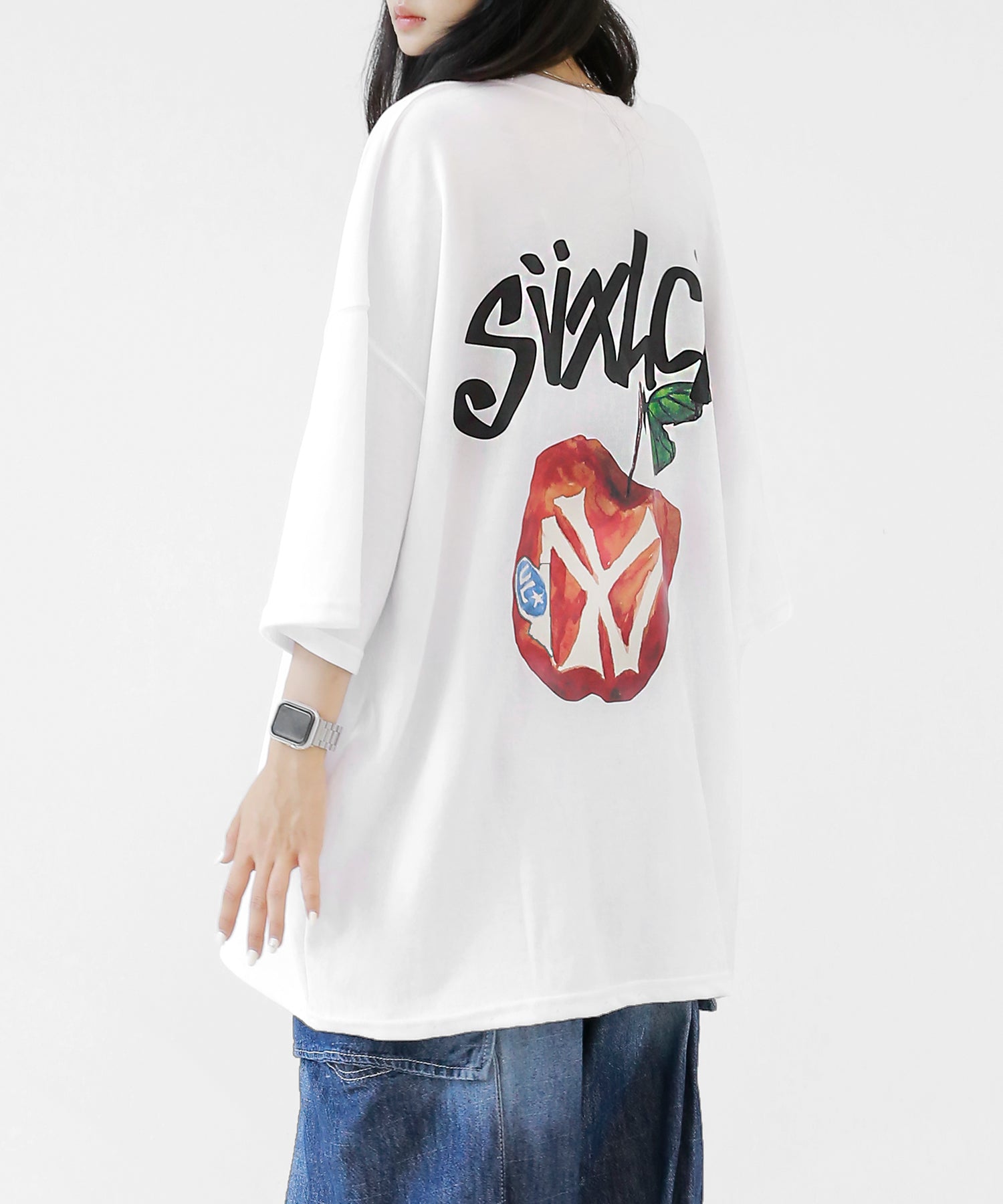 A bold apple graphic makes a statement on the back, while a matching chest logo adds a playful touch. This oversized T-shirt blends American vintage vibes with casual cool, making it the centerpiece of any outfit.