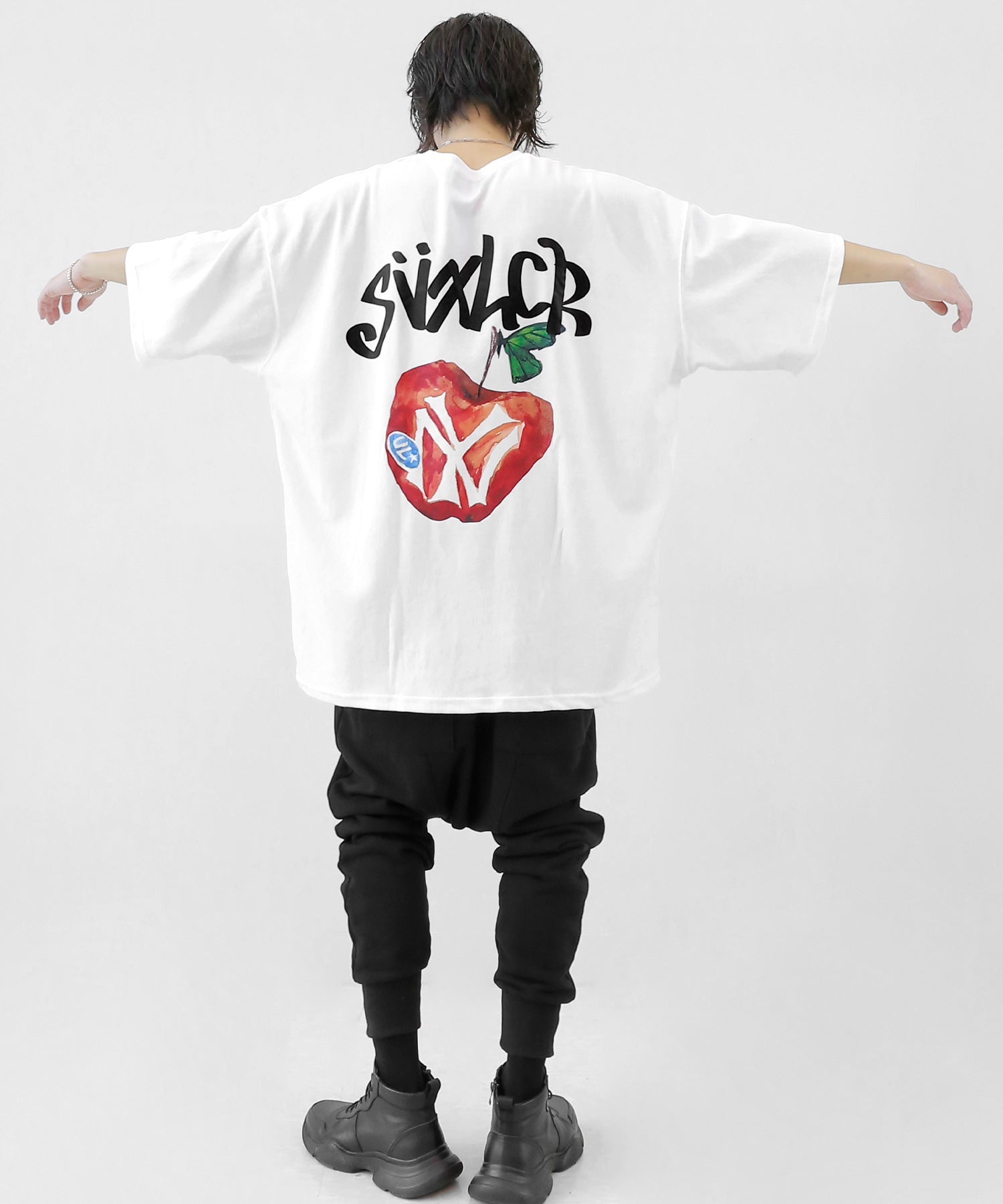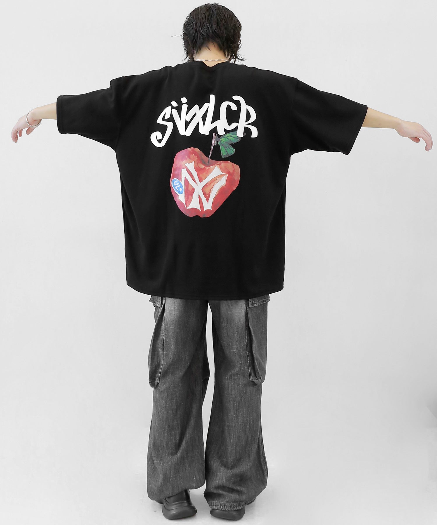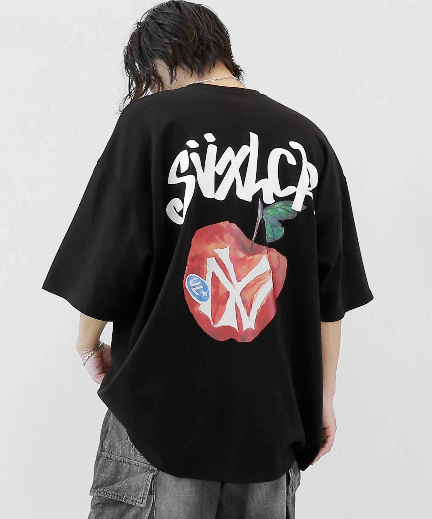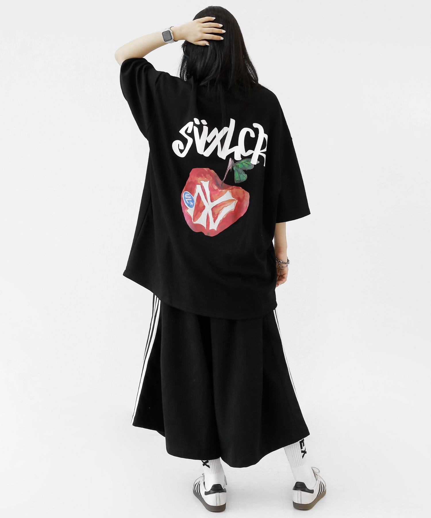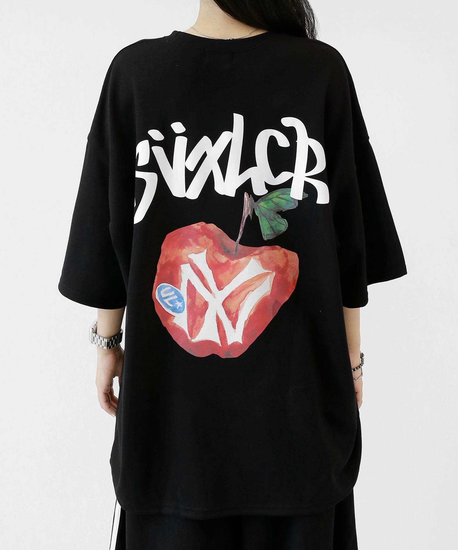 A bold apple graphic makes a statement on the back, while a matching chest logo adds a playful touch. This oversized T-shirt blends American vintage vibes with casual cool, making it the centerpiece of any outfit.