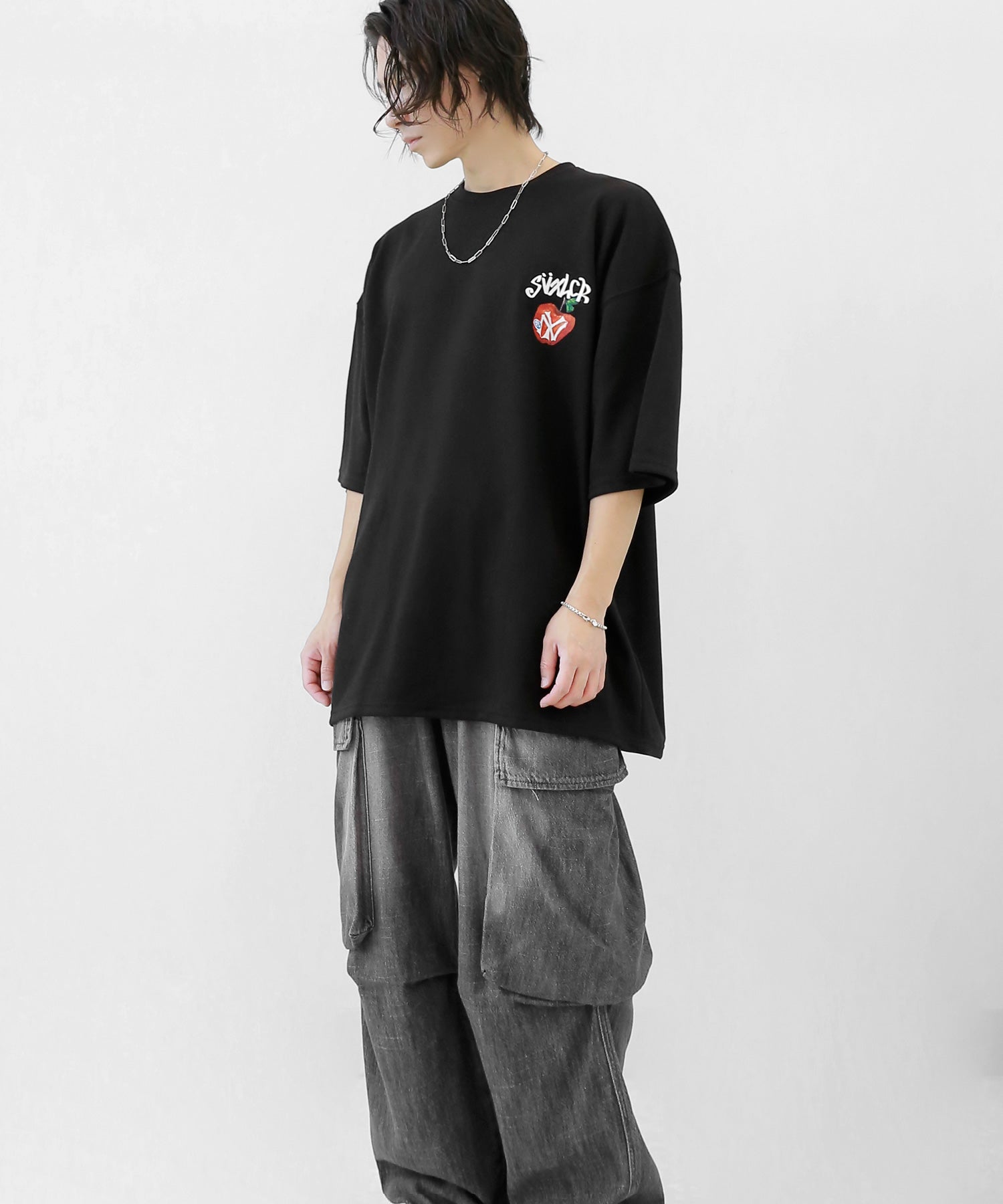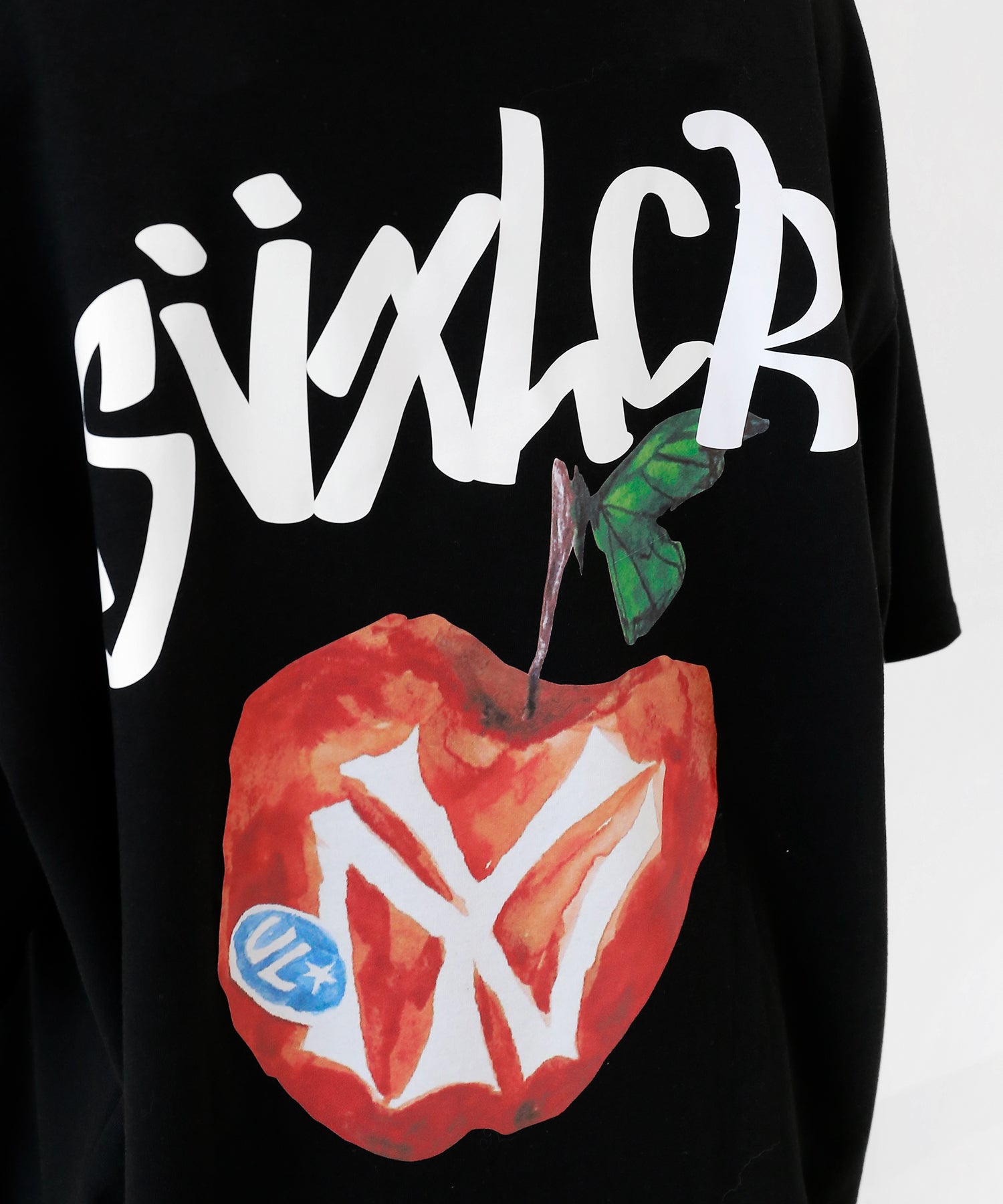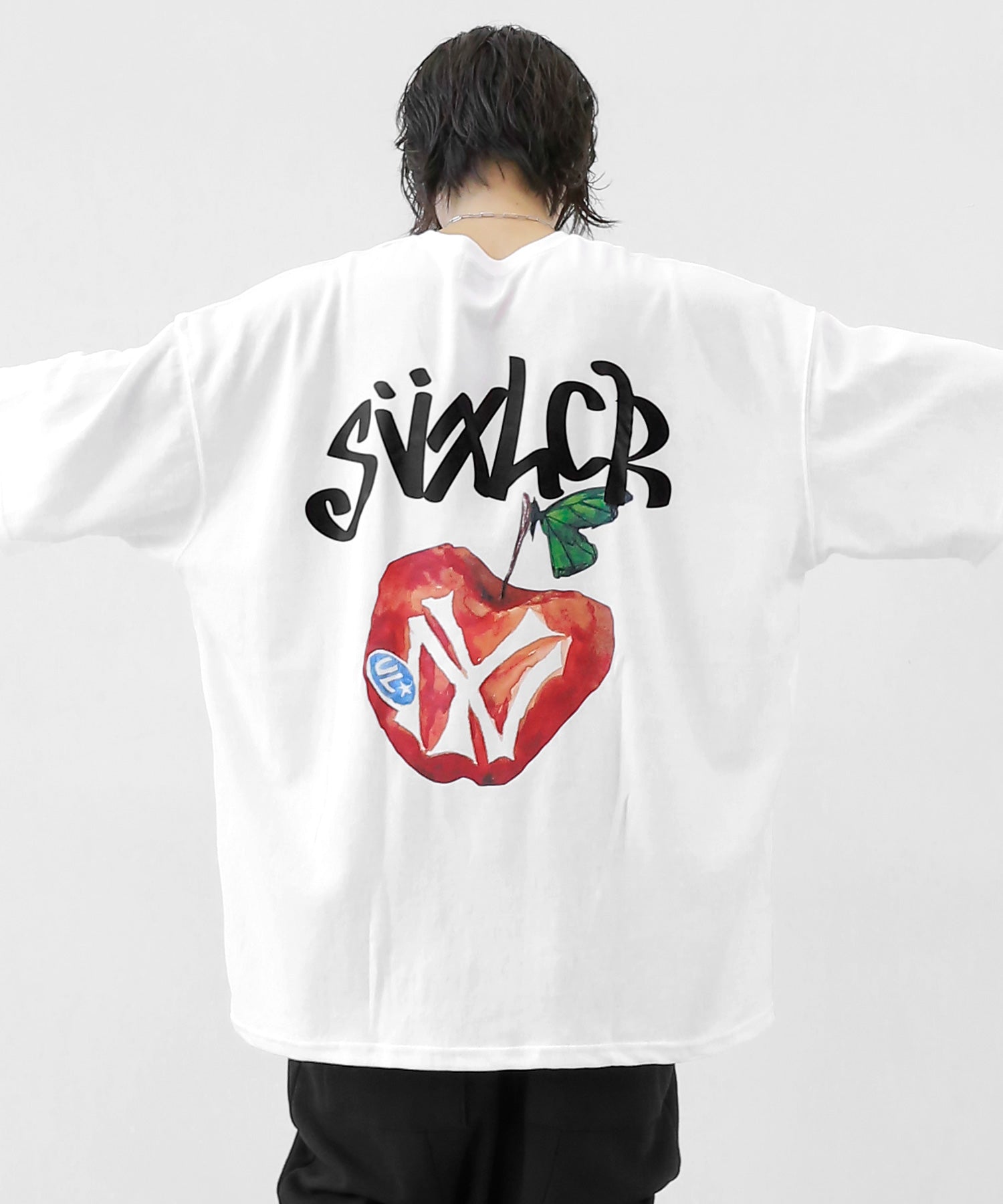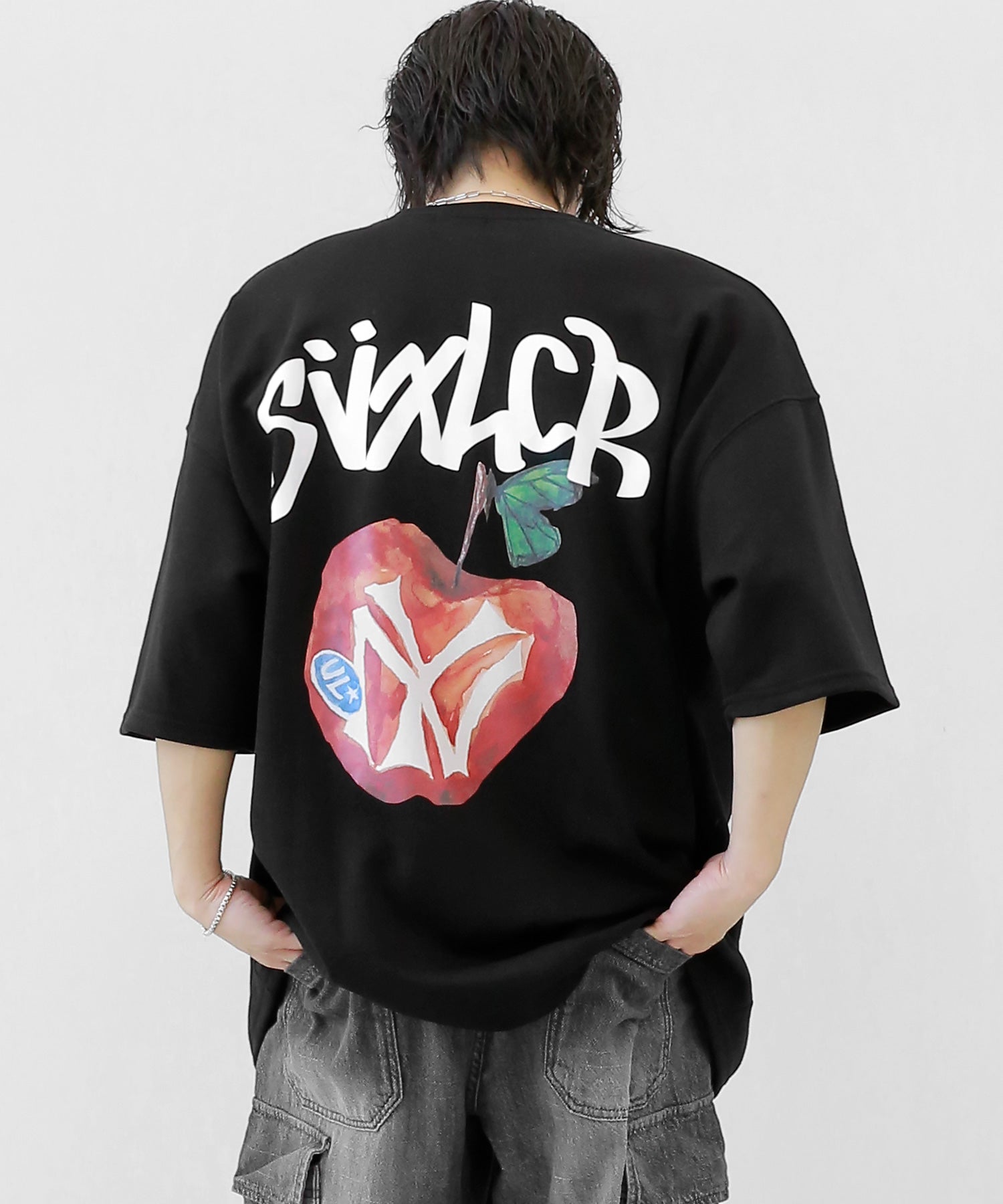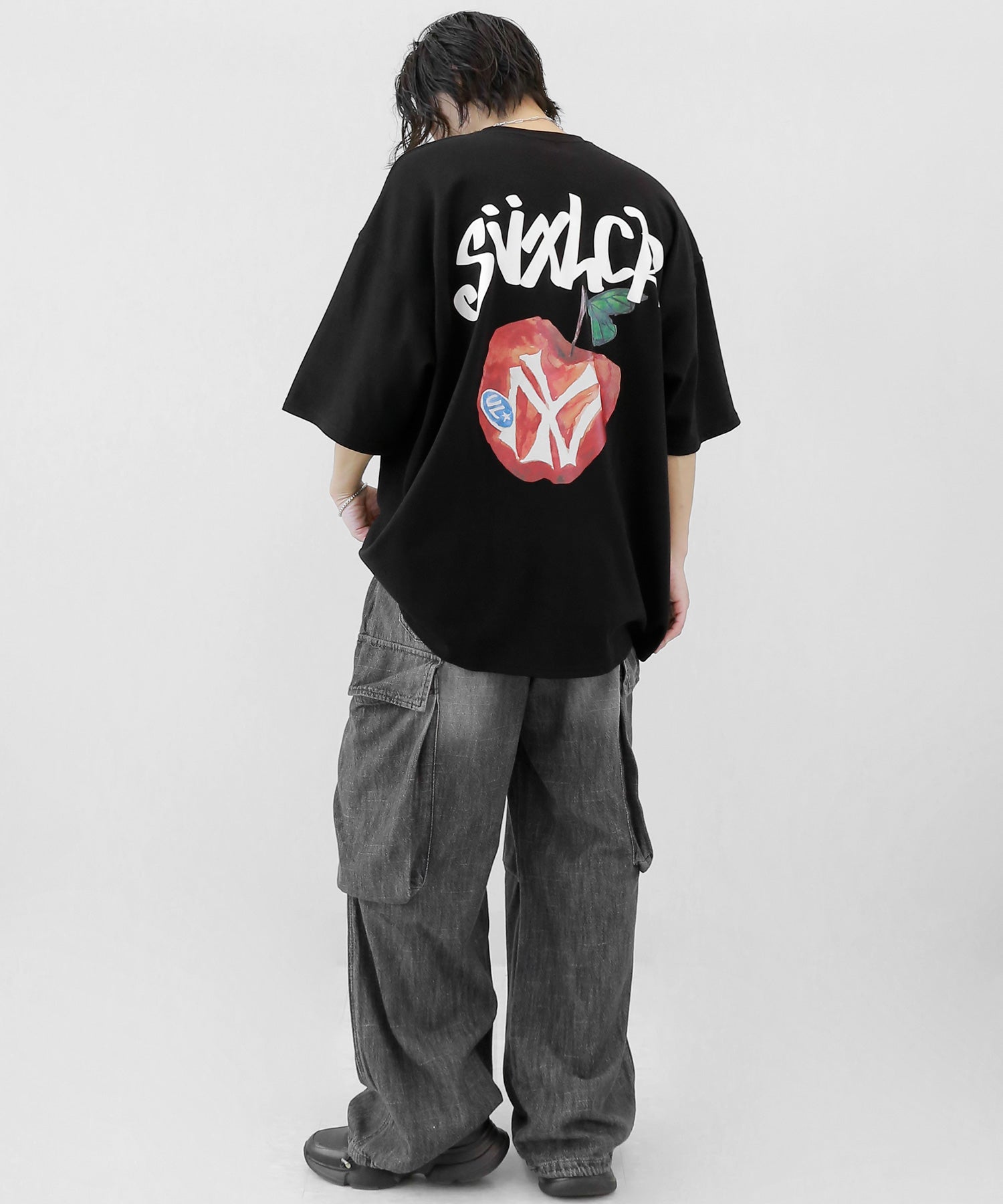 A bold apple graphic makes a statement on the back, while a matching chest logo adds a playful touch. This oversized T-shirt blends American vintage vibes with casual cool, making it the centerpiece of any outfit.