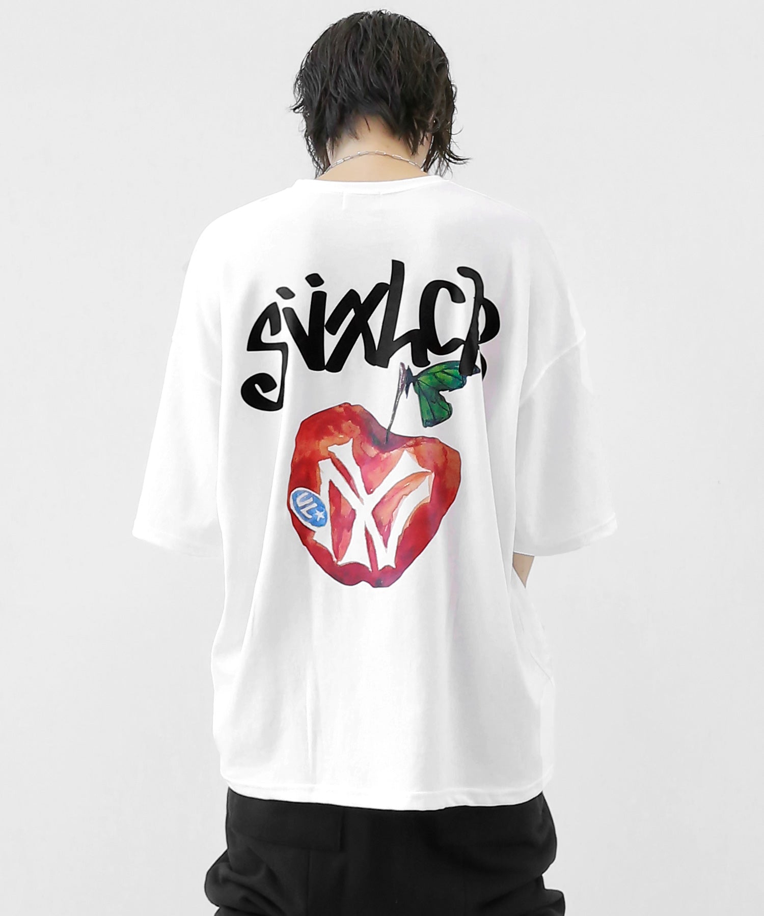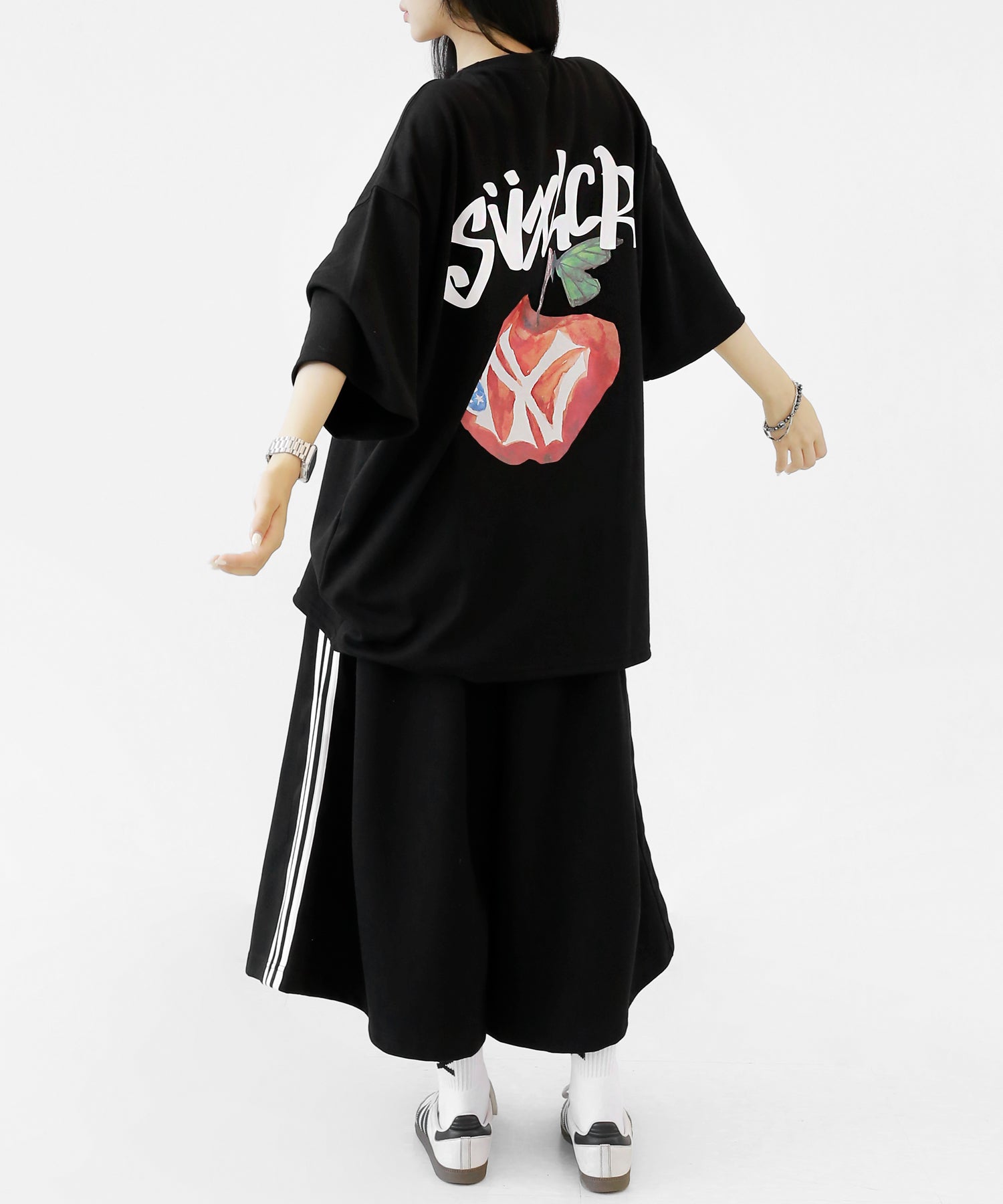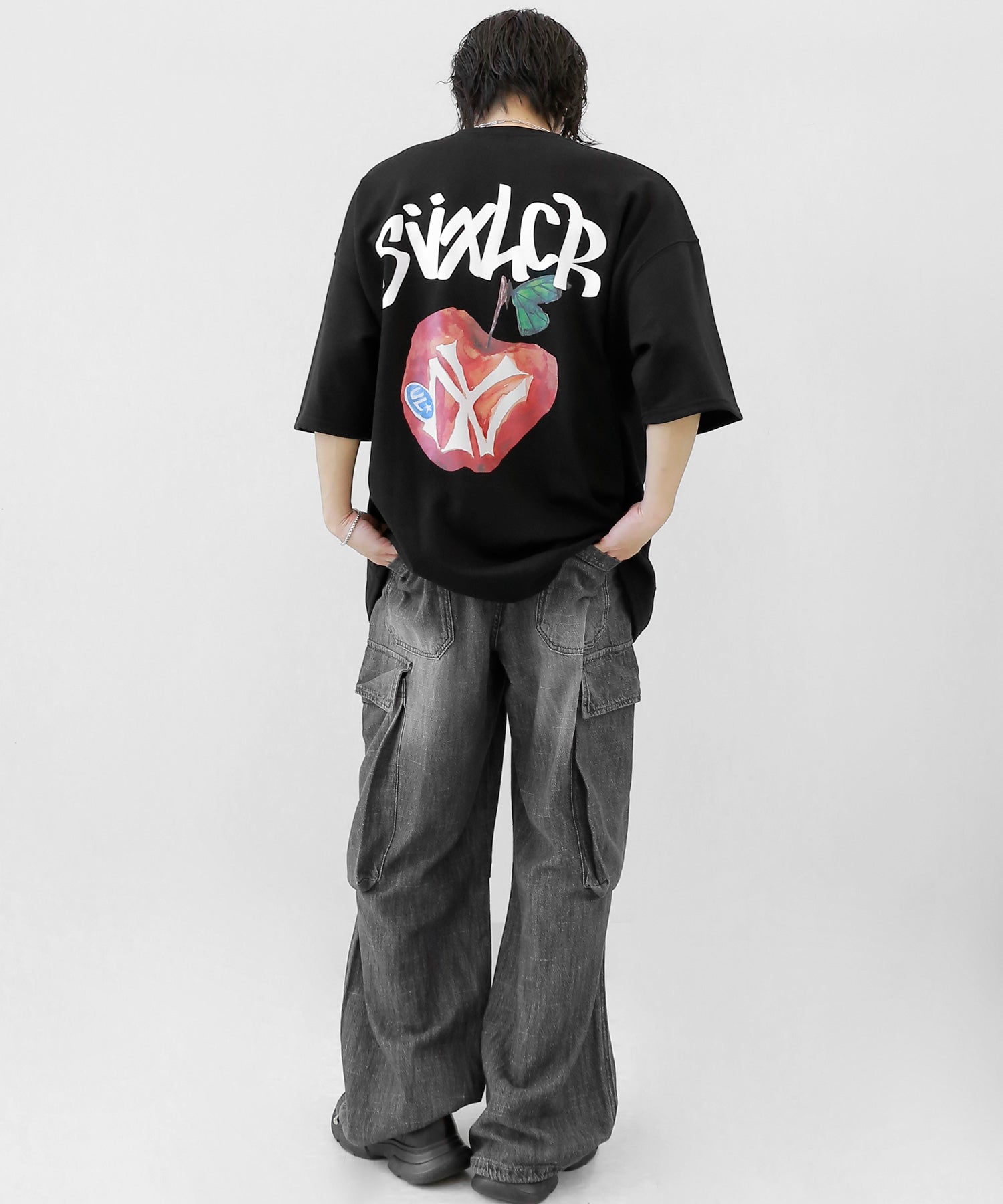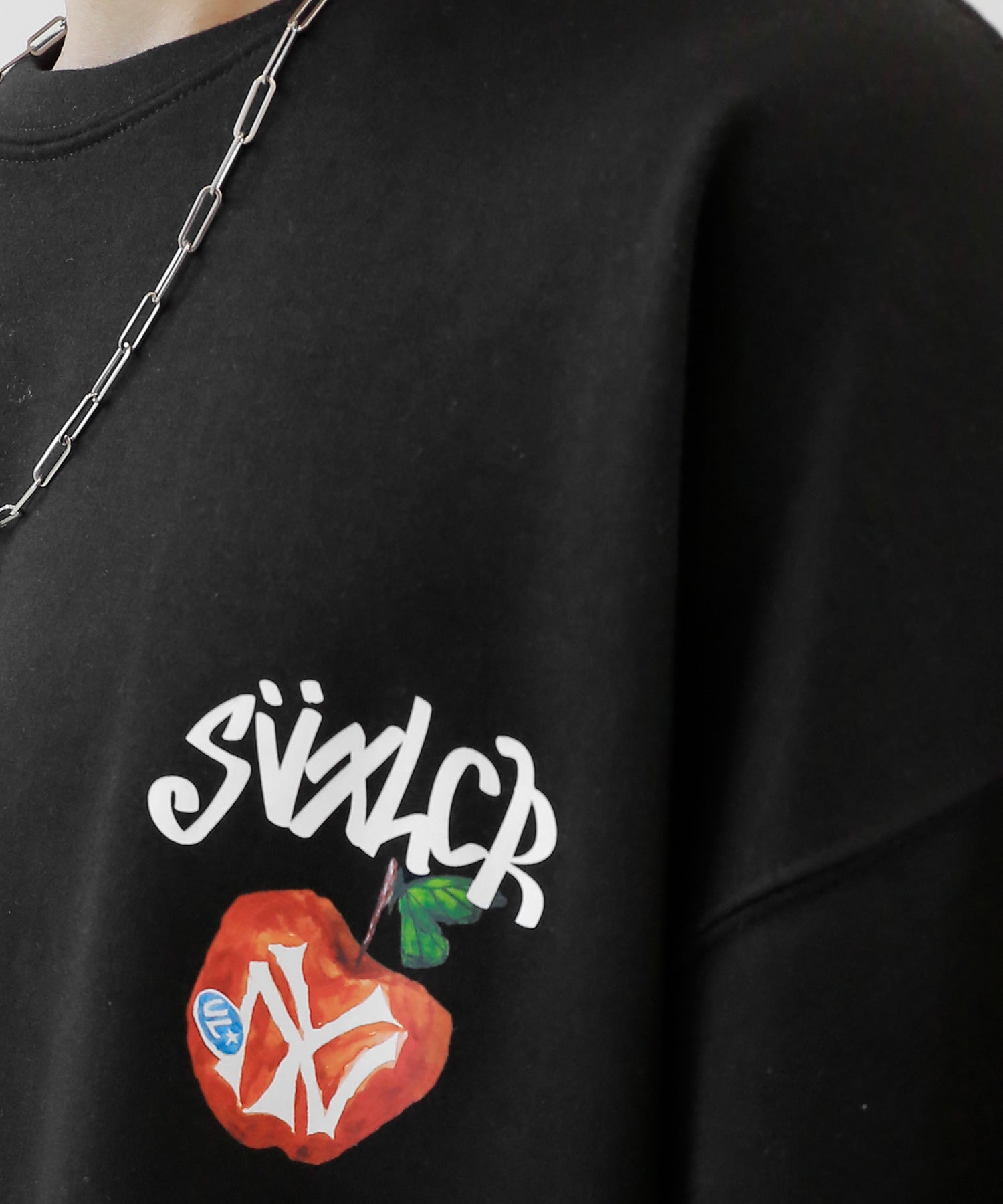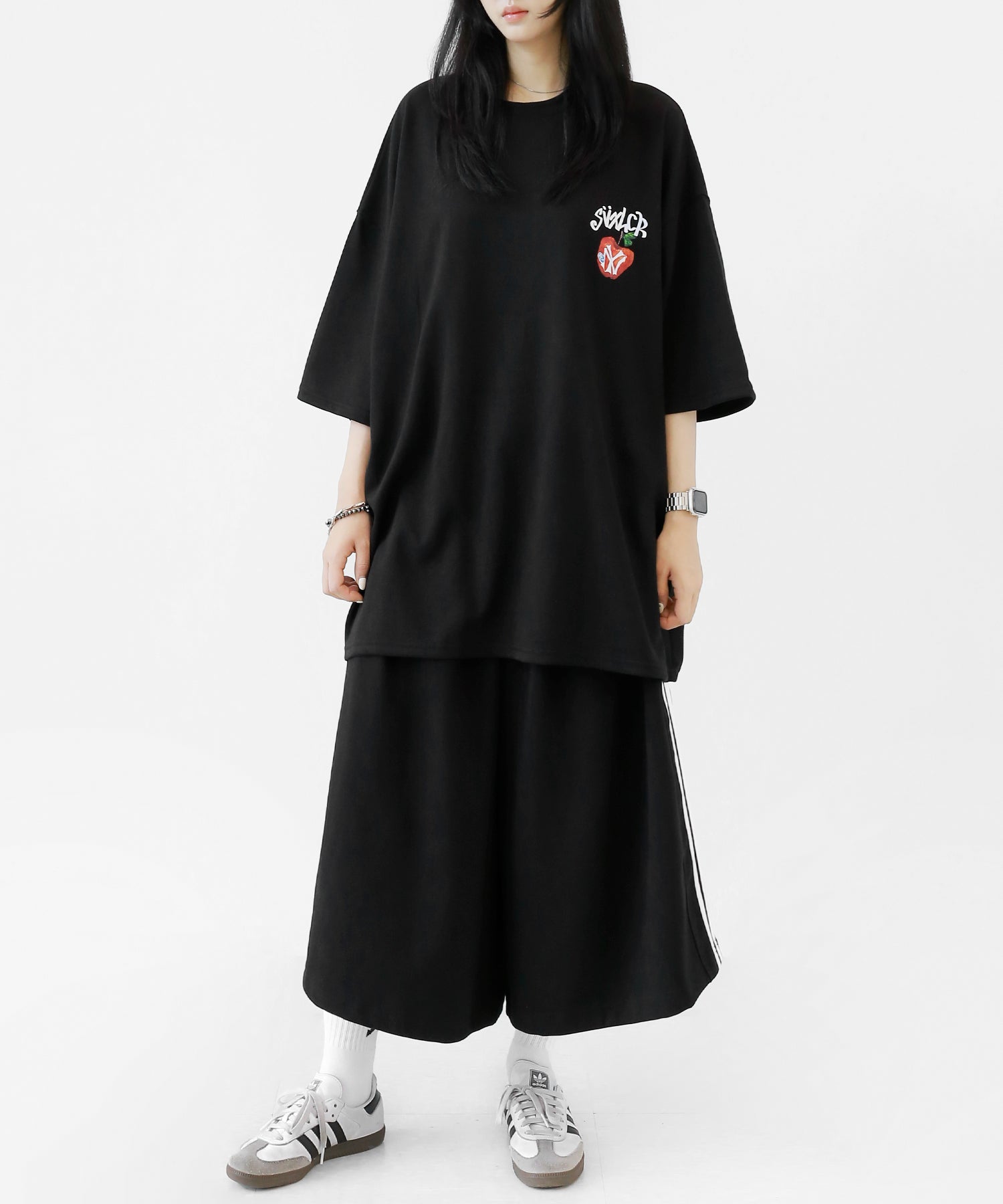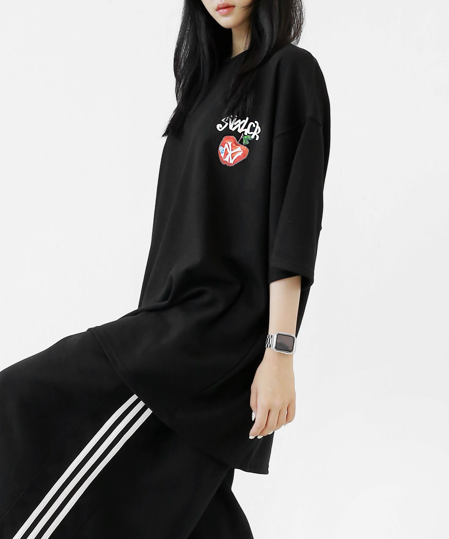 A bold apple graphic makes a statement on the back, while a matching chest logo adds a playful touch. This oversized T-shirt blends American vintage vibes with casual cool, making it the centerpiece of any outfit.