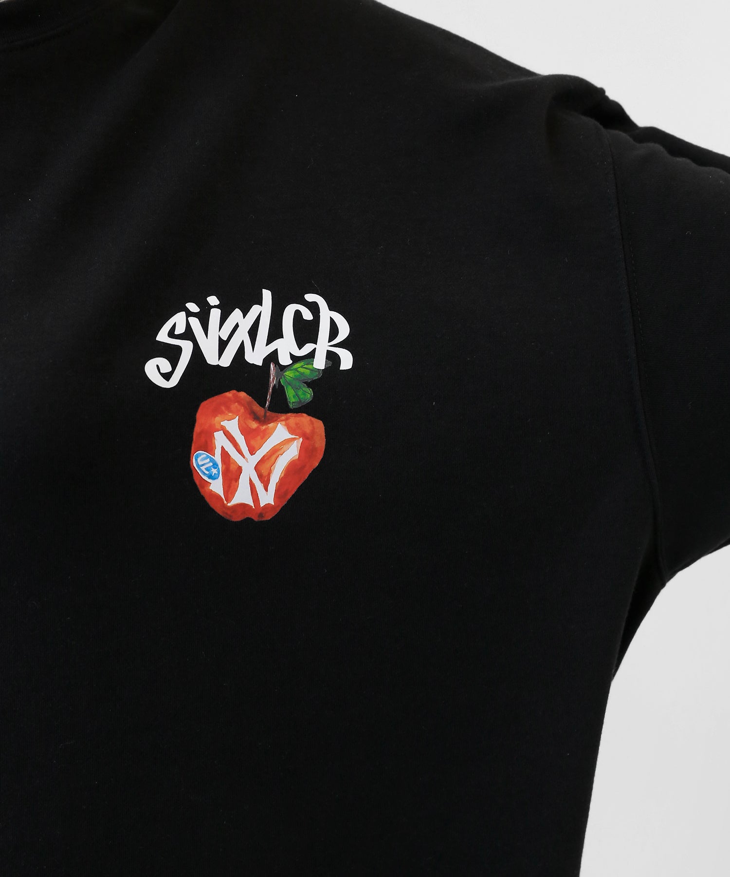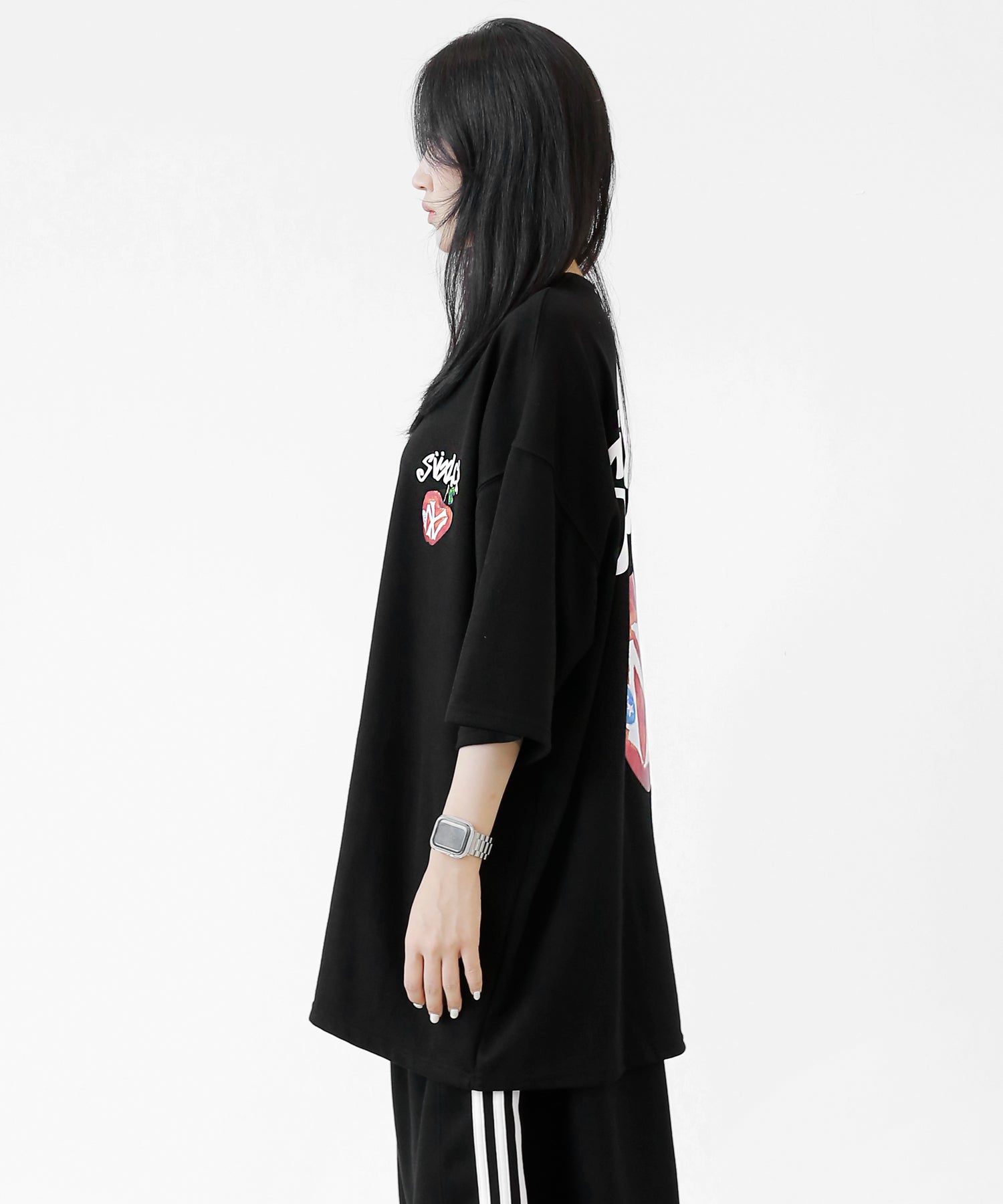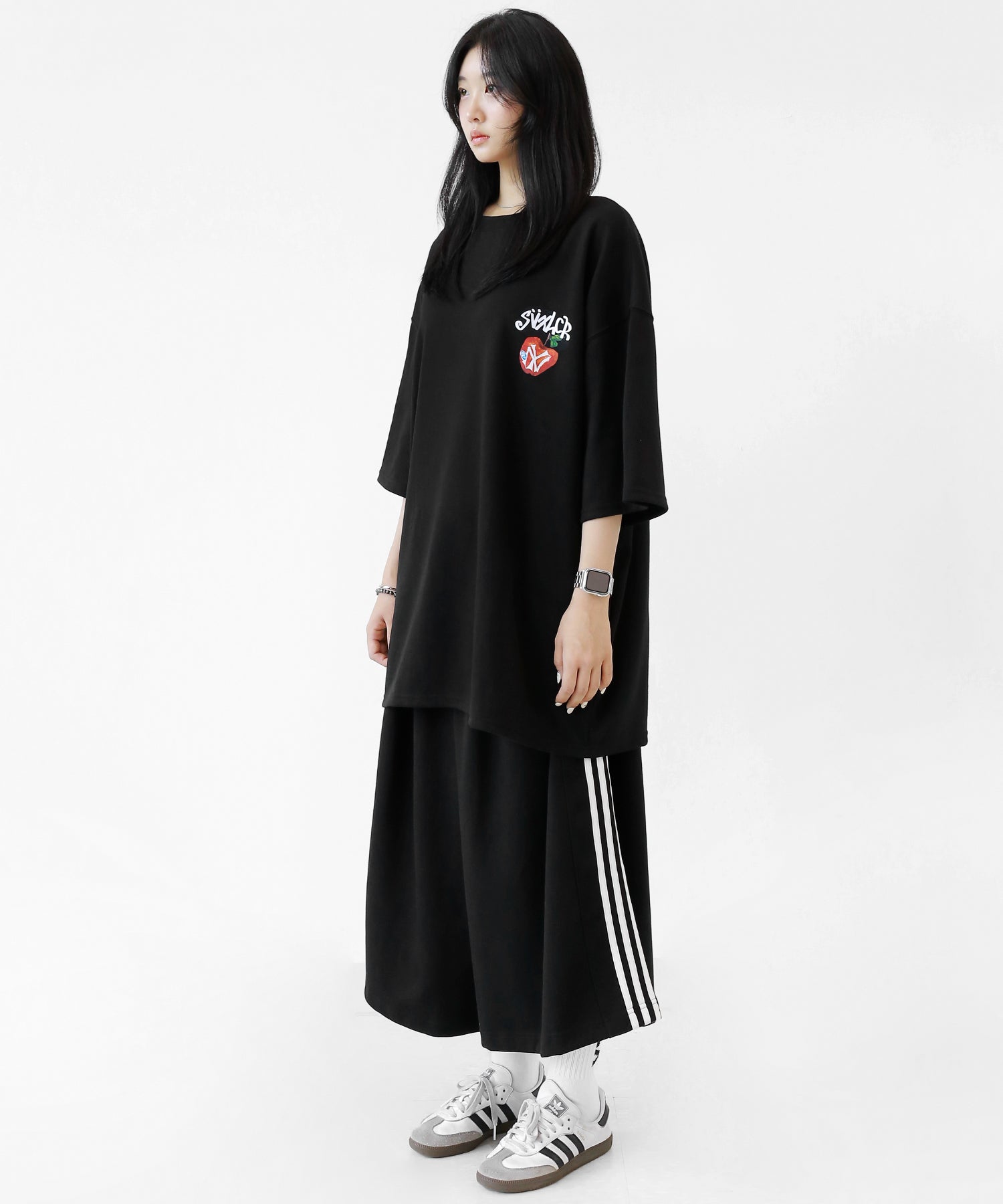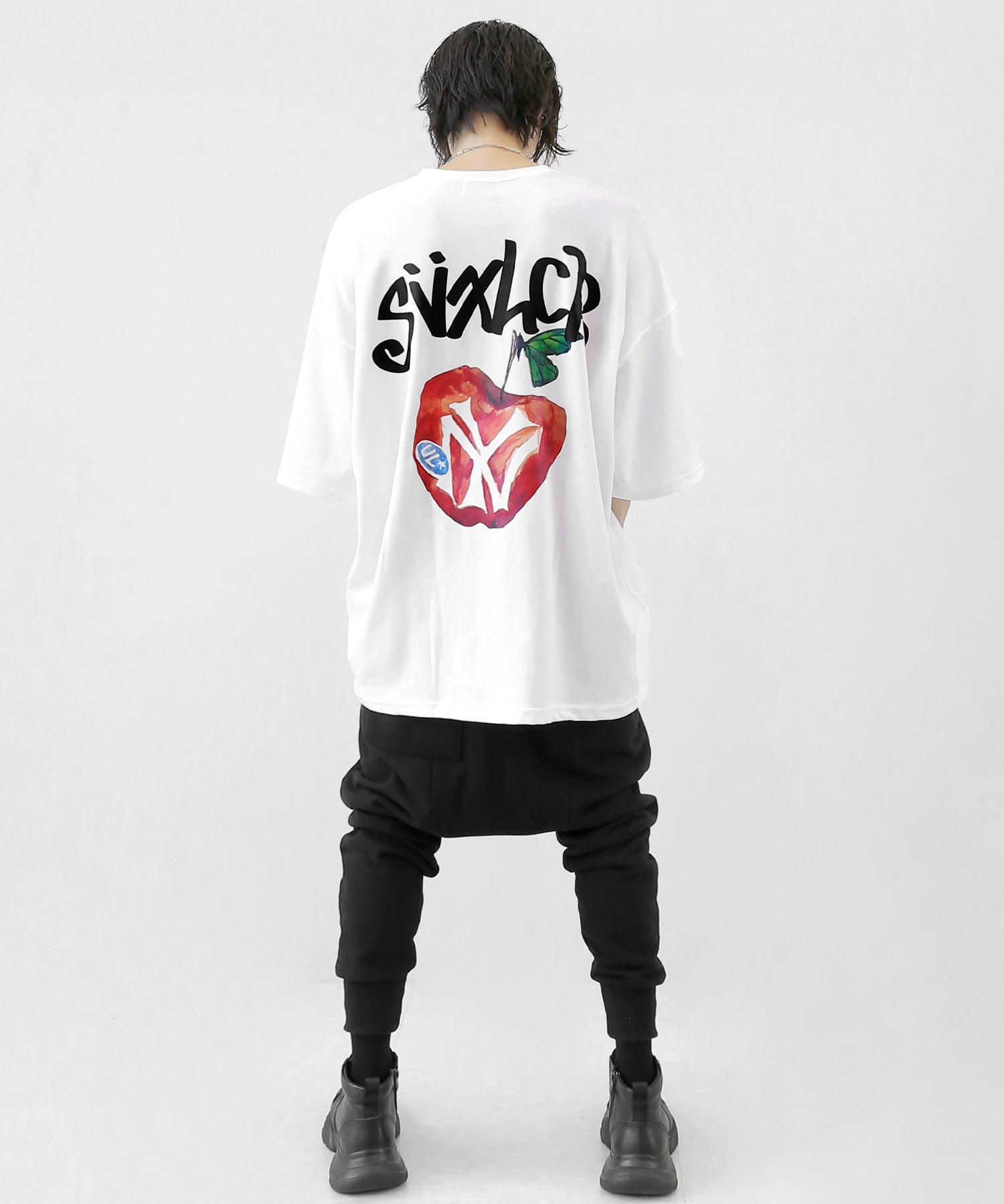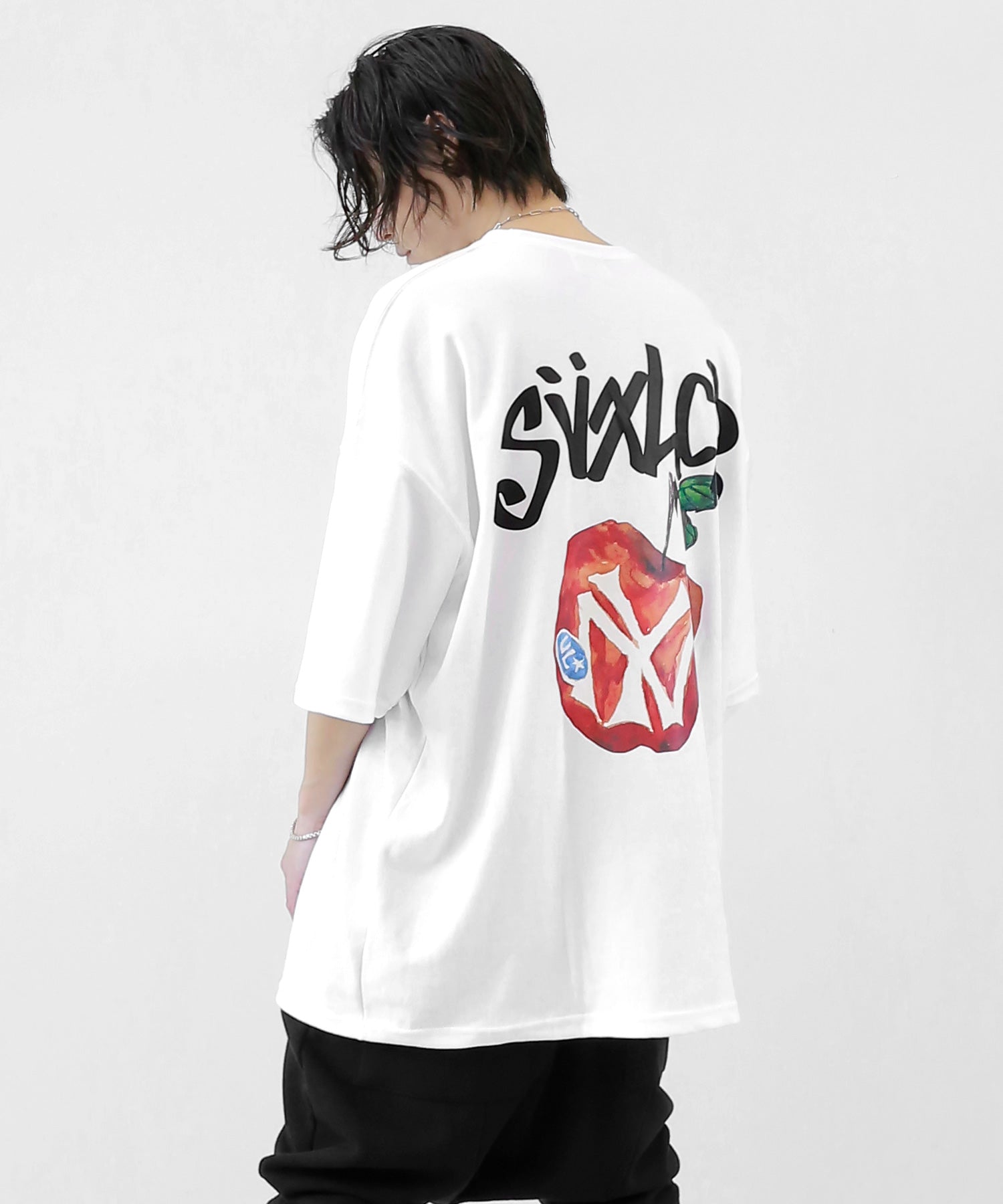 A bold apple graphic makes a statement on the back, while a matching chest logo adds a playful touch. This oversized T-shirt blends American vintage vibes with casual cool, making it the centerpiece of any outfit.