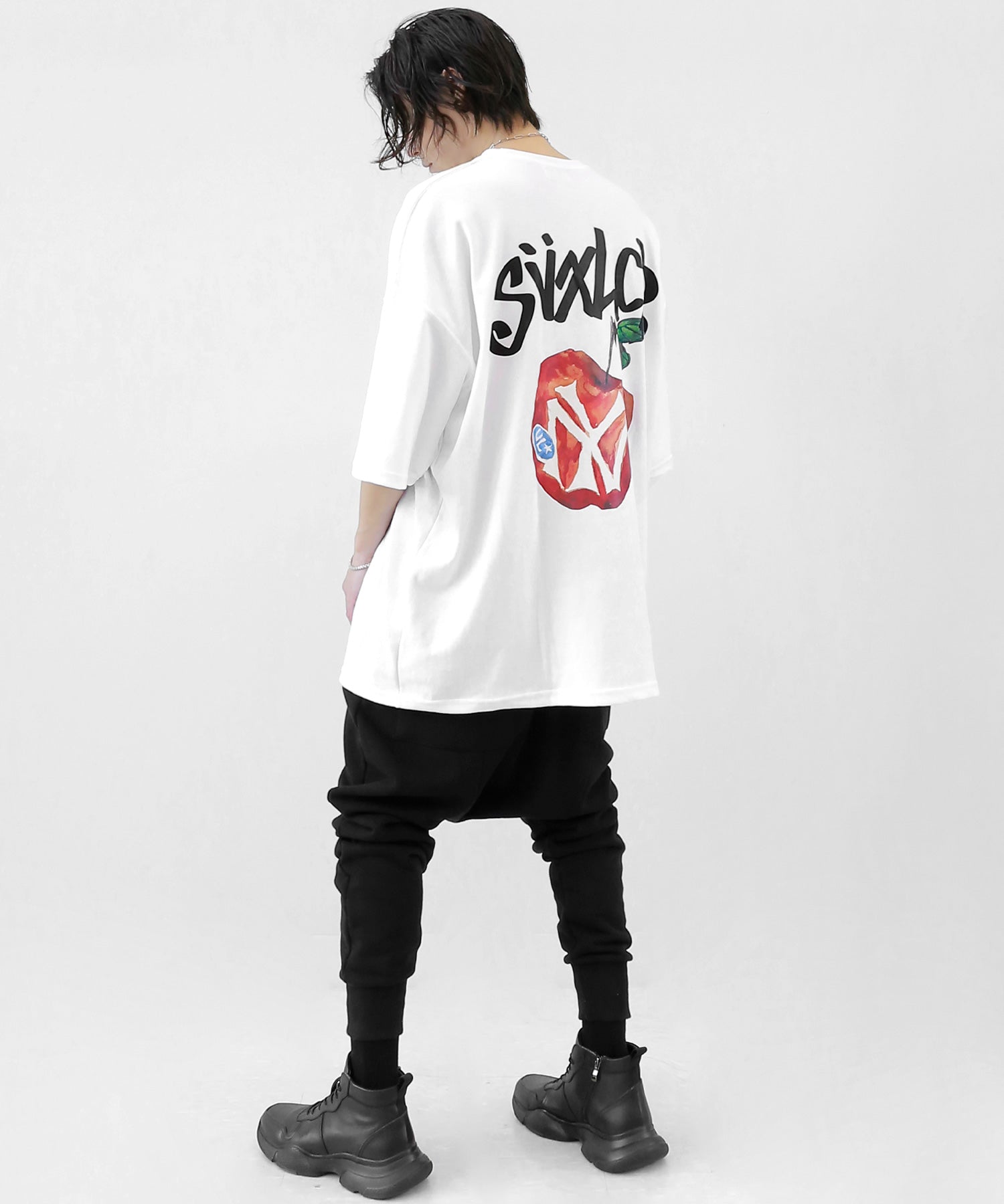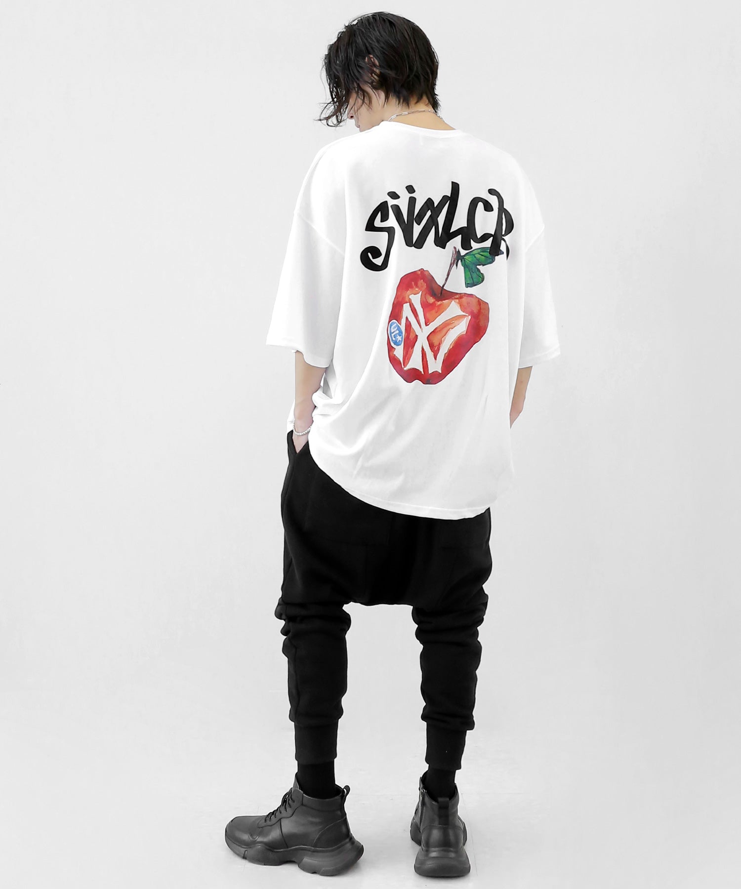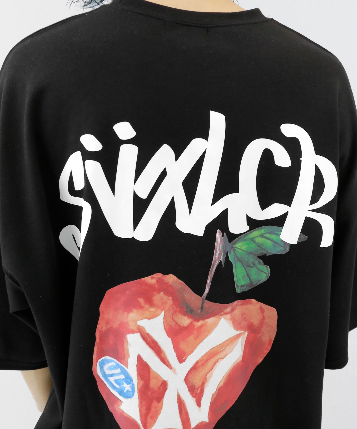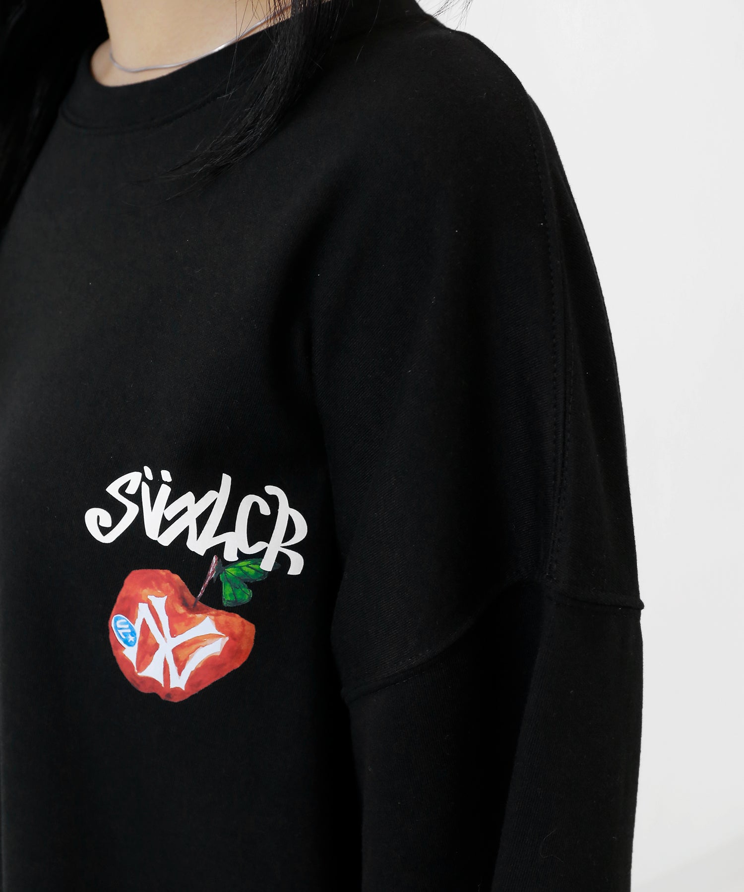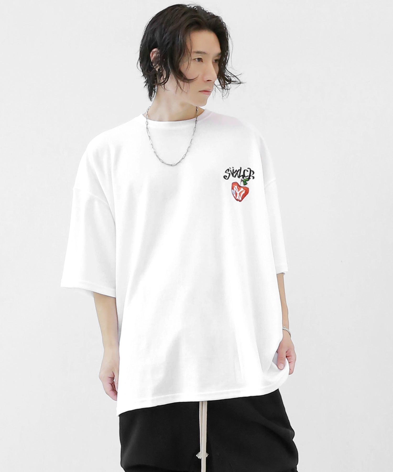 A bold apple graphic makes a statement on the back, while a matching chest logo adds a playful touch. This oversized T-shirt blends American vintage vibes with casual cool, making it the centerpiece of any outfit.