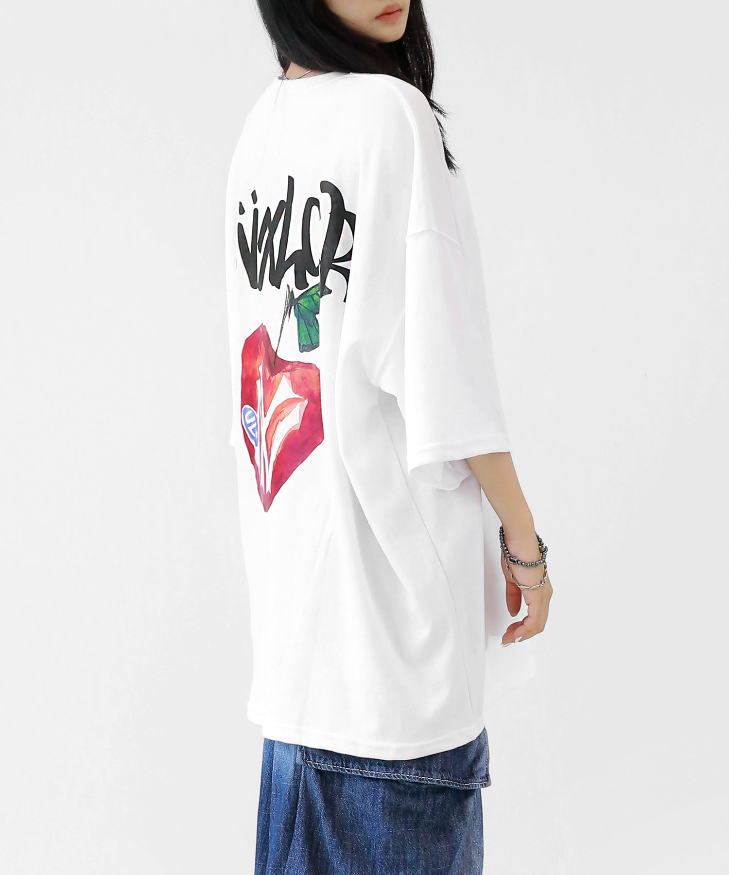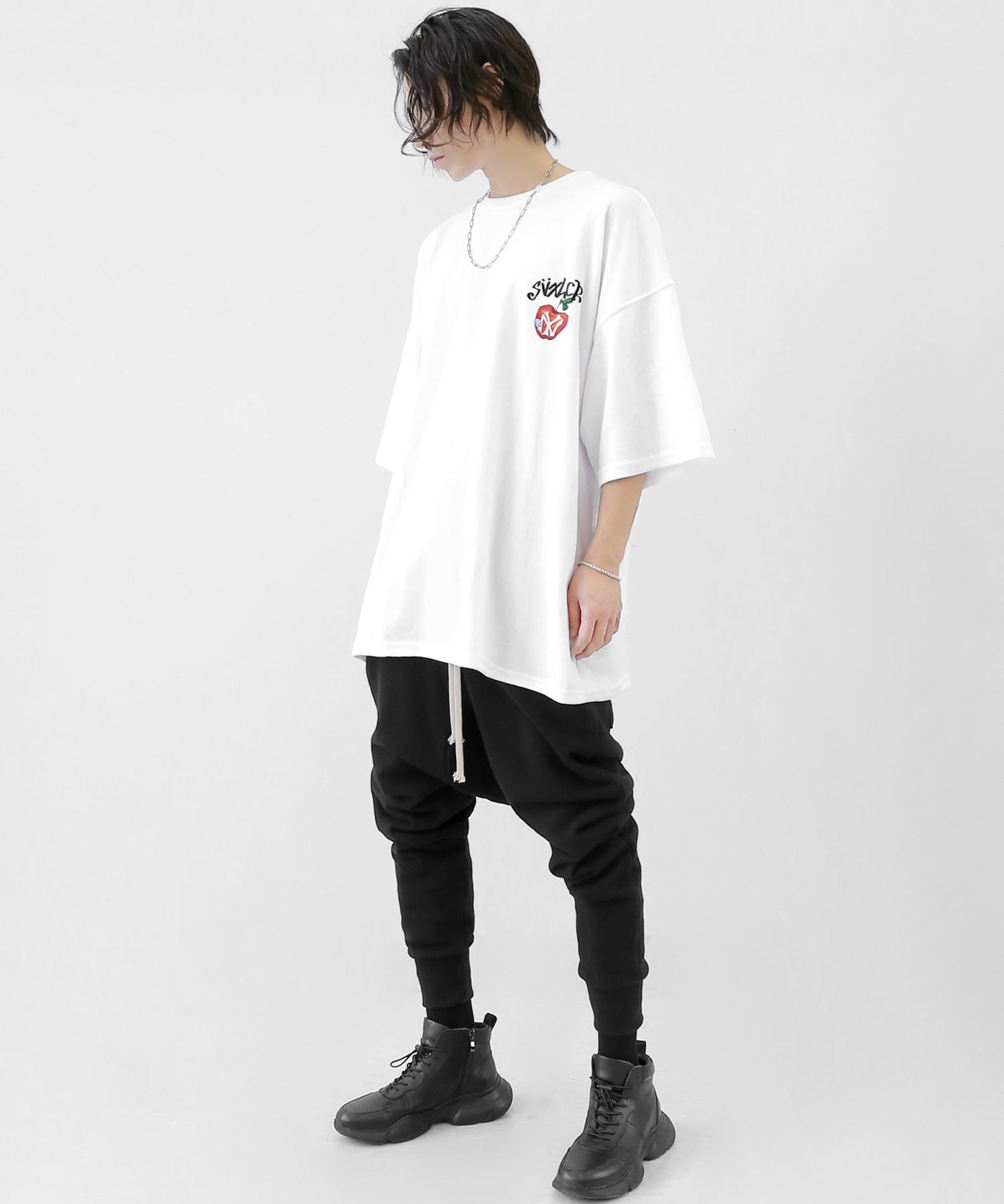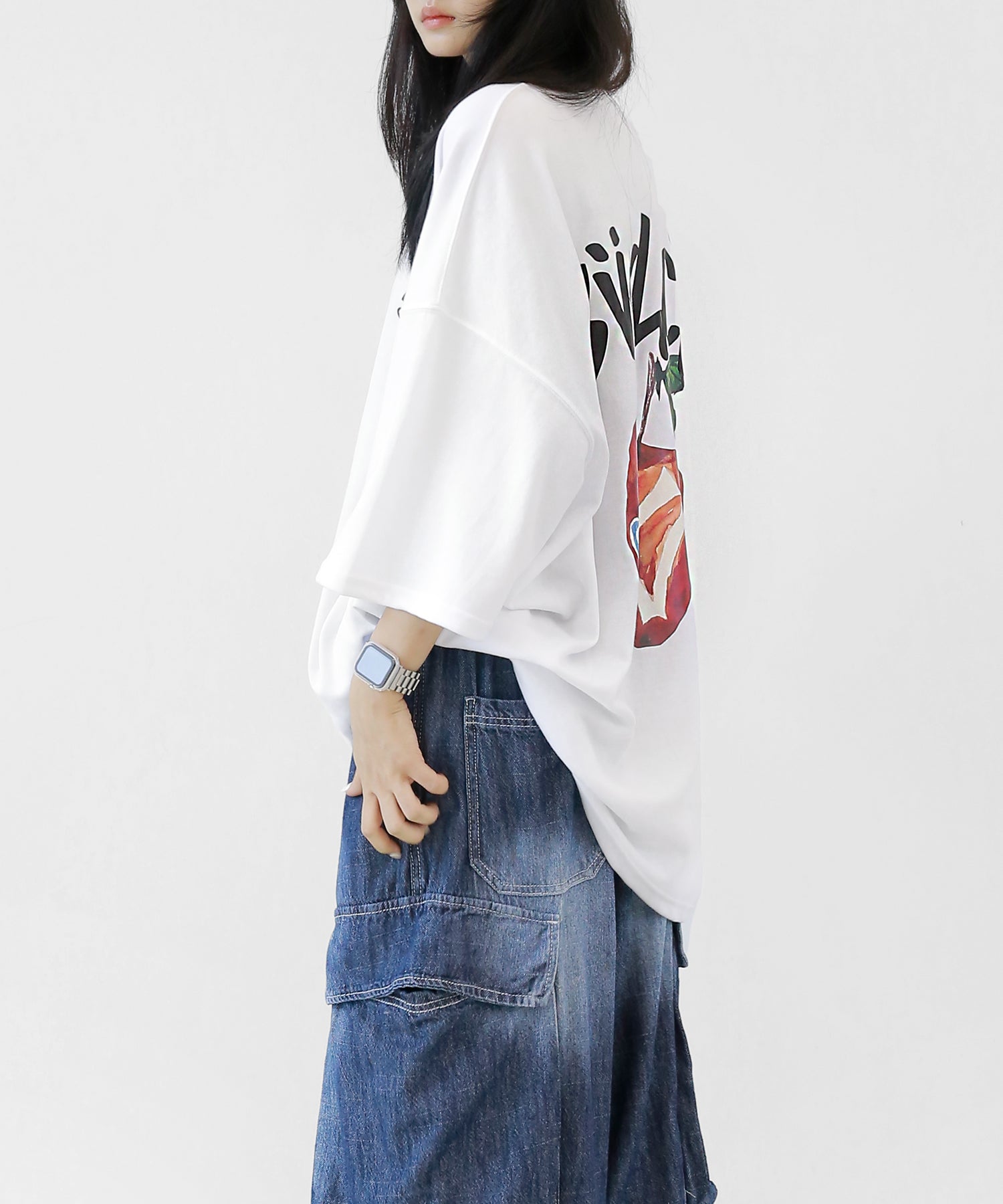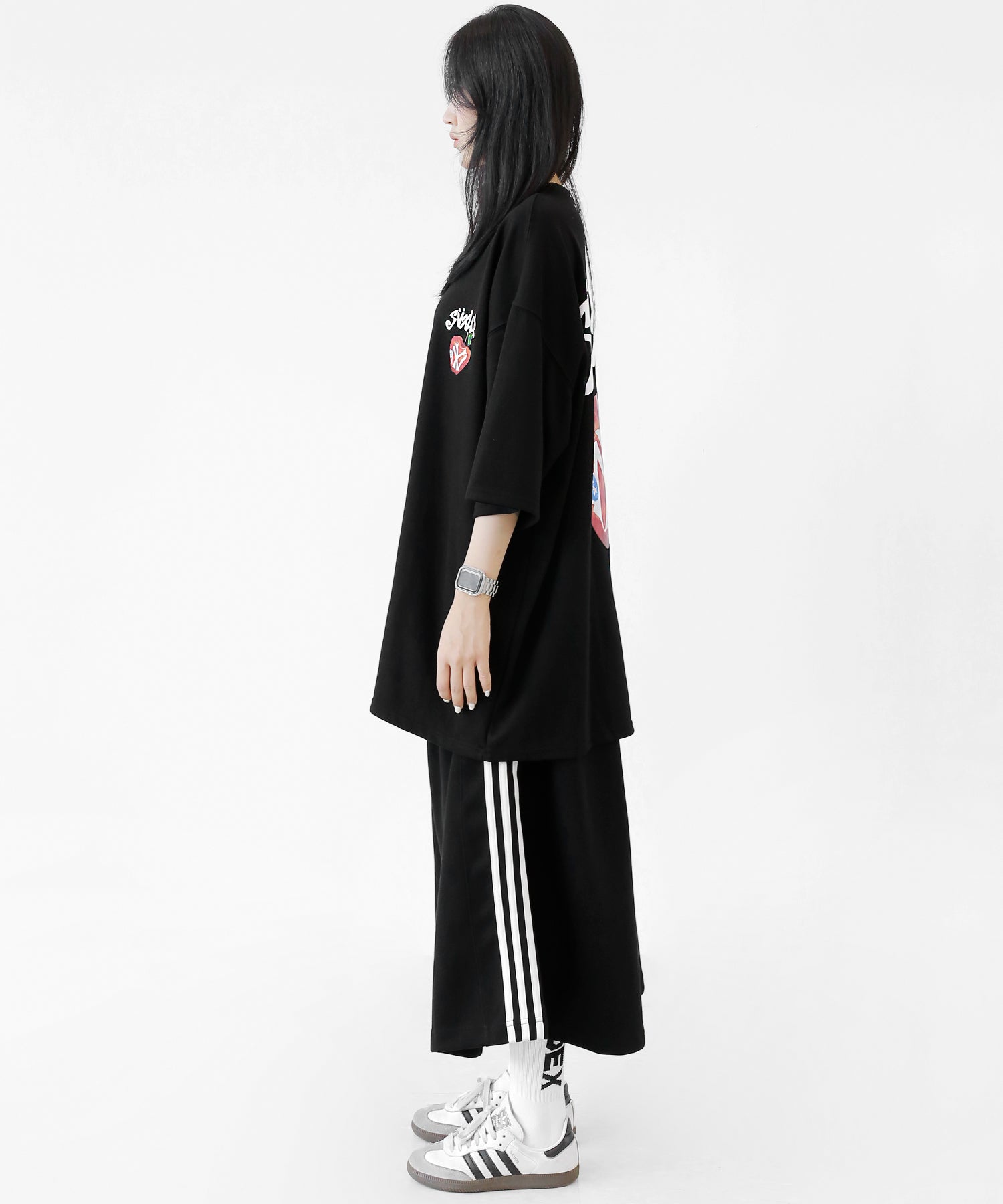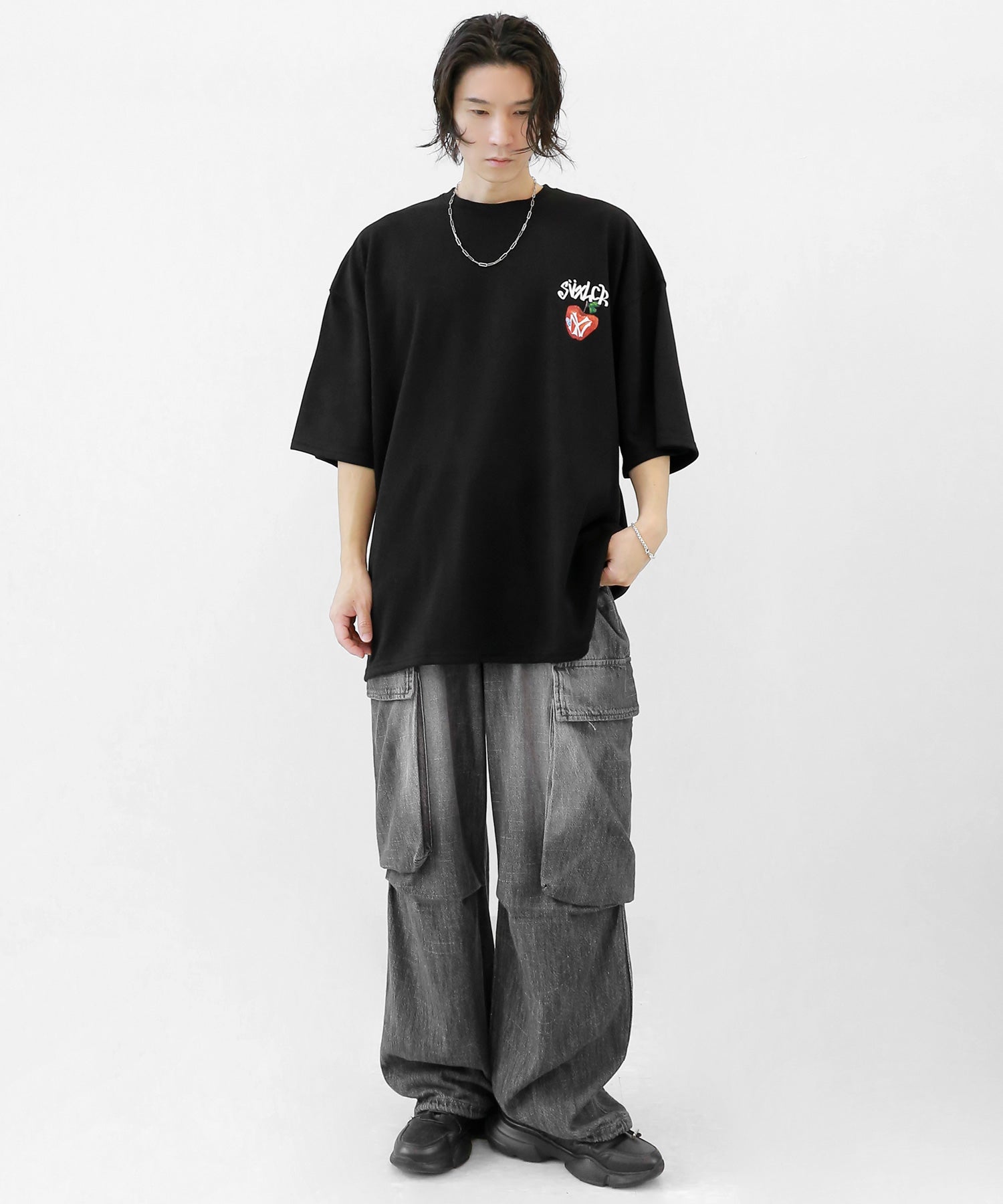 A bold apple graphic makes a statement on the back, while a matching chest logo adds a playful touch. This oversized T-shirt blends American vintage vibes with casual cool, making it the centerpiece of any outfit.