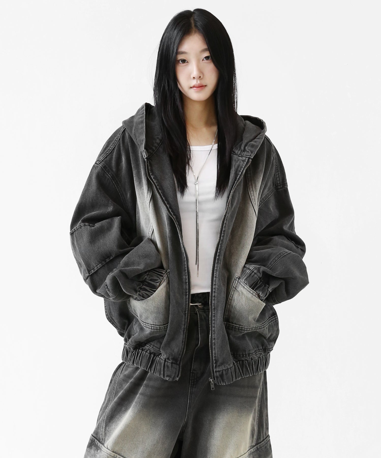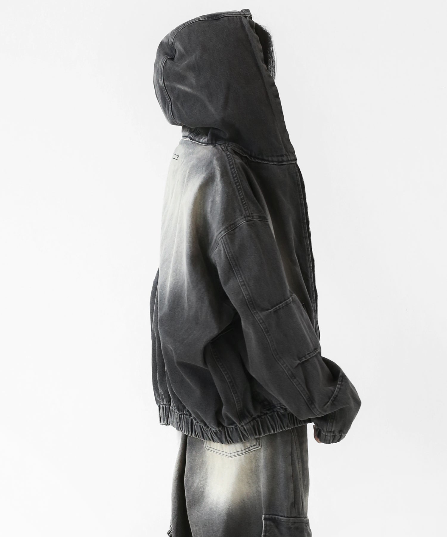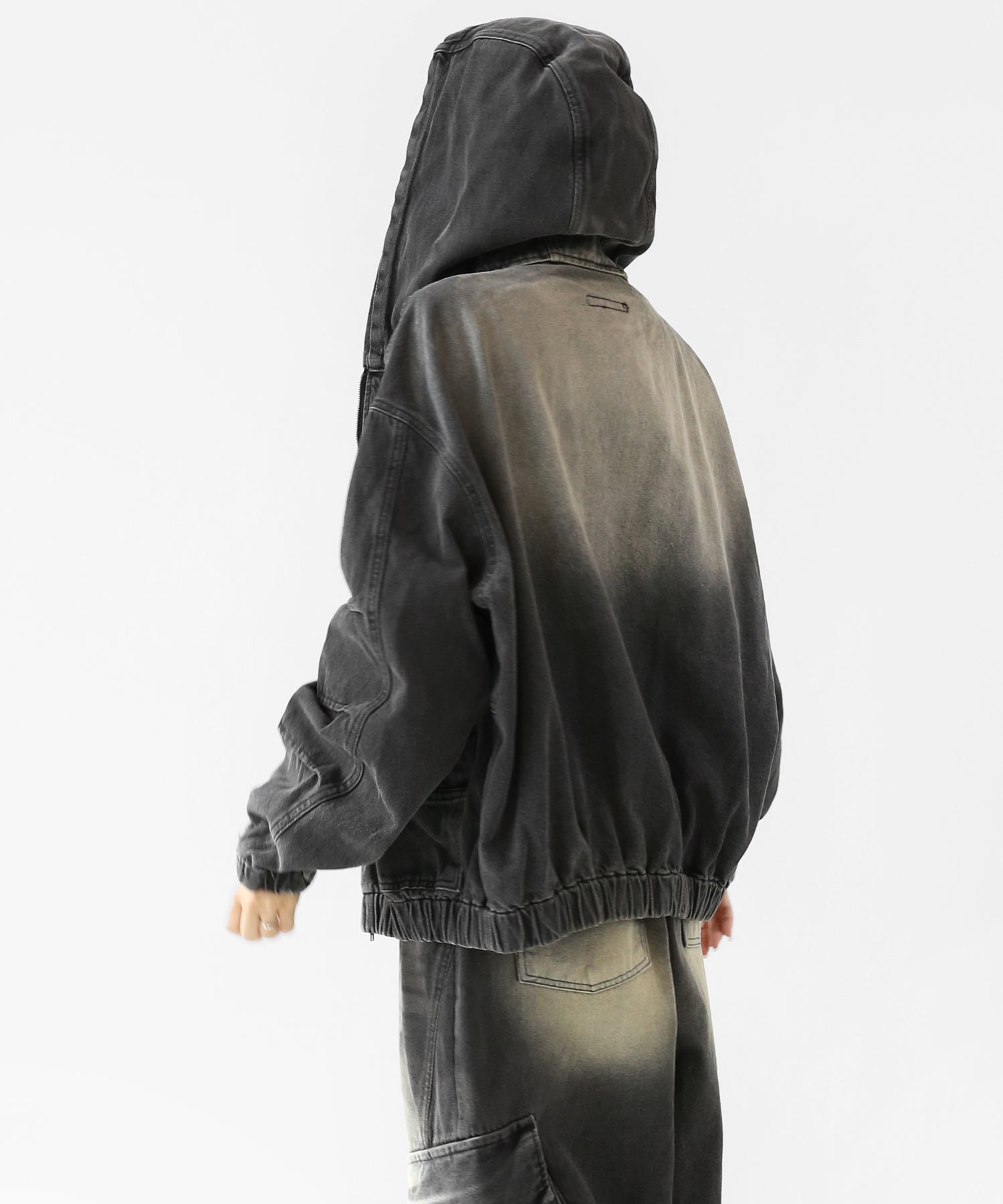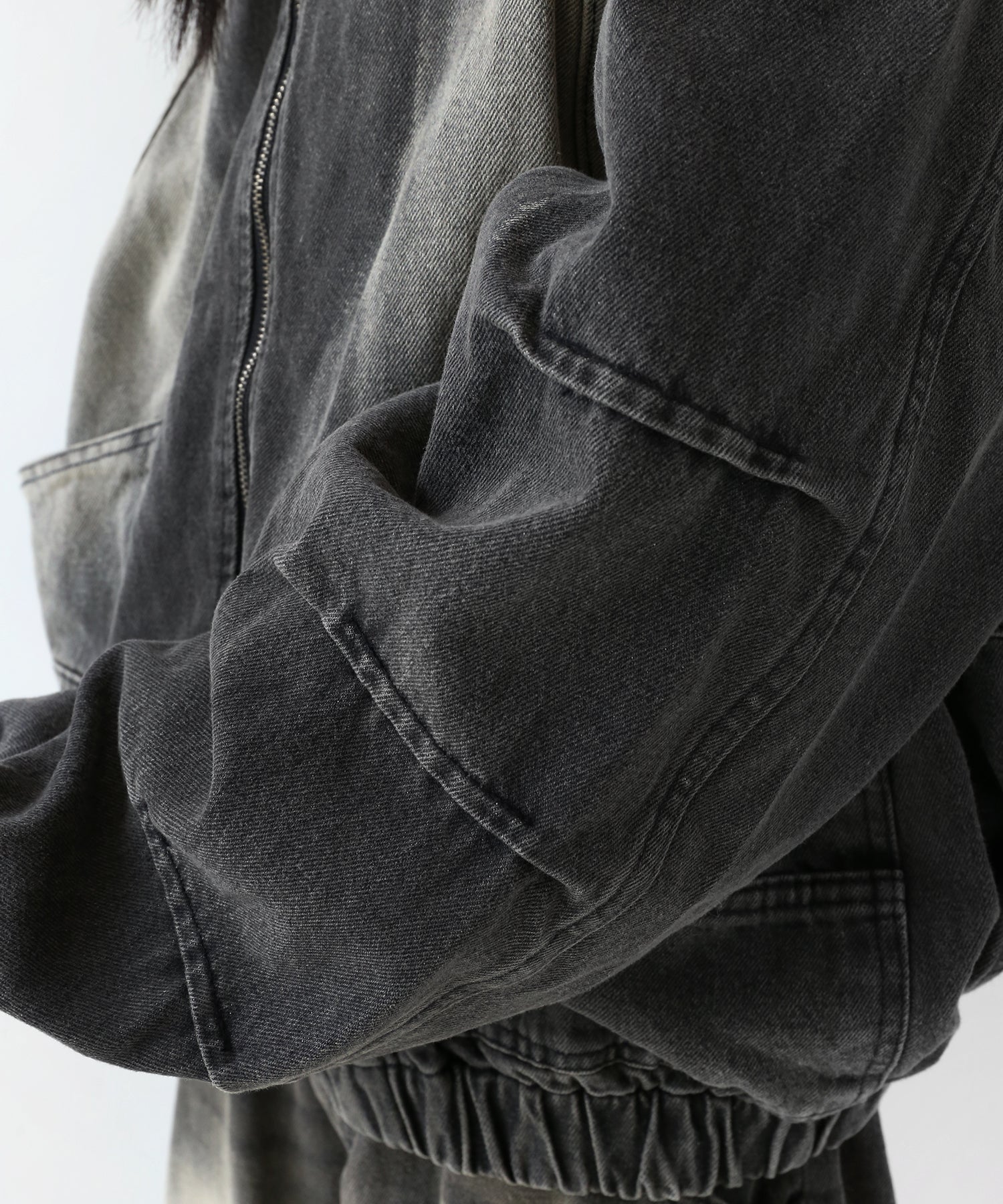 A vintage-inspired twill zip jacket featuring a rich bleached gradient and oversized silhouette. The voluminous sleeves, drop shoulders, and subtle balloon shape create a perfect balance of street and modern elegance.