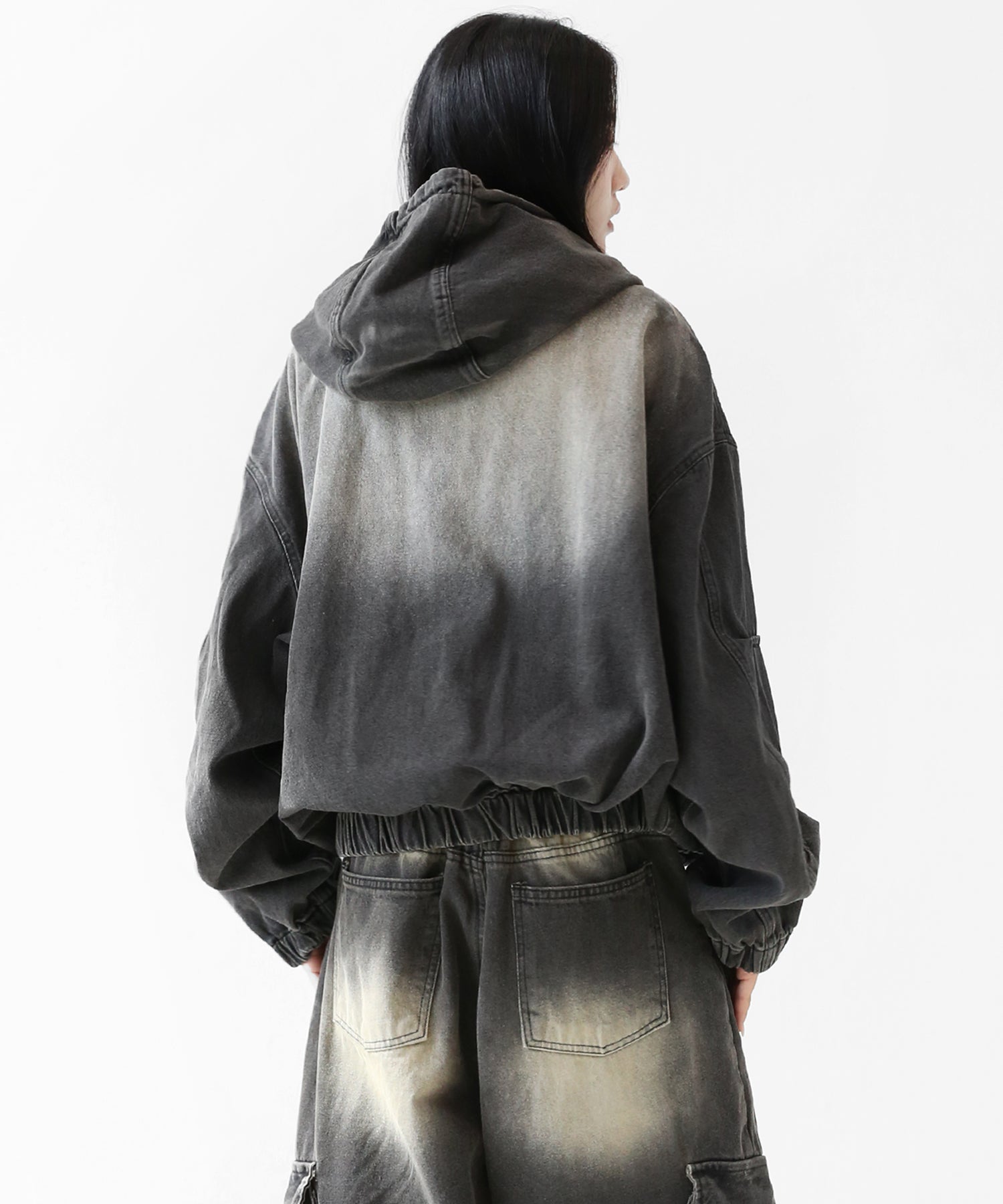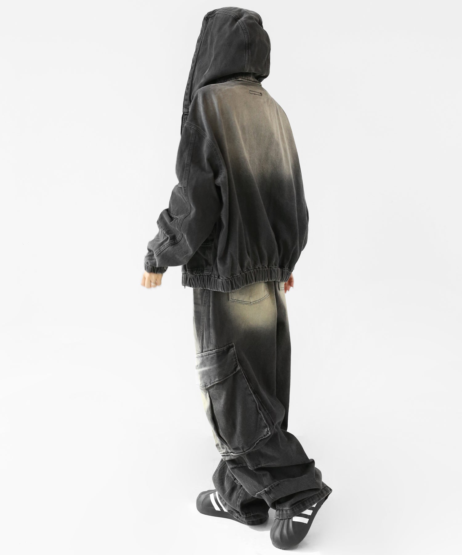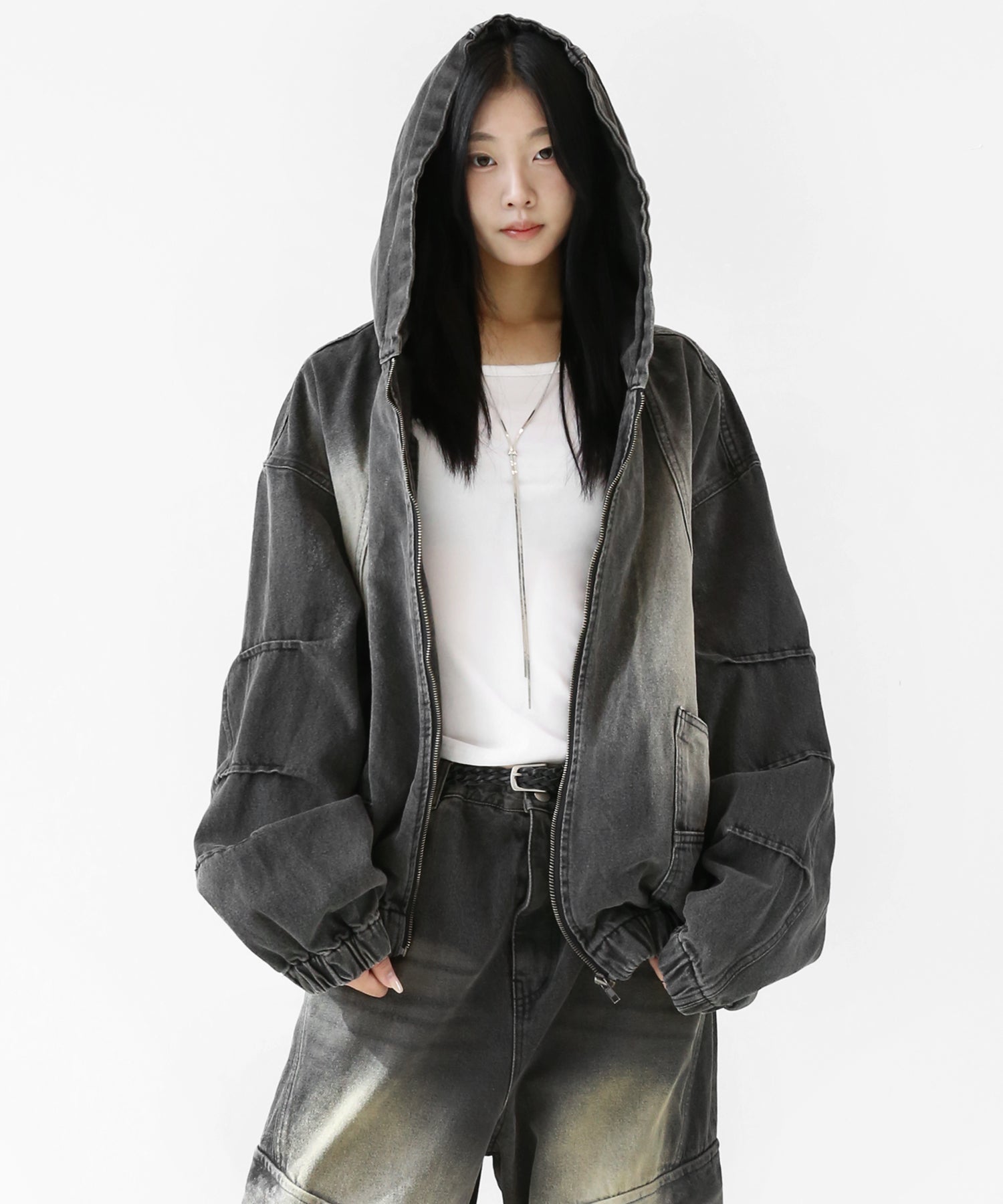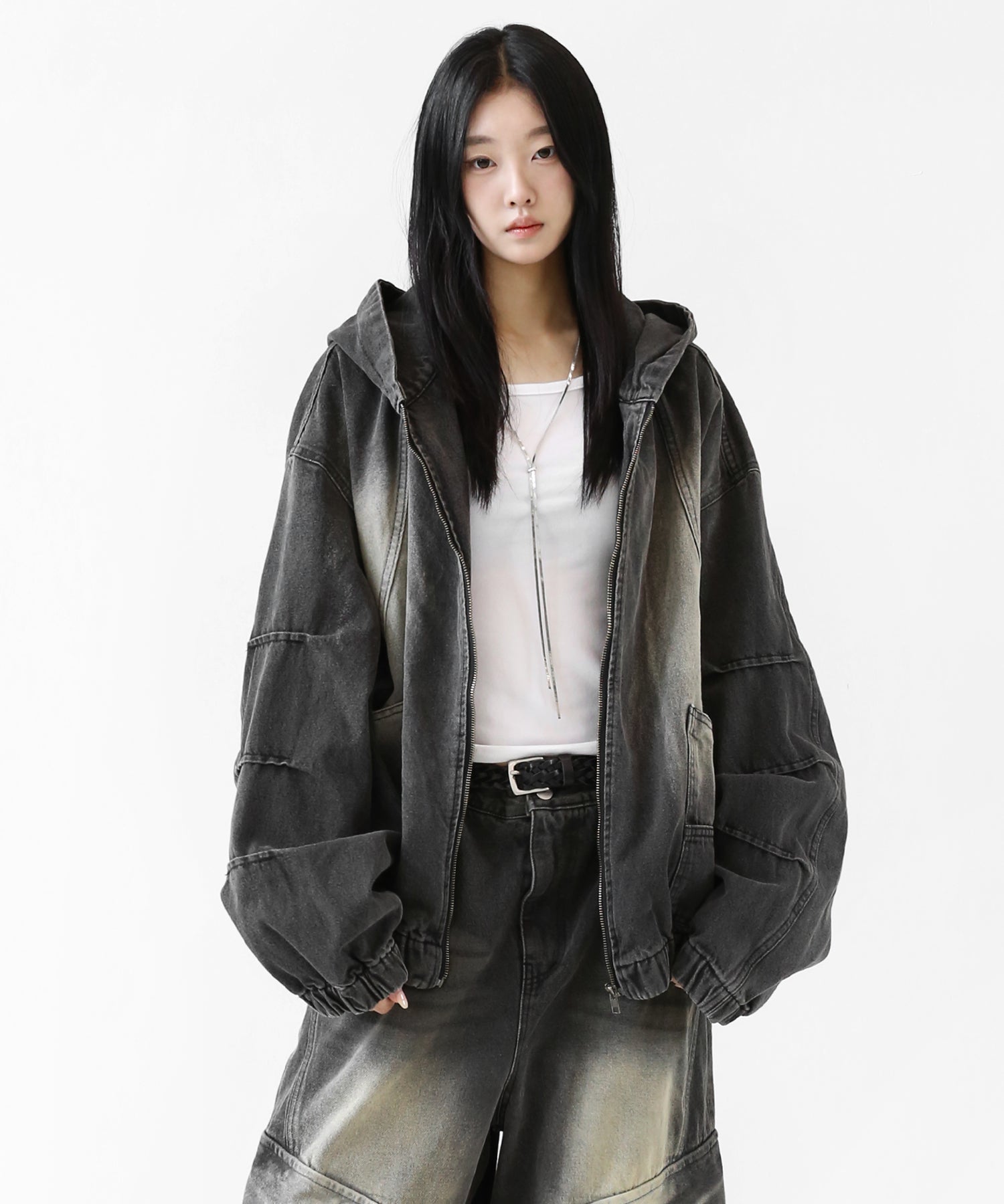 A vintage-inspired twill zip jacket featuring a rich bleached gradient and oversized silhouette. The voluminous sleeves, drop shoulders, and subtle balloon shape create a perfect balance of street and modern elegance.