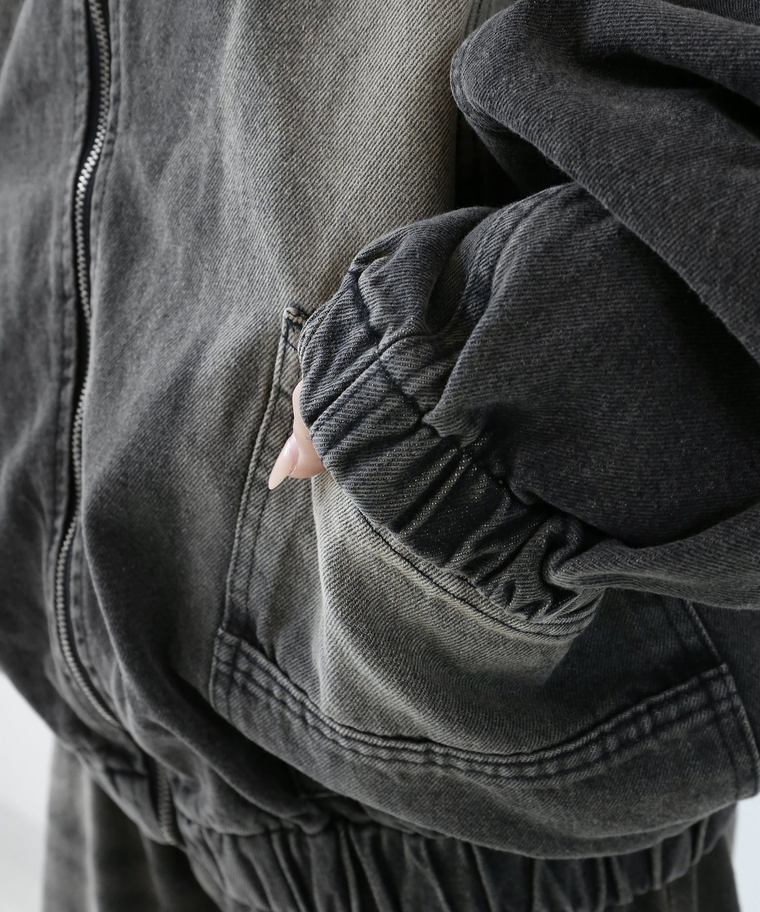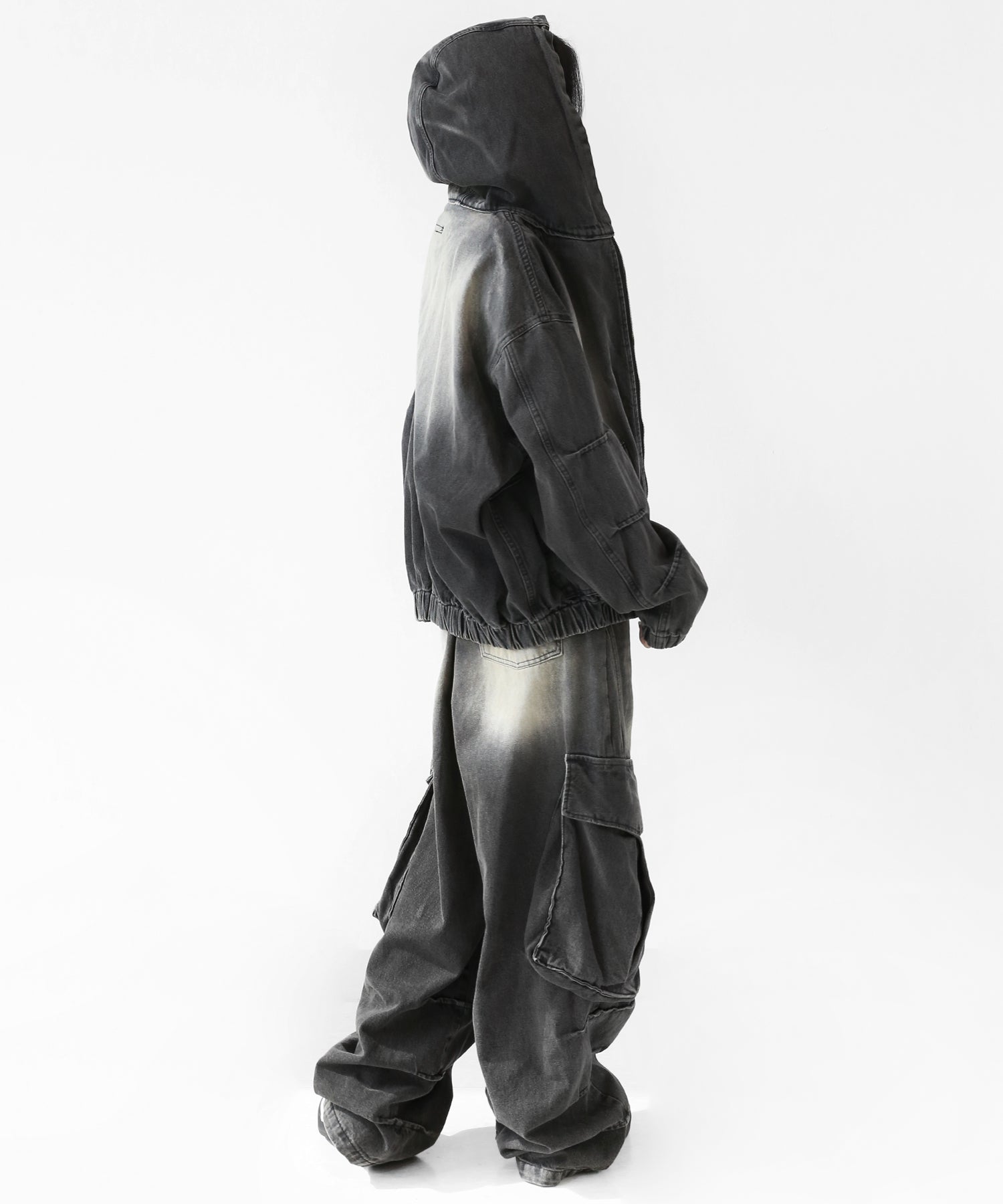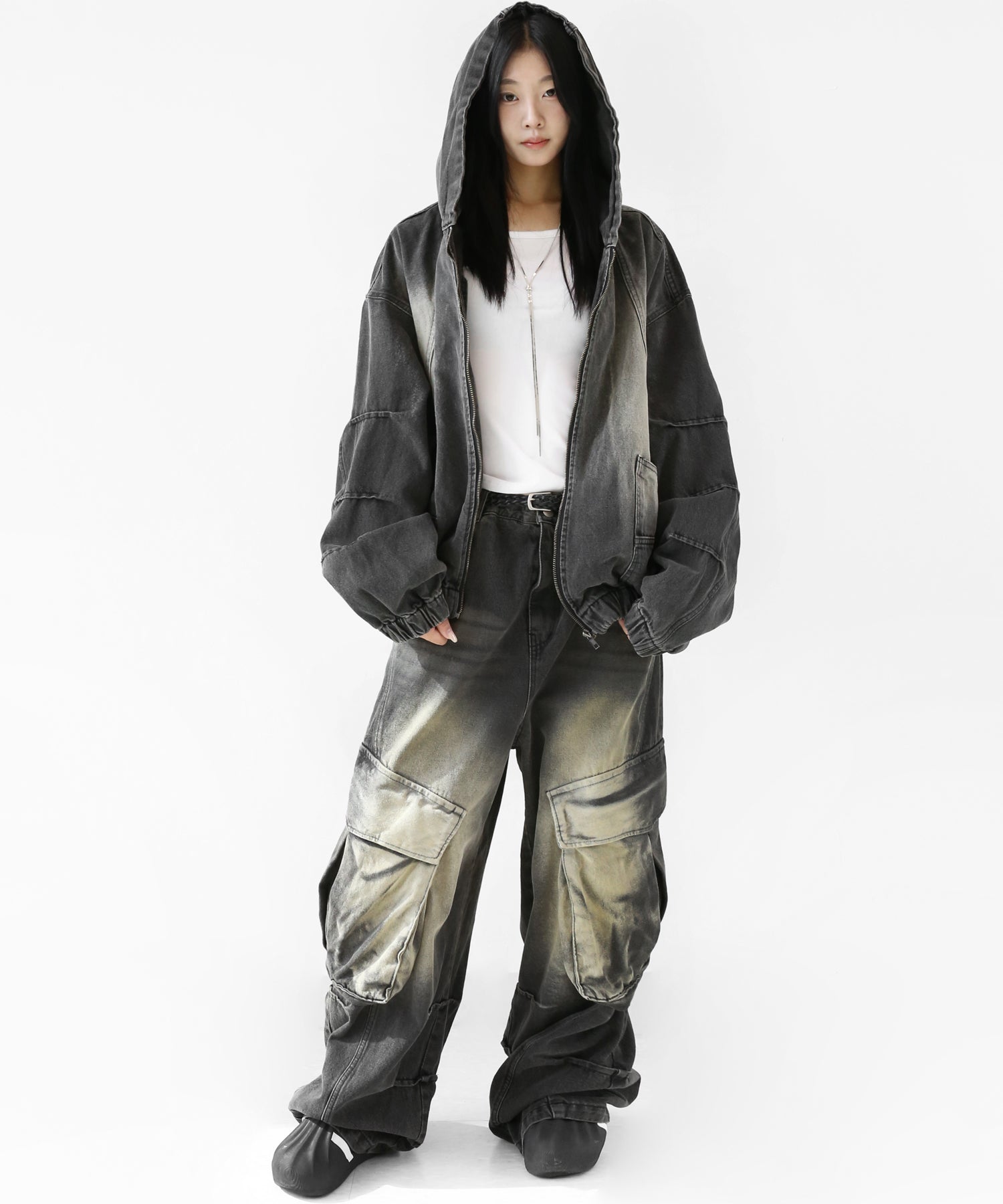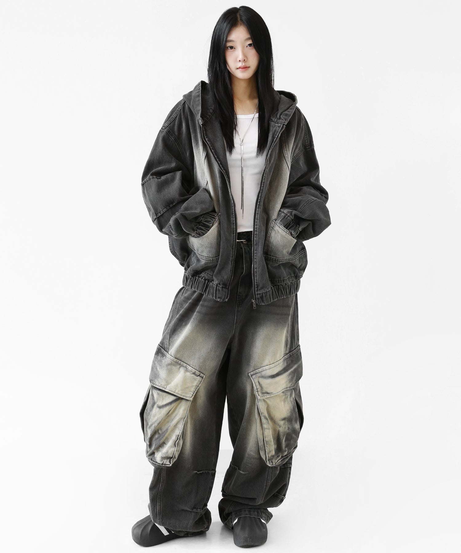 A vintage-inspired twill zip jacket featuring a rich bleached gradient and oversized silhouette. The voluminous sleeves, drop shoulders, and subtle balloon shape create a perfect balance of street and modern elegance.