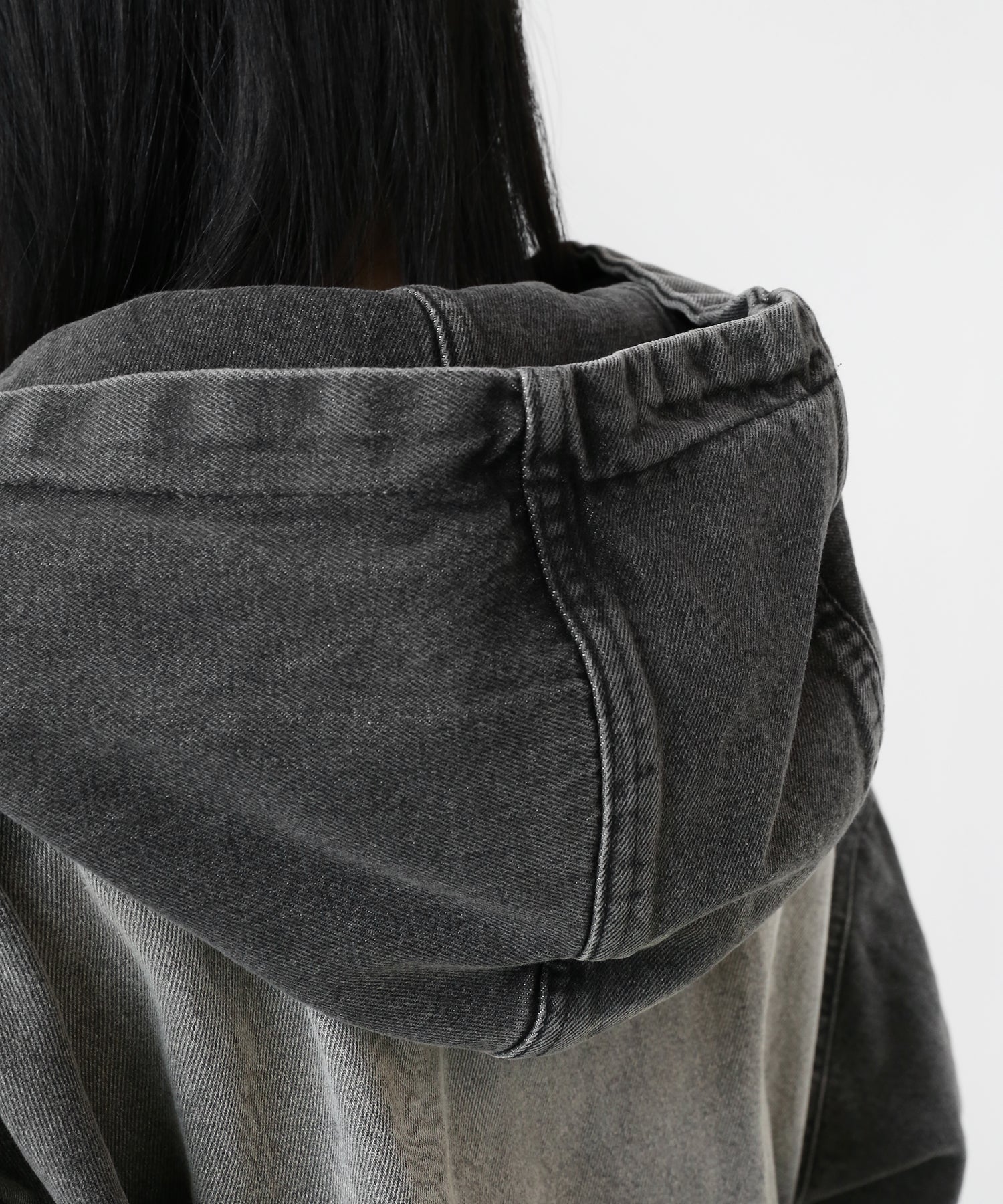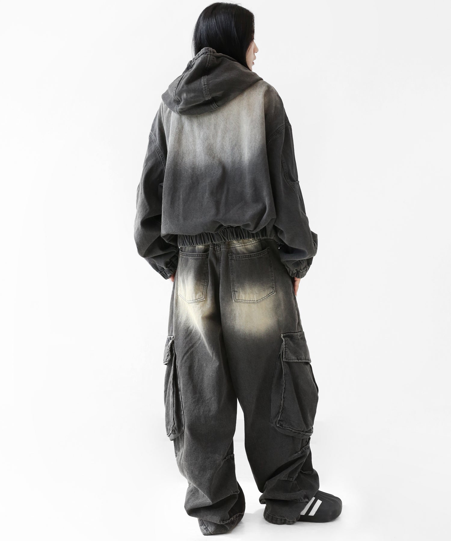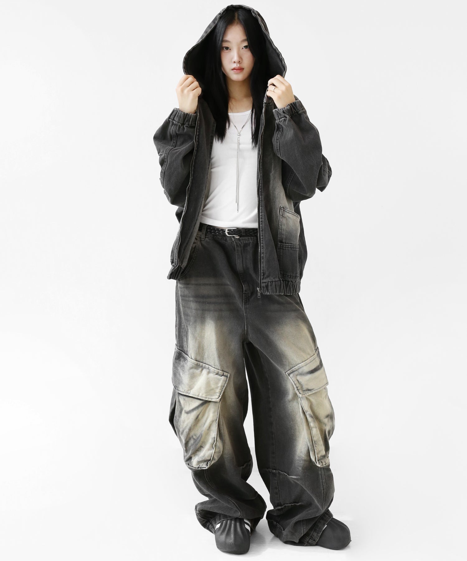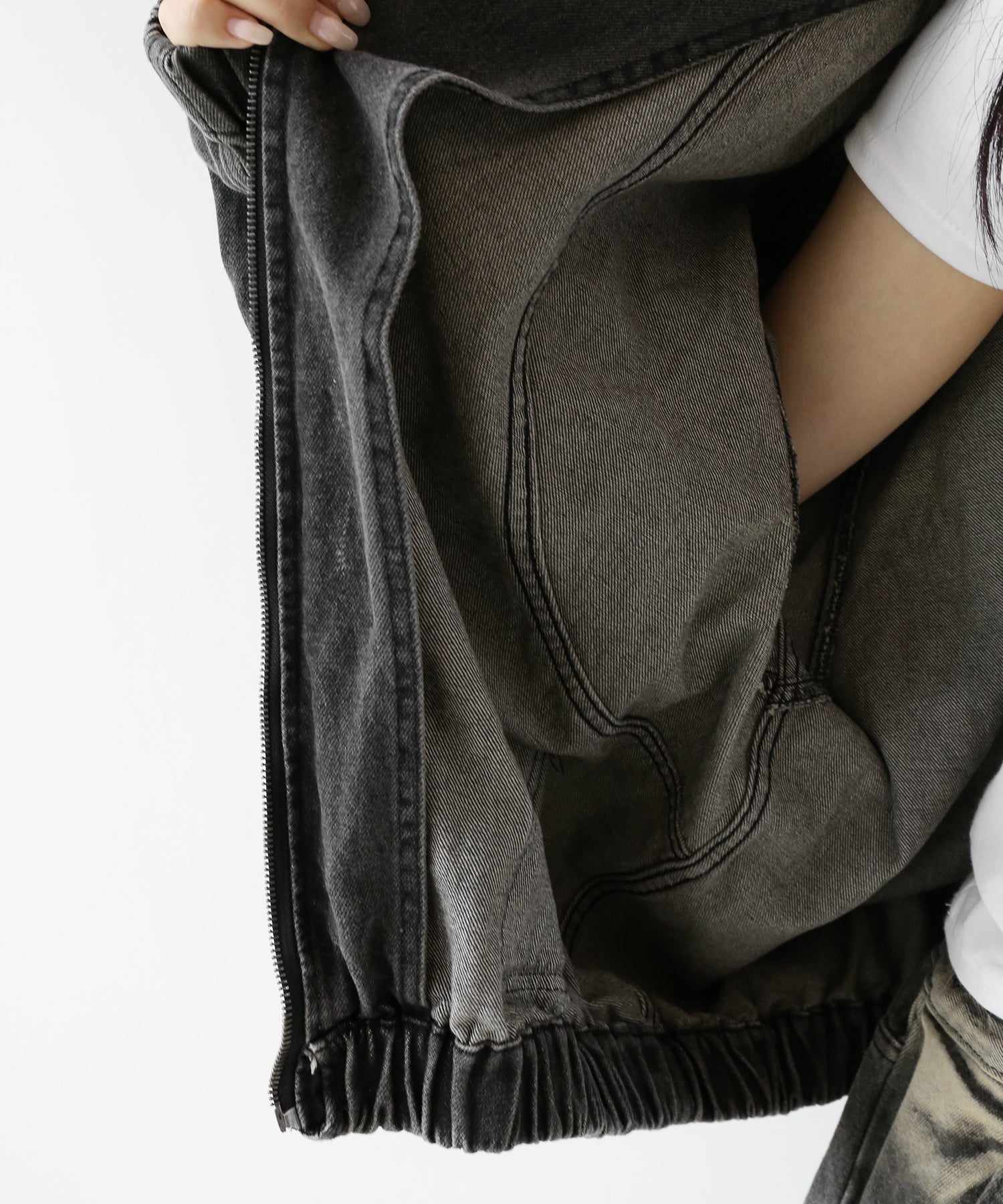 A vintage-inspired twill zip jacket featuring a rich bleached gradient and oversized silhouette. The voluminous sleeves, drop shoulders, and subtle balloon shape create a perfect balance of street and modern elegance.