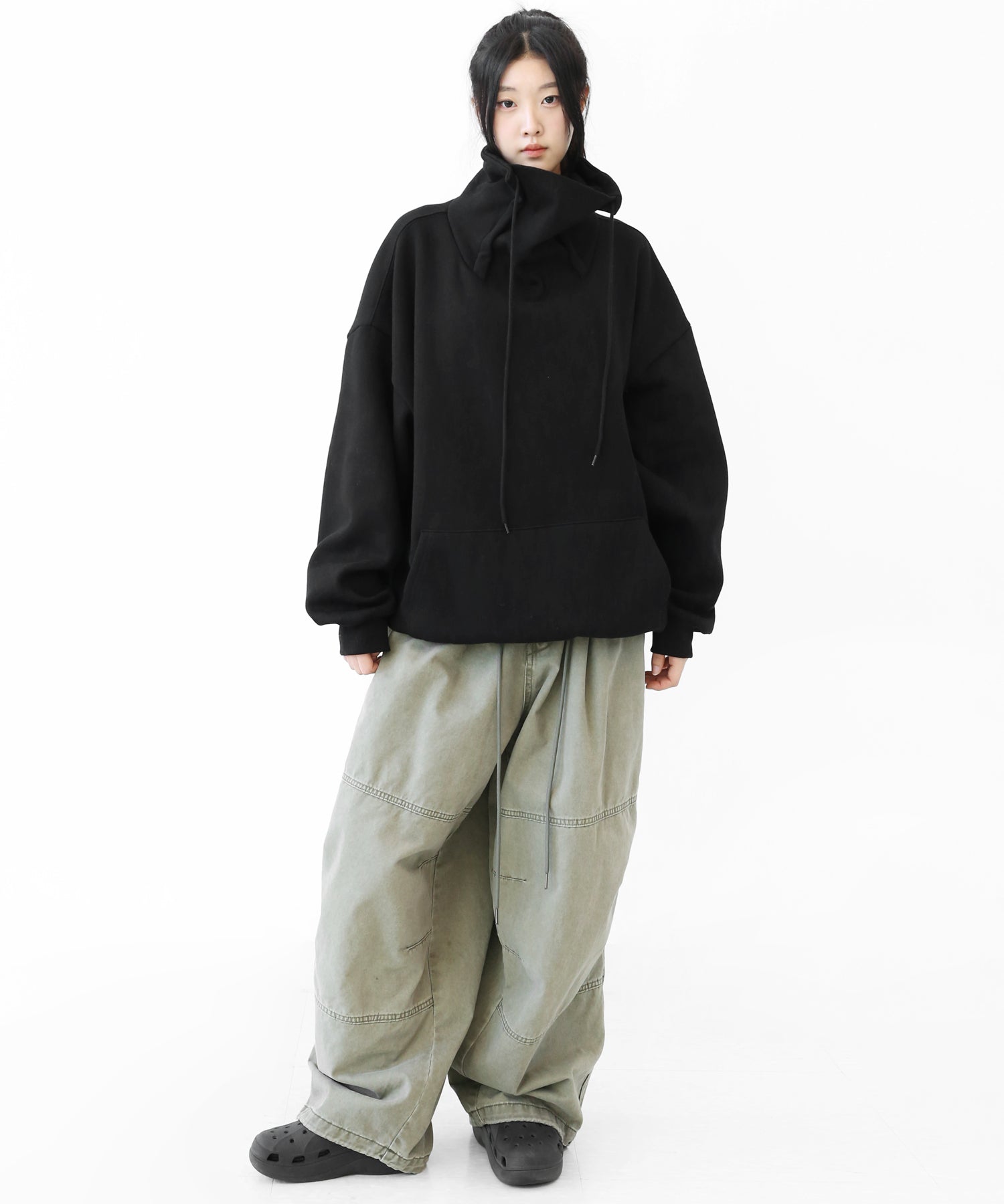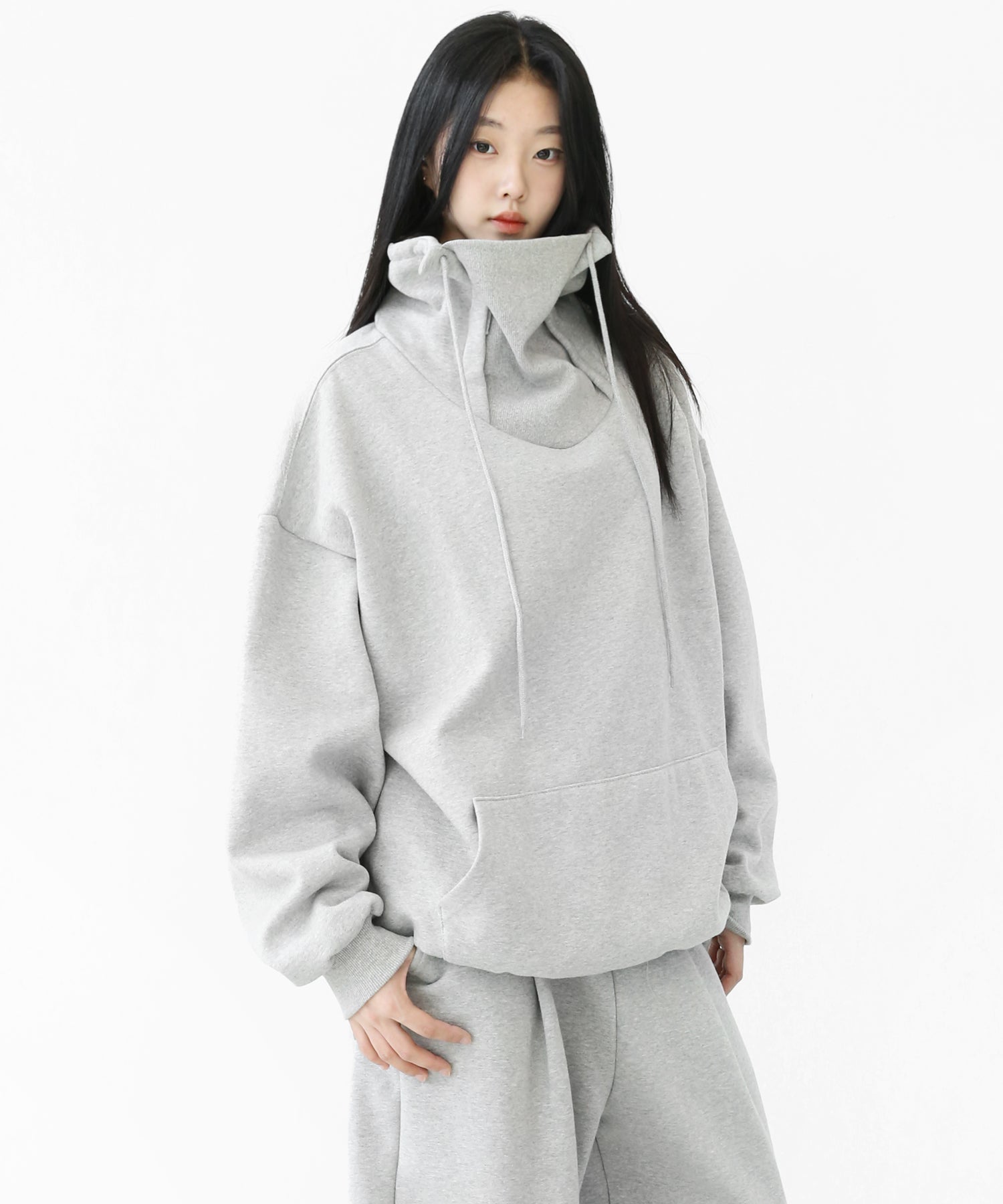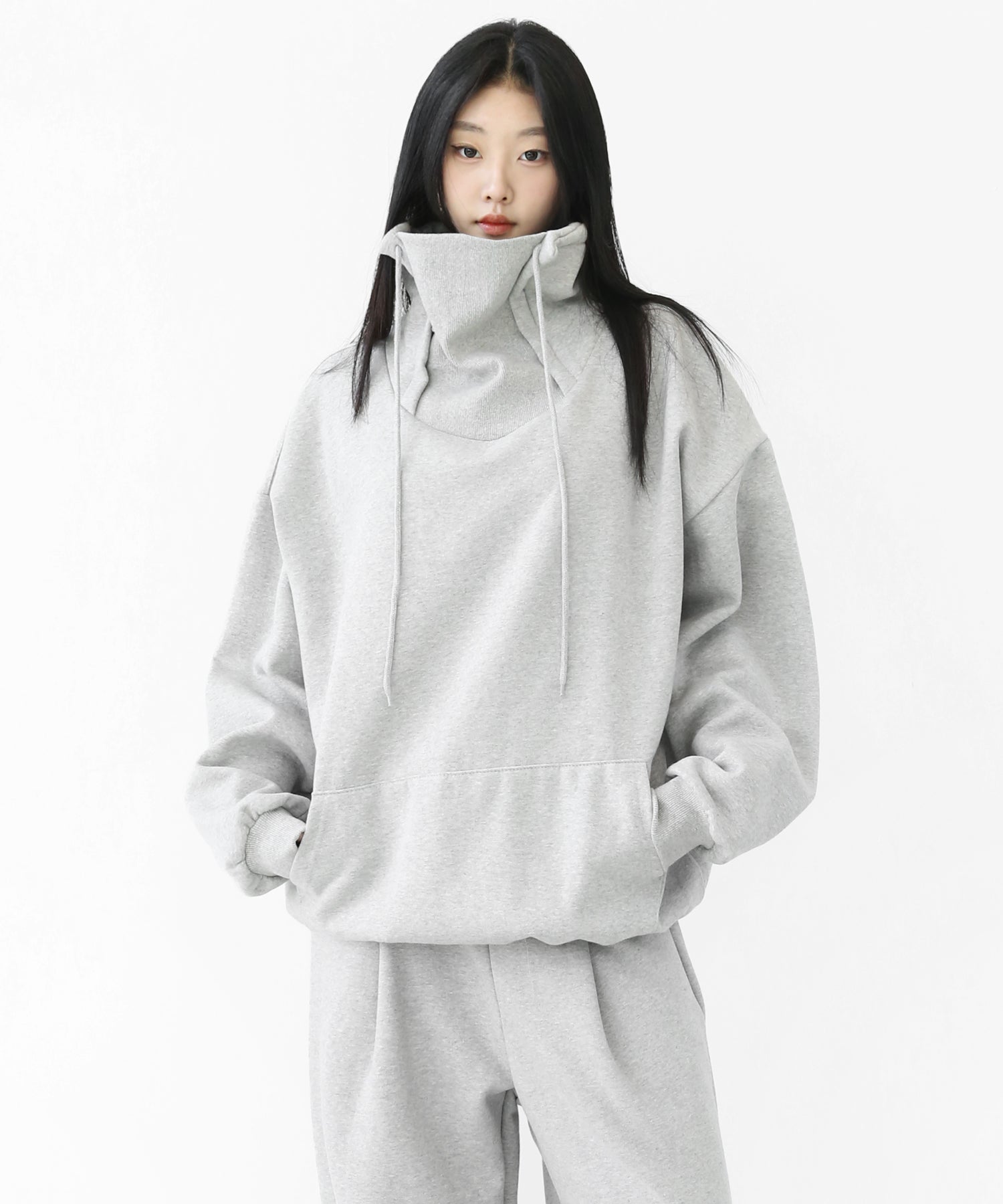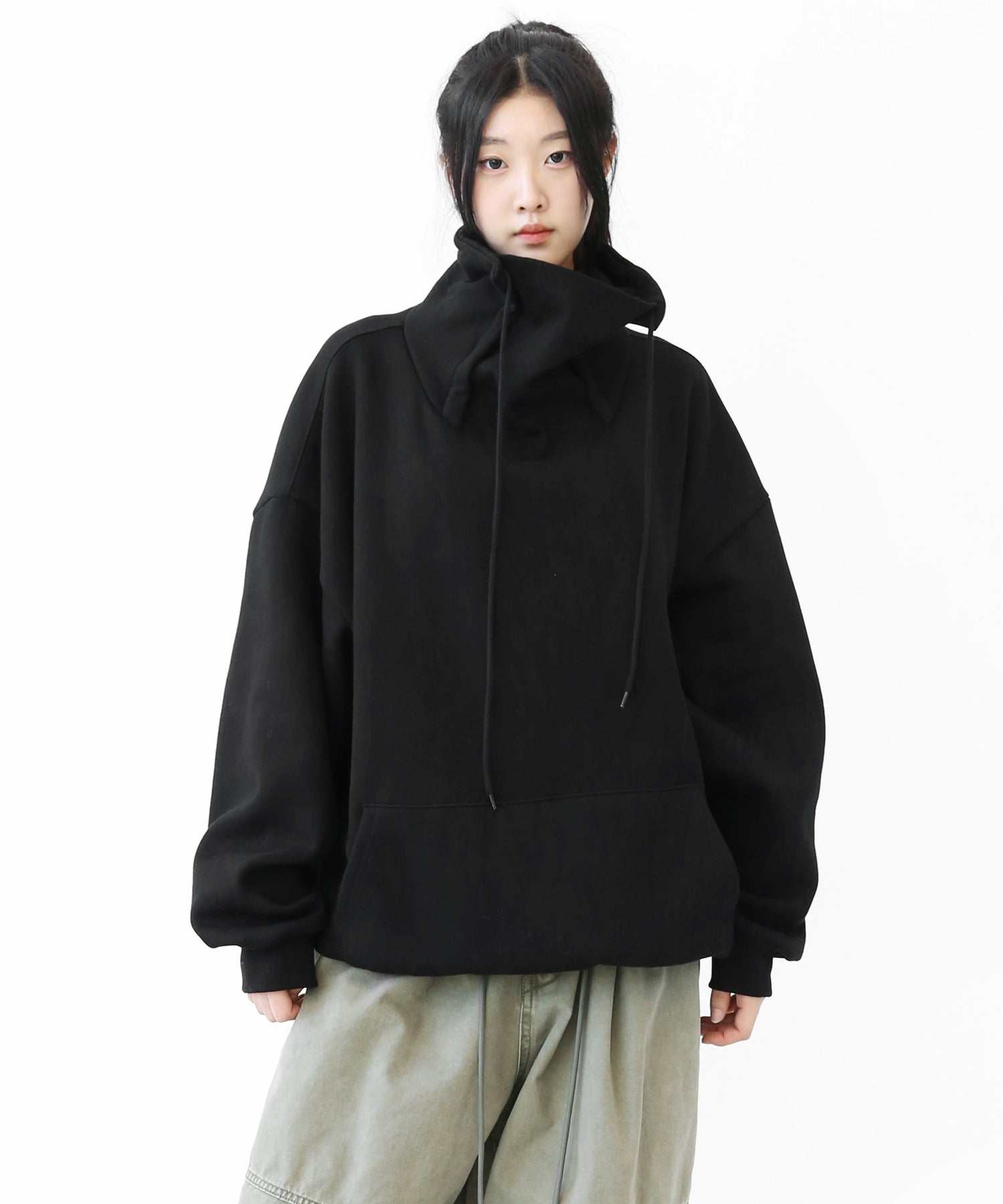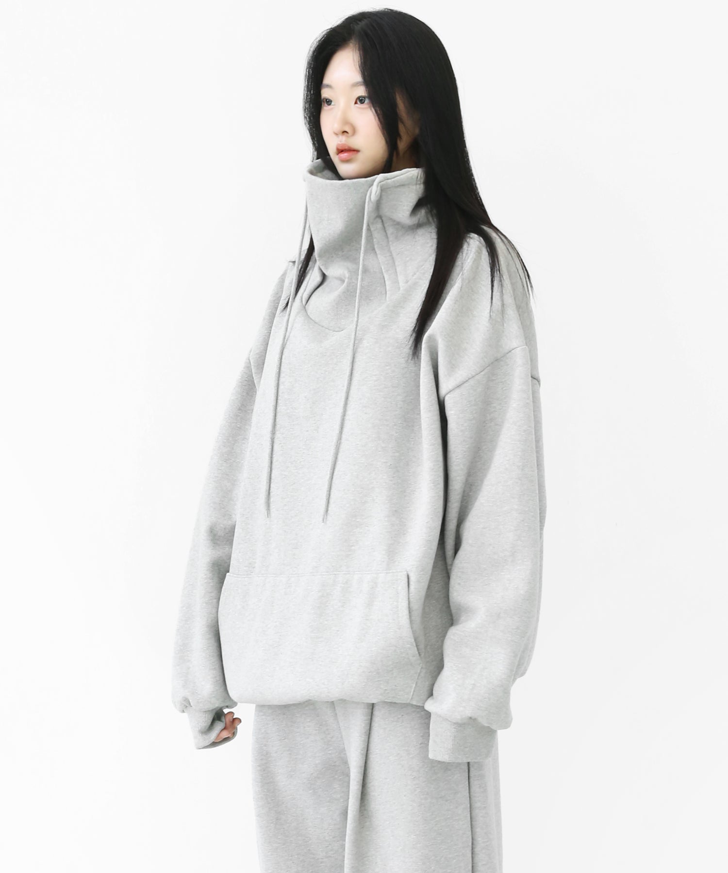 An oversized high-neck sweatshirt with a voluminous silhouette that wraps the neck for warmth and modern edge.