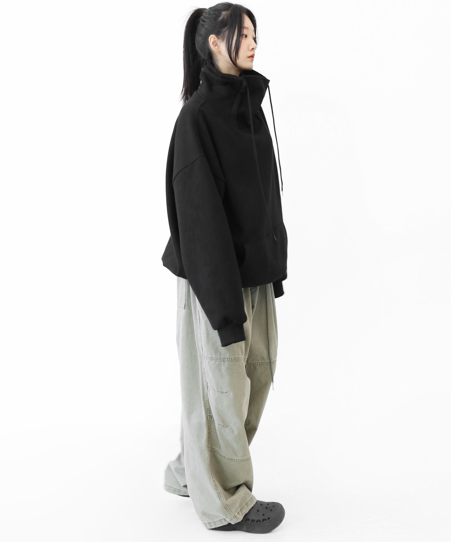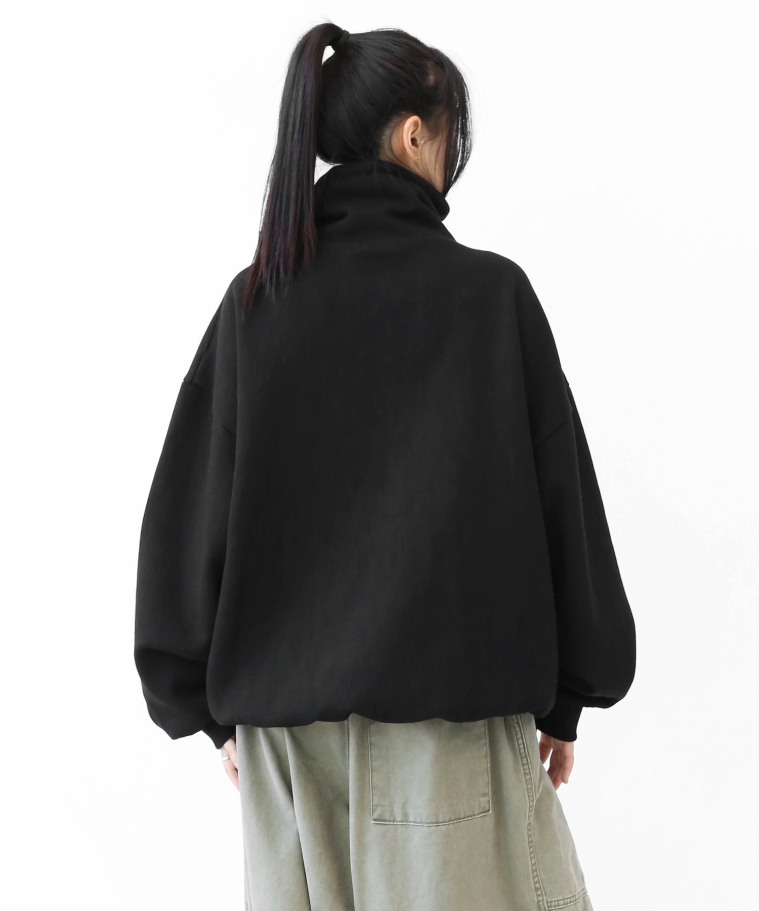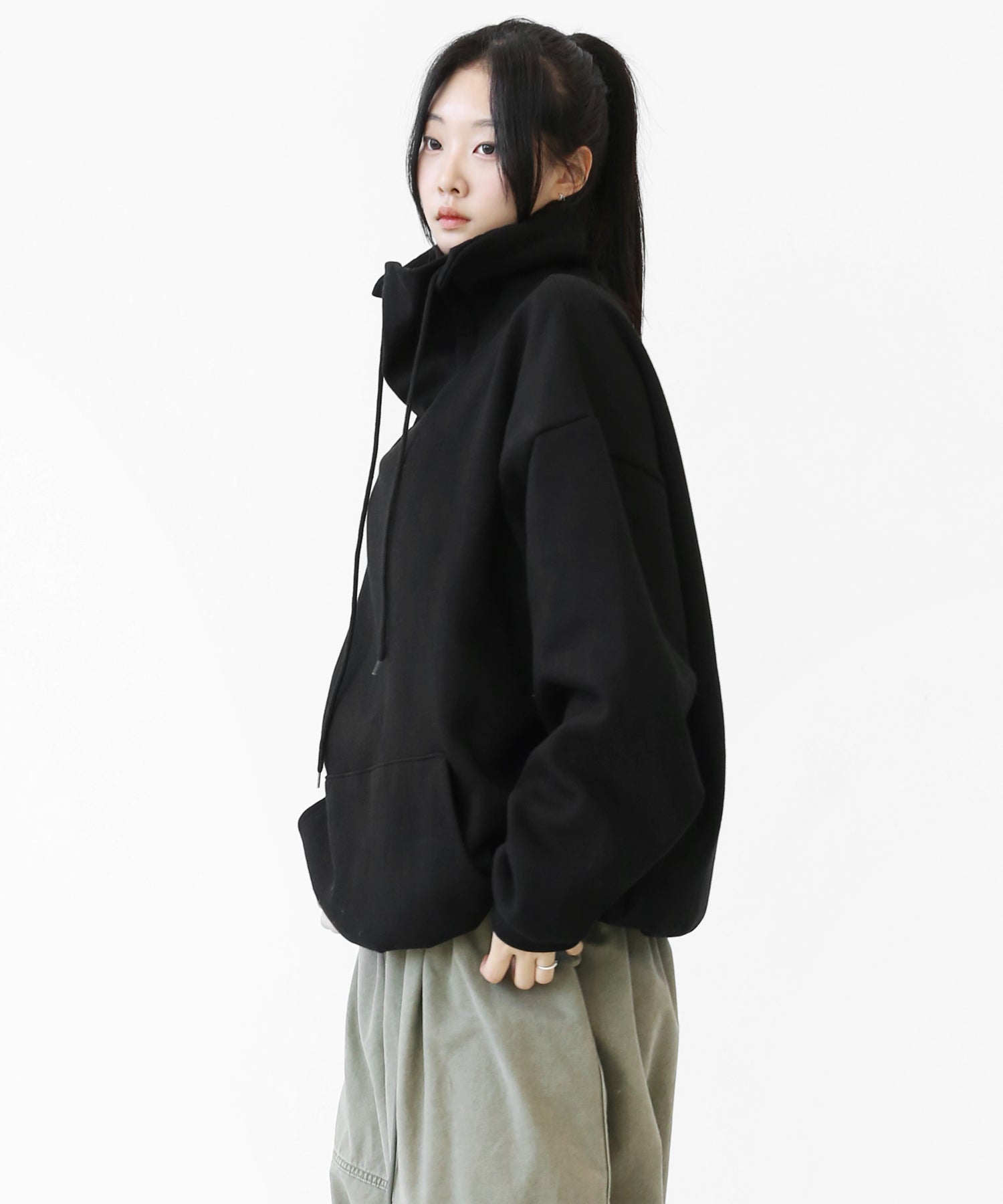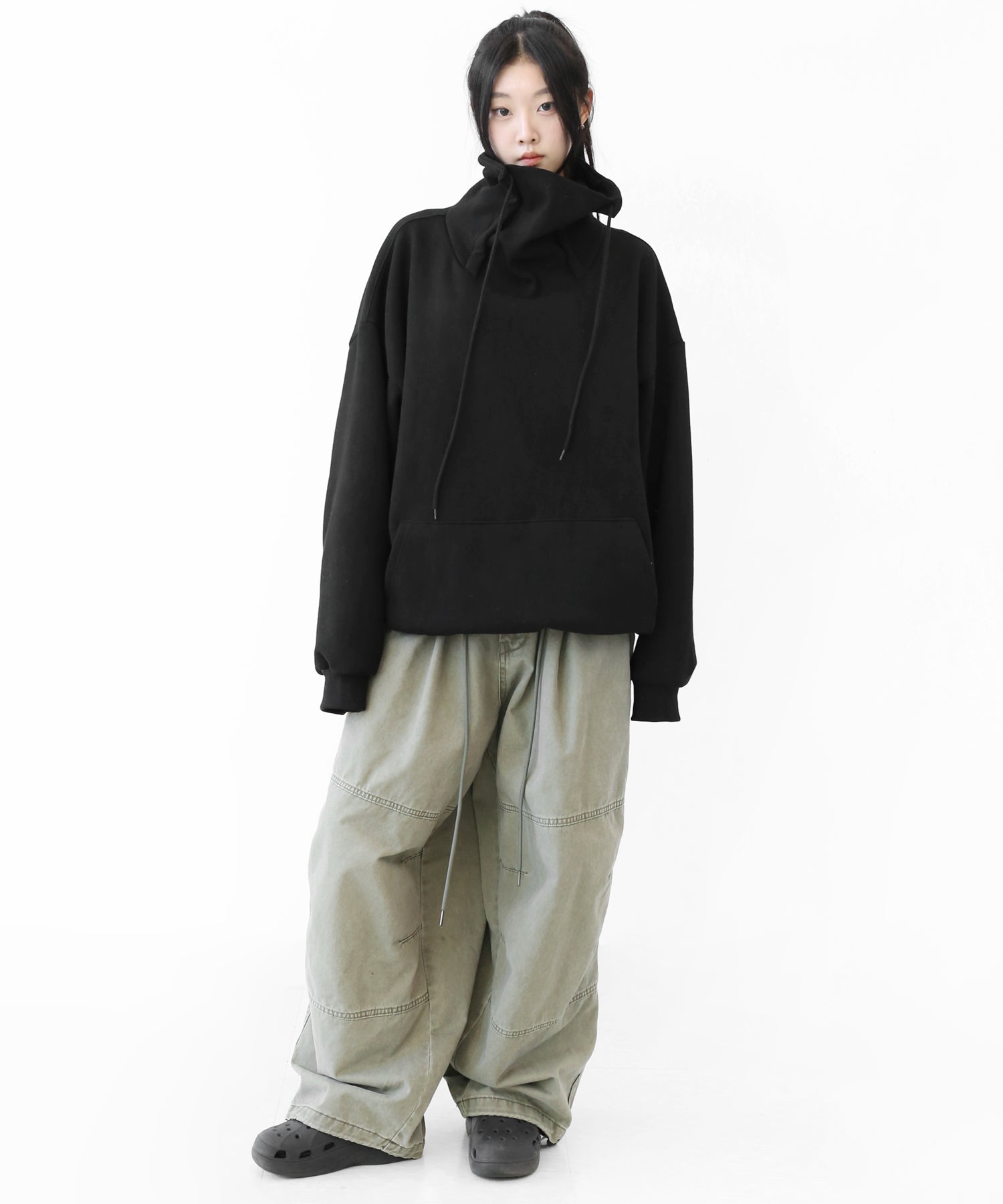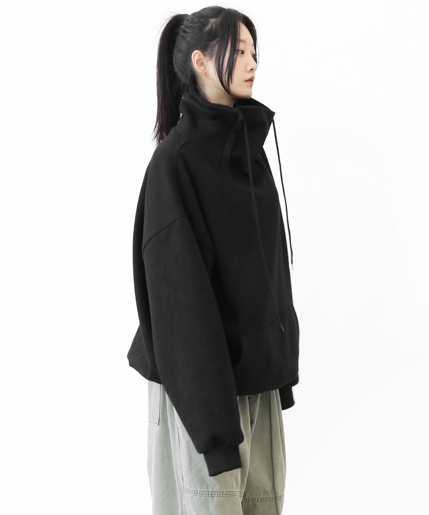 An oversized high-neck sweatshirt with a voluminous silhouette that wraps the neck for warmth and modern edge.