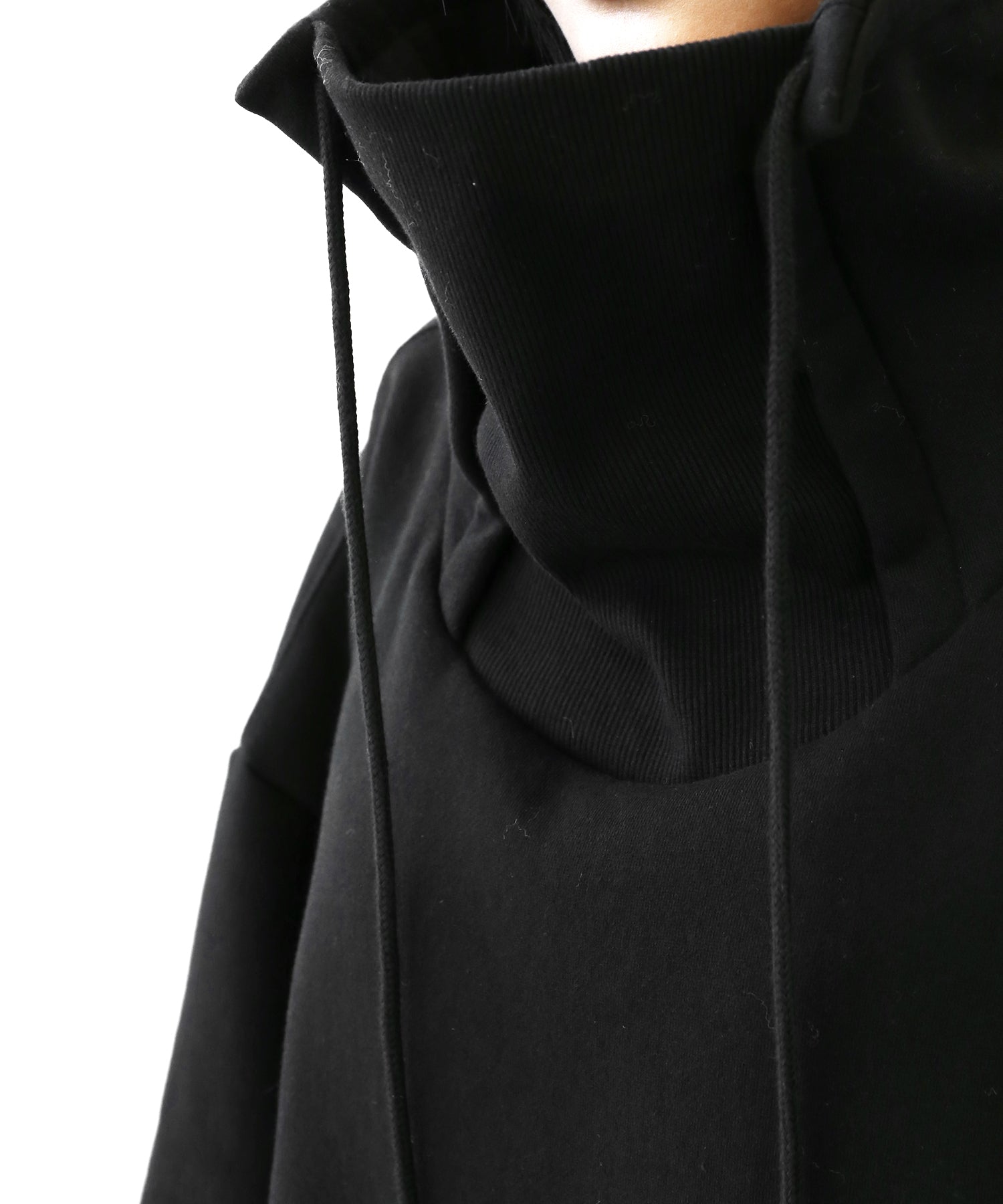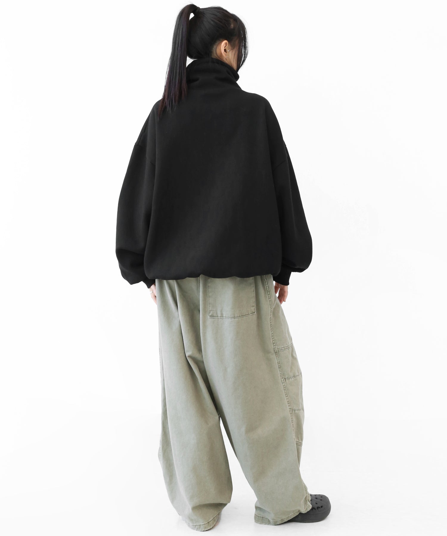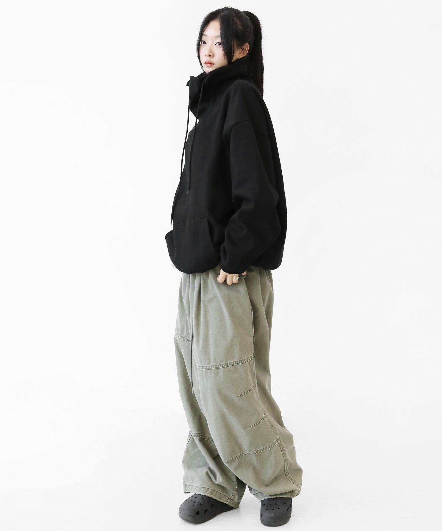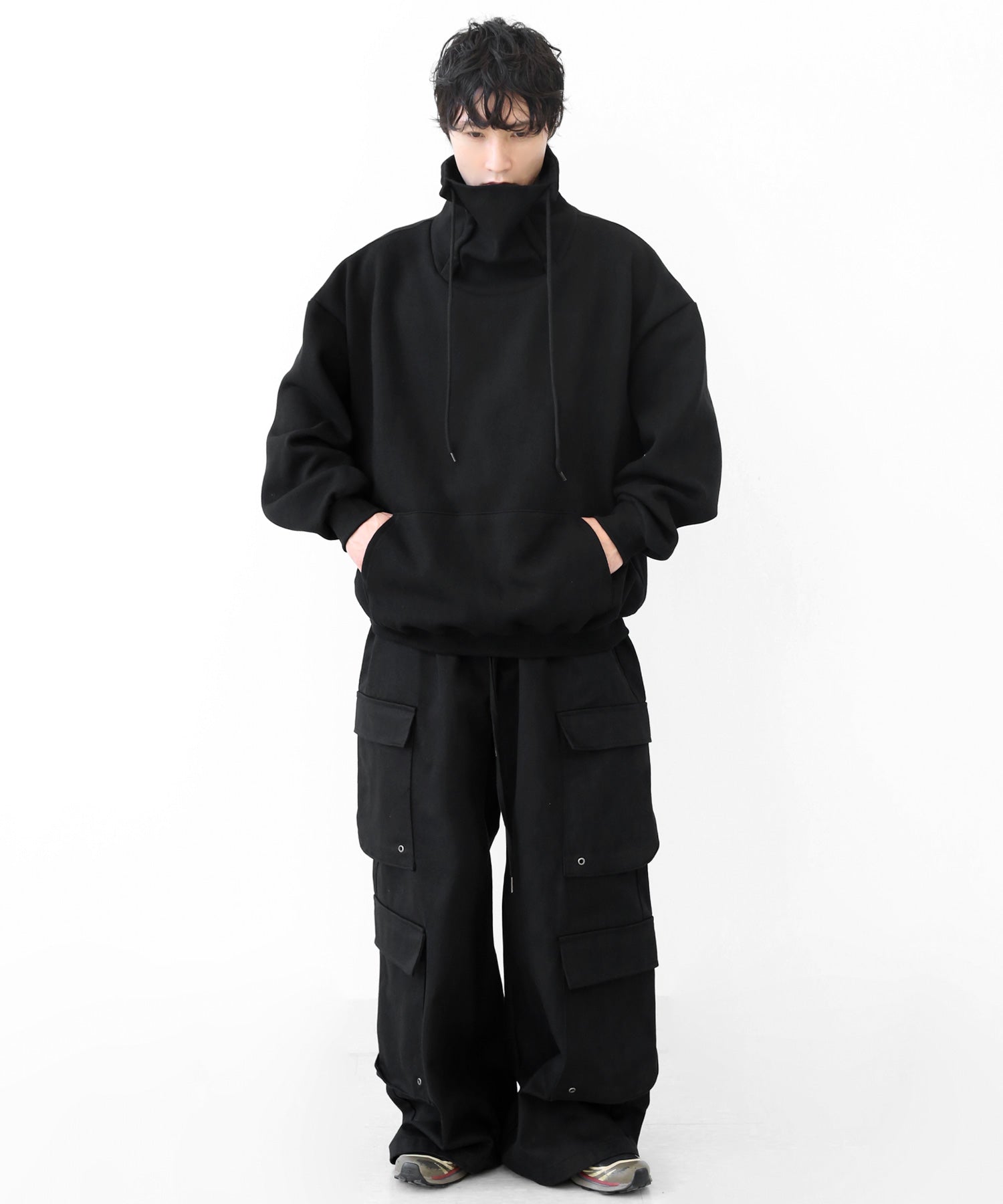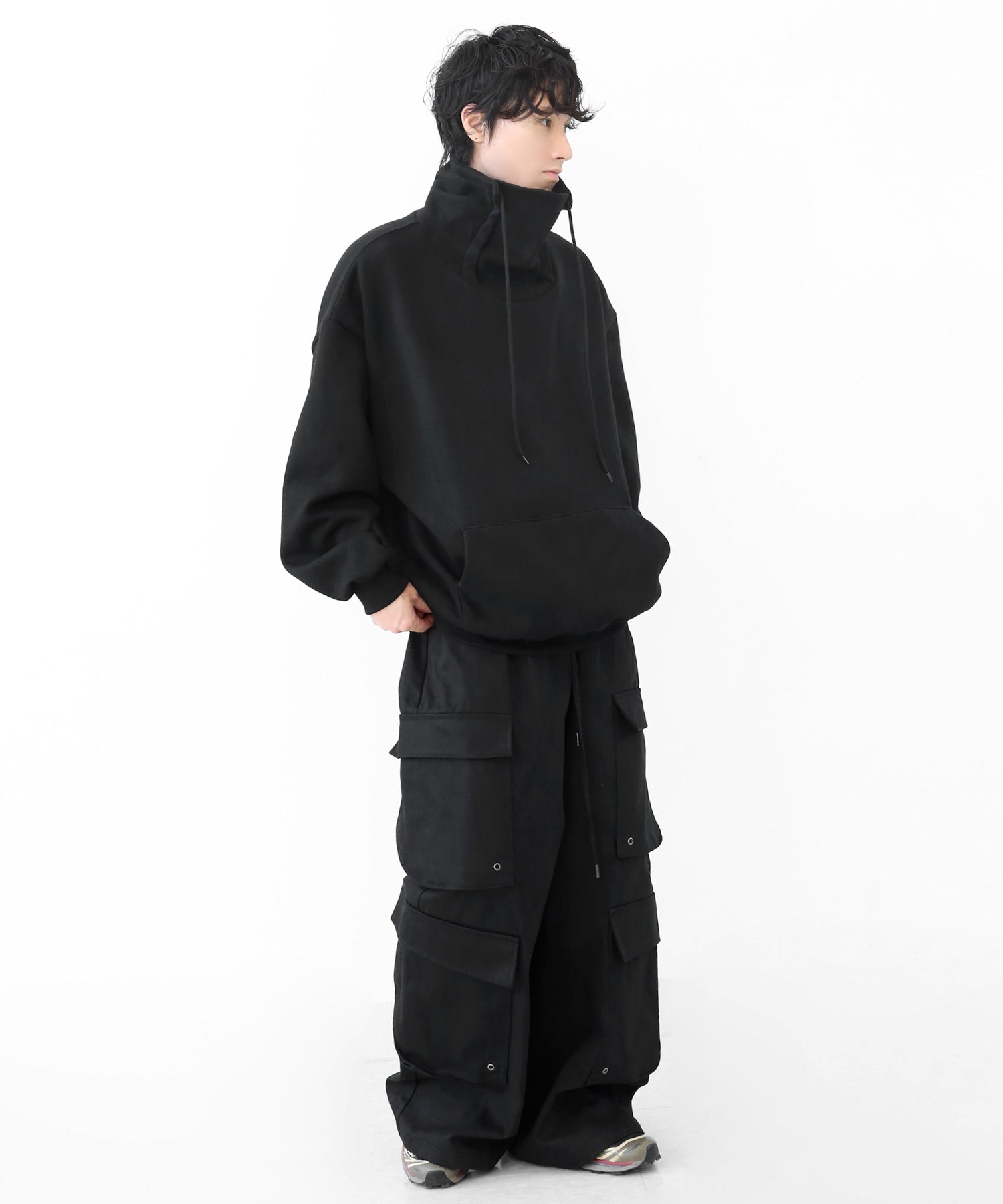 An oversized high-neck sweatshirt with a voluminous silhouette that wraps the neck for warmth and modern edge.