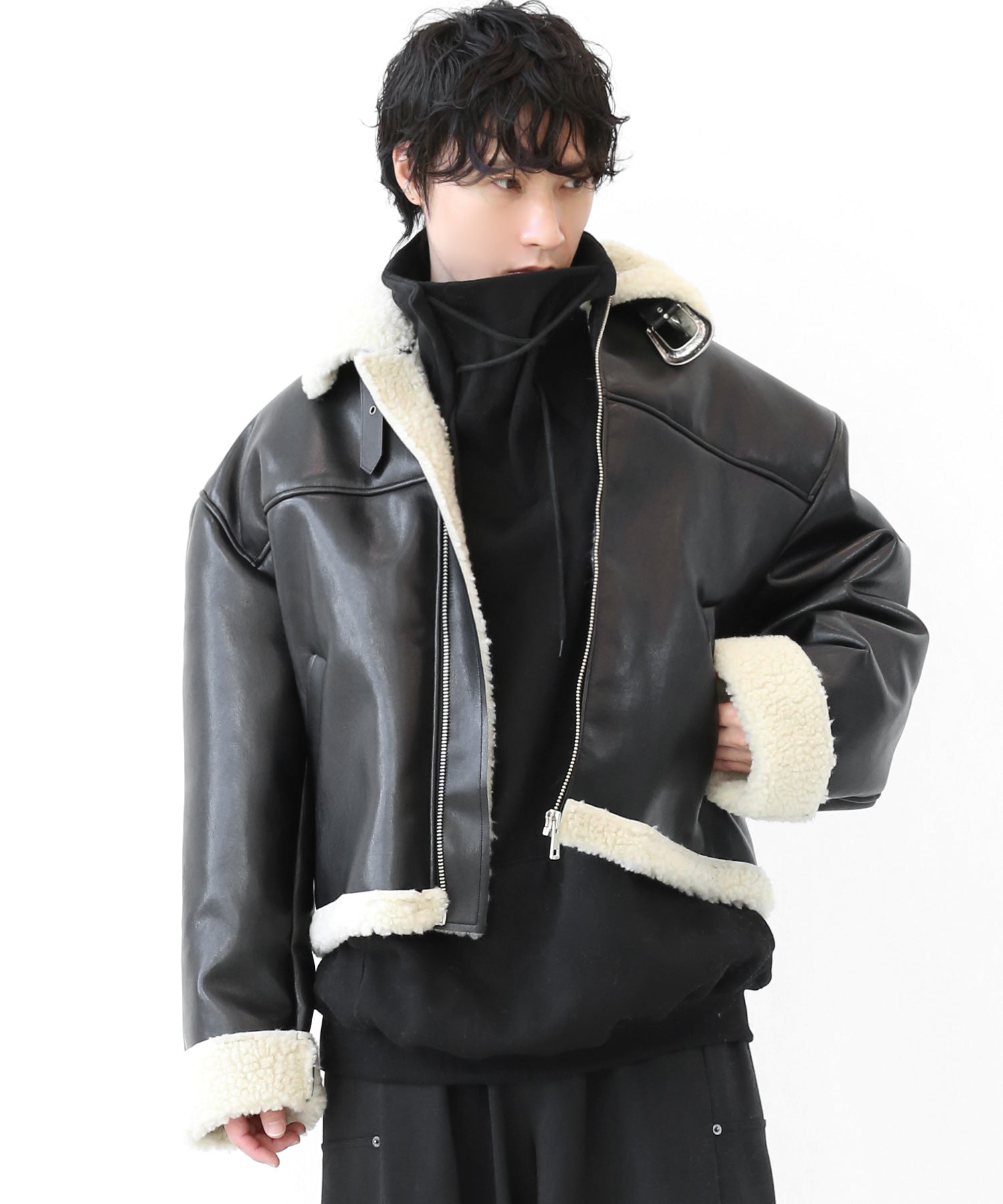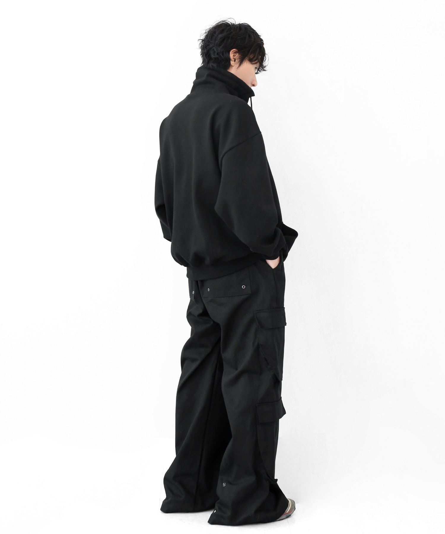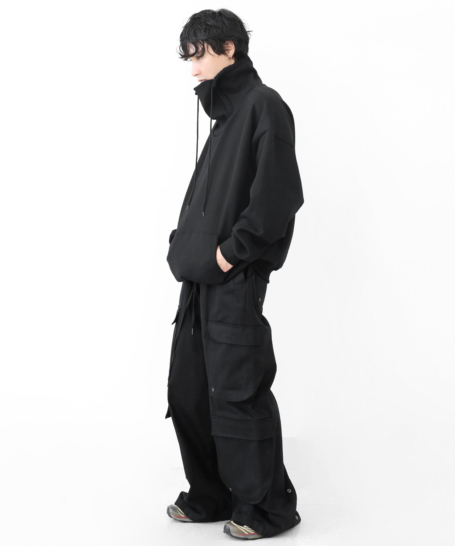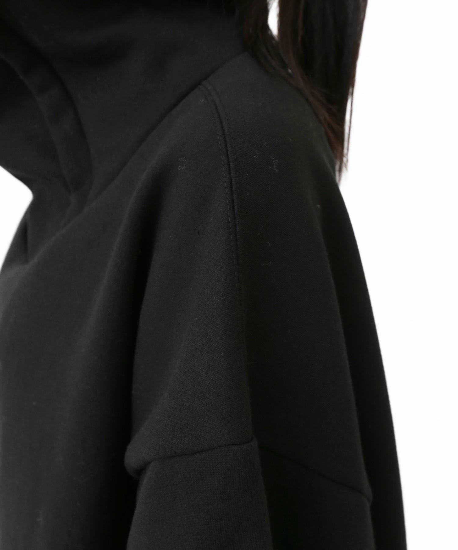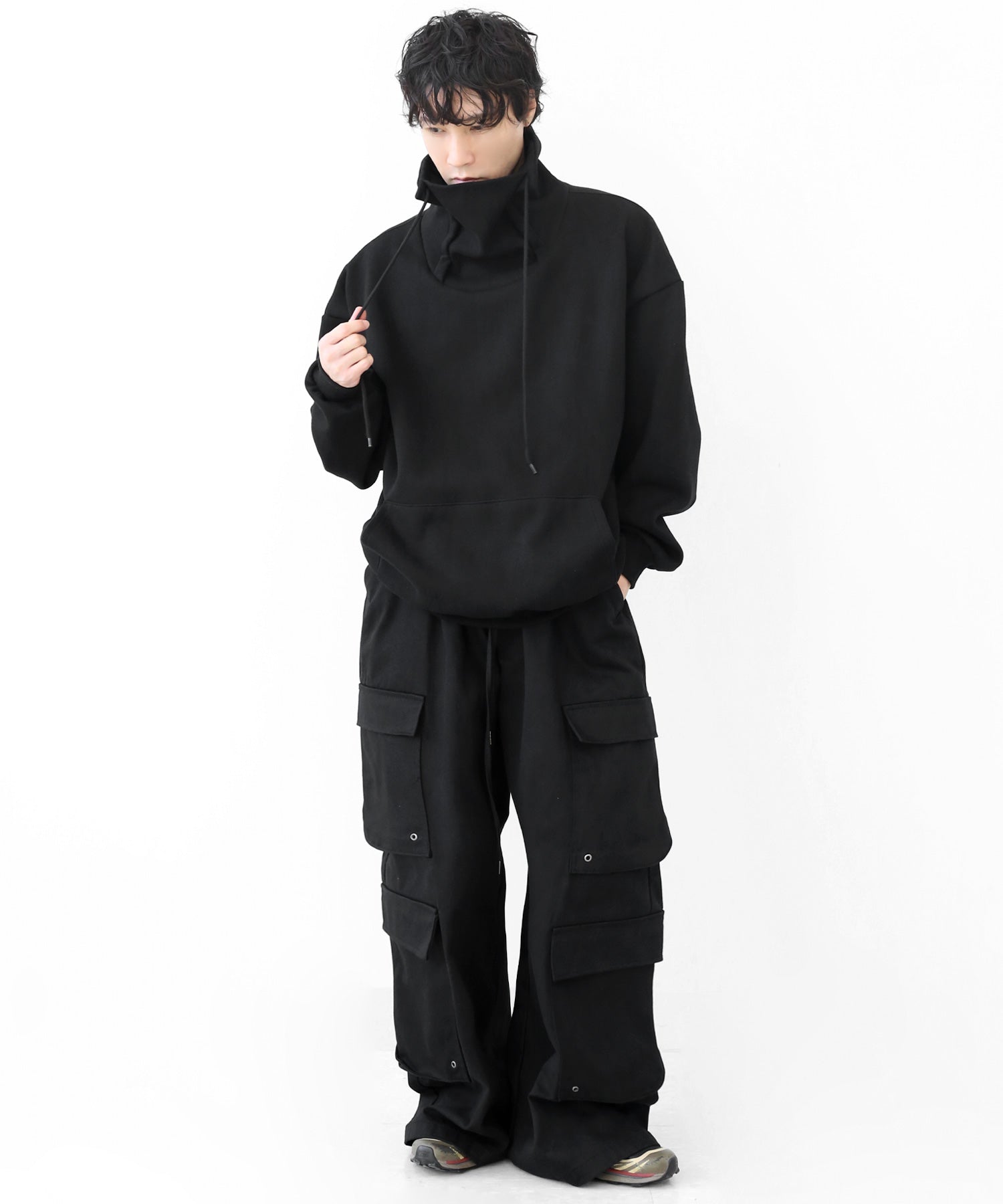 An oversized high-neck sweatshirt with a voluminous silhouette that wraps the neck for warmth and modern edge.