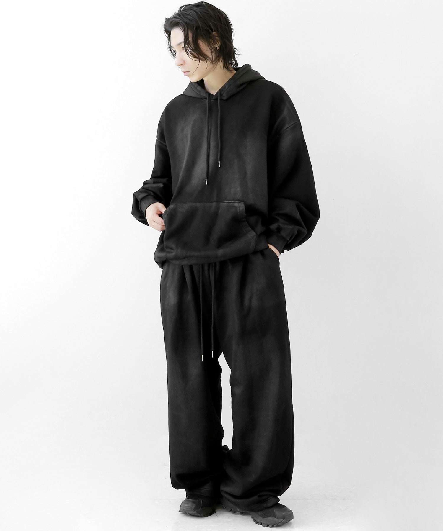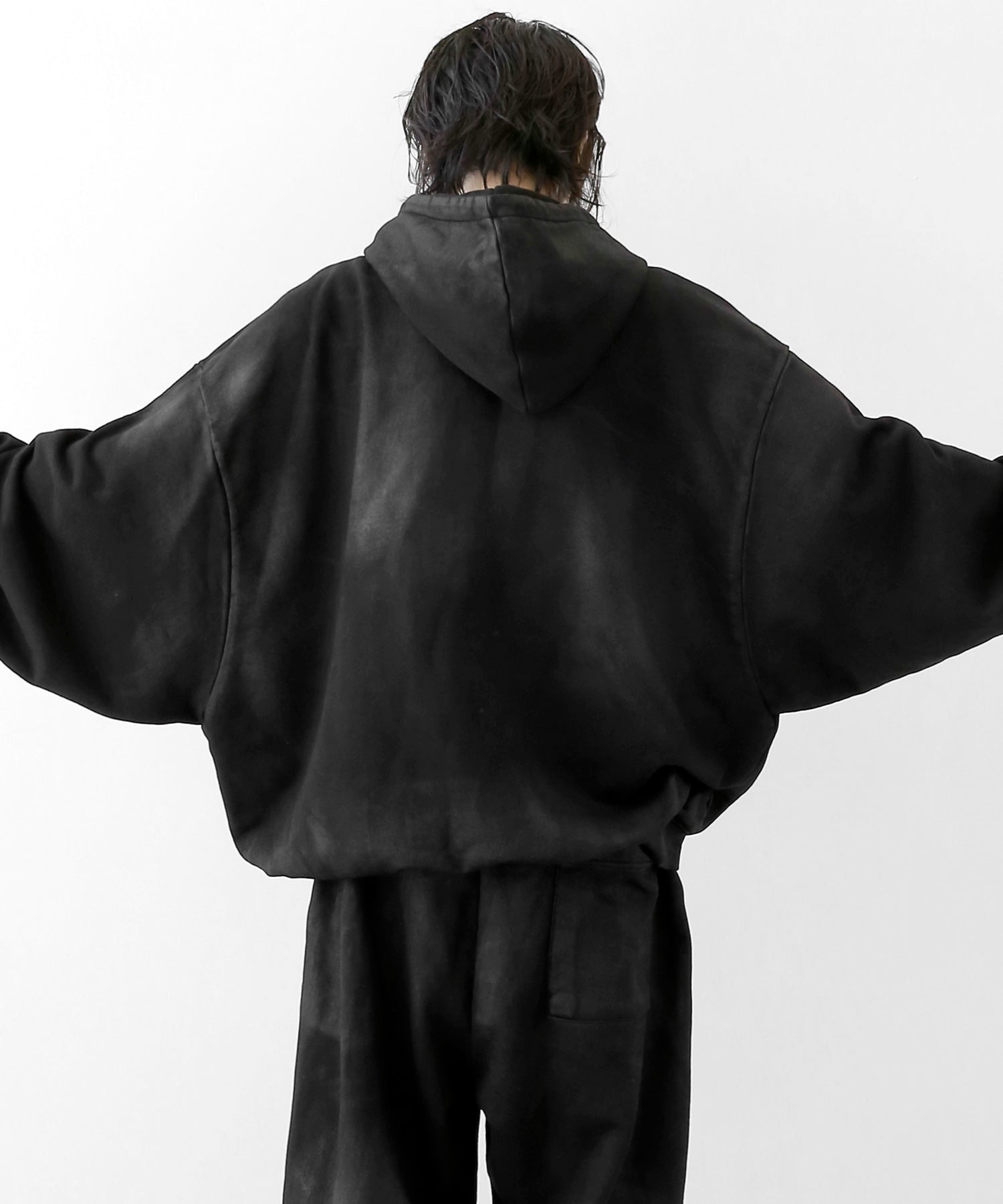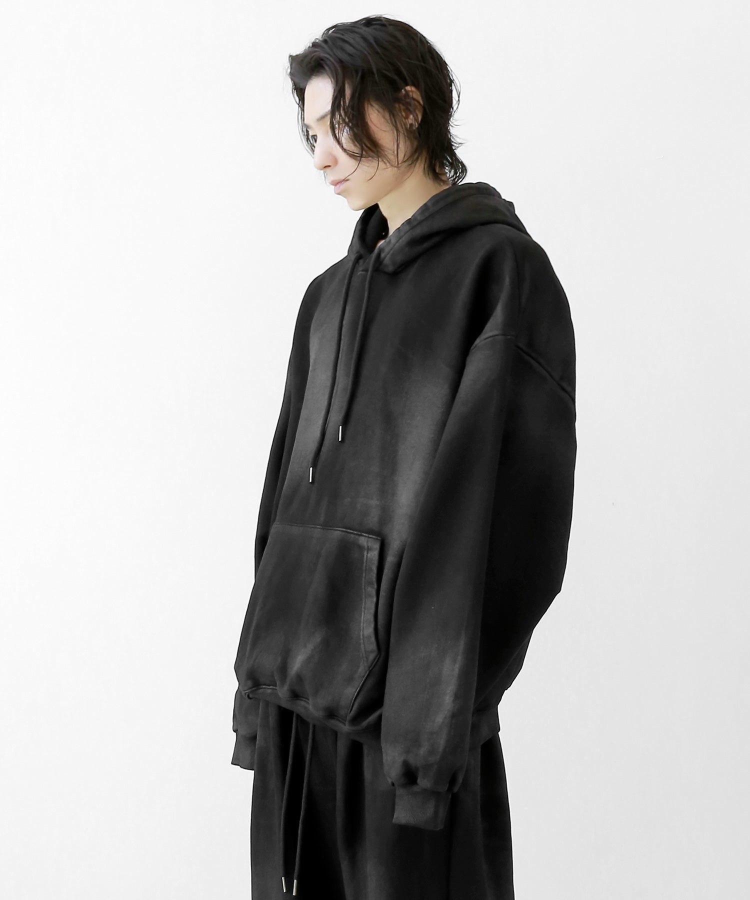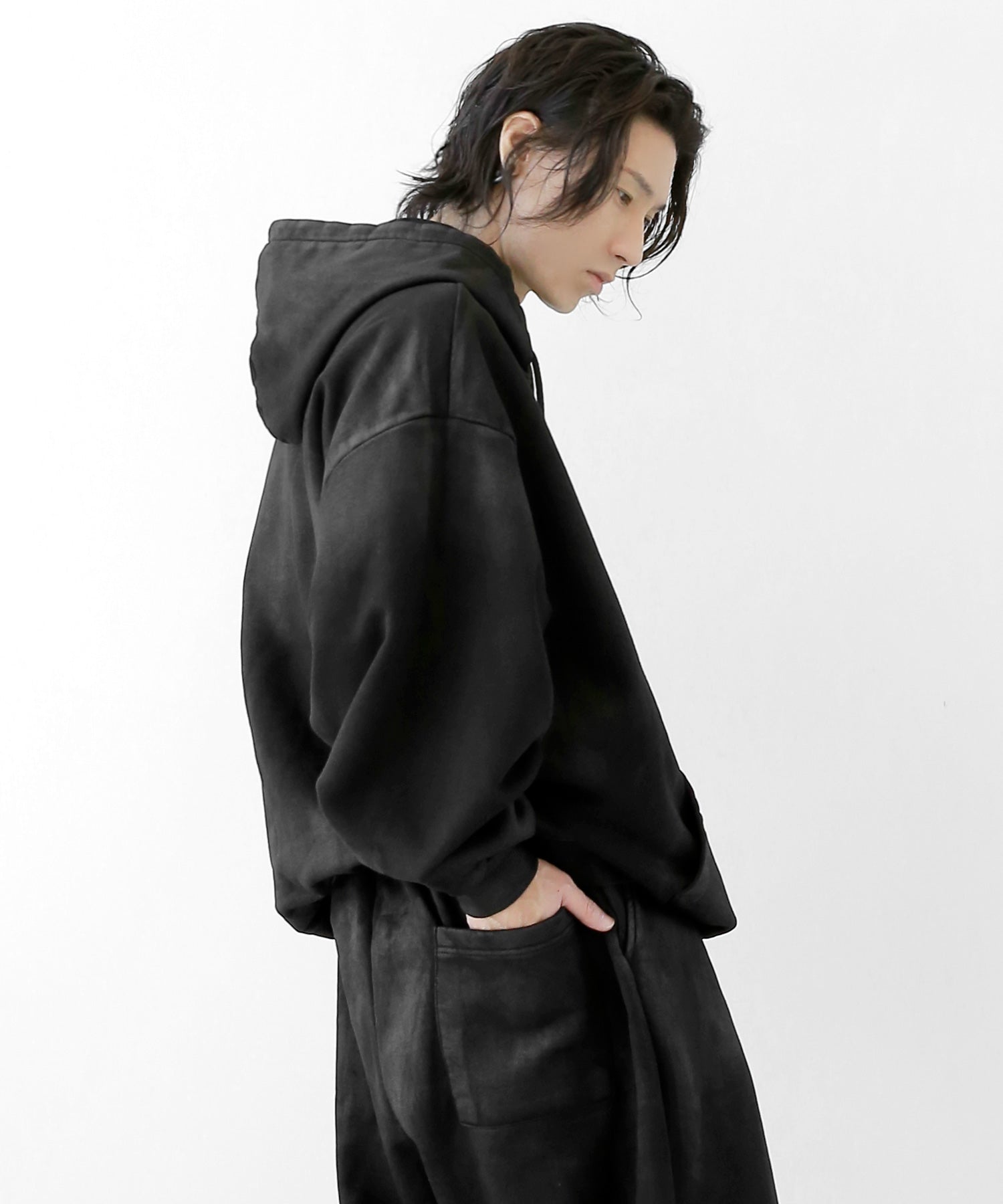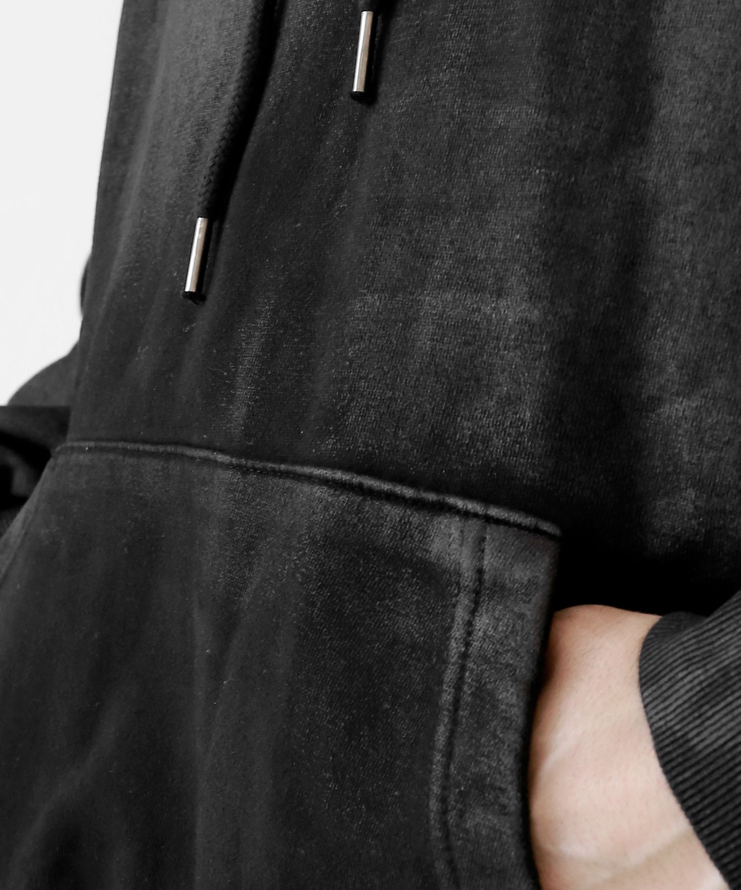 A heavy hoodie featuring rich pigment processing with a subtle sheen and deep dark tone. The oversized silhouette and slightly faded finish bring a refined yet street-ready mood, wearable solo or as a stylish set-up with matching pants.