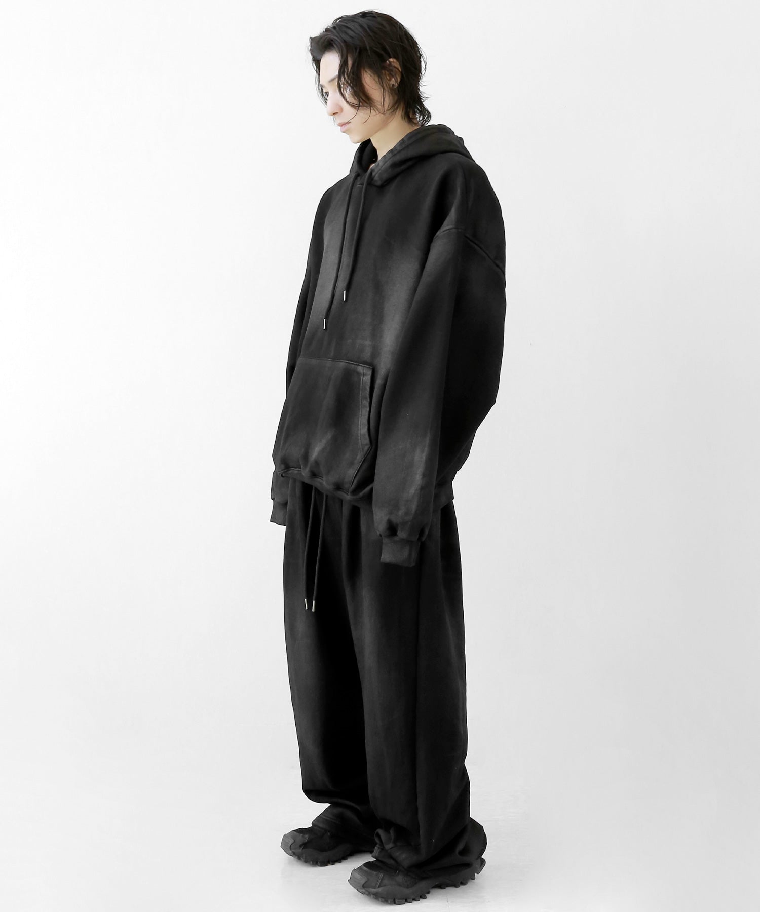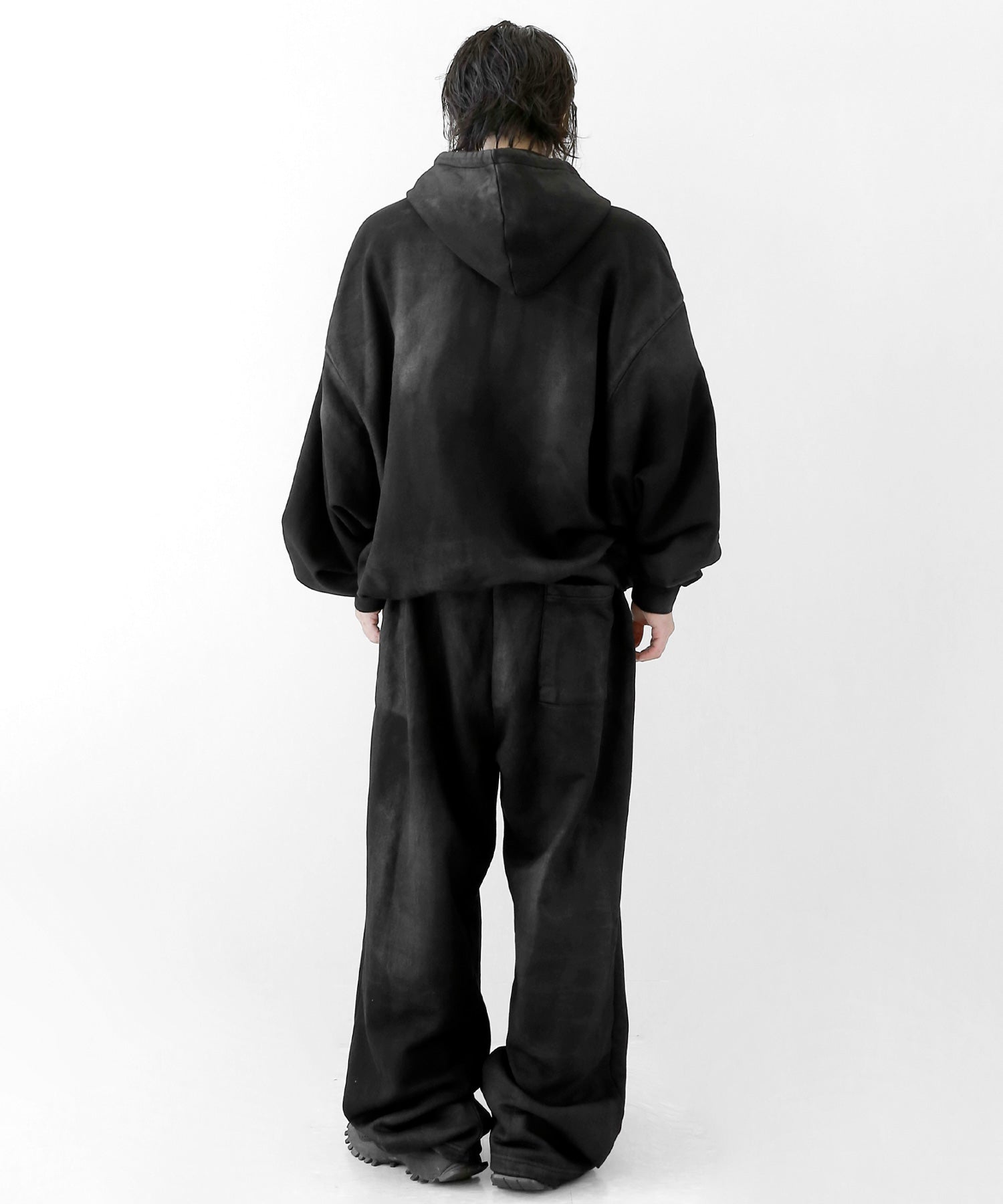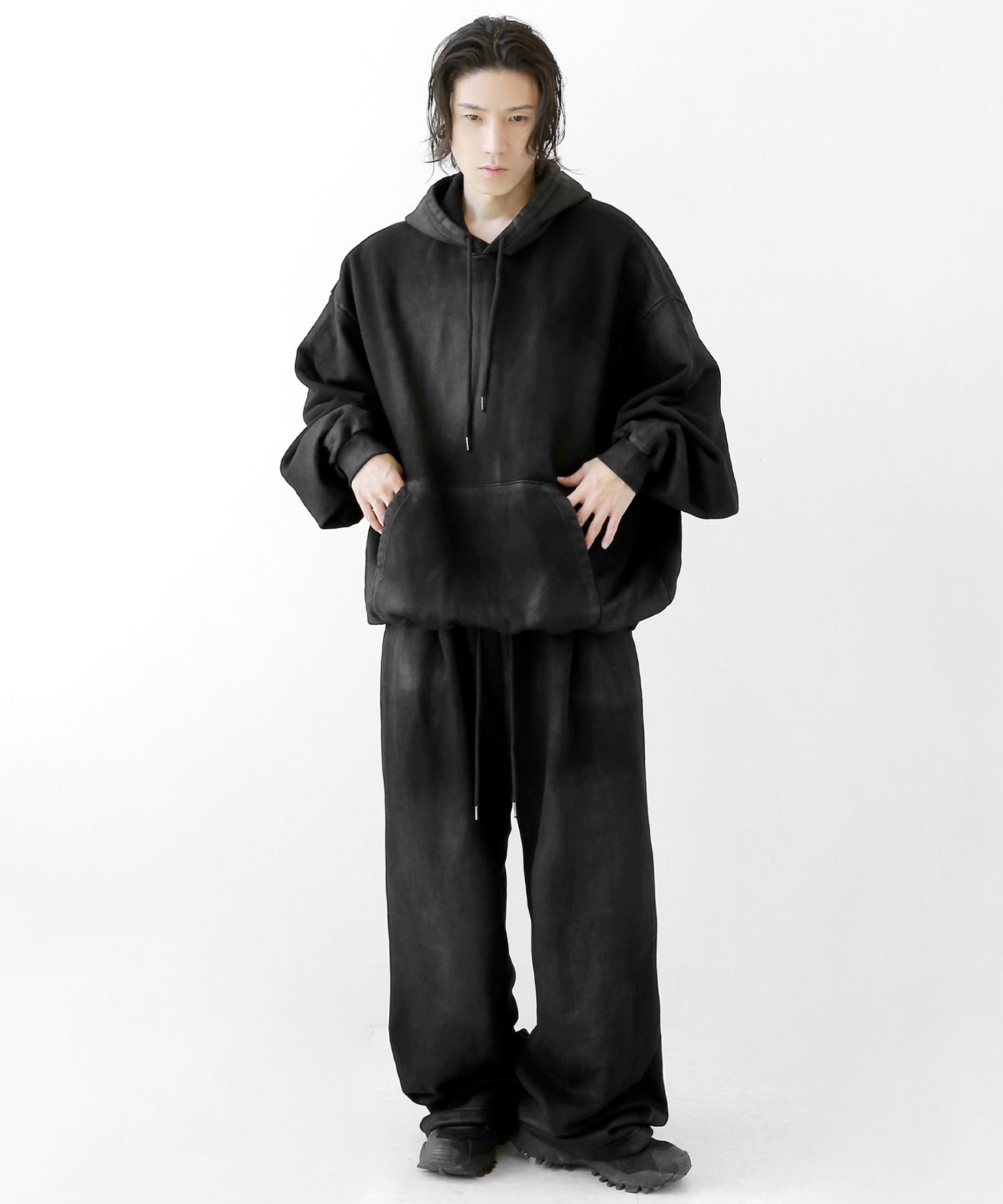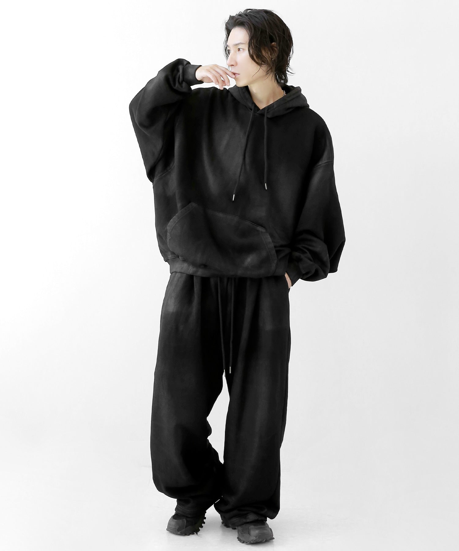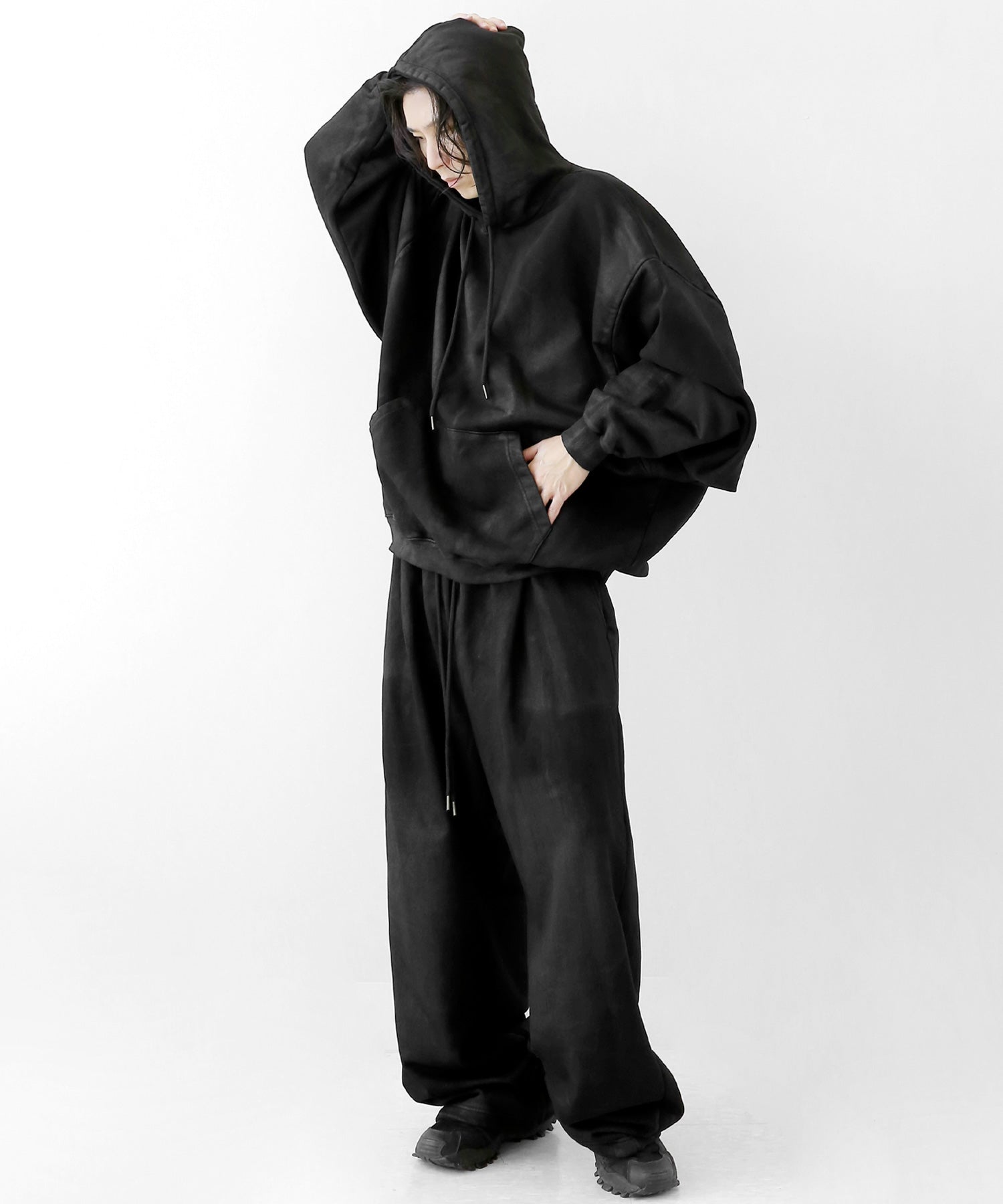 A heavy hoodie featuring rich pigment processing with a subtle sheen and deep dark tone. The oversized silhouette and slightly faded finish bring a refined yet street-ready mood, wearable solo or as a stylish set-up with matching pants.