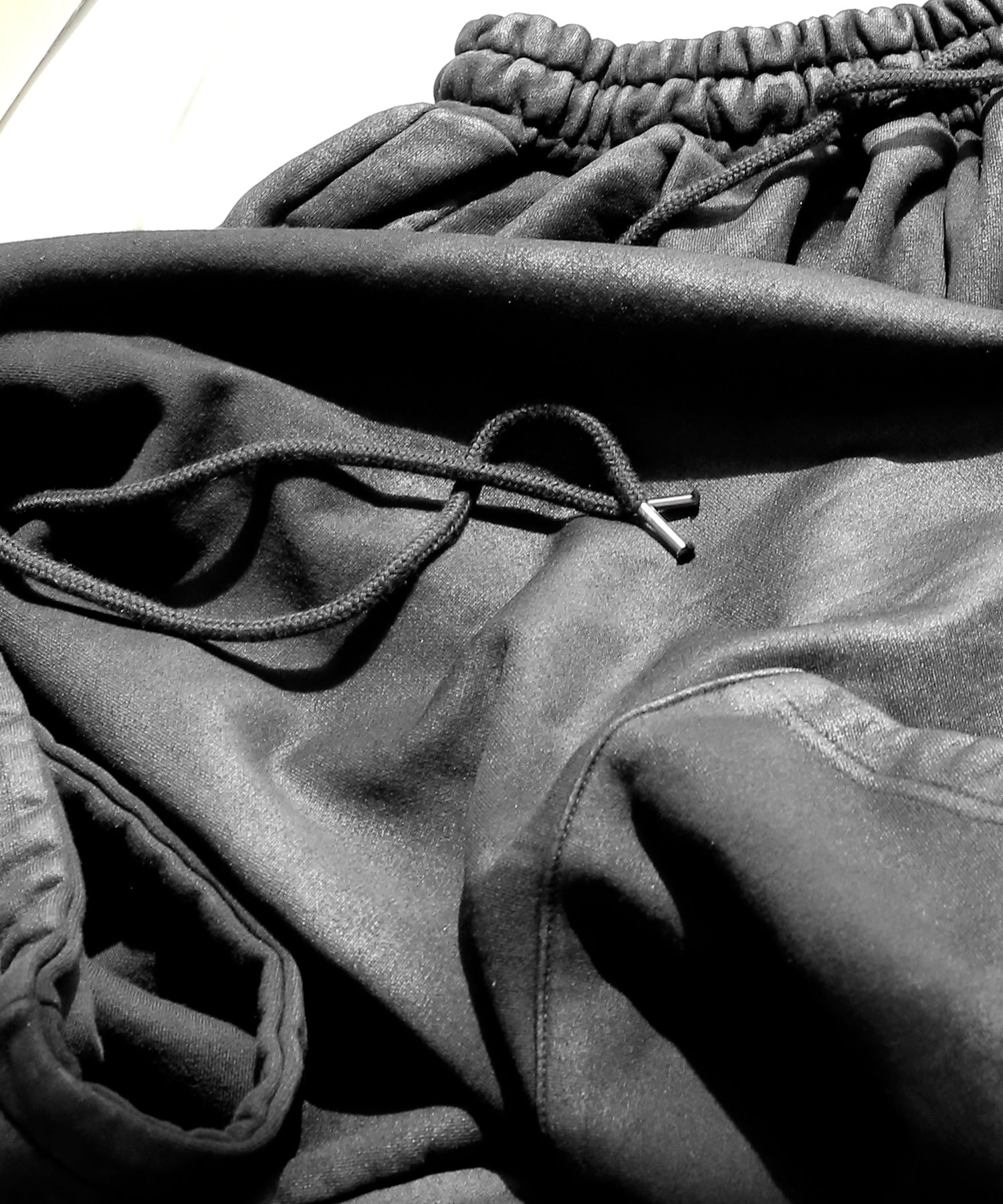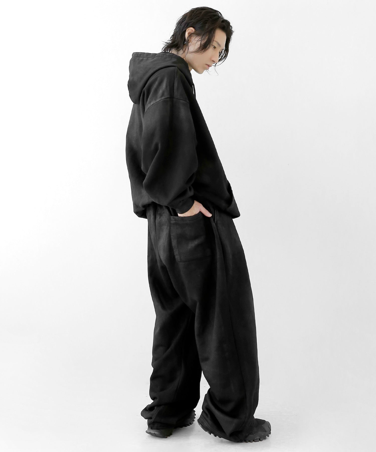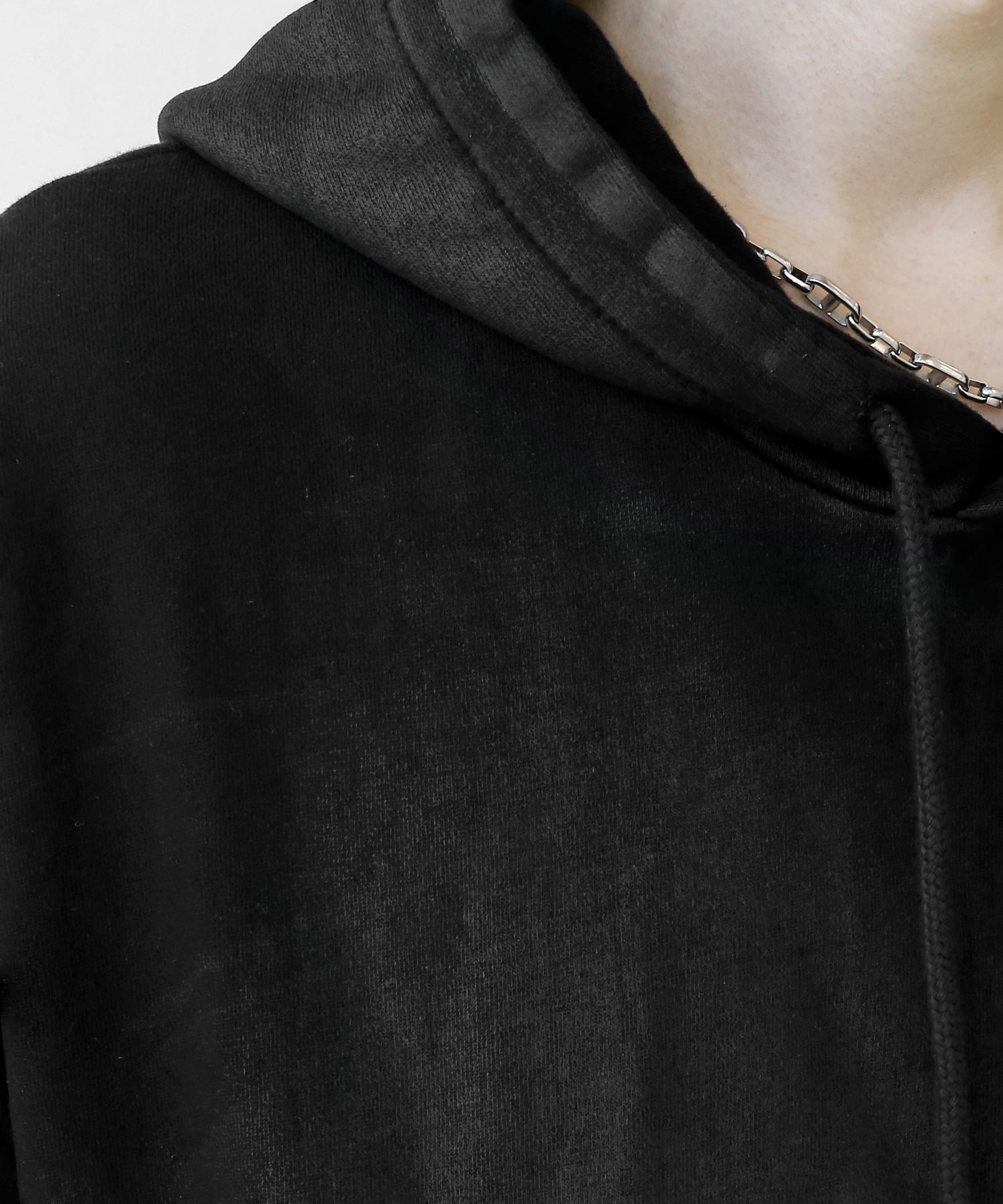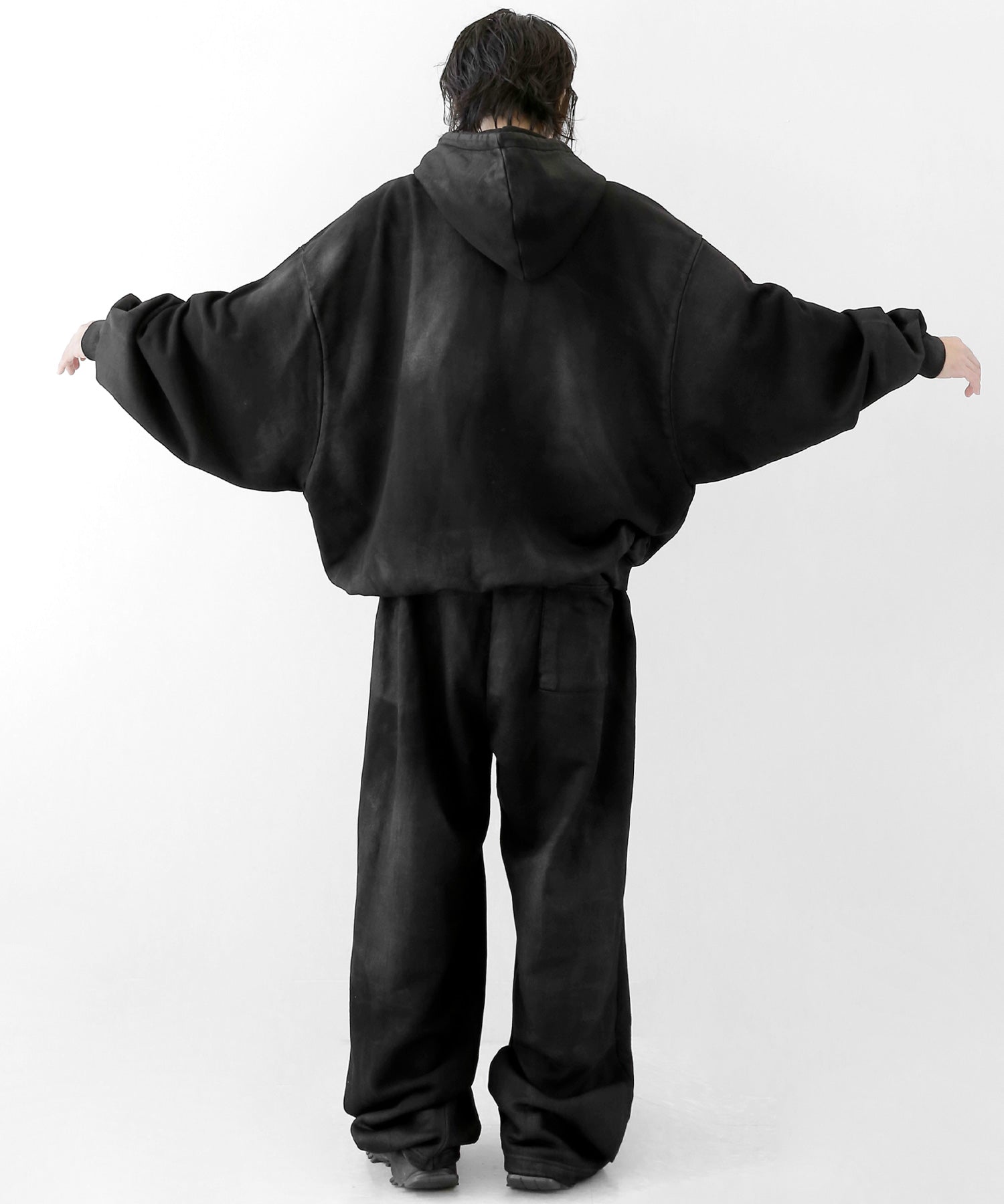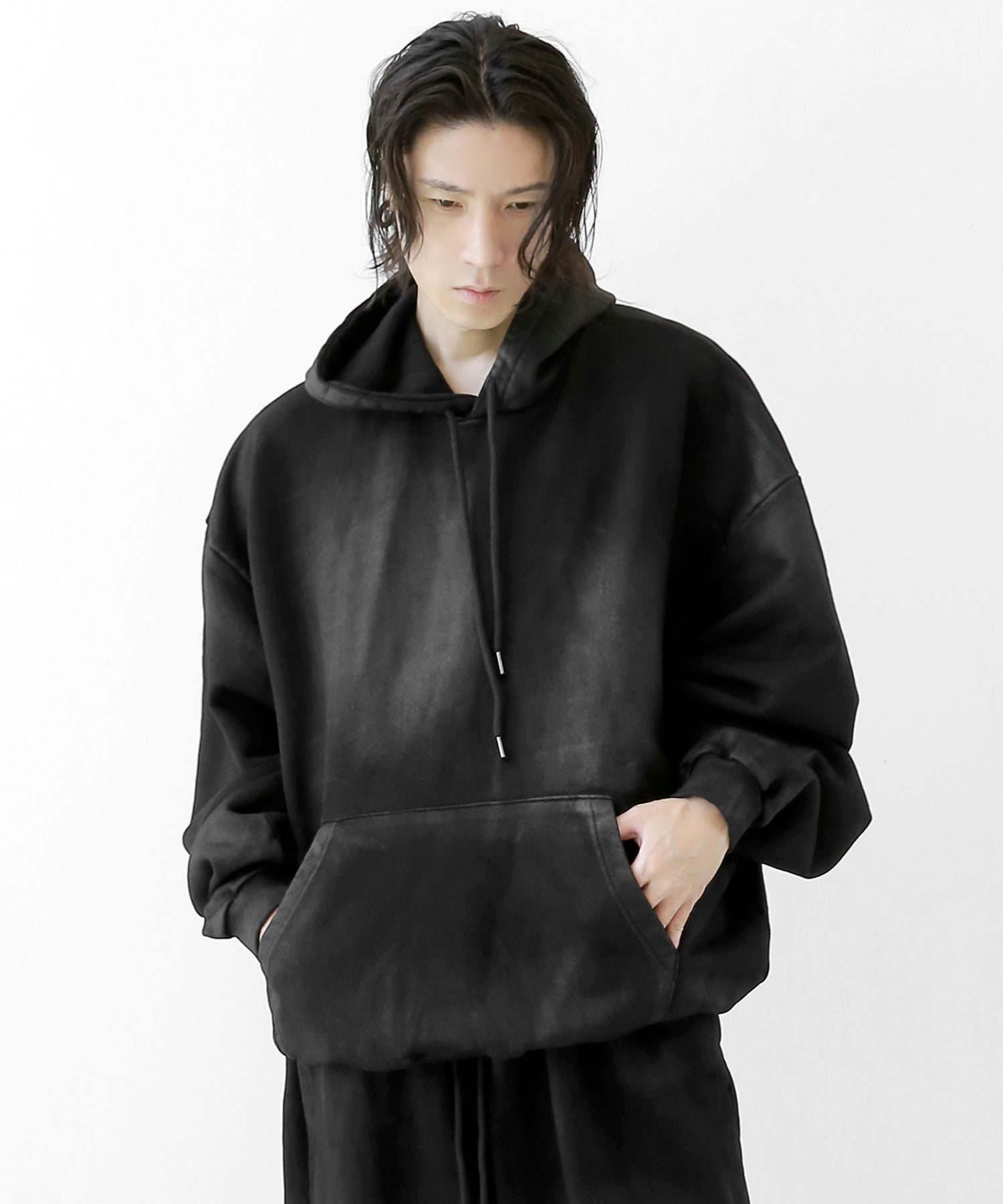 A heavy hoodie featuring rich pigment processing with a subtle sheen and deep dark tone. The oversized silhouette and slightly faded finish bring a refined yet street-ready mood, wearable solo or as a stylish set-up with matching pants.