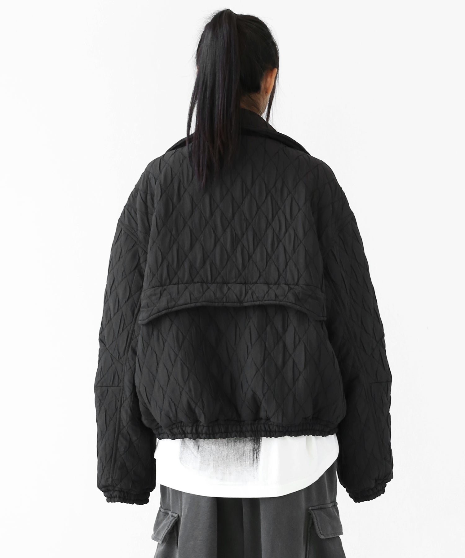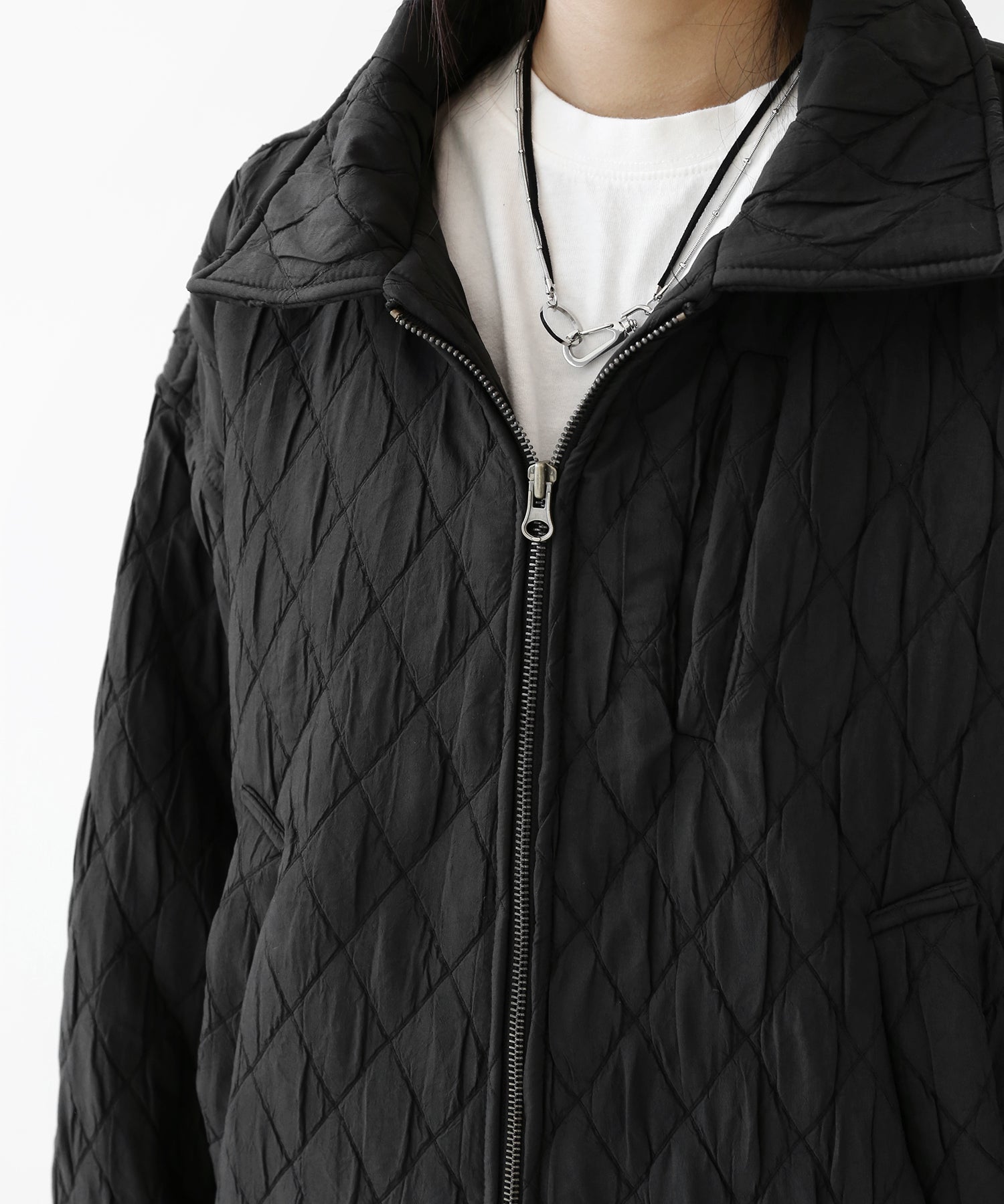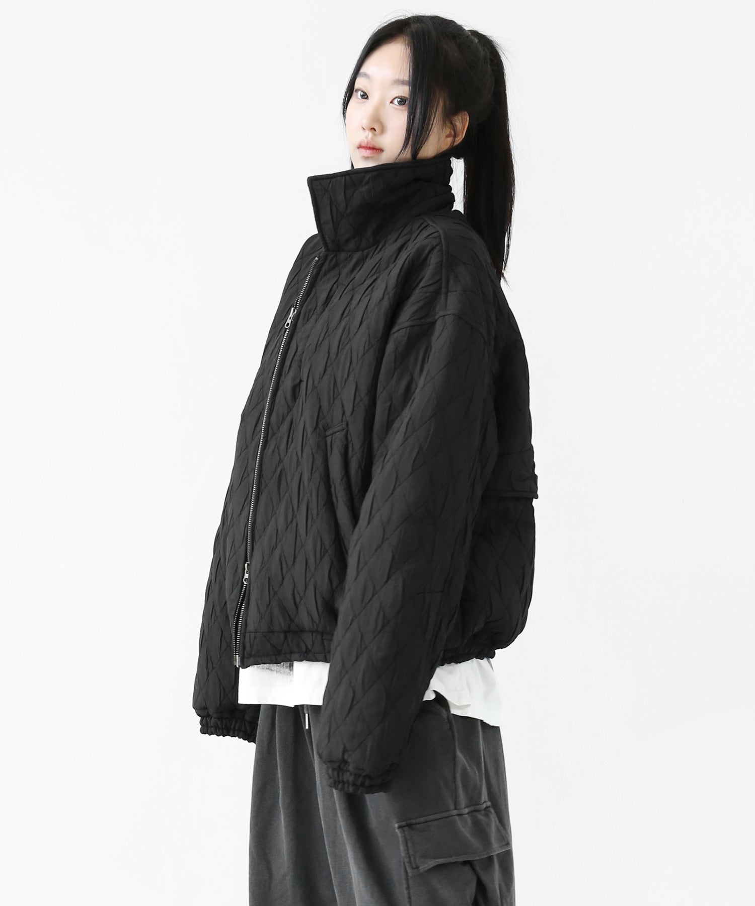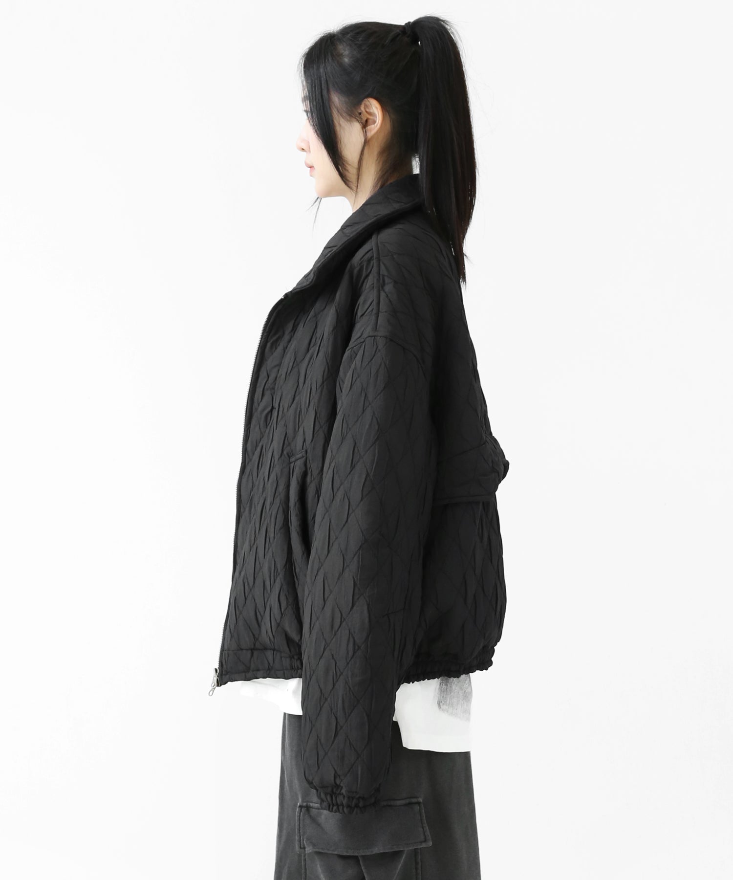 A lightweight yet warm blouson featuring a dimensional diamond-quilted design and a versatile 2-way zipper. Its clean, urban look balances sophistication and casual ease, making it a seasonless outerwear essential.