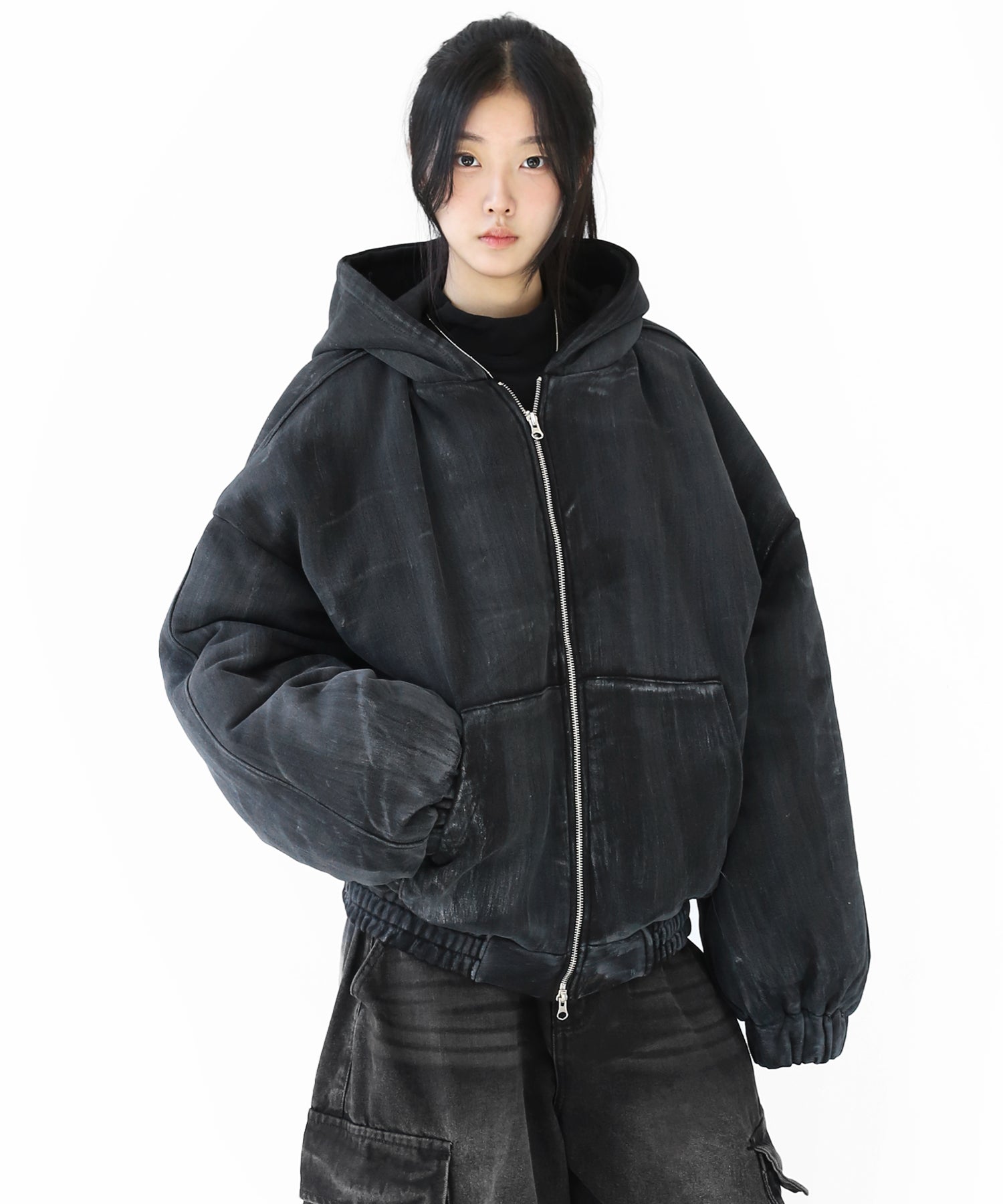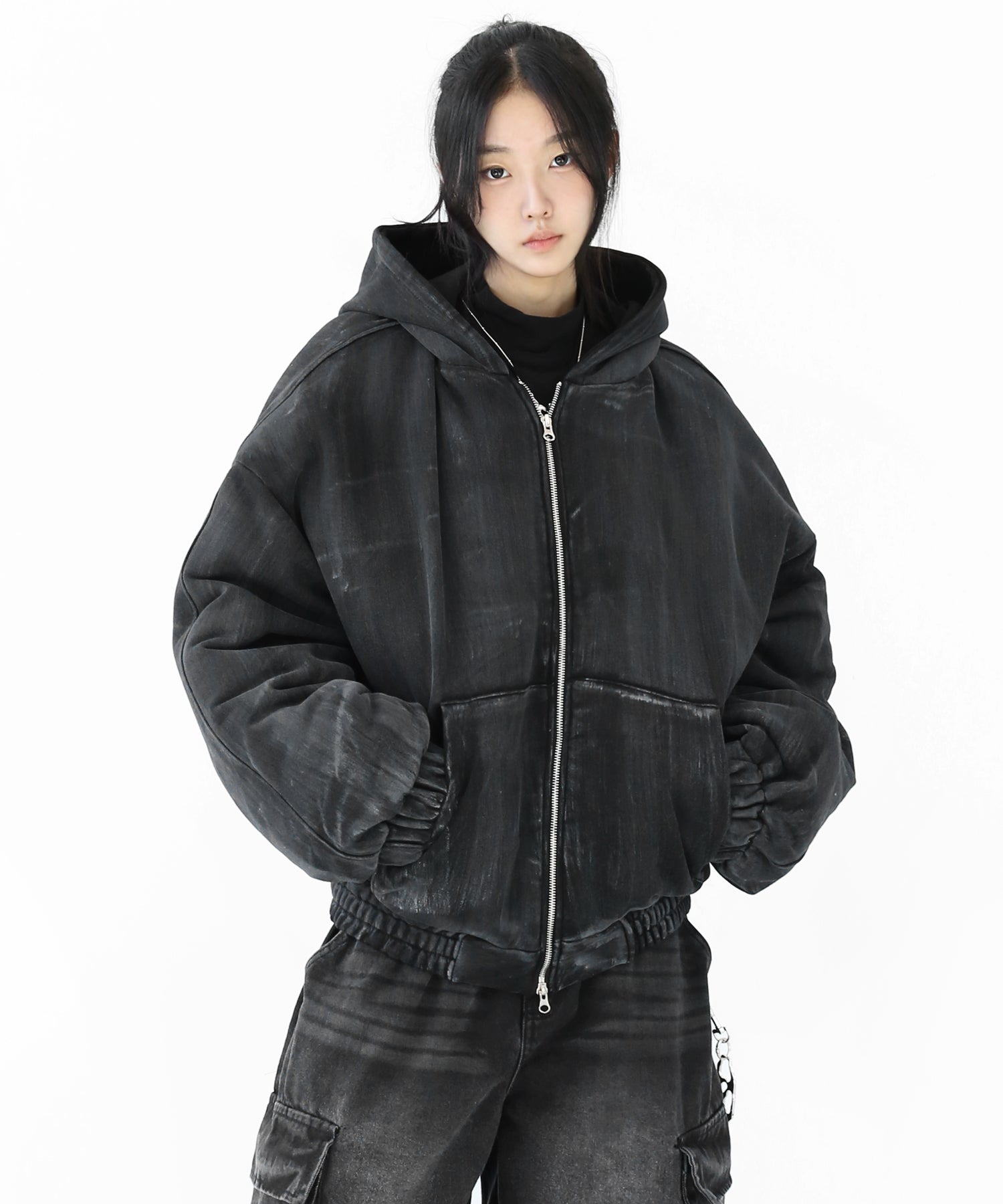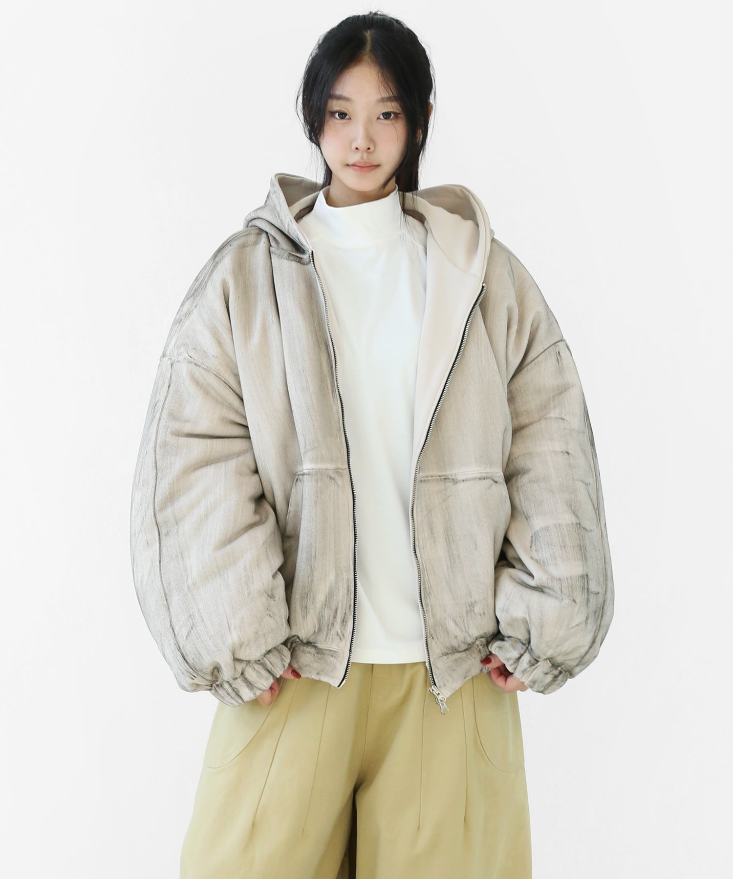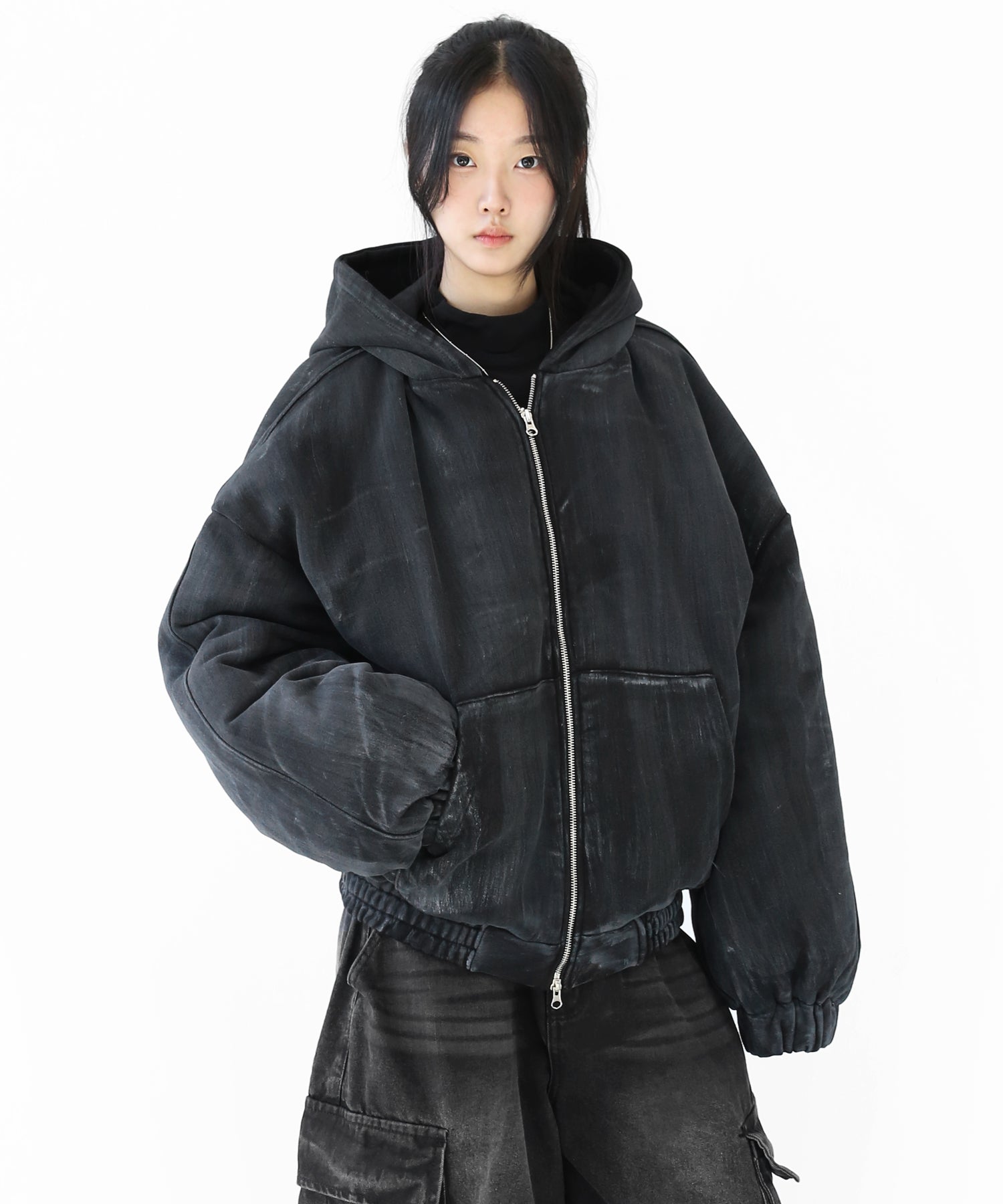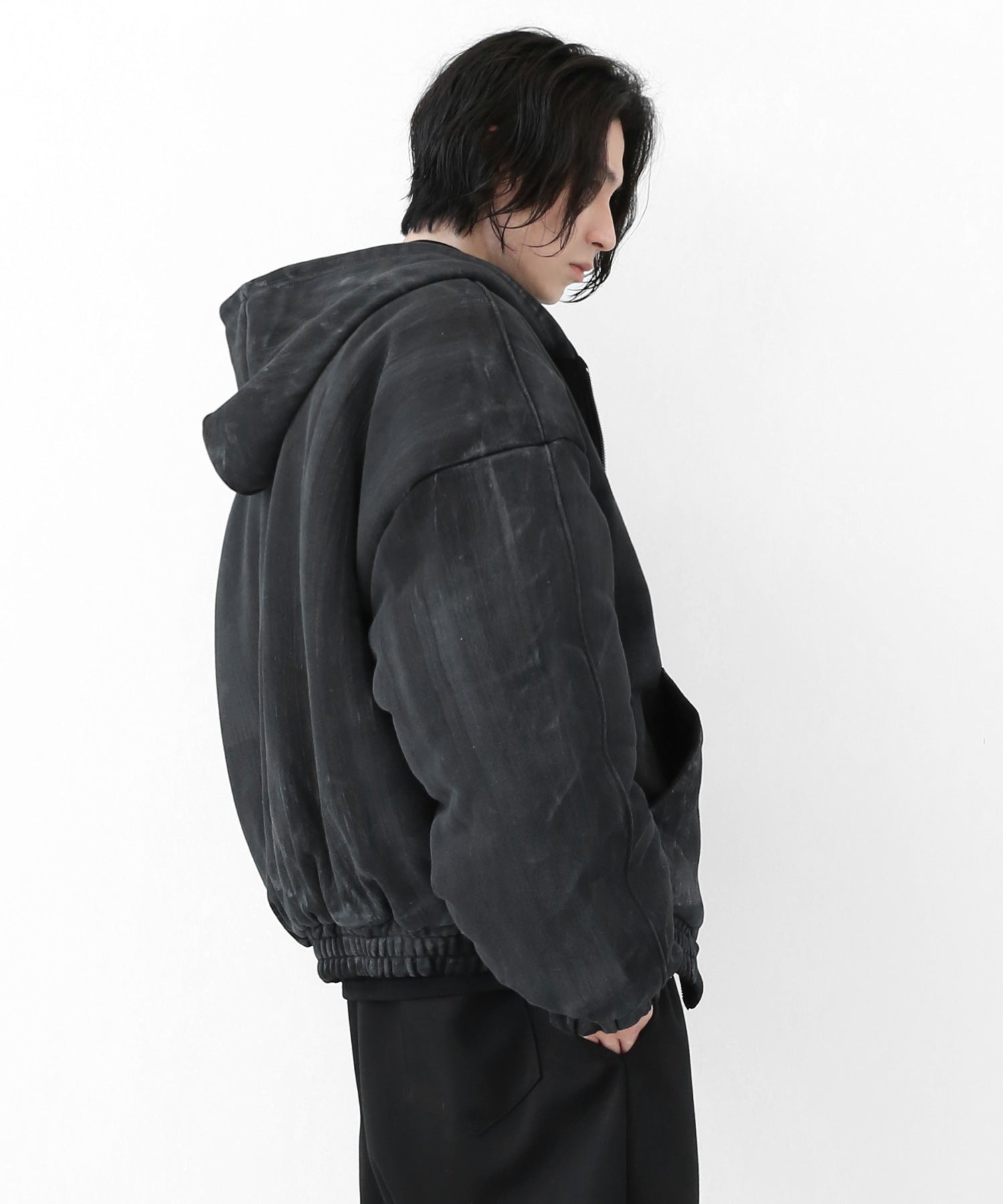 A vintage-inspired hooded jacket featuring an oil-stain fade that adds depth and a distinct street mood. With warm padding and a 2-zip construction, it offers flexible layering and a stylishly worn-in look that stands out effortlessly.