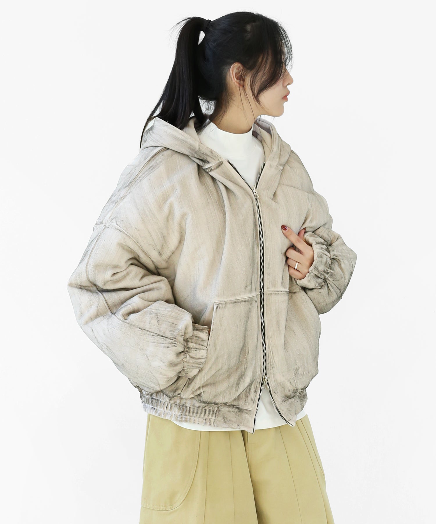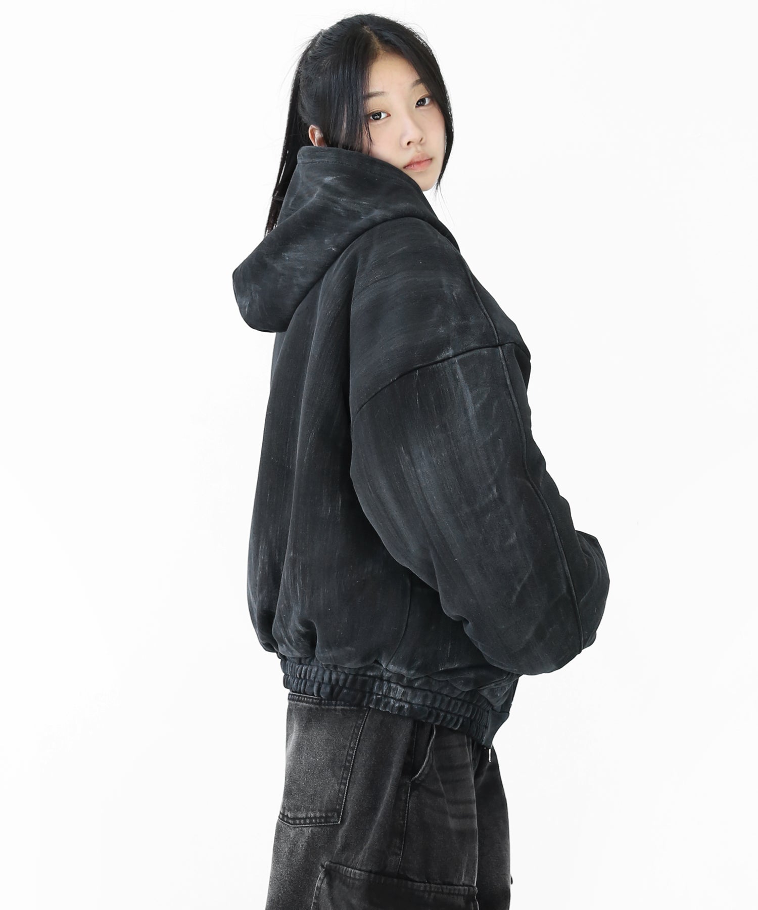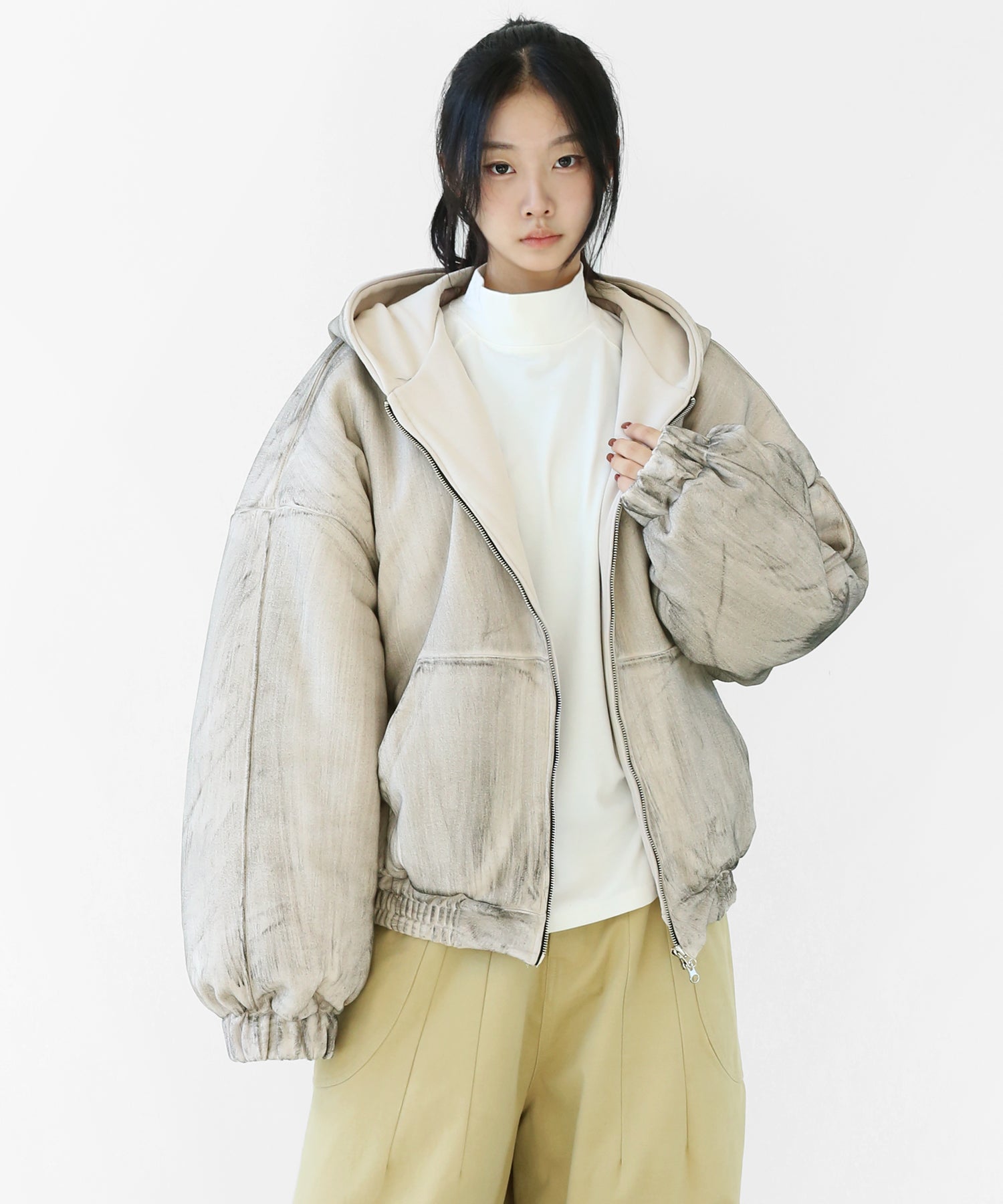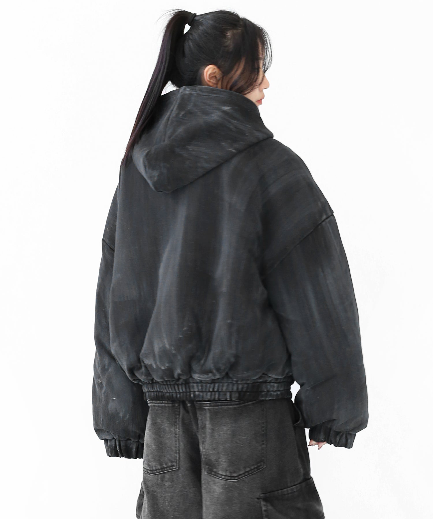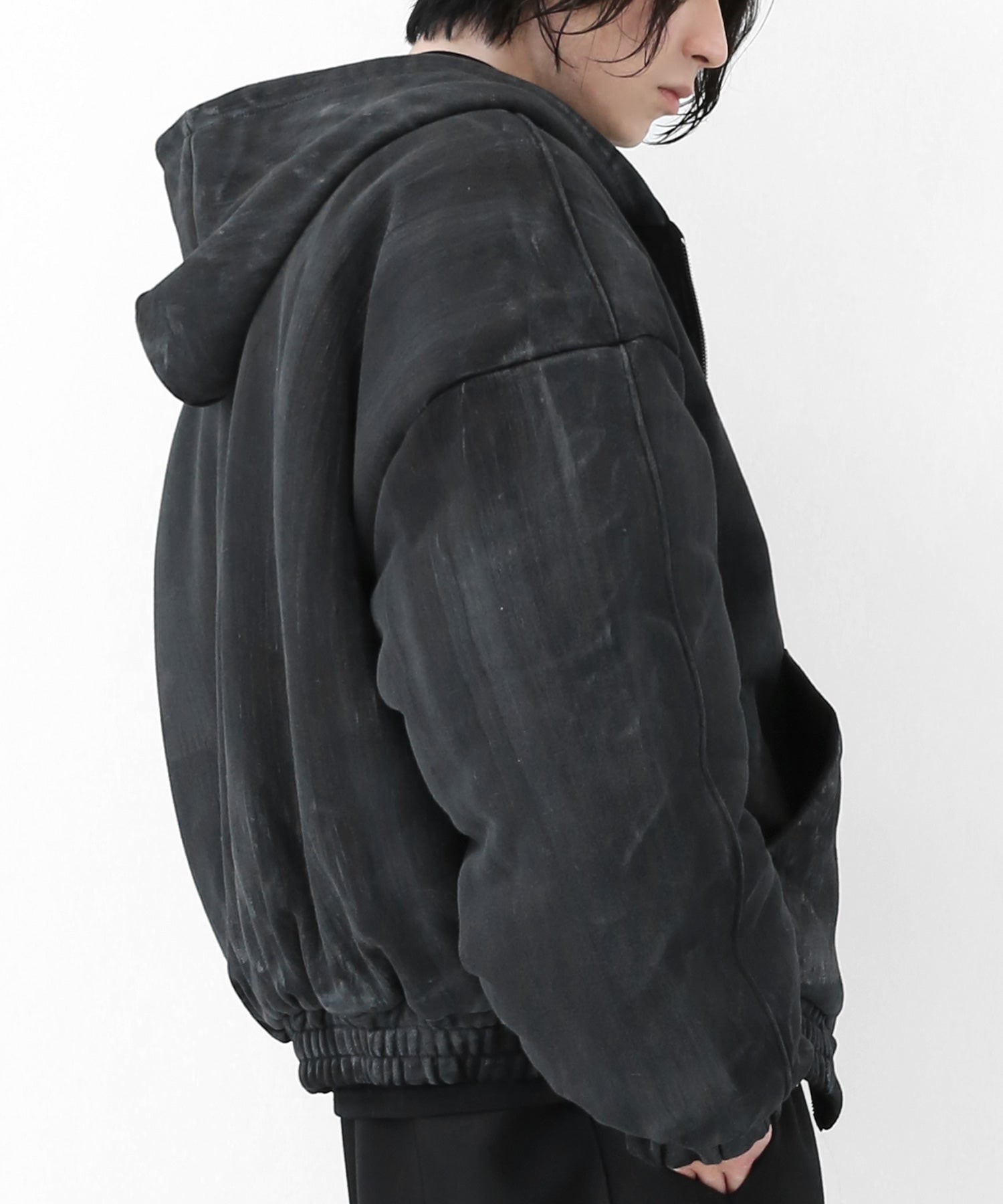 A vintage-inspired hooded jacket featuring an oil-stain fade that adds depth and a distinct street mood. With warm padding and a 2-zip construction, it offers flexible layering and a stylishly worn-in look that stands out effortlessly.