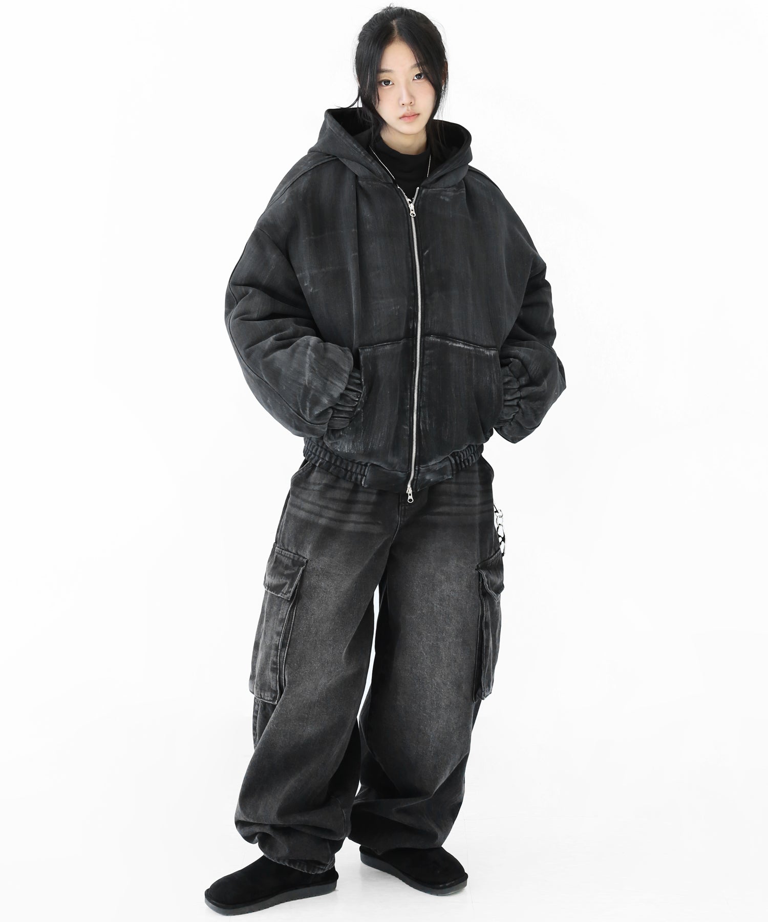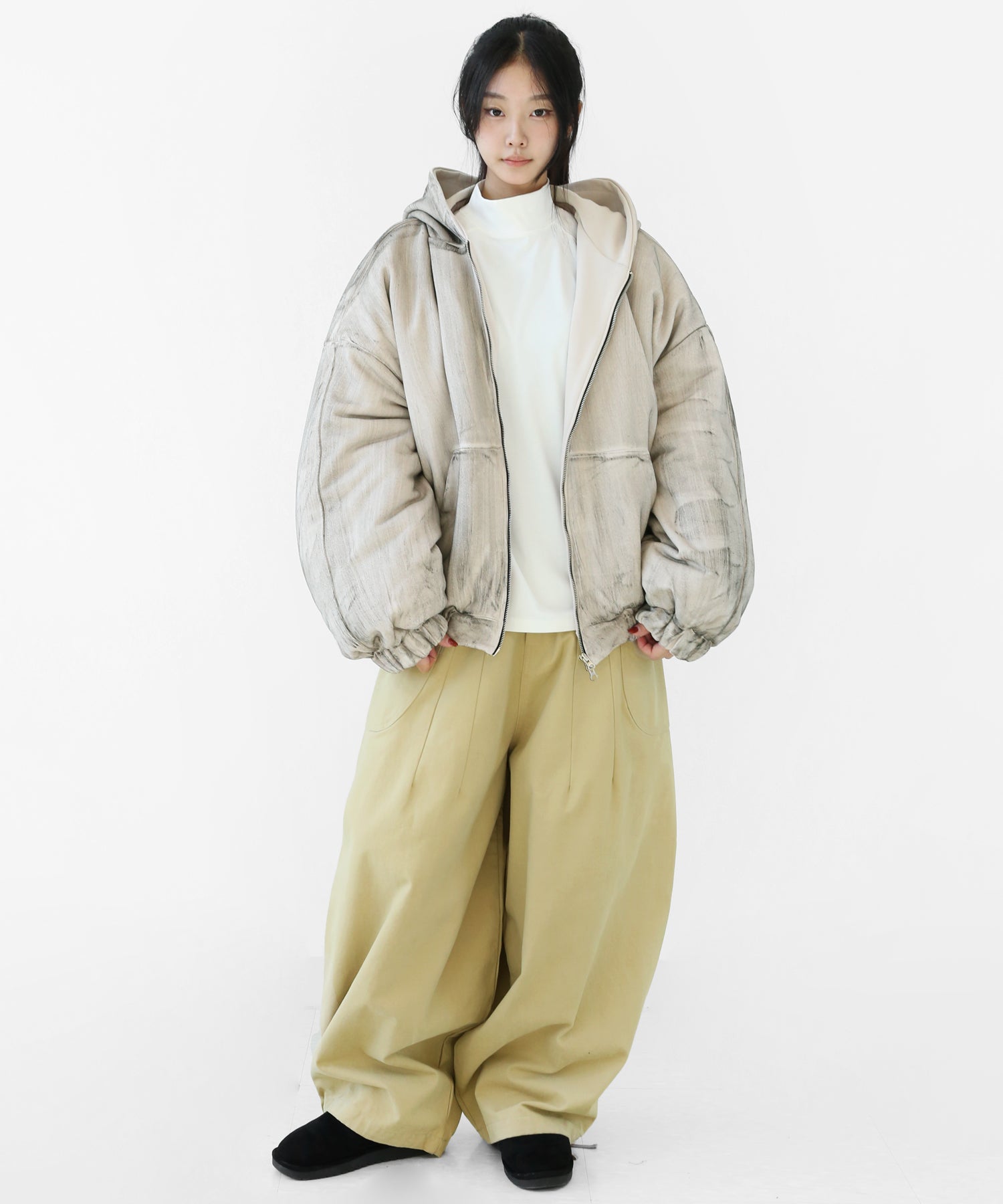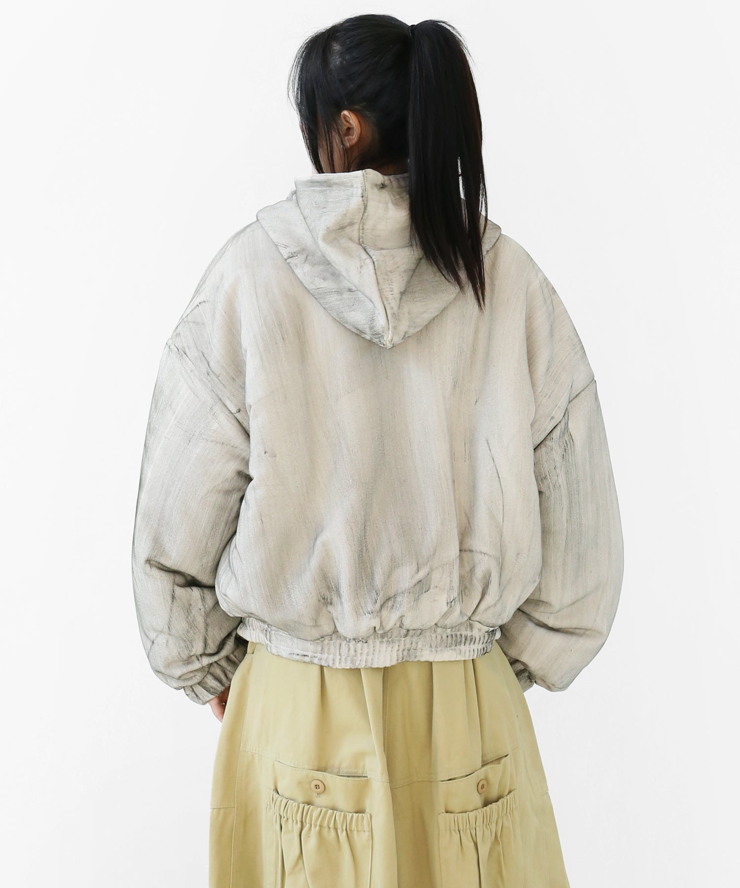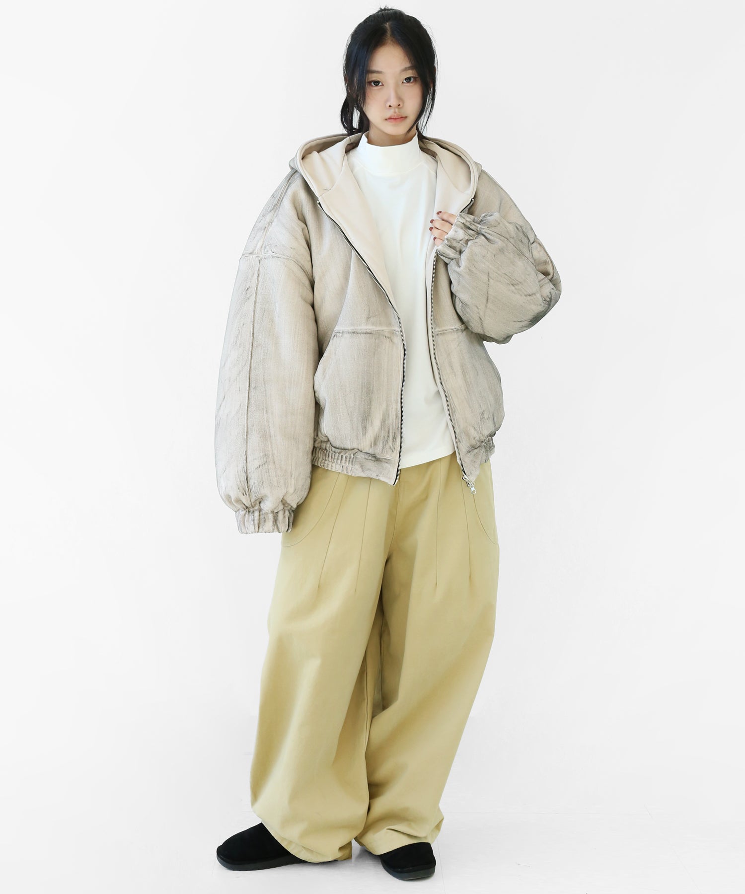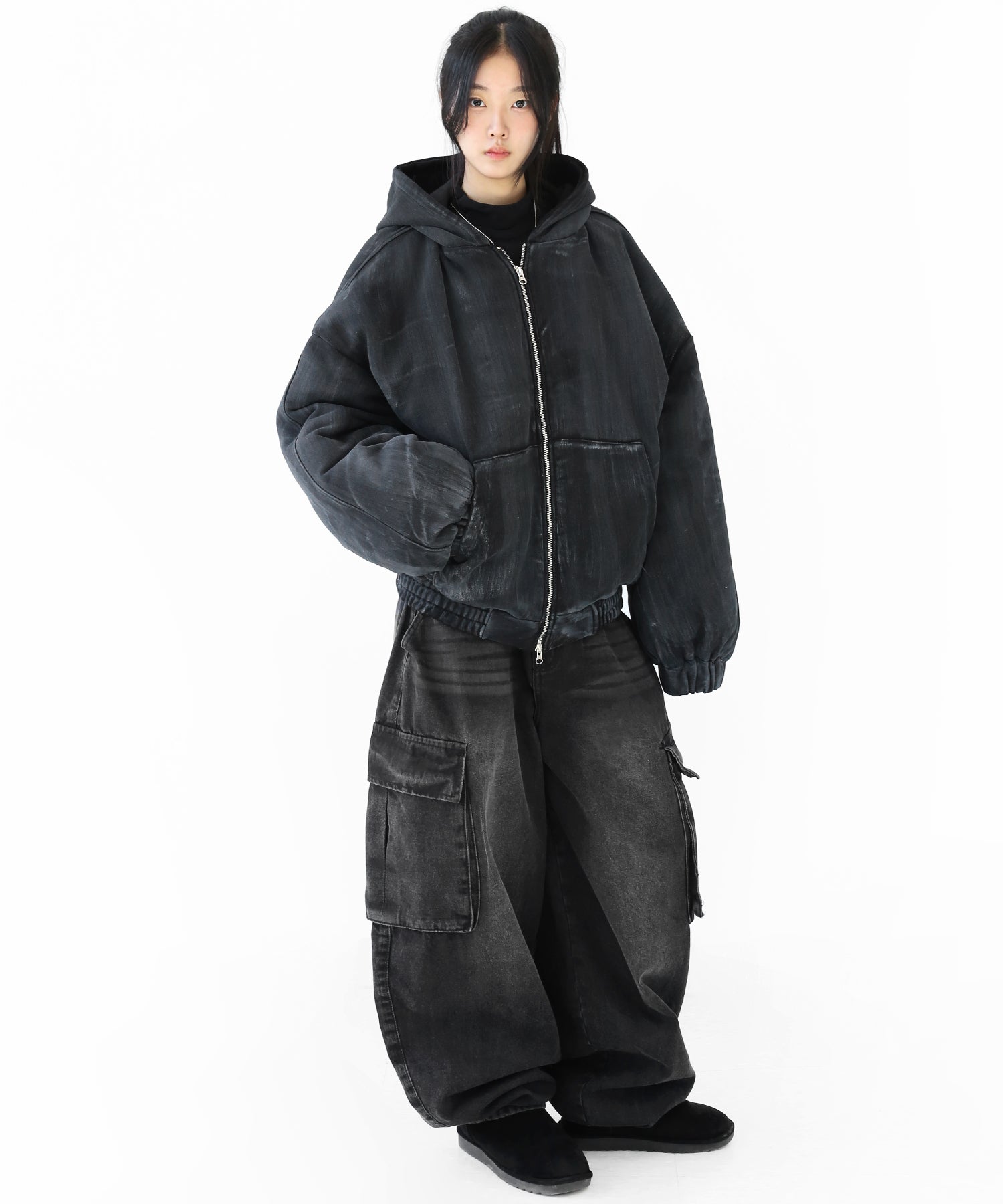 A vintage-inspired hooded jacket featuring an oil-stain fade that adds depth and a distinct street mood. With warm padding and a 2-zip construction, it offers flexible layering and a stylishly worn-in look that stands out effortlessly.