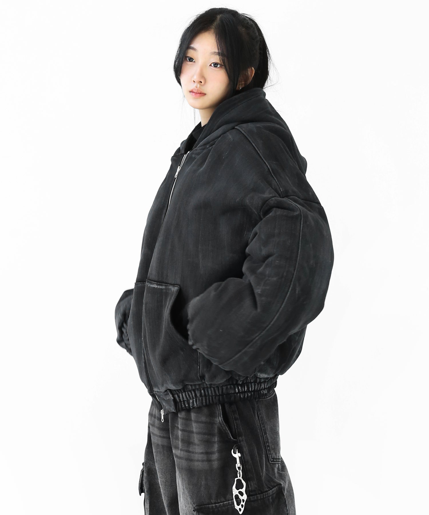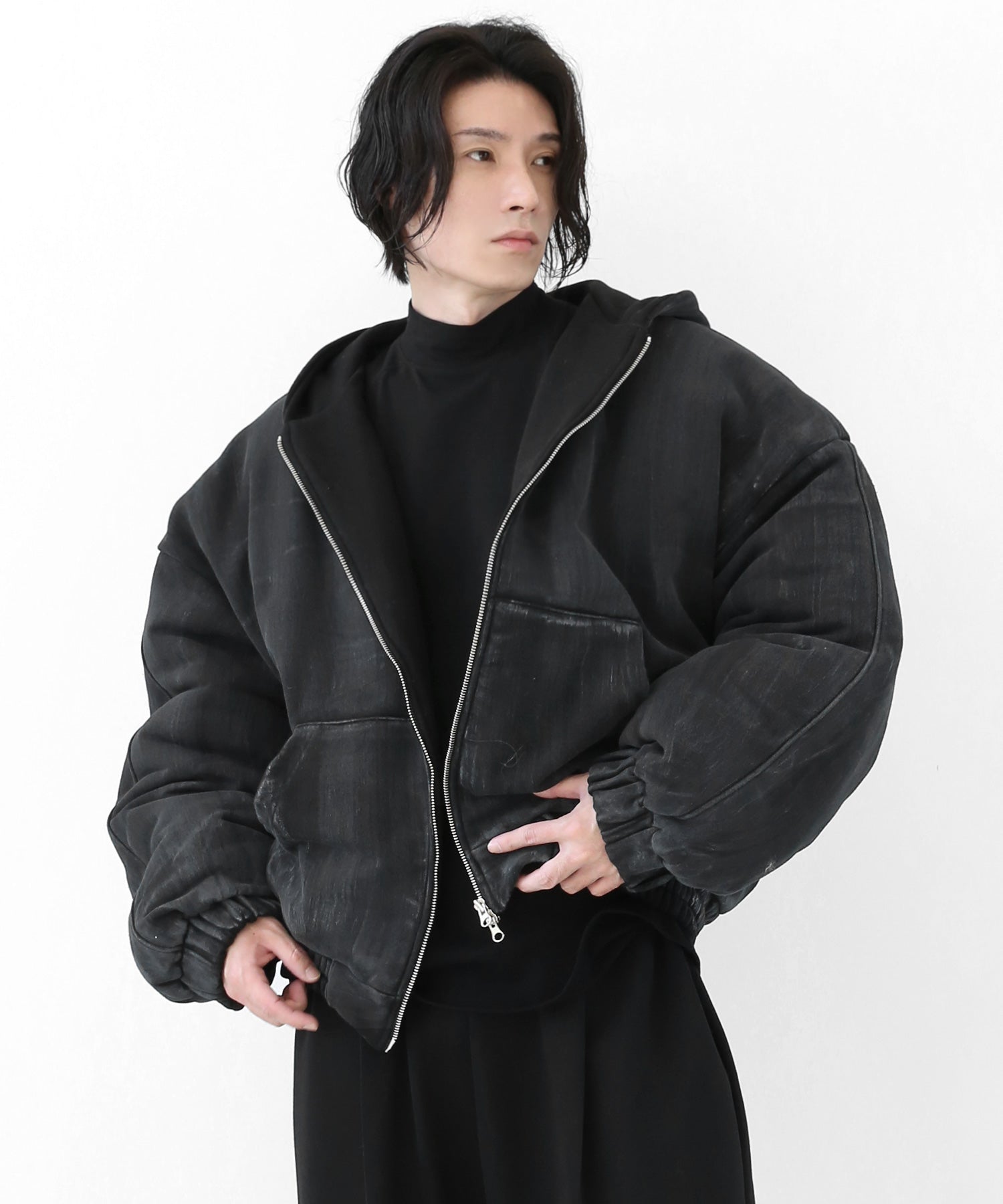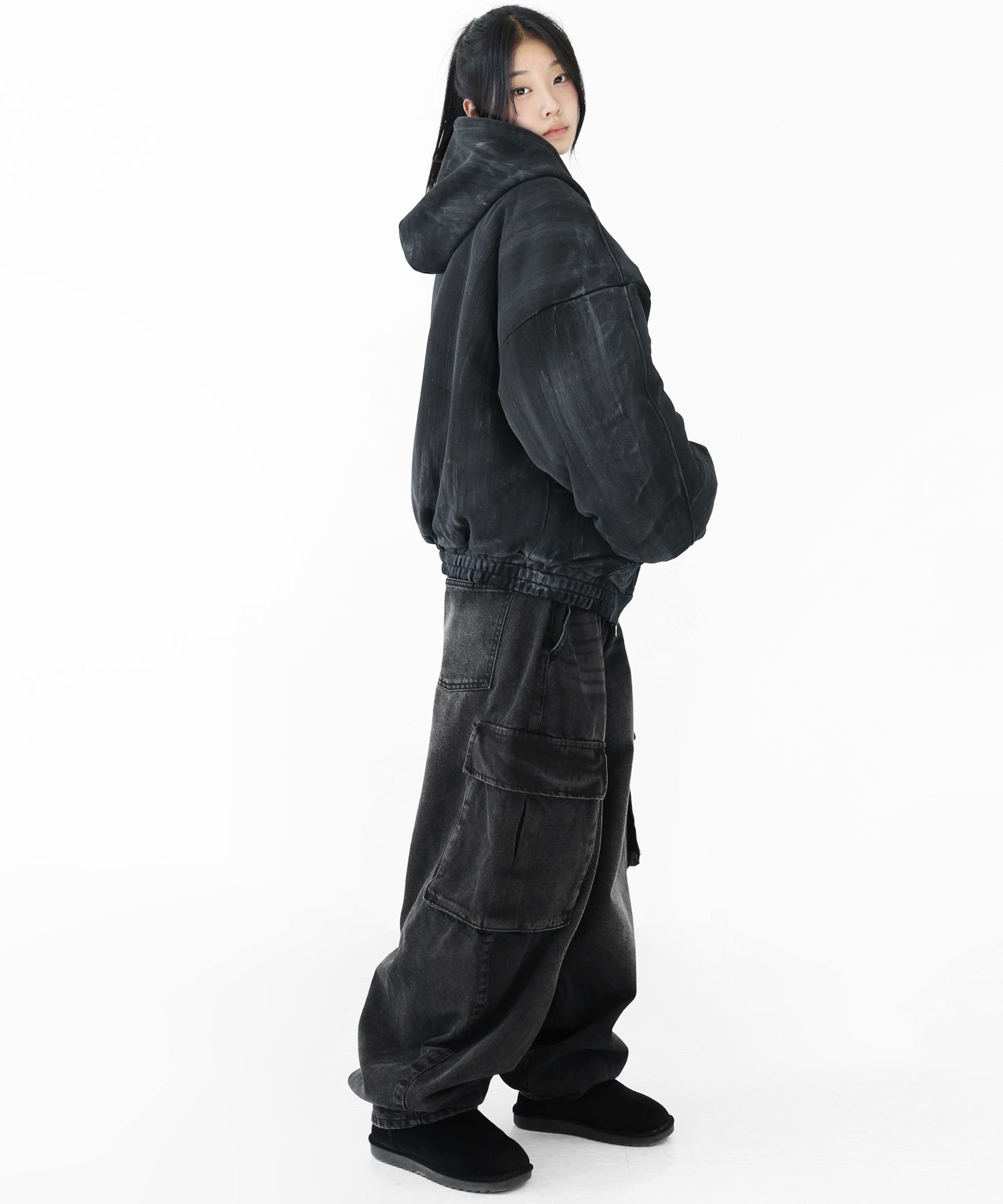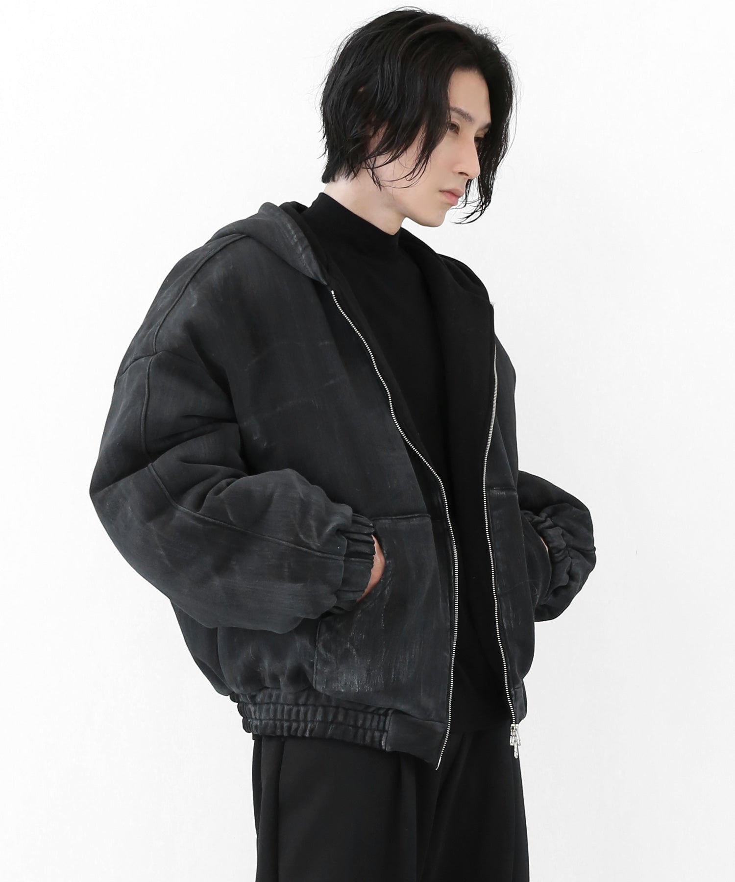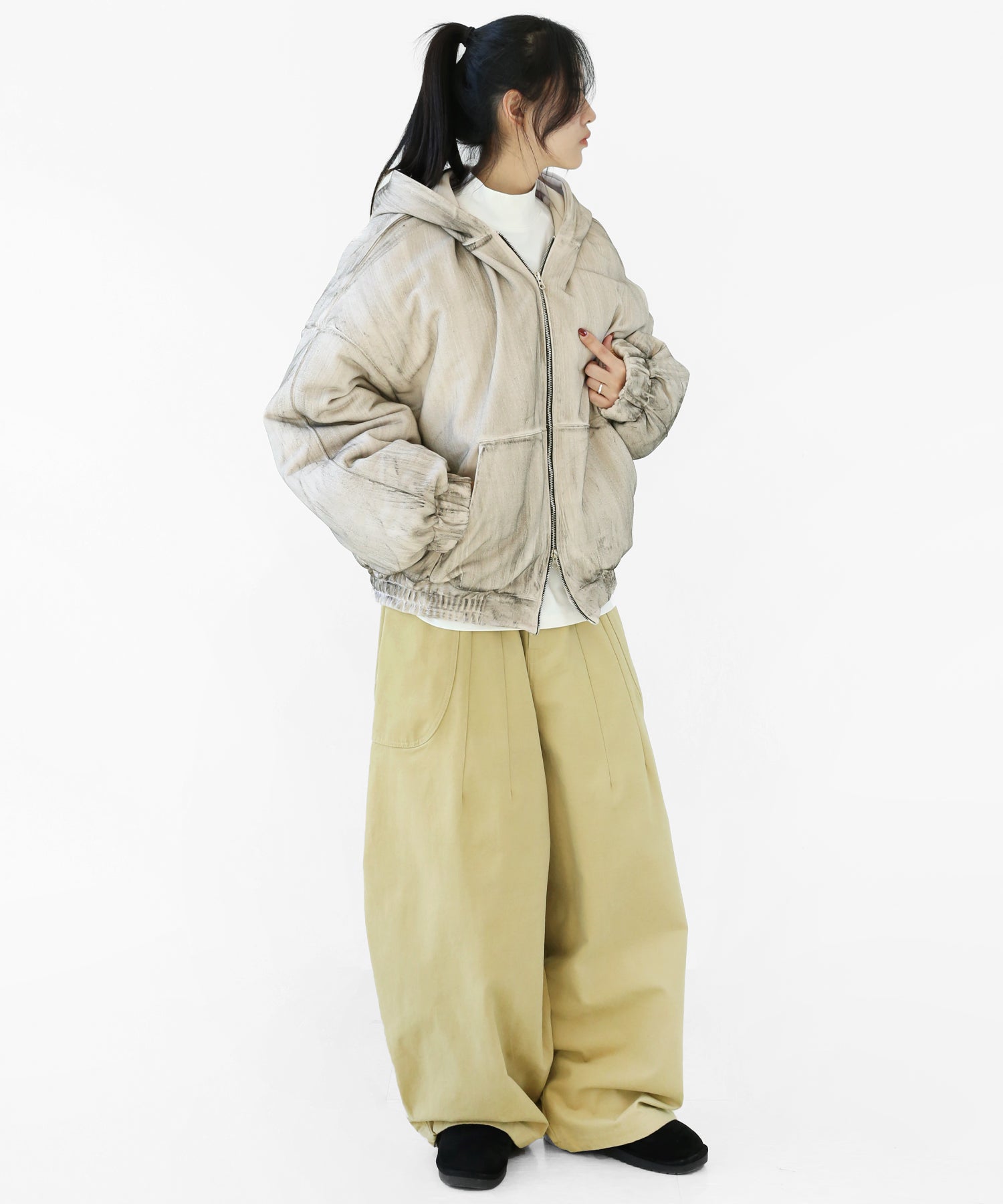 A vintage-inspired hooded jacket featuring an oil-stain fade that adds depth and a distinct street mood. With warm padding and a 2-zip construction, it offers flexible layering and a stylishly worn-in look that stands out effortlessly.