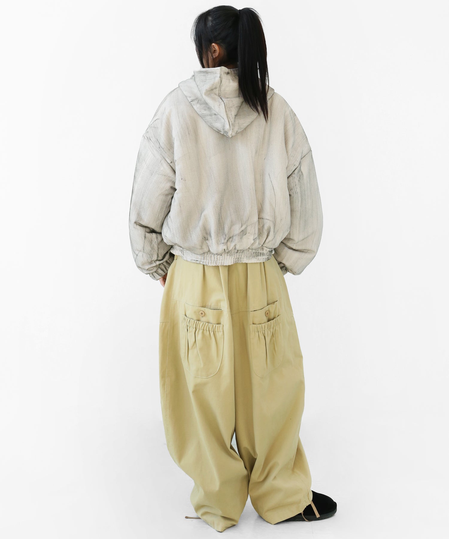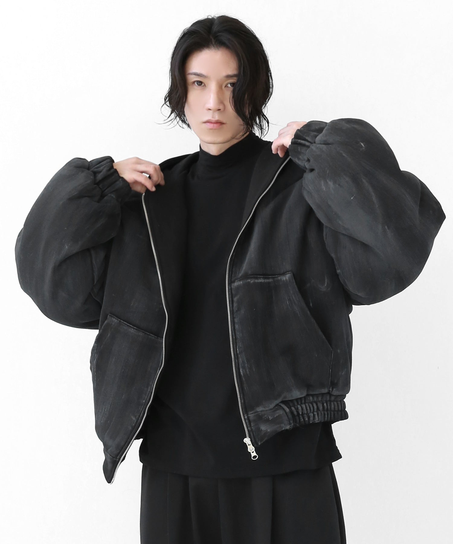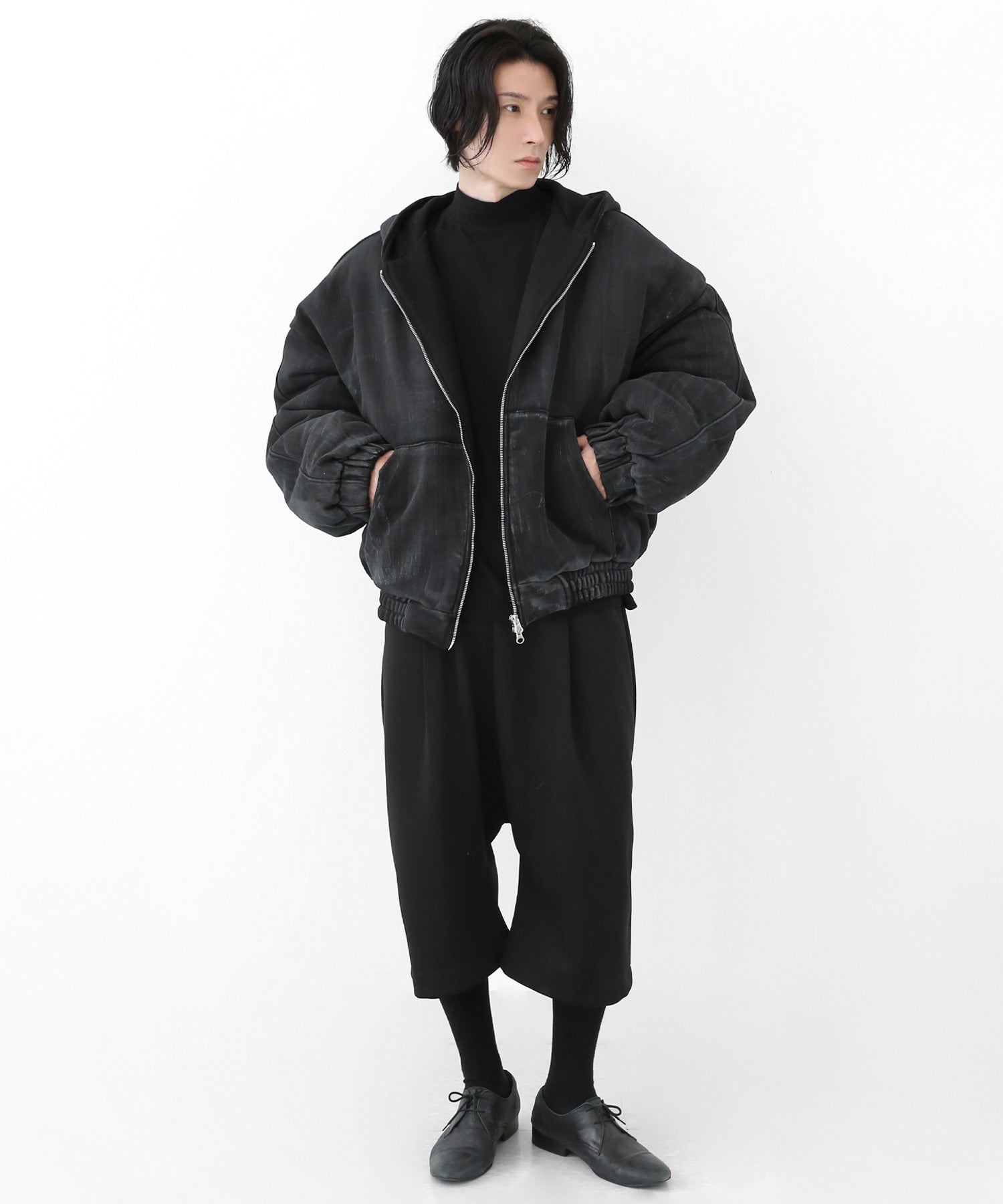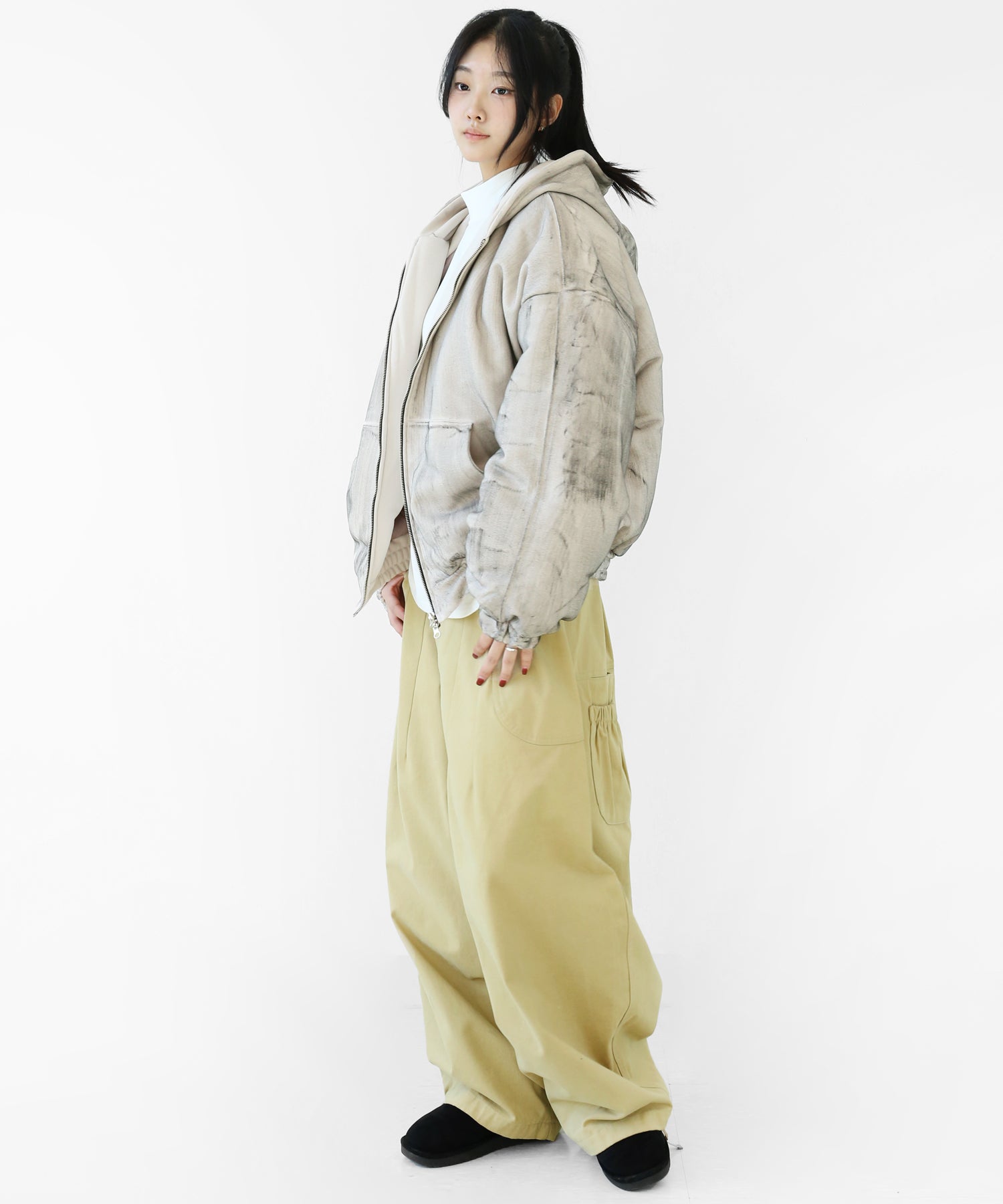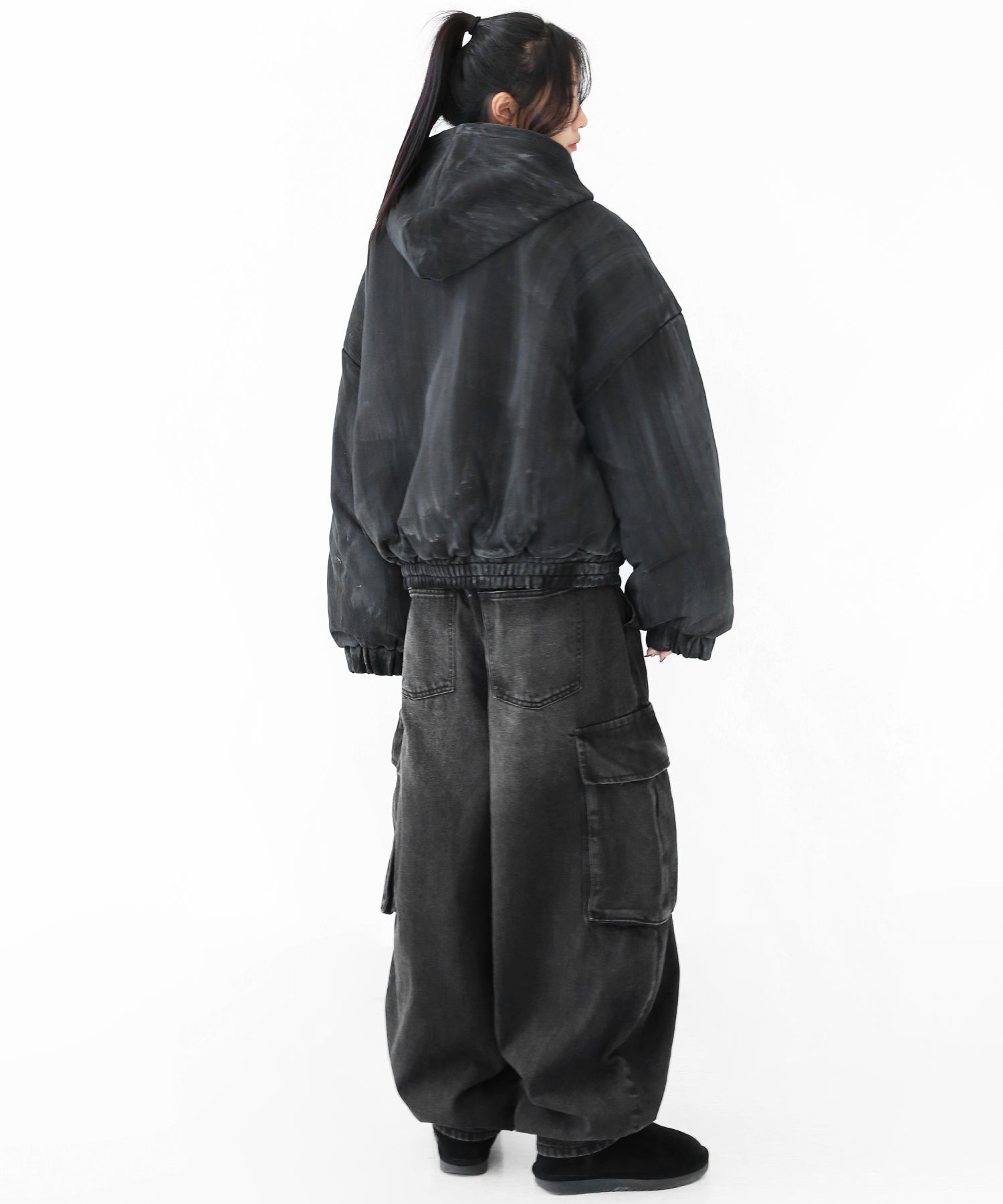 A vintage-inspired hooded jacket featuring an oil-stain fade that adds depth and a distinct street mood. With warm padding and a 2-zip construction, it offers flexible layering and a stylishly worn-in look that stands out effortlessly.