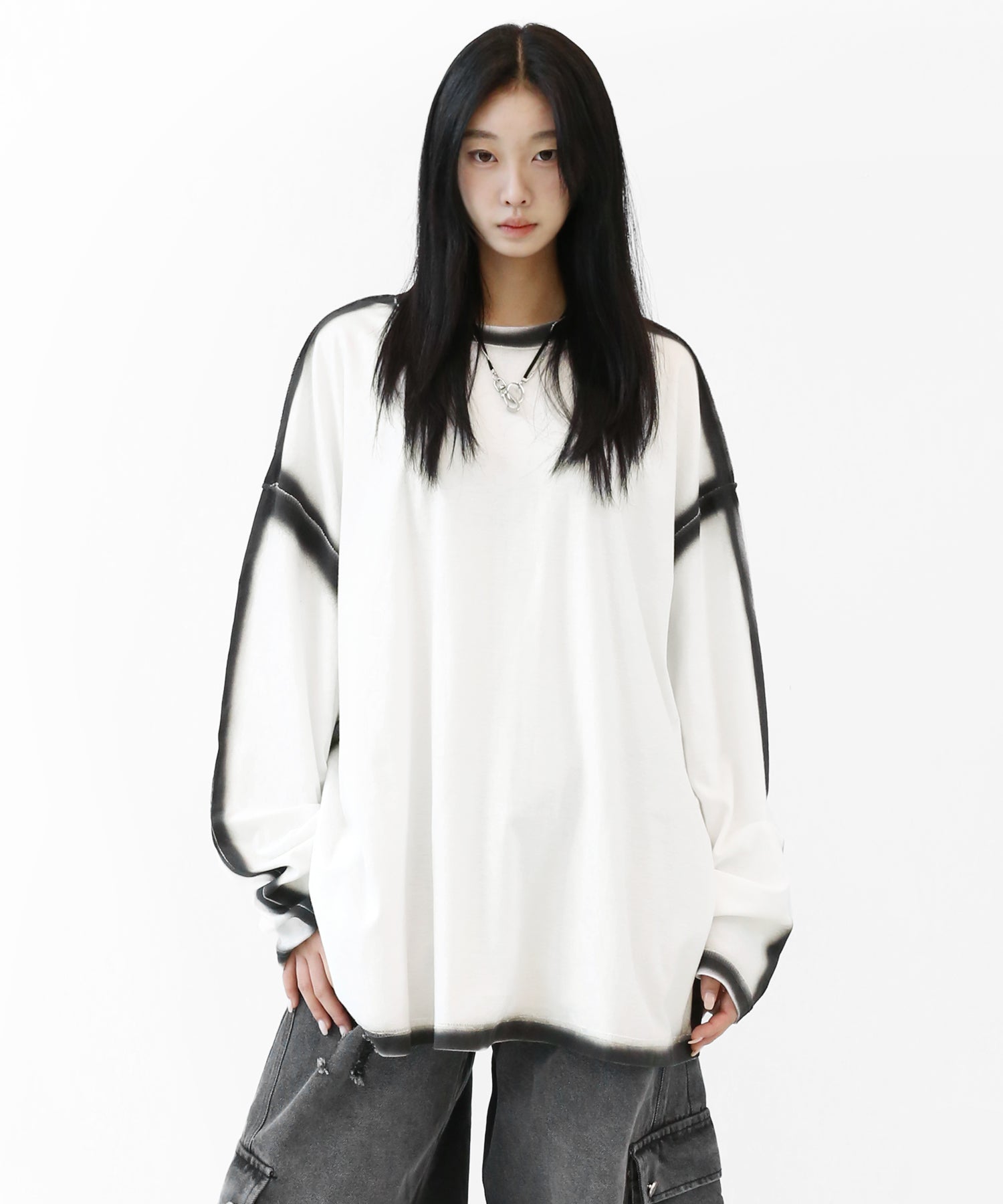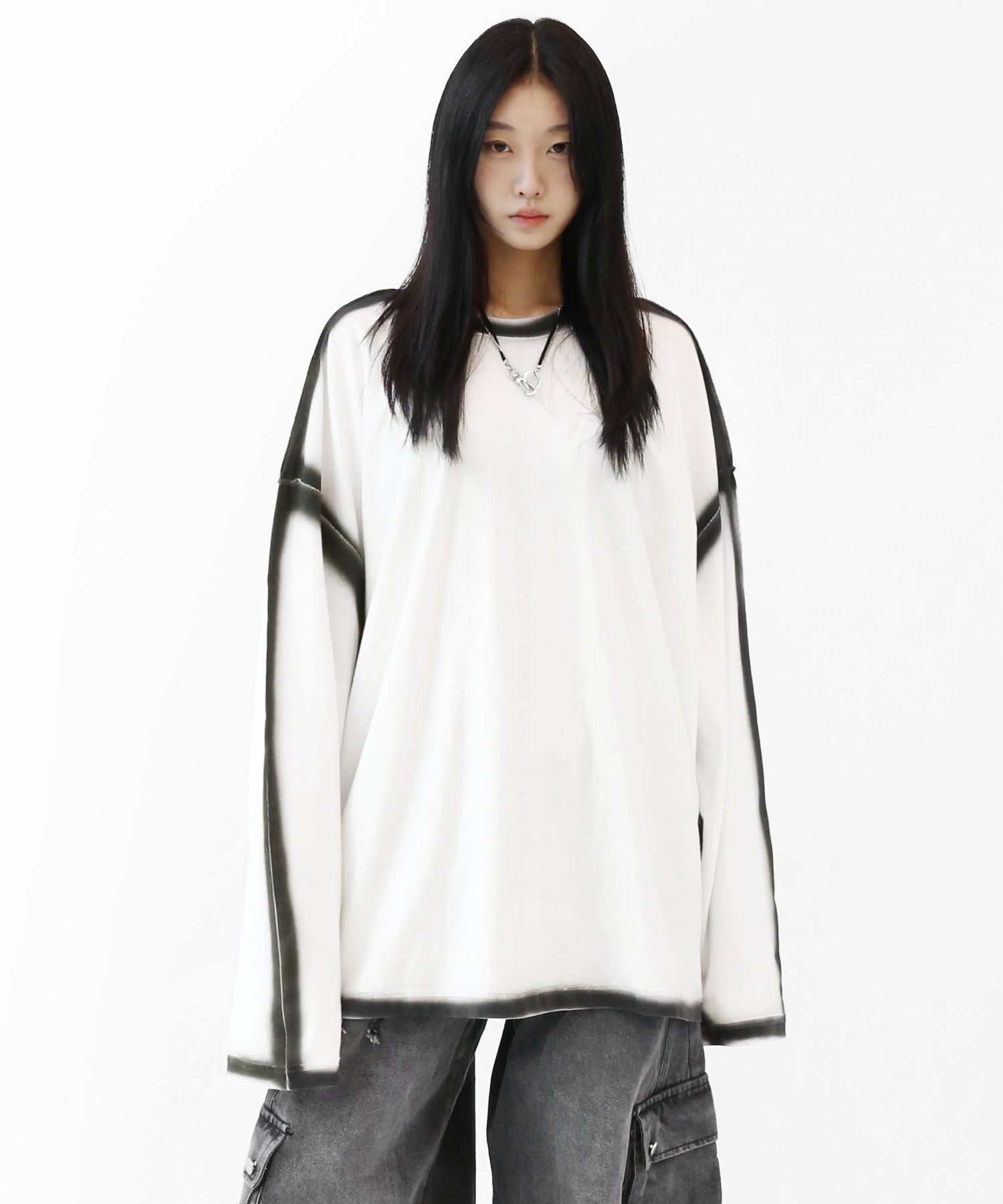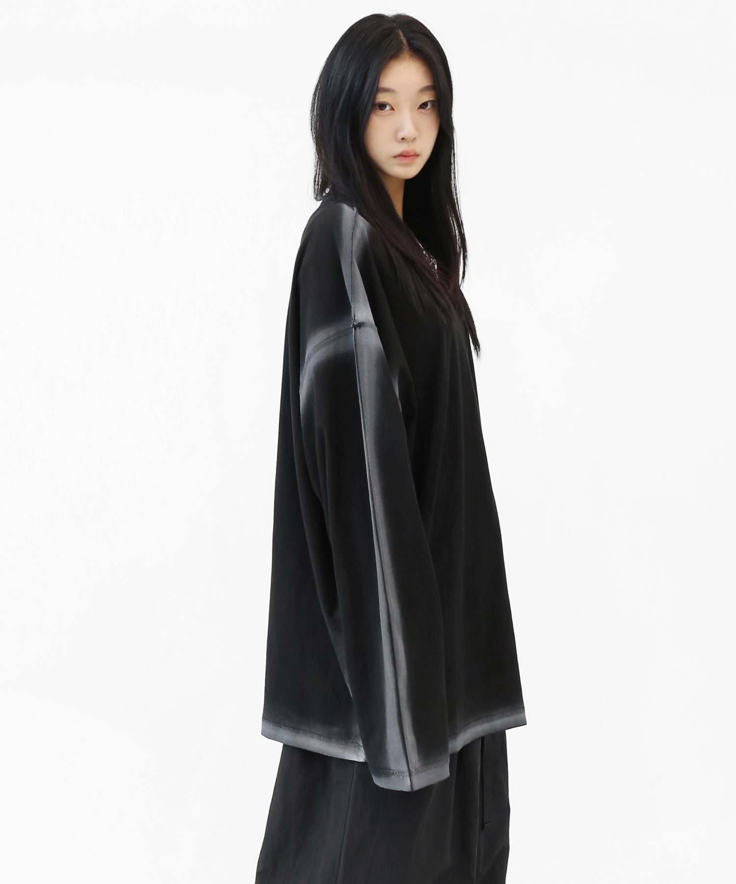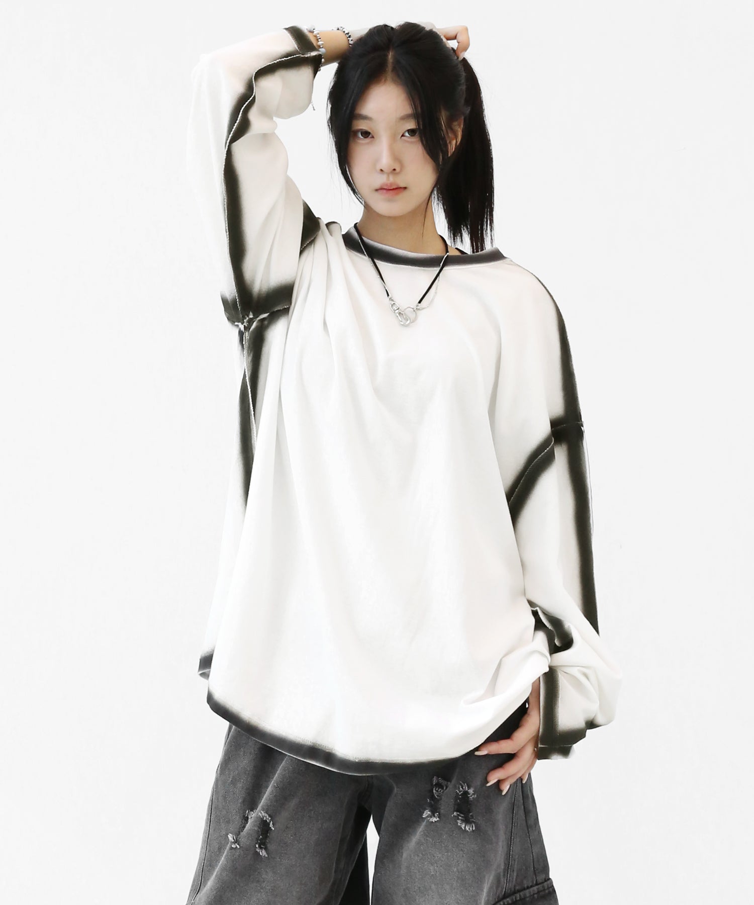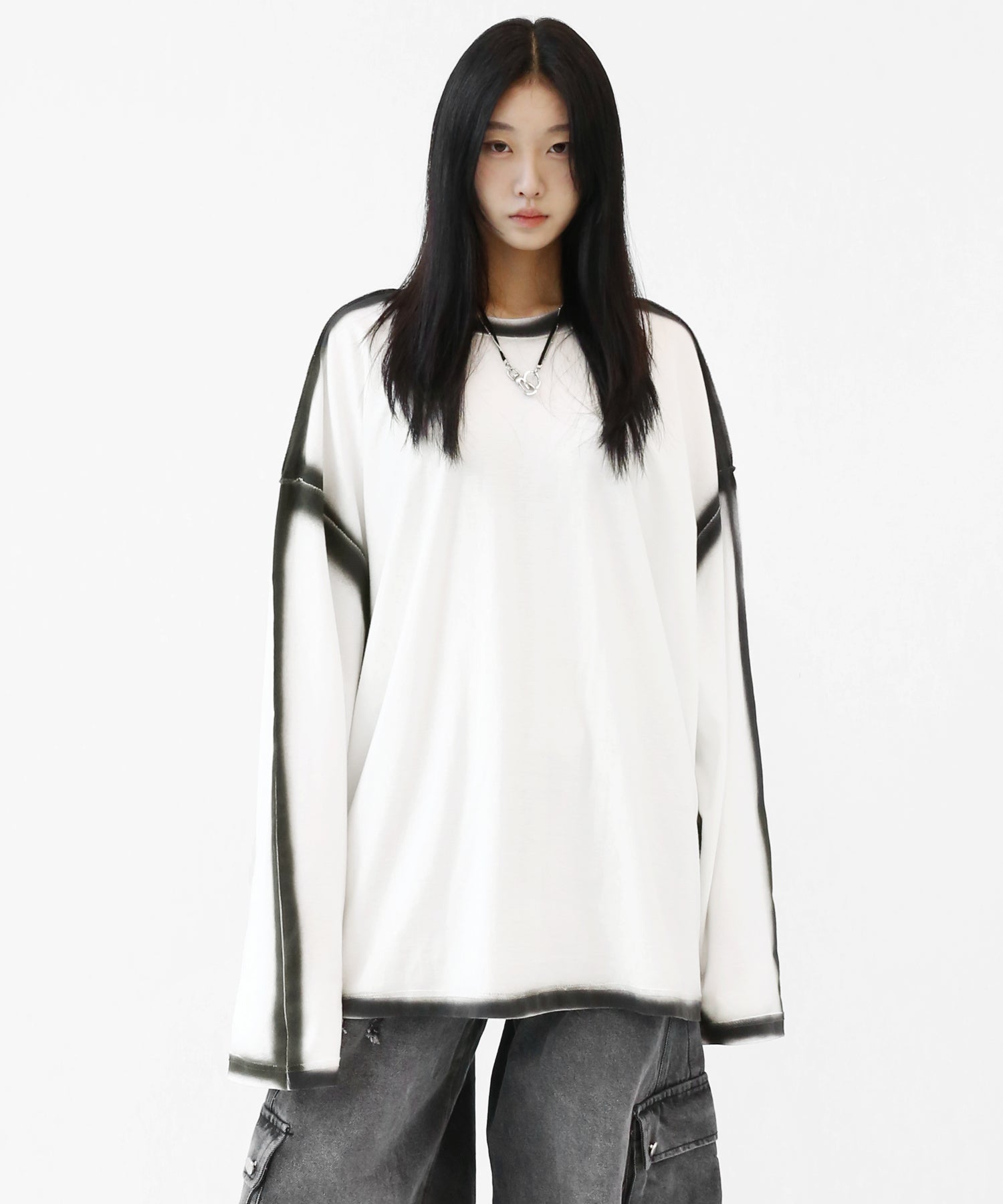 A vintage-inspired long sleeve tee with spray-paint gradient effects and raw-cut details. Its oversized silhouette blends streetwear attitude with effortless layering appeal.