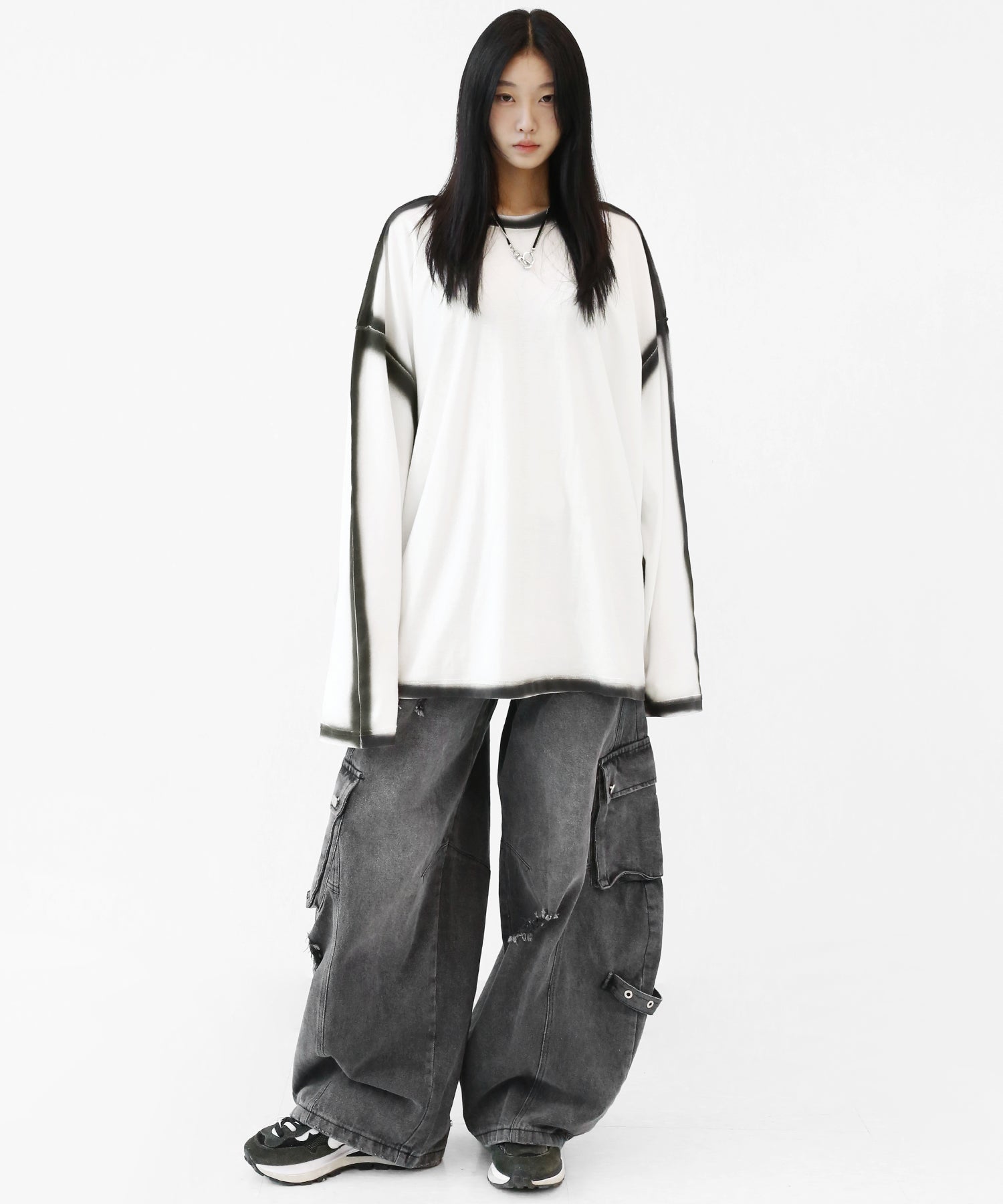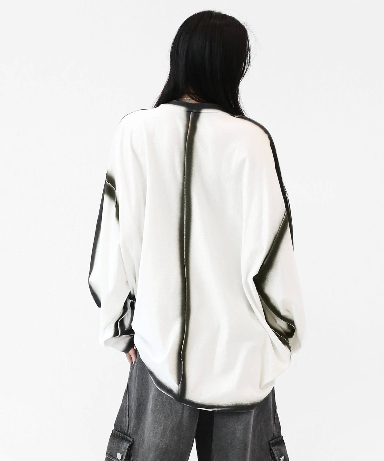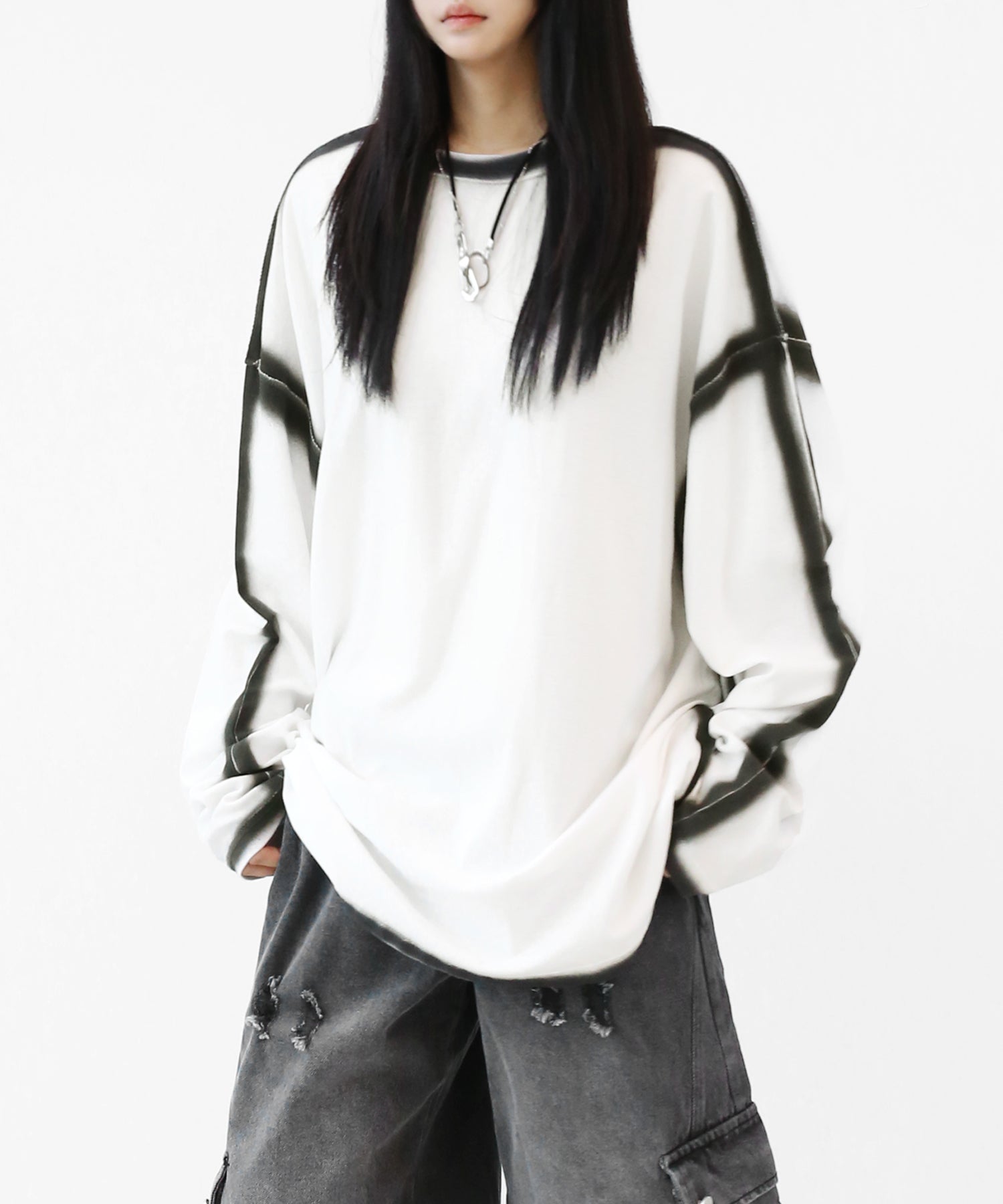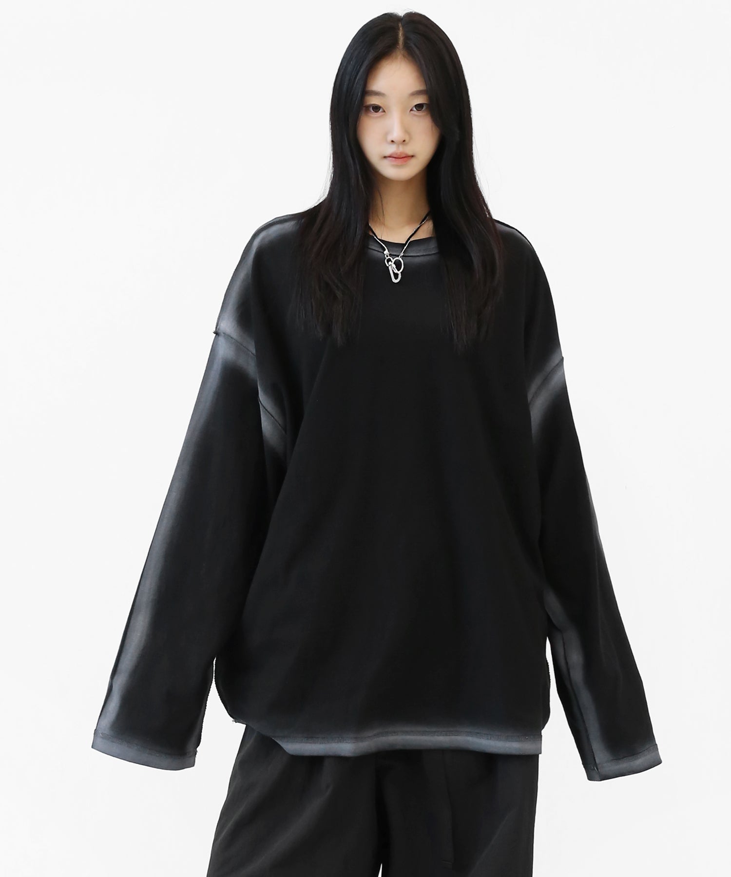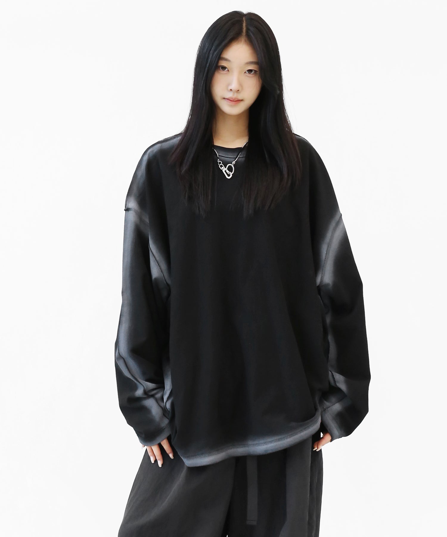 A vintage-inspired long sleeve tee with spray-paint gradient effects and raw-cut details. Its oversized silhouette blends streetwear attitude with effortless layering appeal.