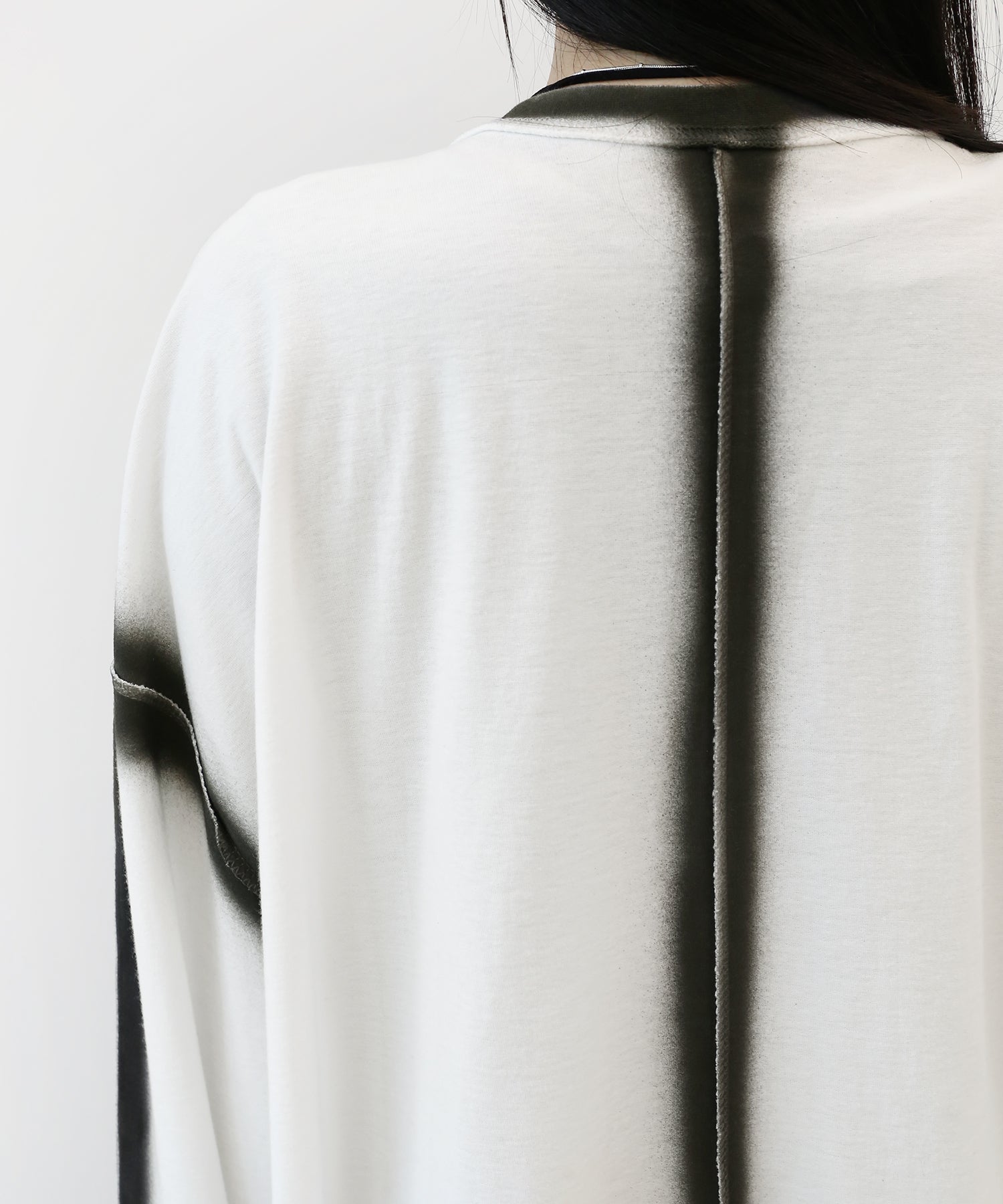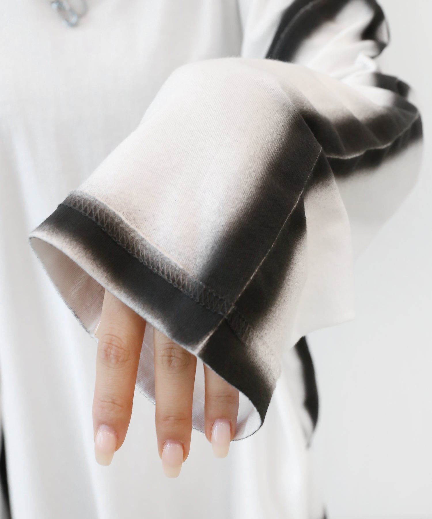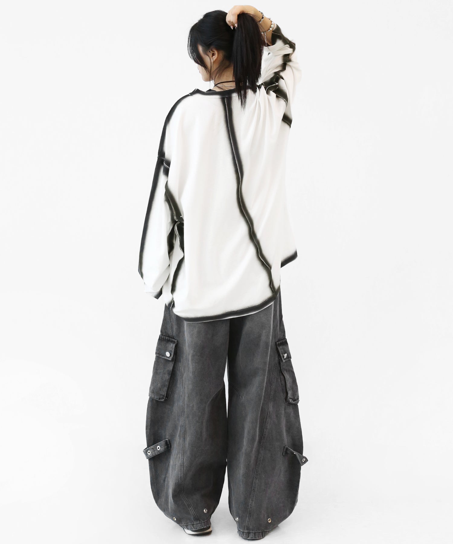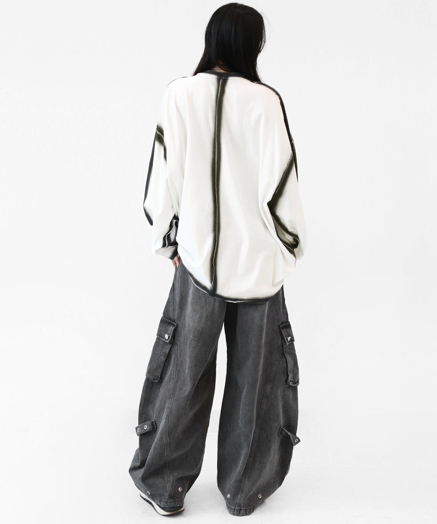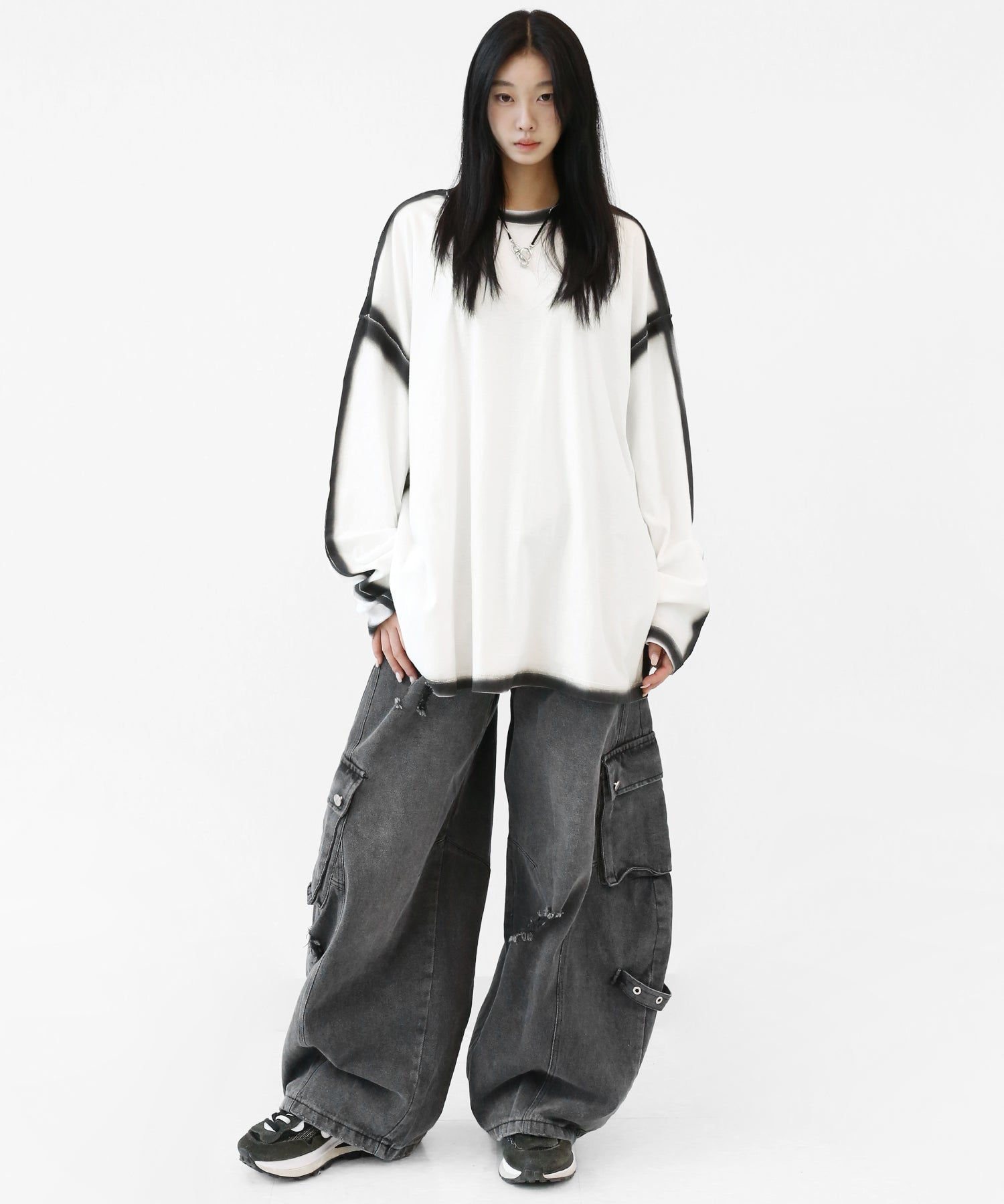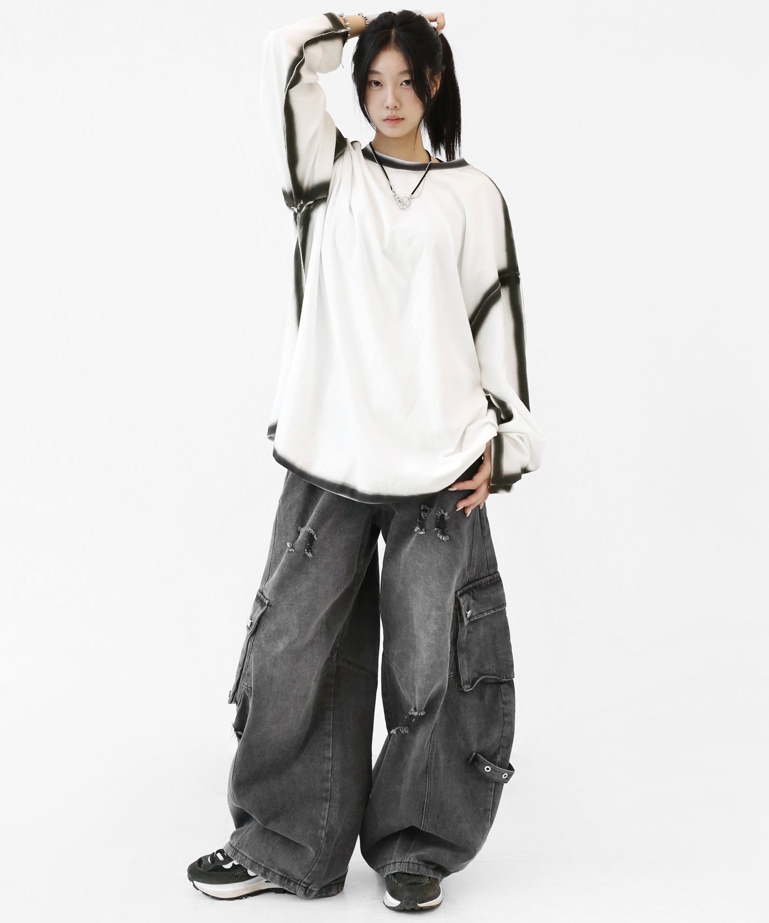 A vintage-inspired long sleeve tee with spray-paint gradient effects and raw-cut details. Its oversized silhouette blends streetwear attitude with effortless layering appeal.