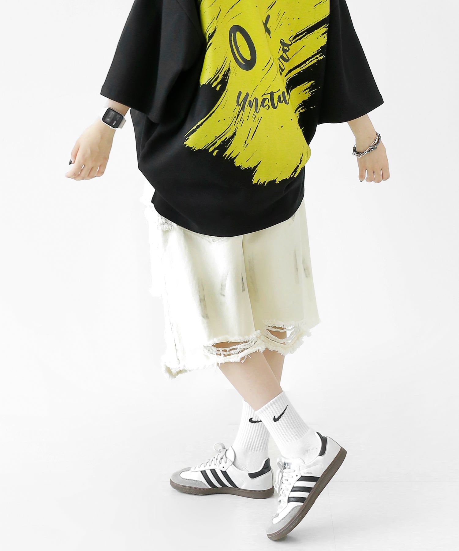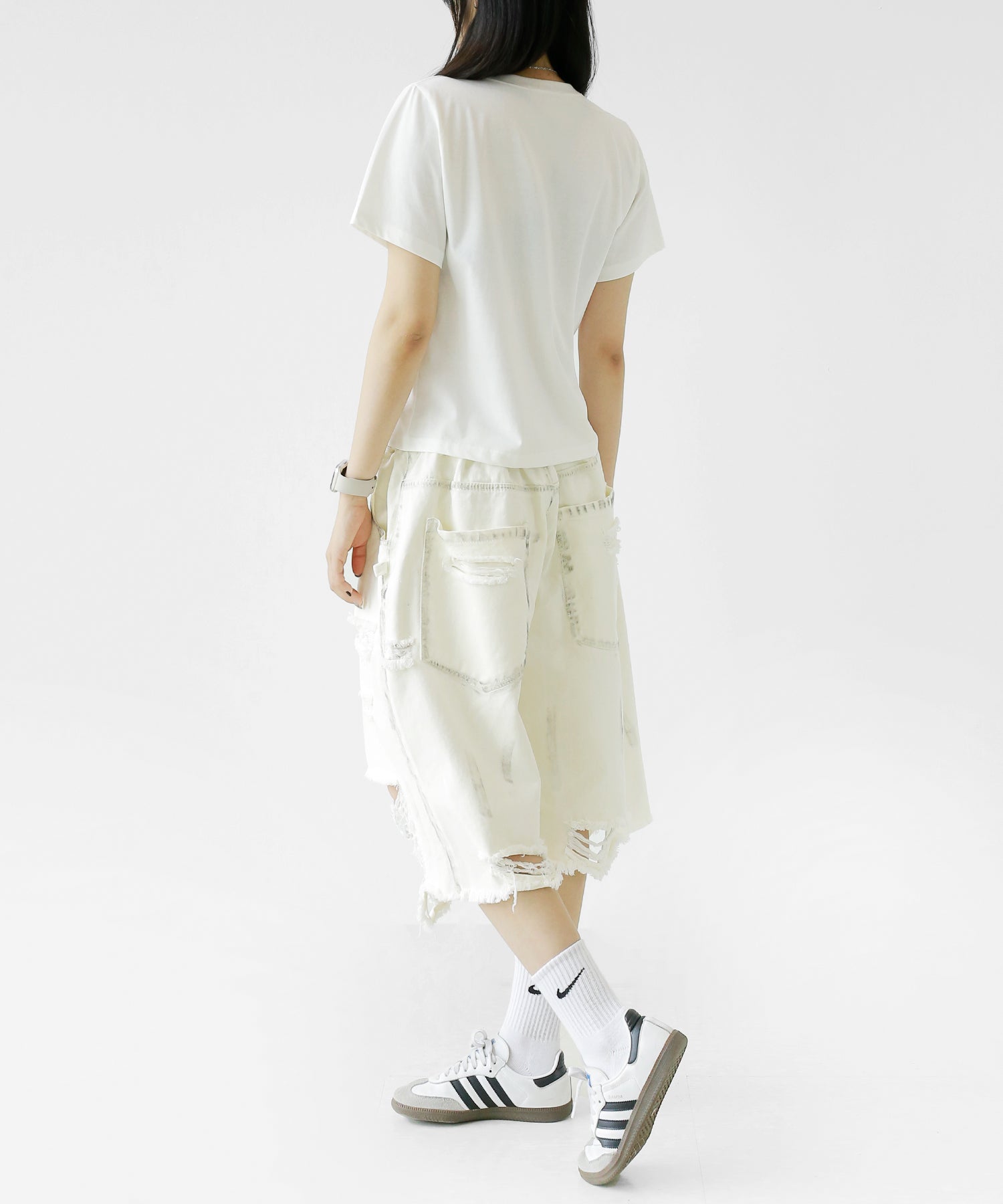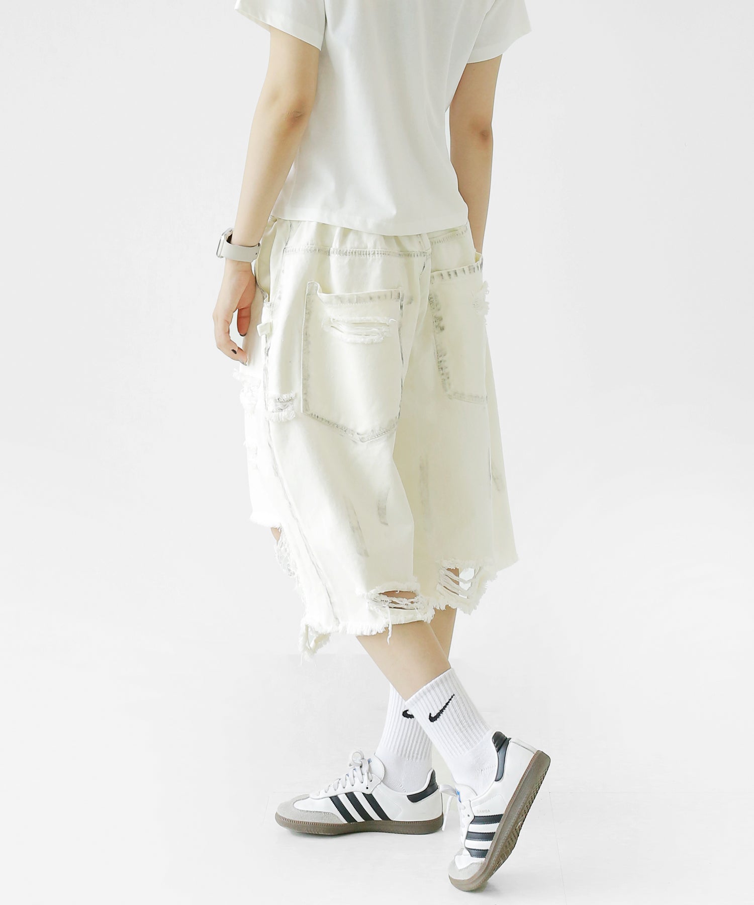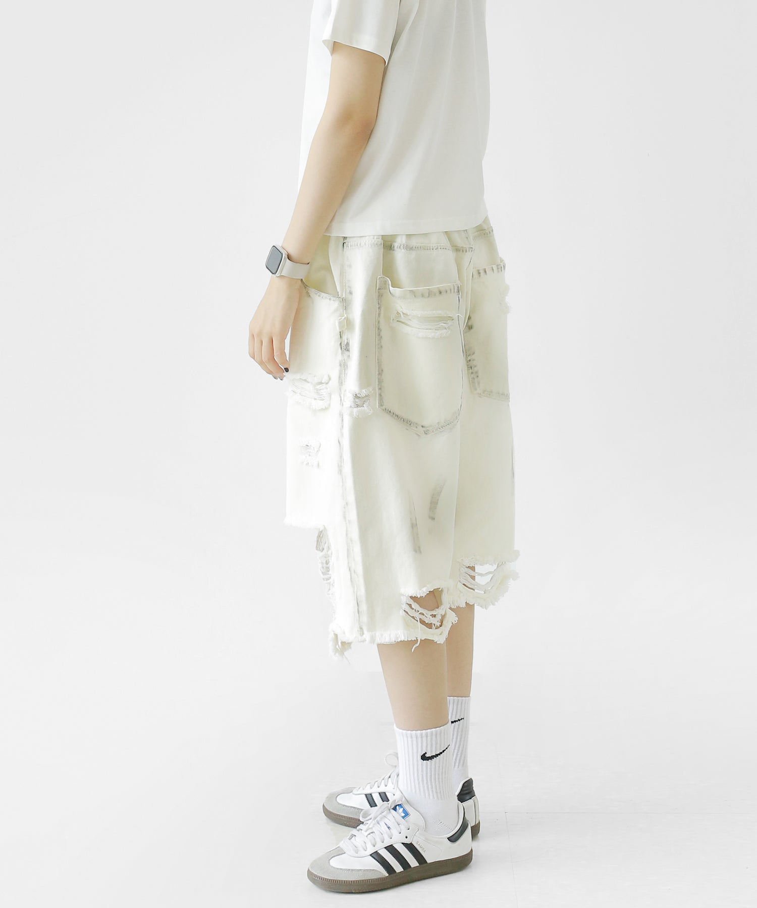 Vintage-washed, heavily distressed, and painted to perfection.These denim shorts bring street style to the next level with raw details and artistic vibes.The elastic waistband and comfortable fit make them your new go-to for edgy summer outfits.