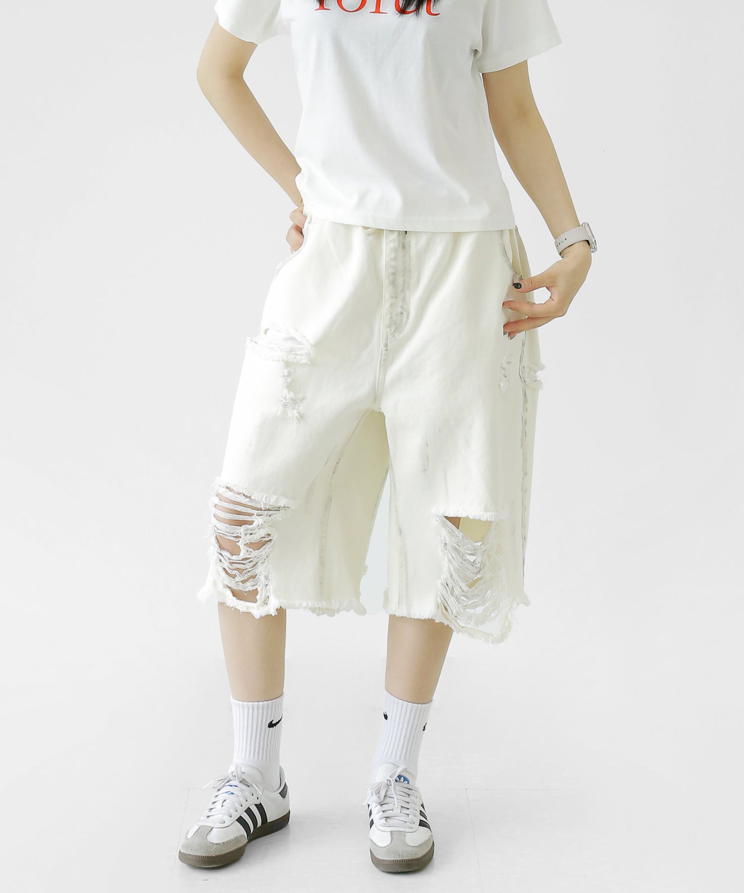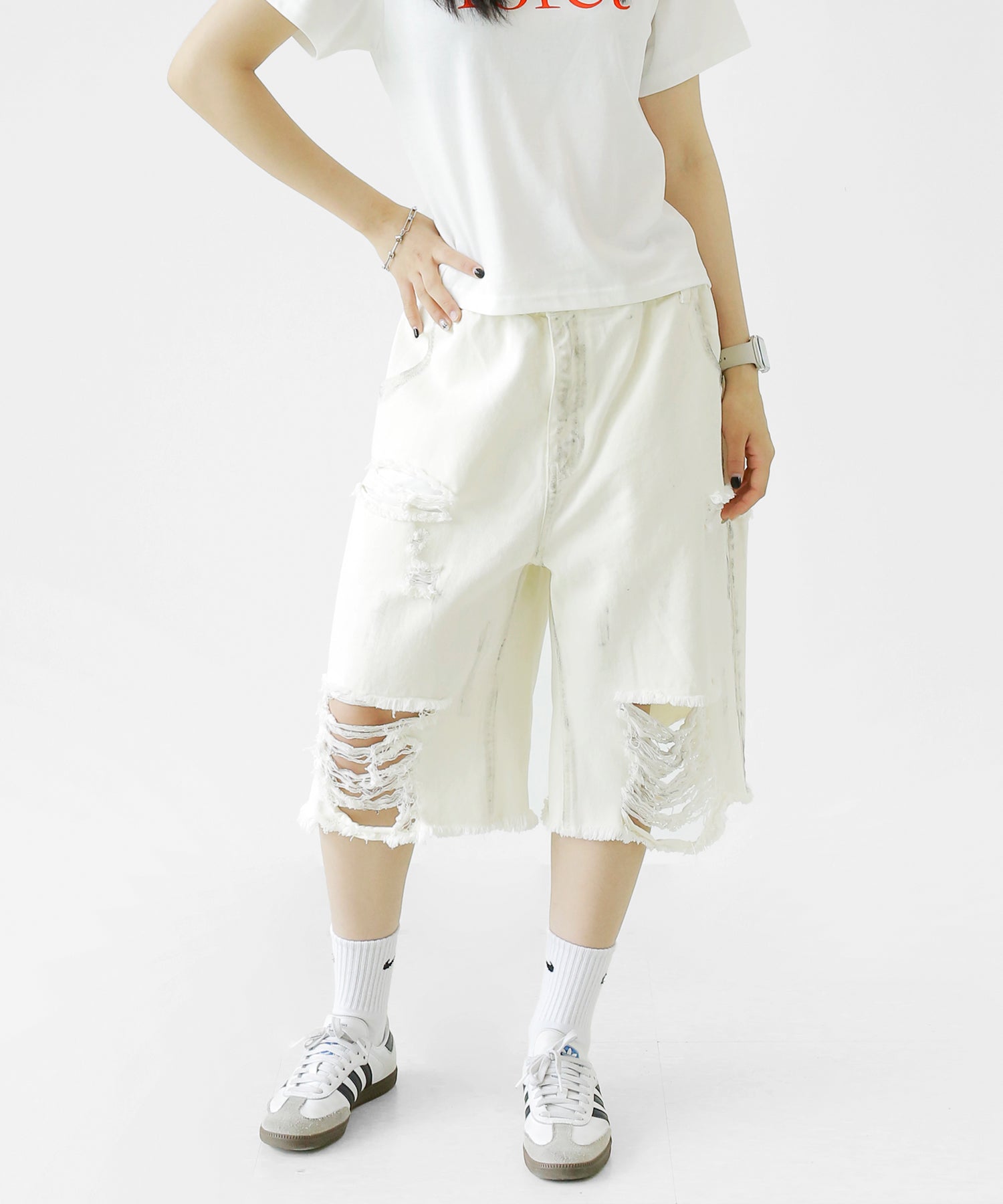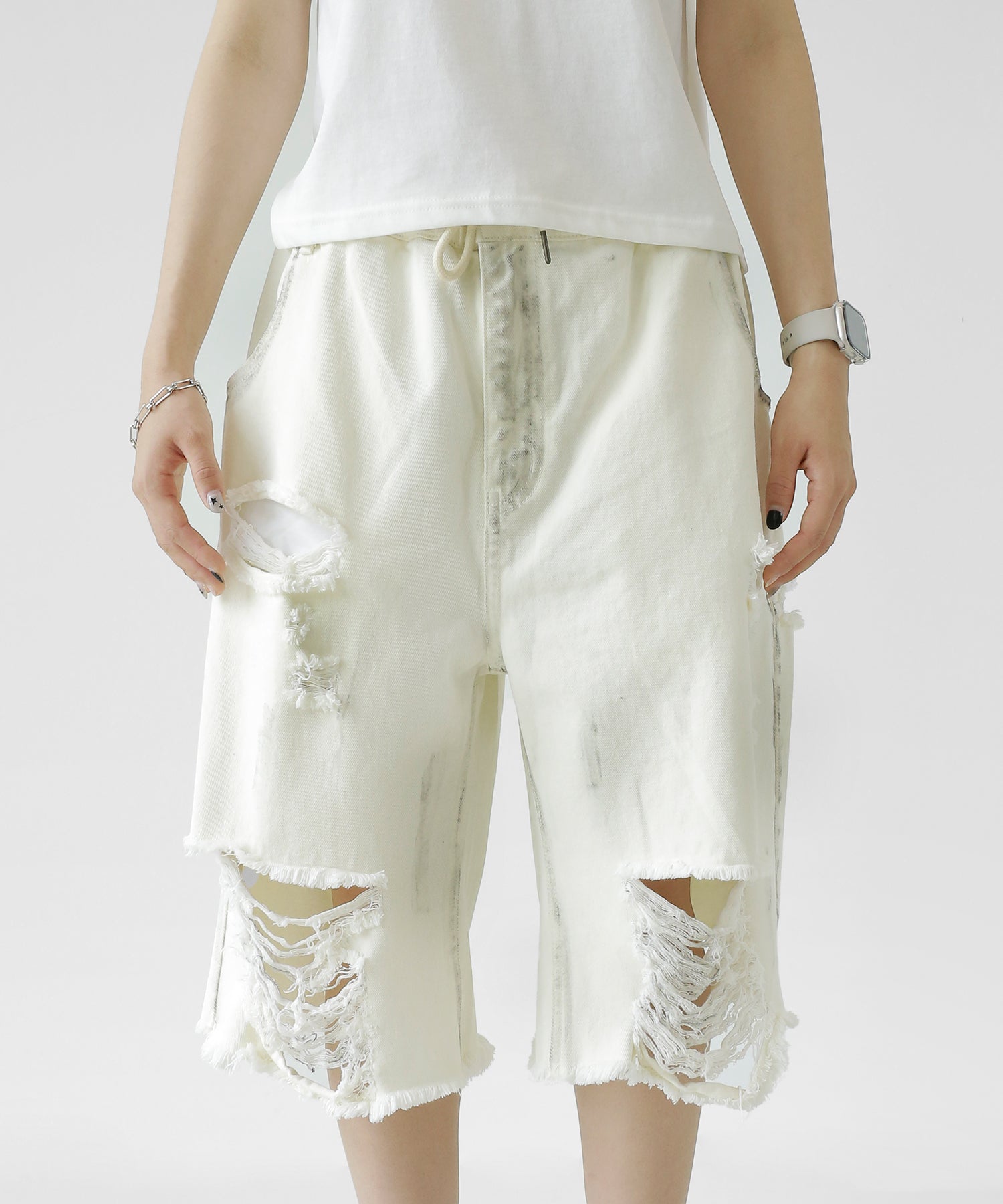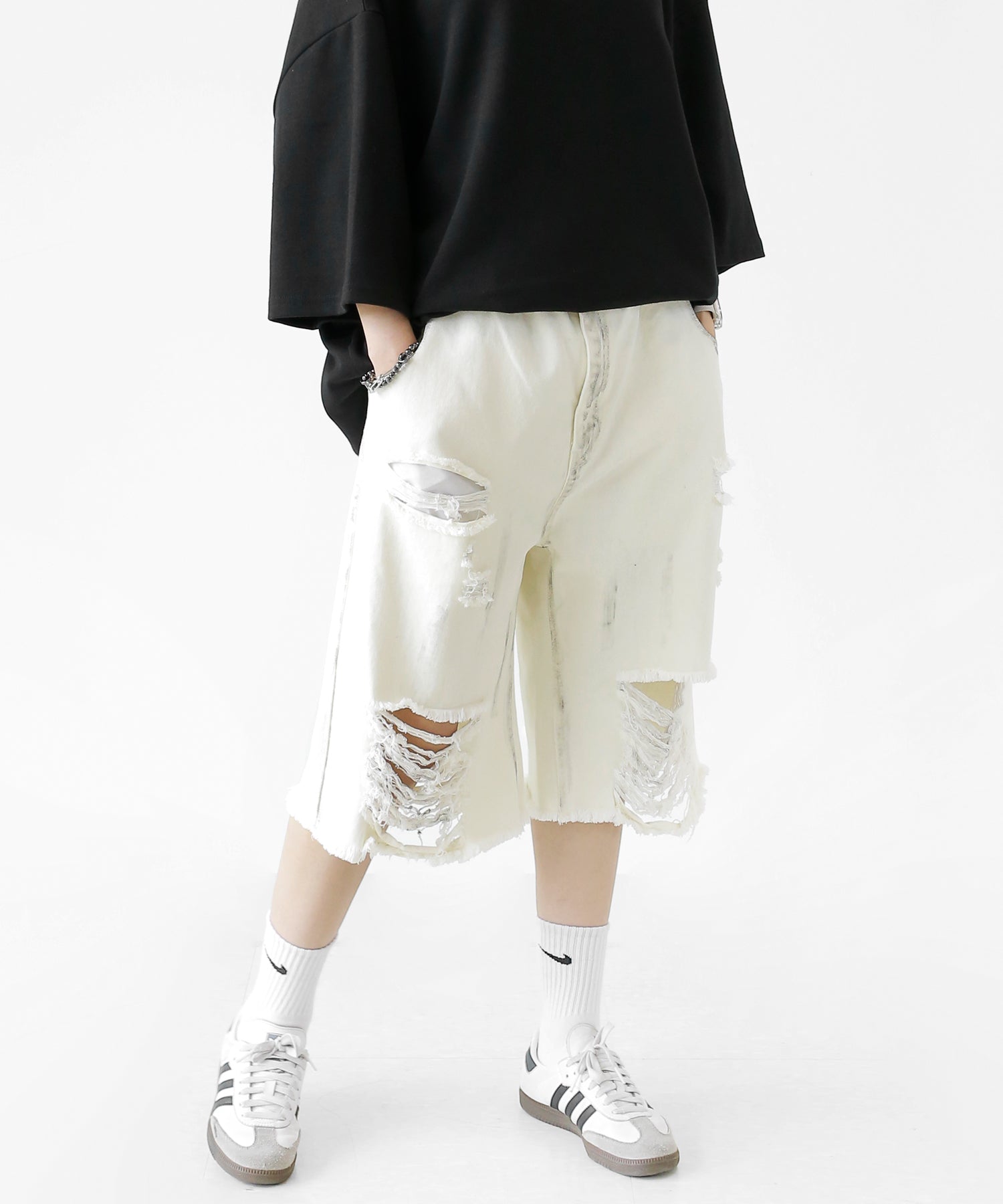 Vintage-washed, heavily distressed, and painted to perfection.These denim shorts bring street style to the next level with raw details and artistic vibes.The elastic waistband and comfortable fit make them your new go-to for edgy summer outfits.