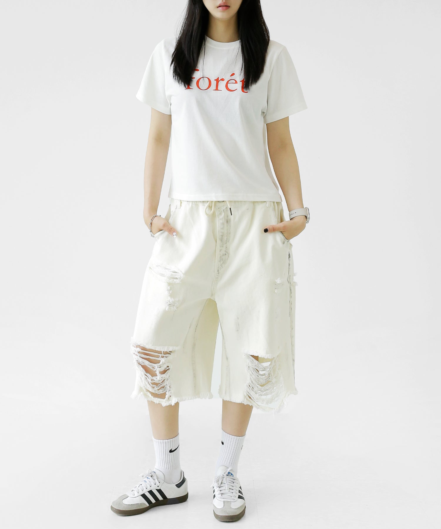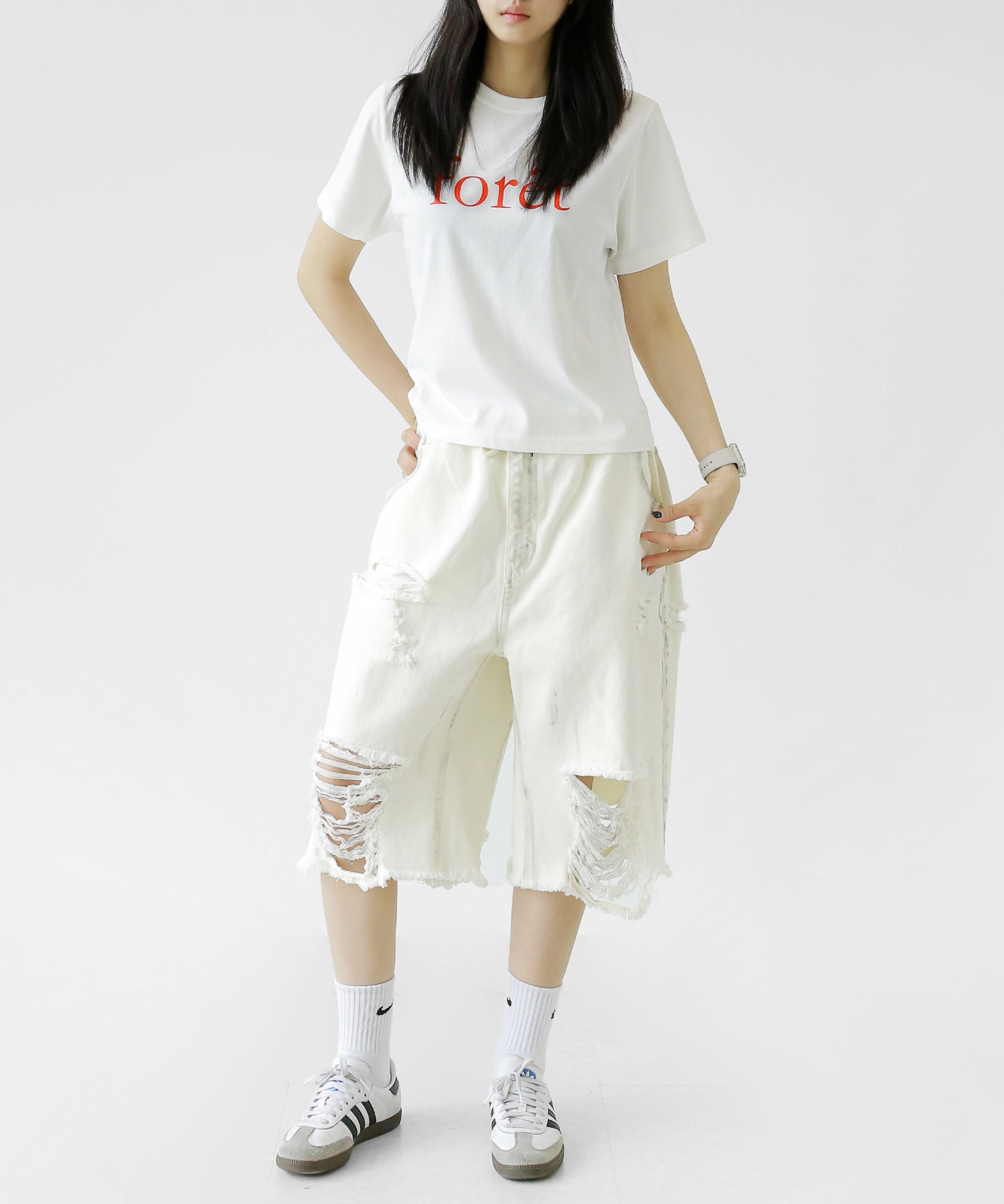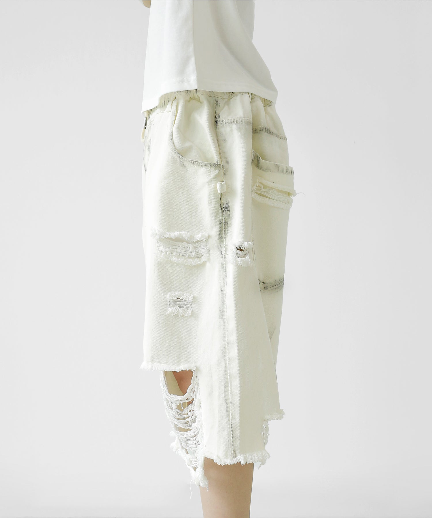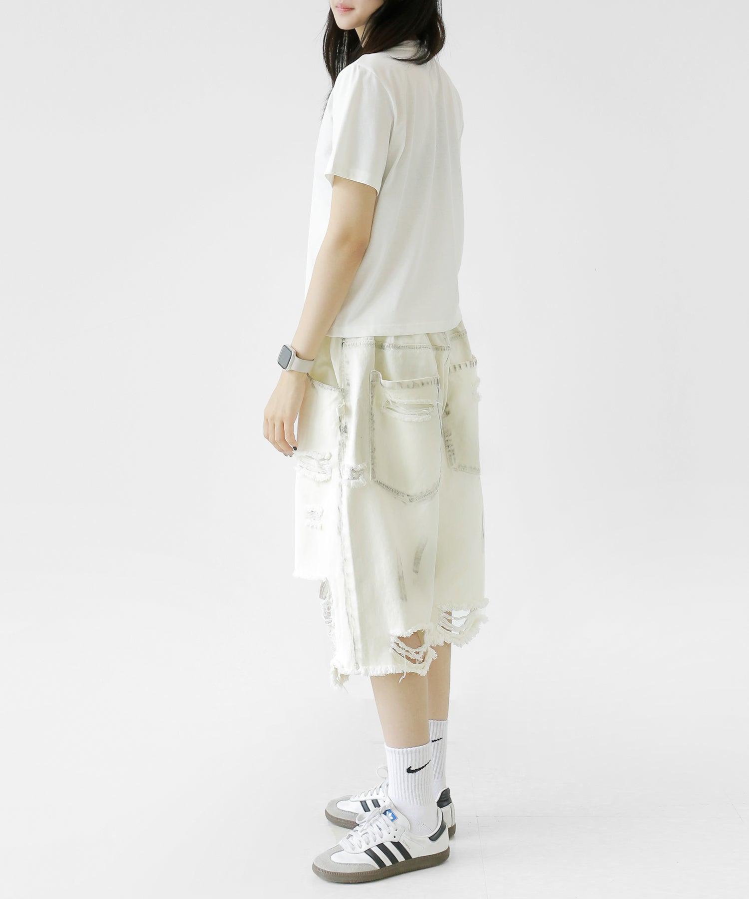 Vintage-washed, heavily distressed, and painted to perfection.These denim shorts bring street style to the next level with raw details and artistic vibes.The elastic waistband and comfortable fit make them your new go-to for edgy summer outfits.