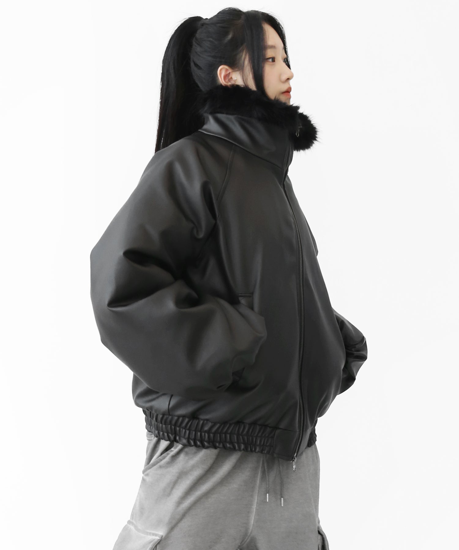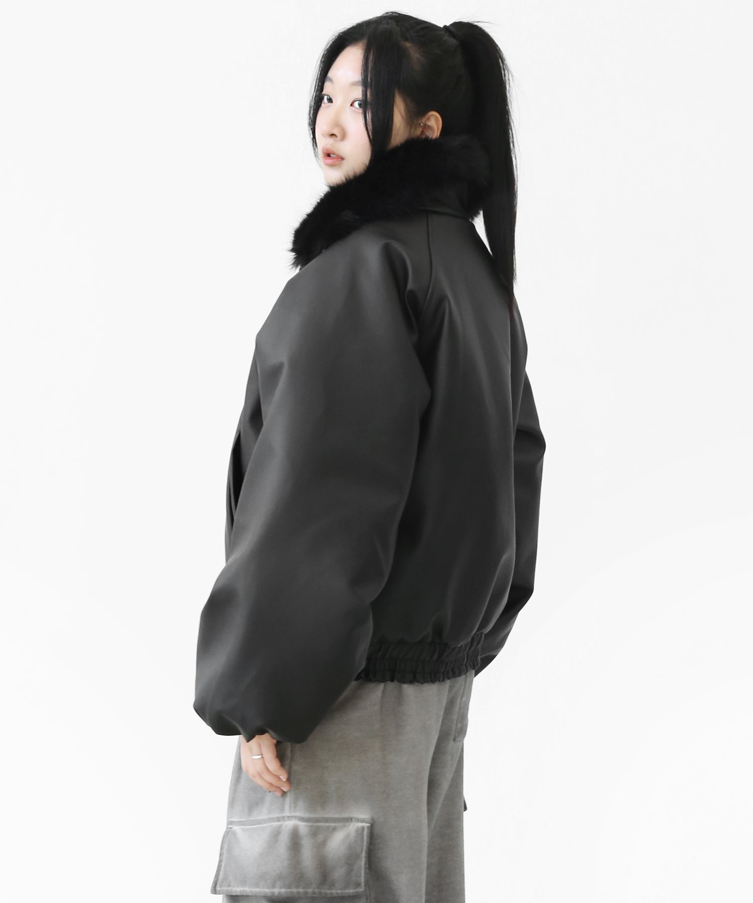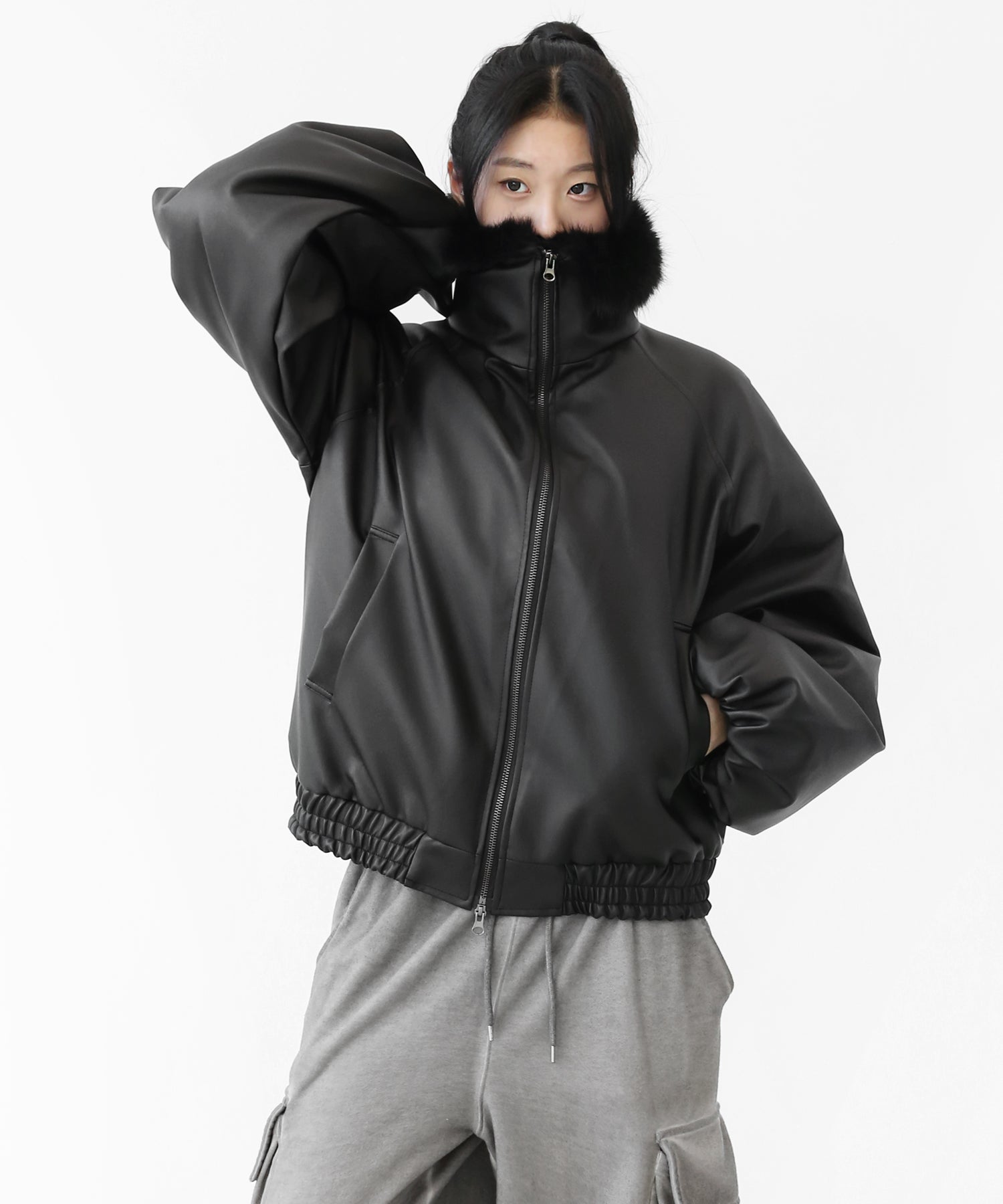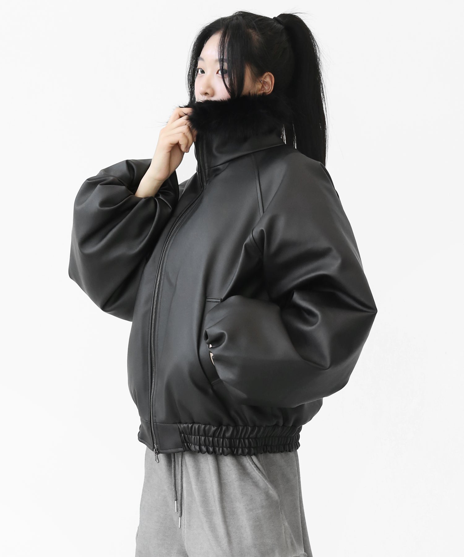 A high-neck balloon jacket made from matte faux leather, finished with a soft fur neckline.