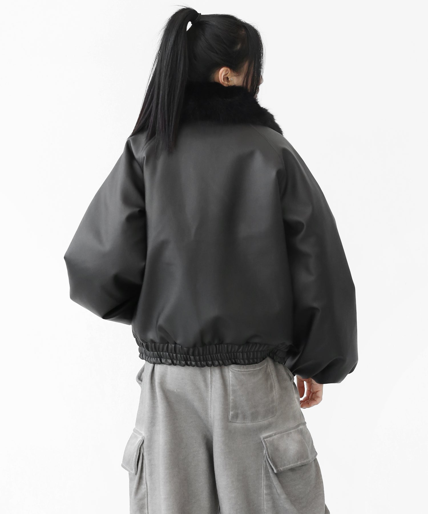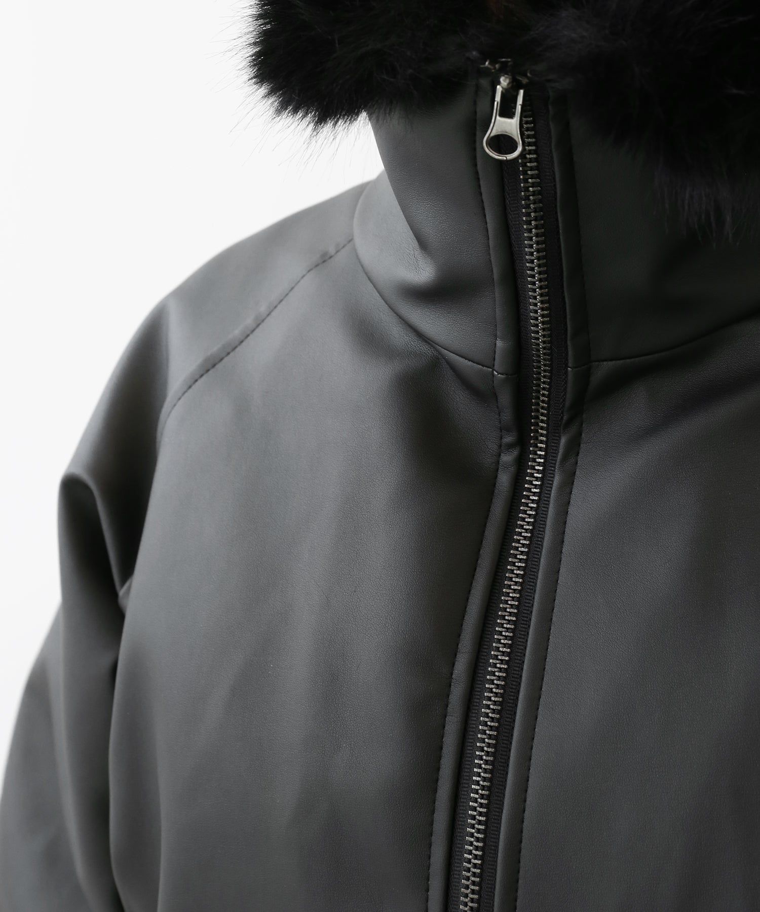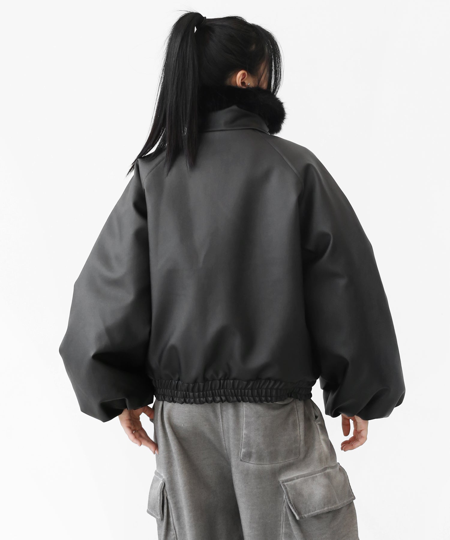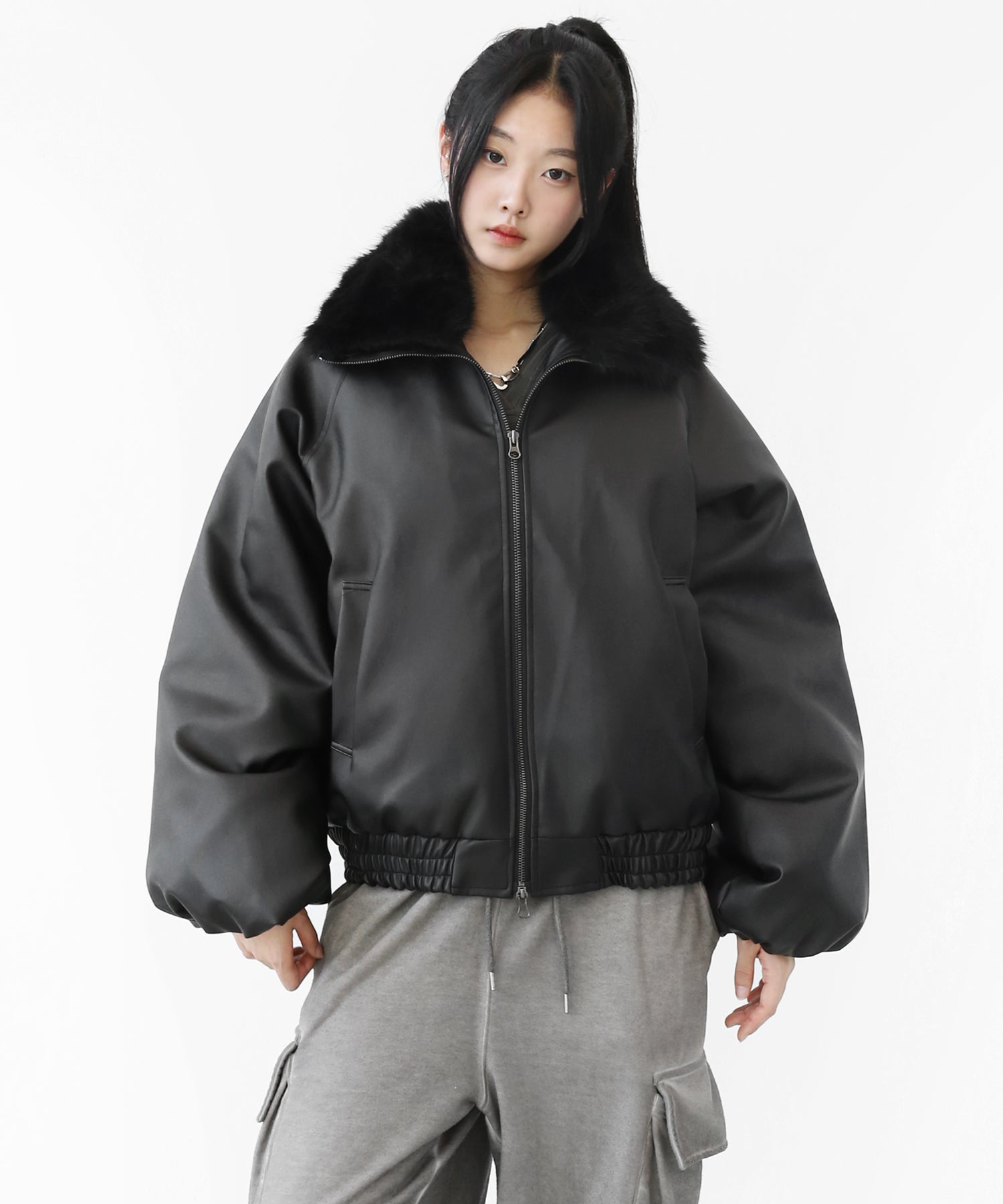 A high-neck balloon jacket made from matte faux leather, finished with a soft fur neckline.
