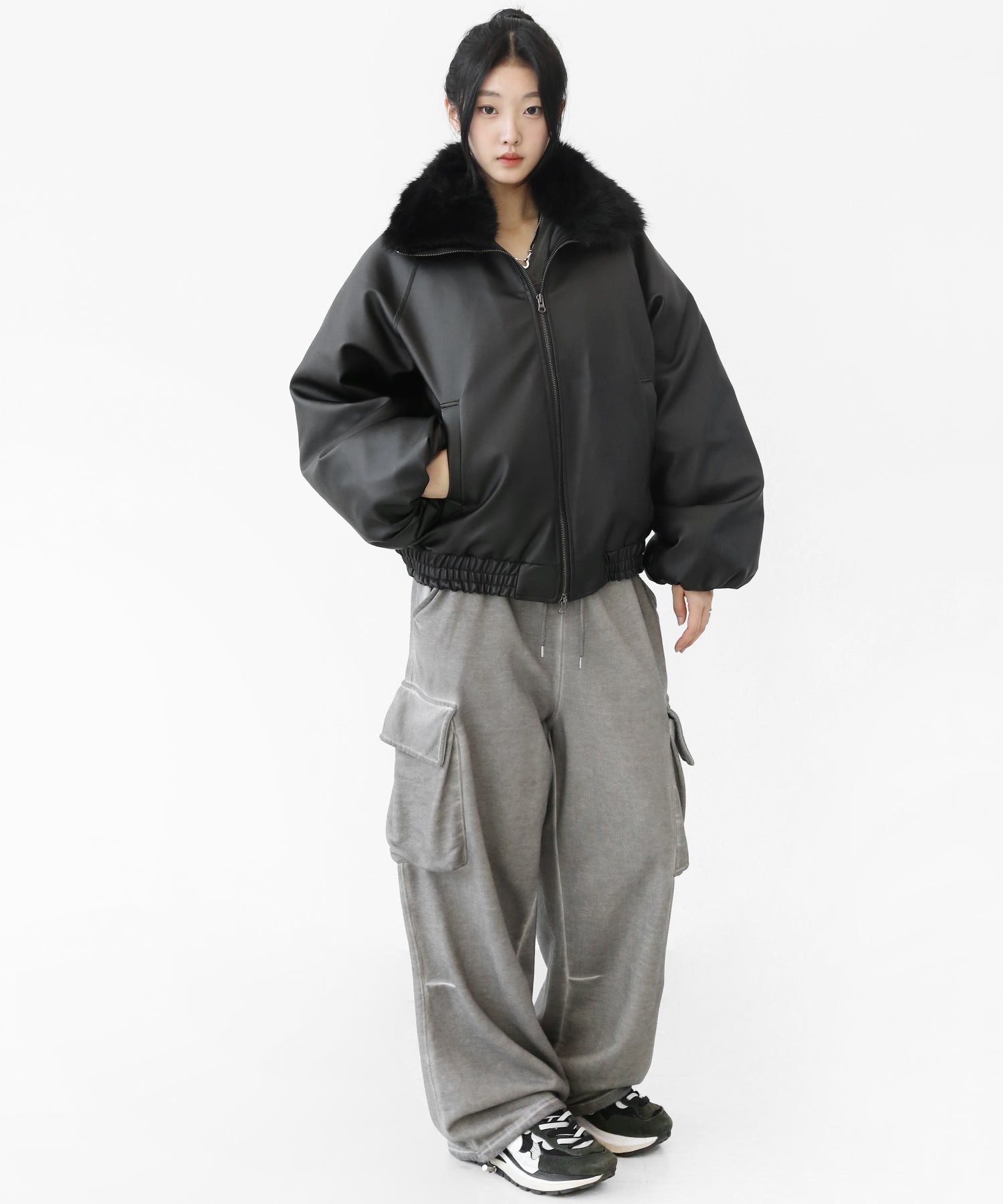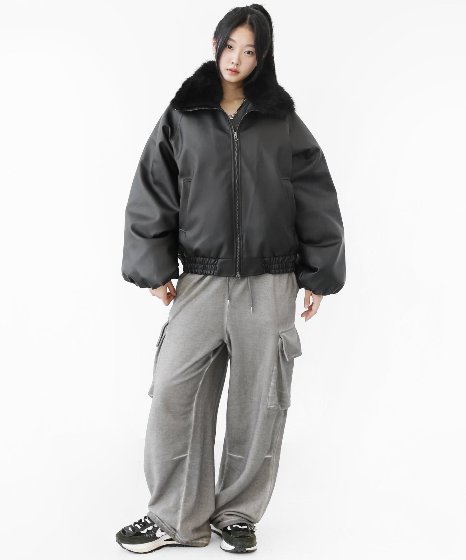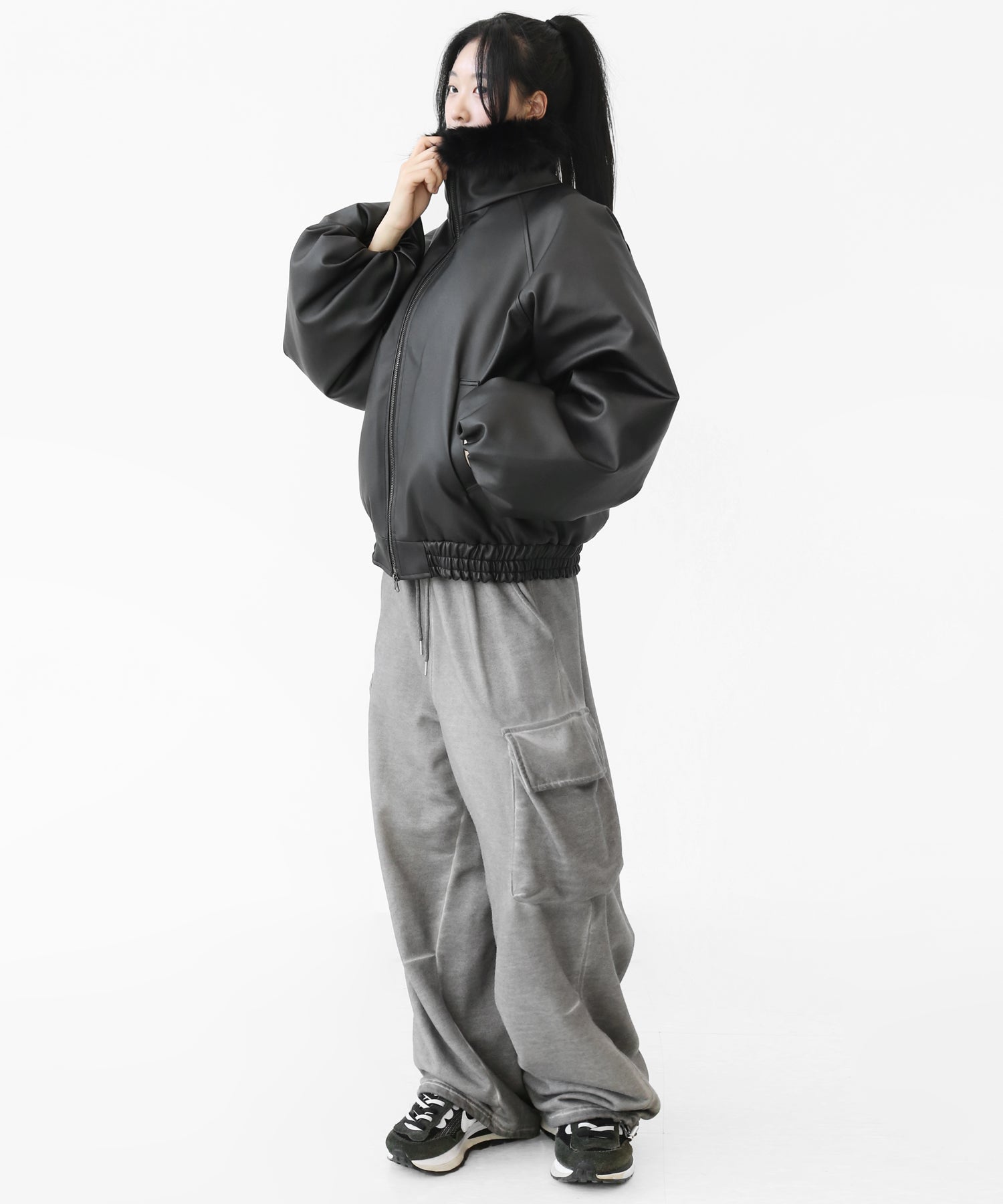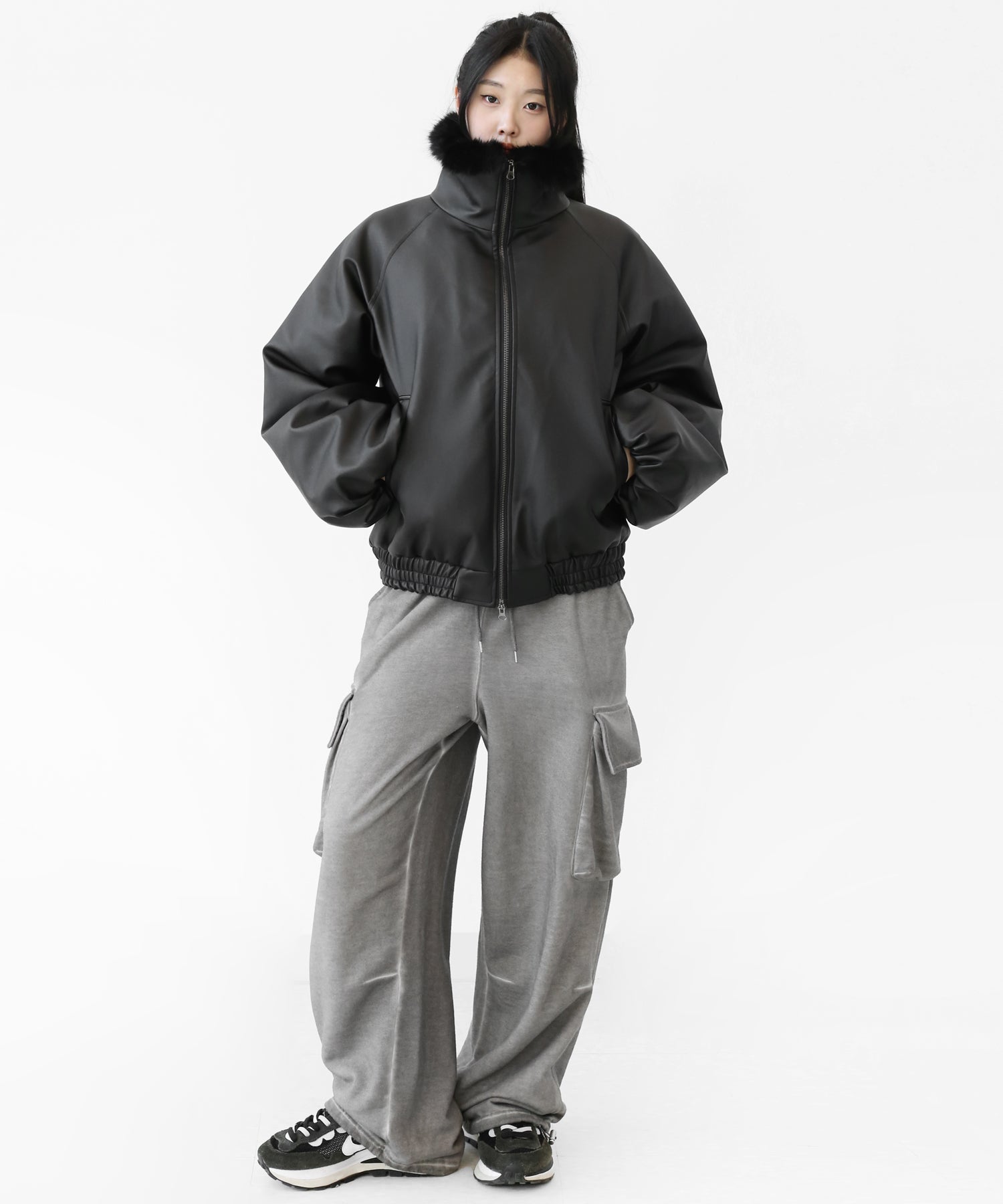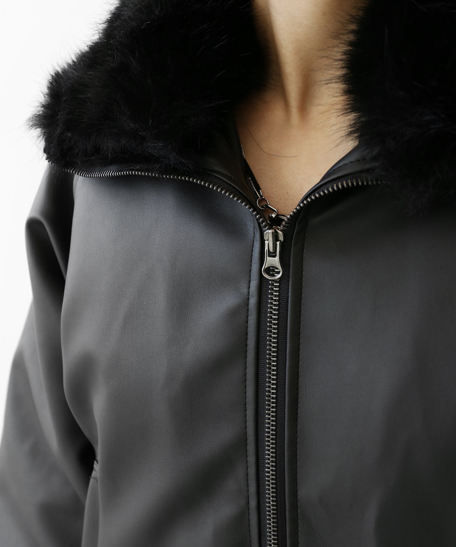 A high-neck balloon jacket made from matte faux leather, finished with a soft fur neckline.
