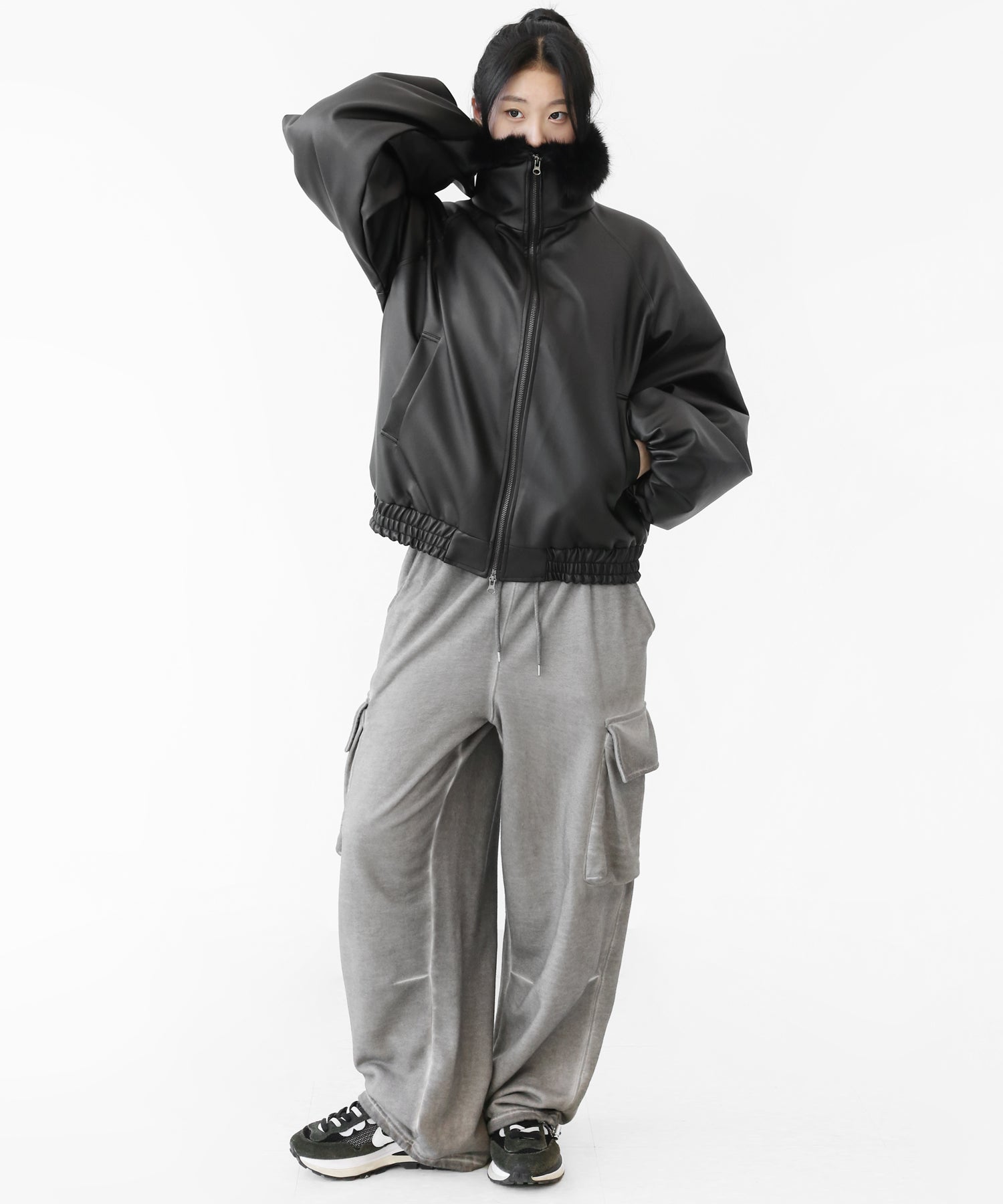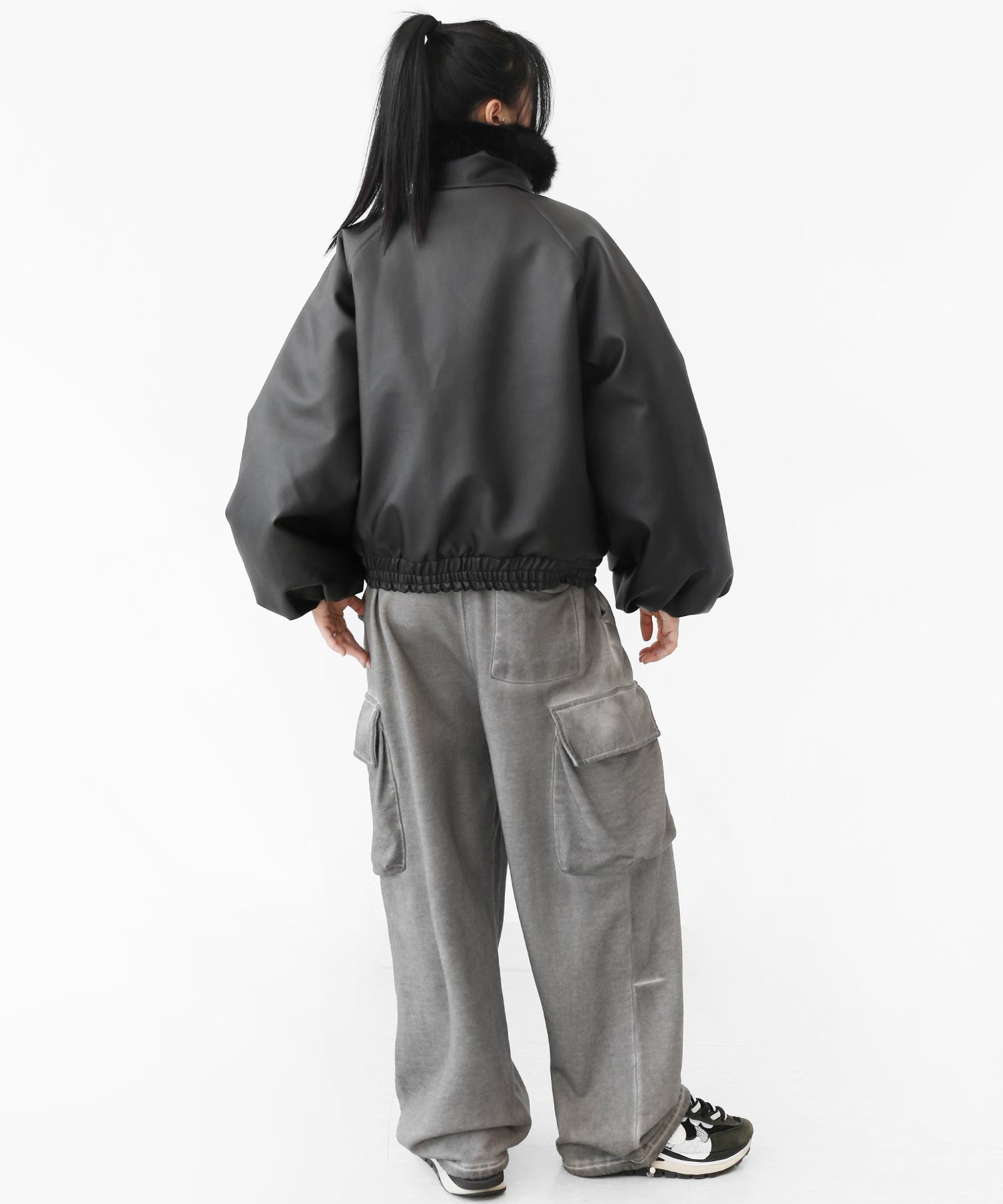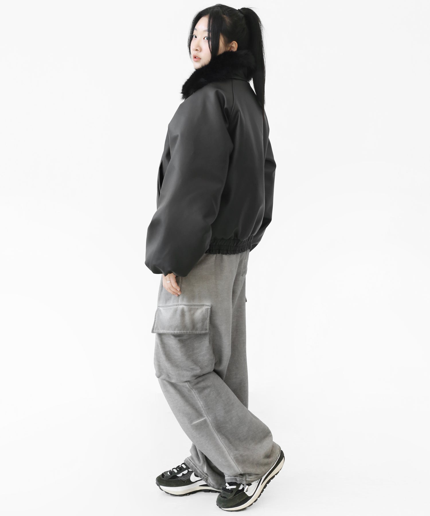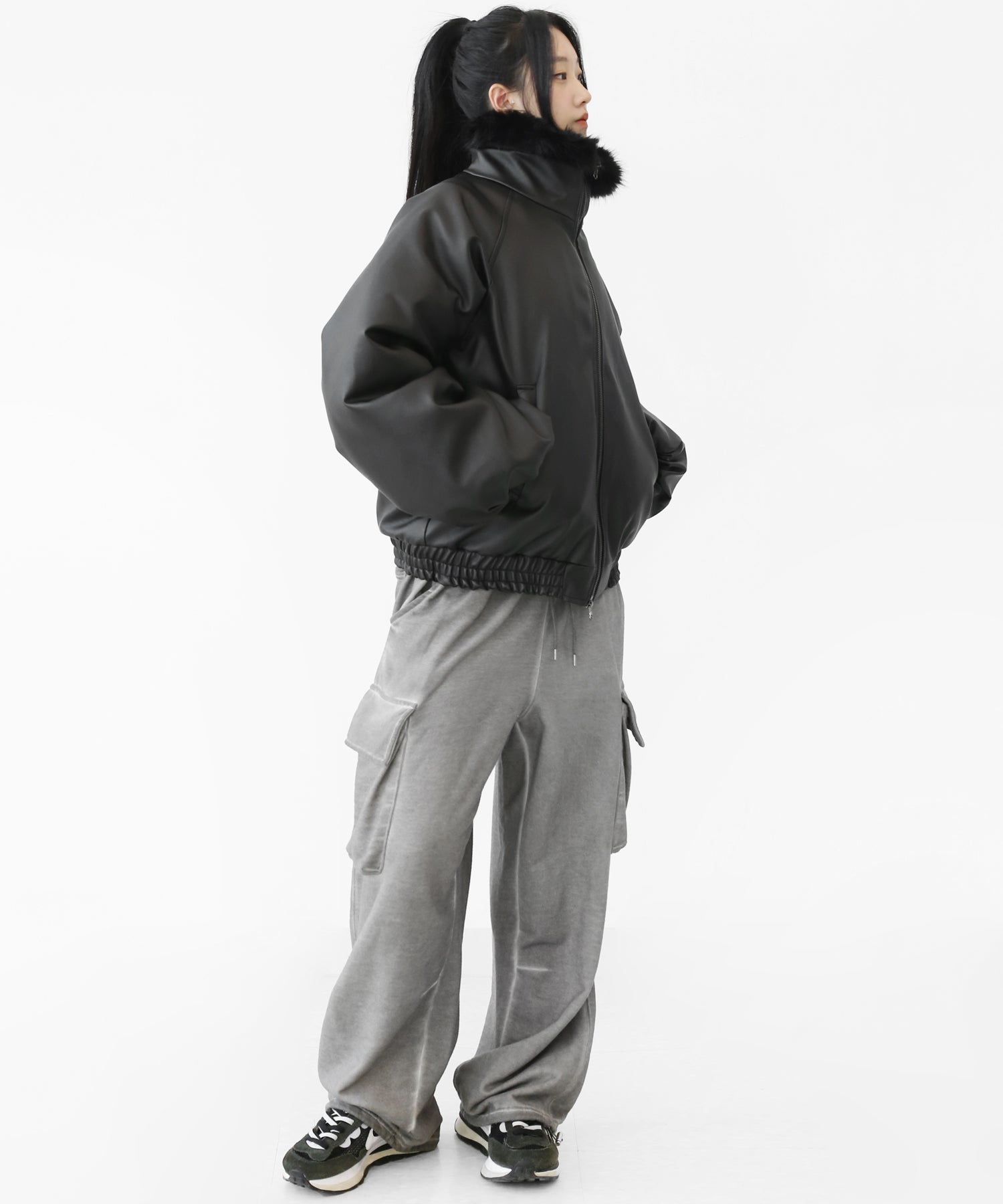 A high-neck balloon jacket made from matte faux leather, finished with a soft fur neckline.