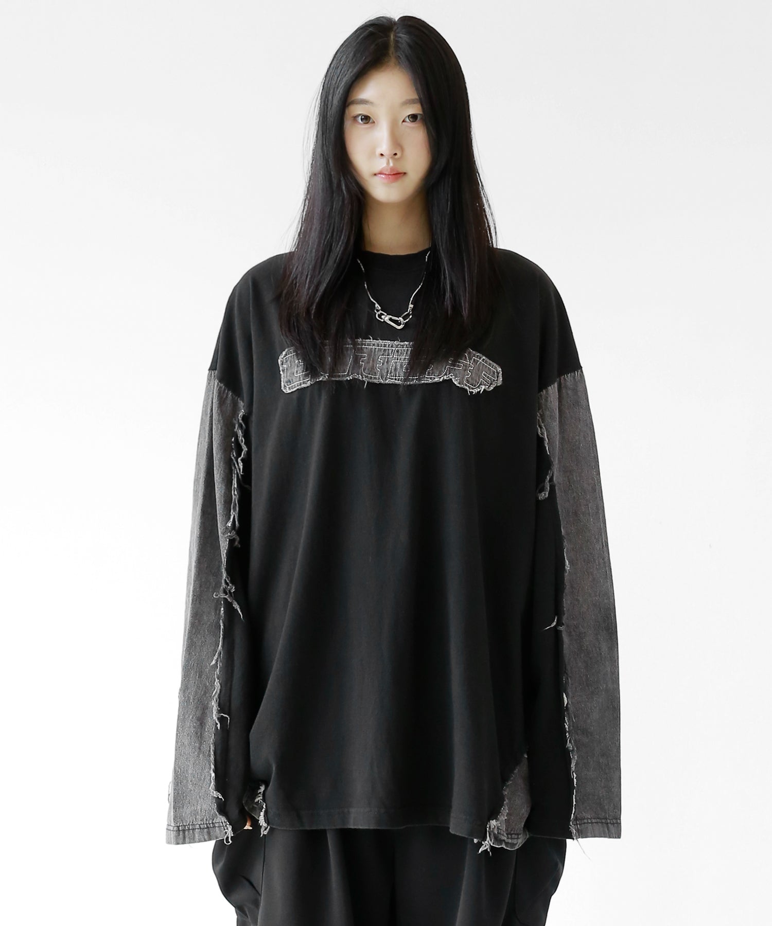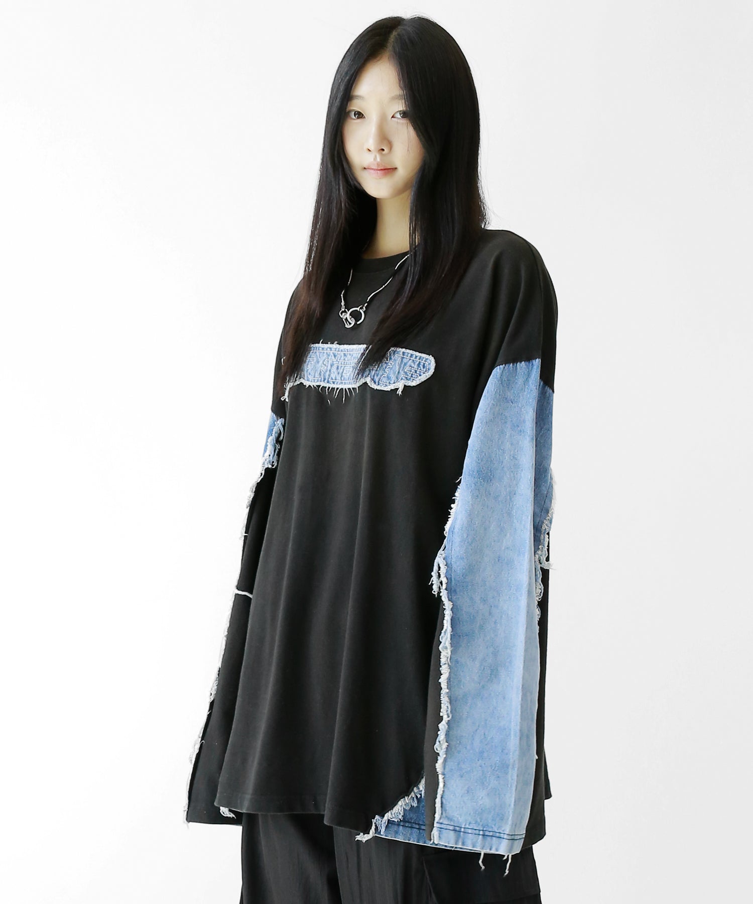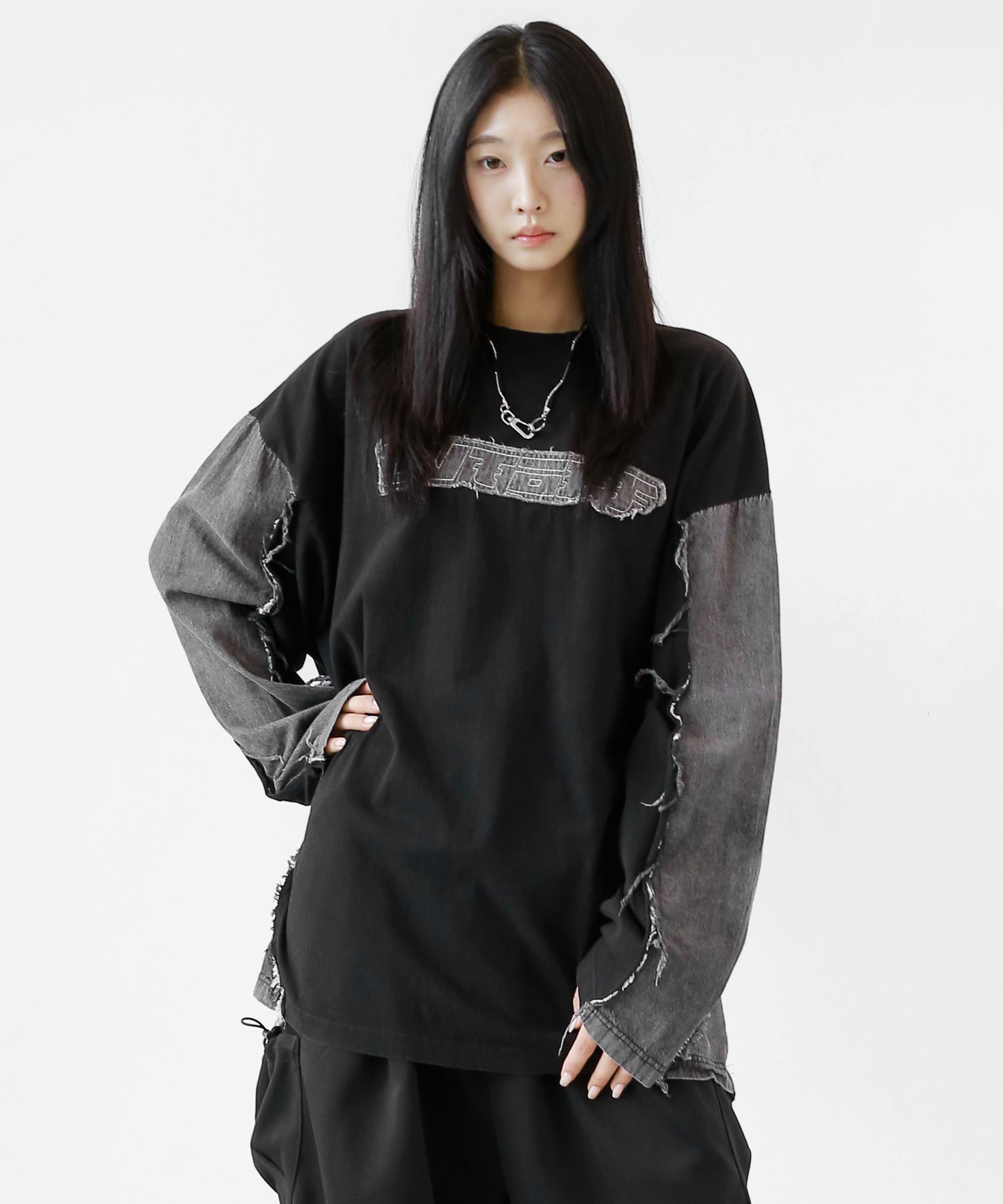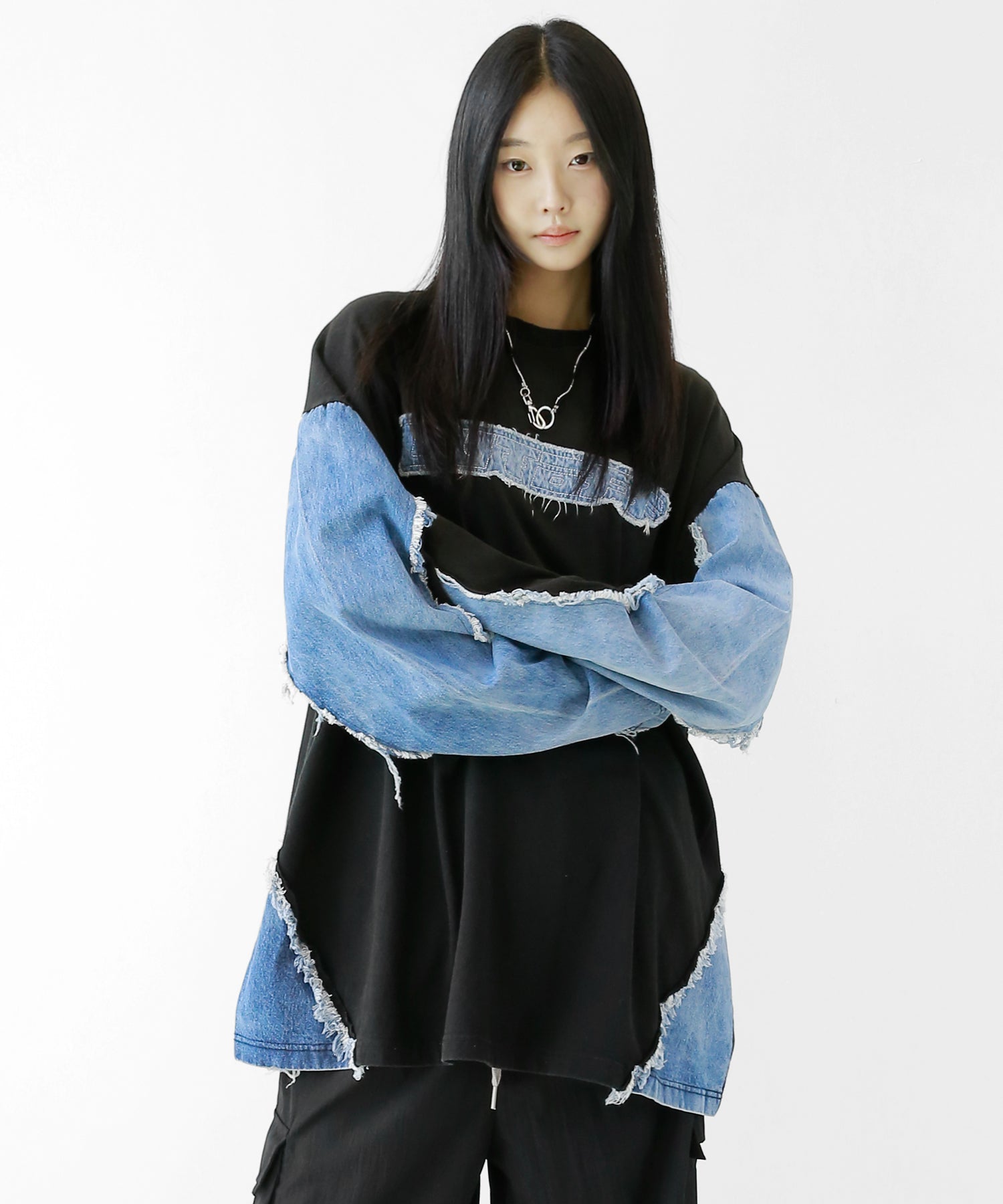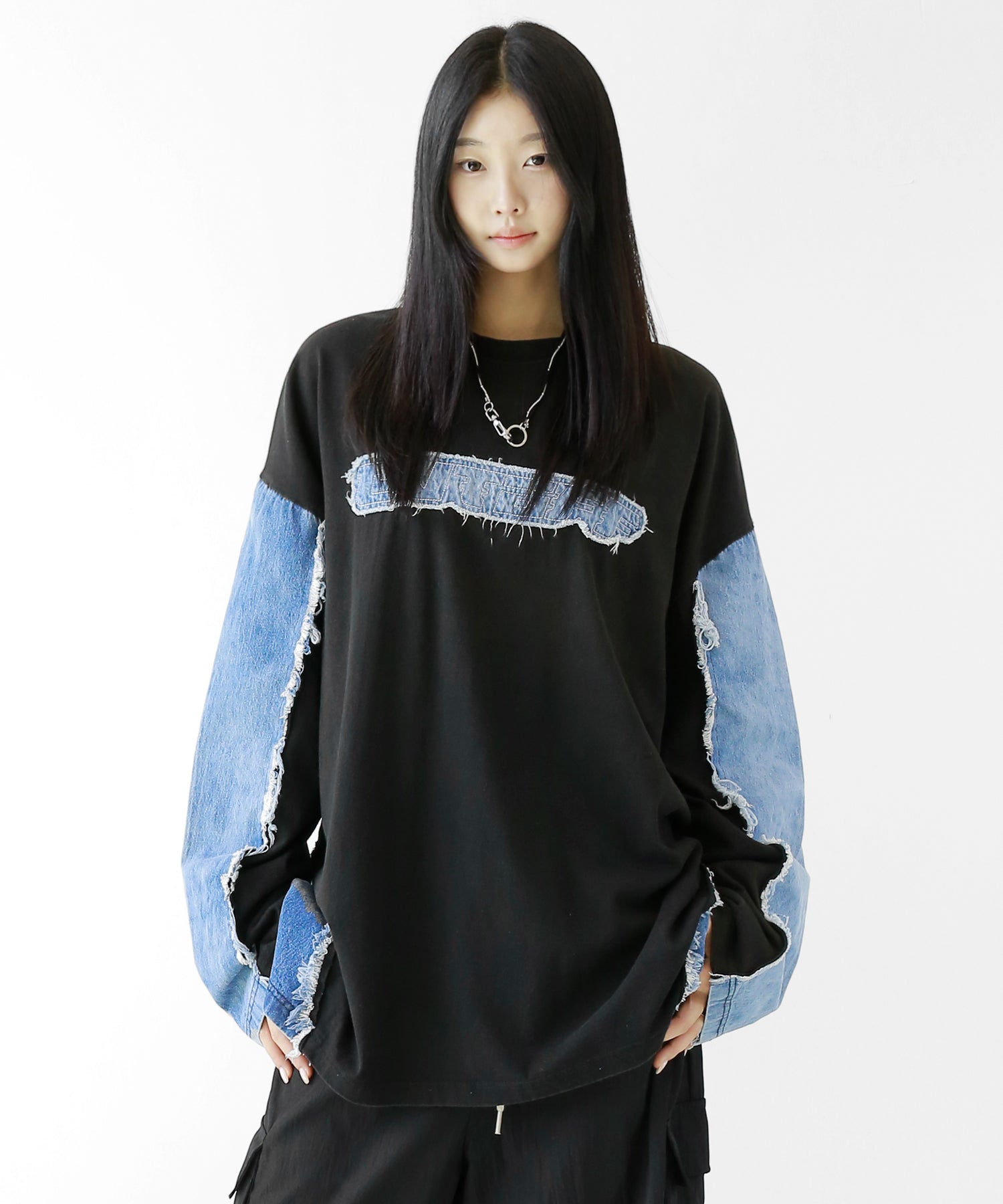 A bold long sleeve tee featuring denim sleeve and side panels with raw-cut details. The denim chest logo adds a subtle touch, blending street and casual aesthetics into one standout piece.